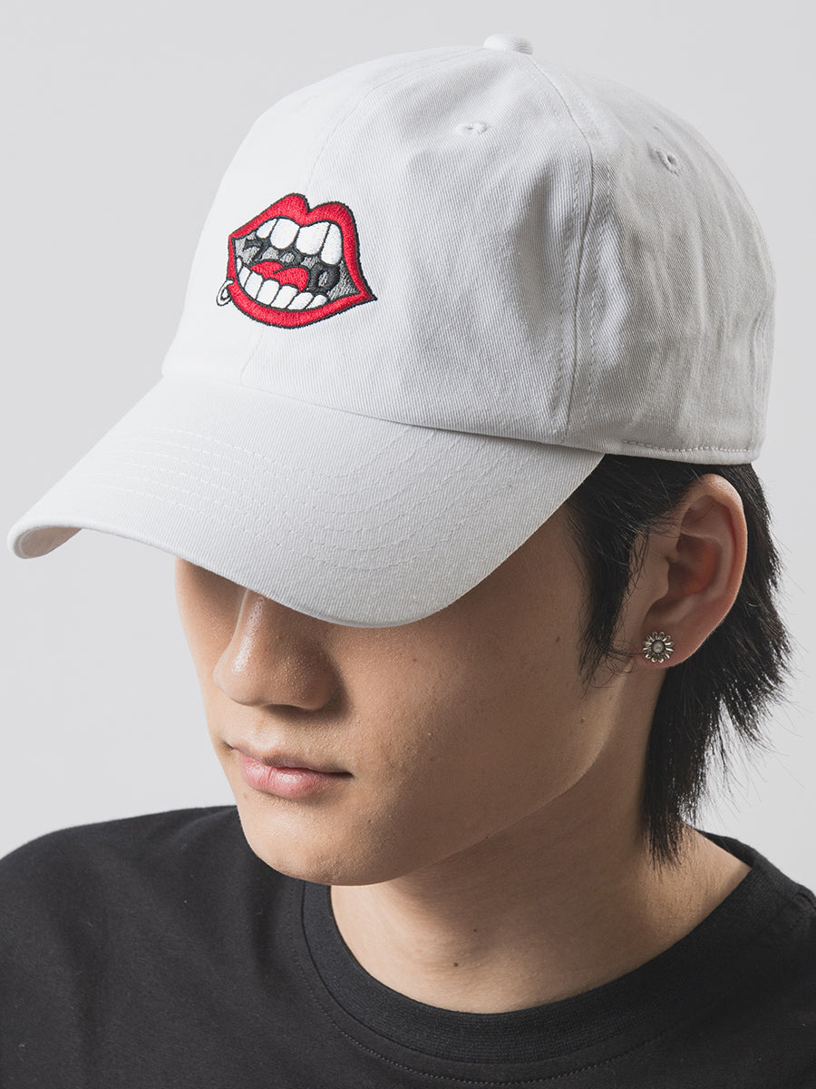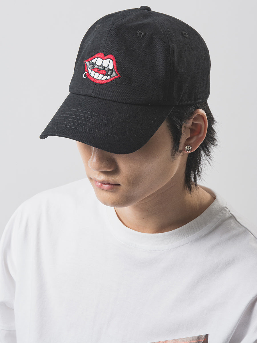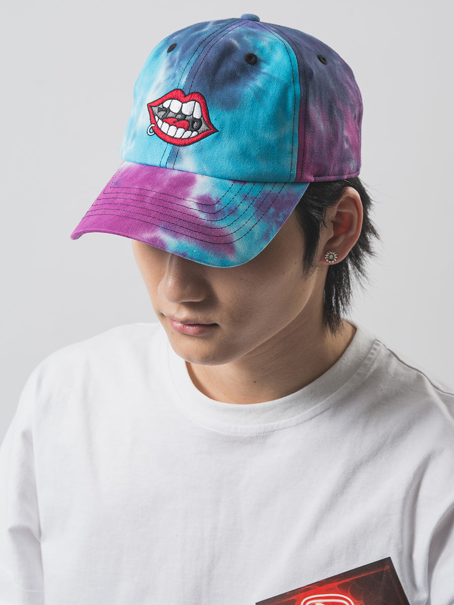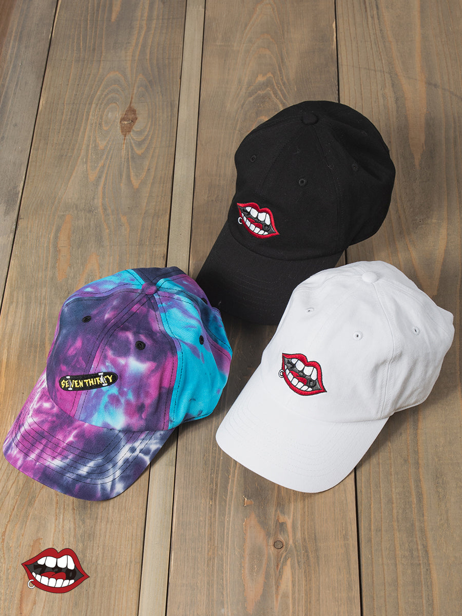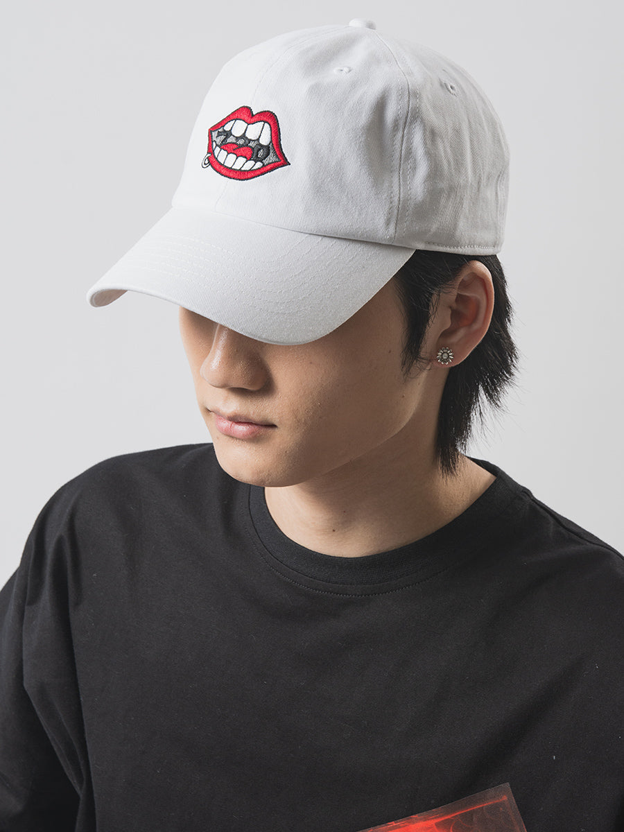 フロントにシンボルマークの刺繍を施したキャップ。被りが浅いレトロスタイルのキャップに「唇」と「スケボー」が刺繍された2種類のデザインで、白、黒のカラー及びタイダイの3色展開。
