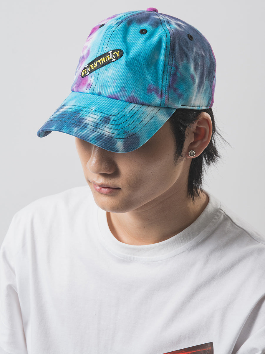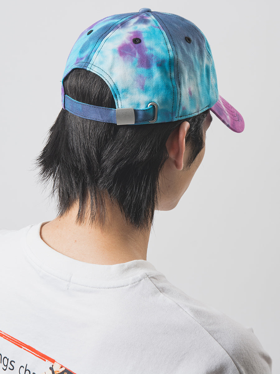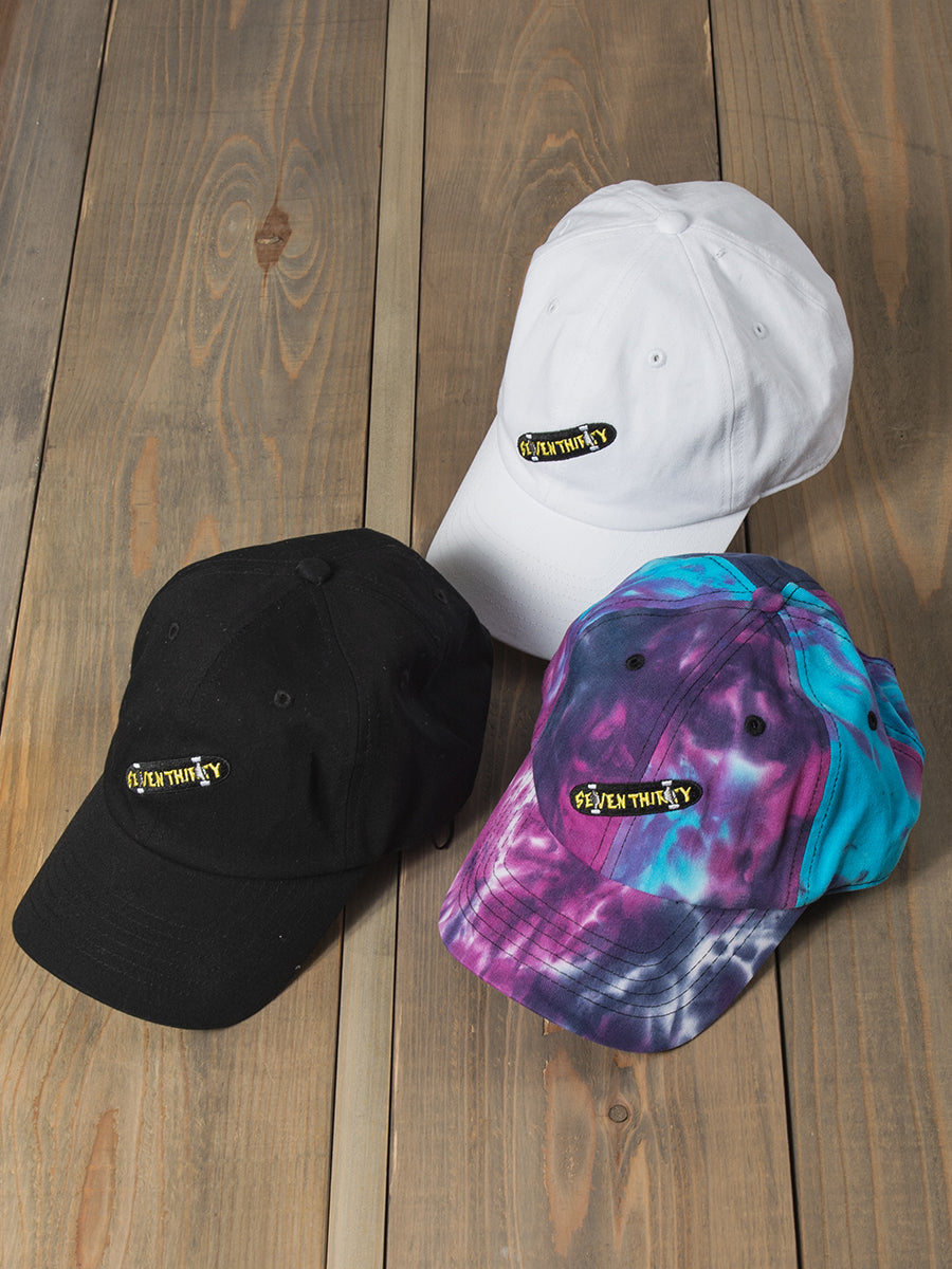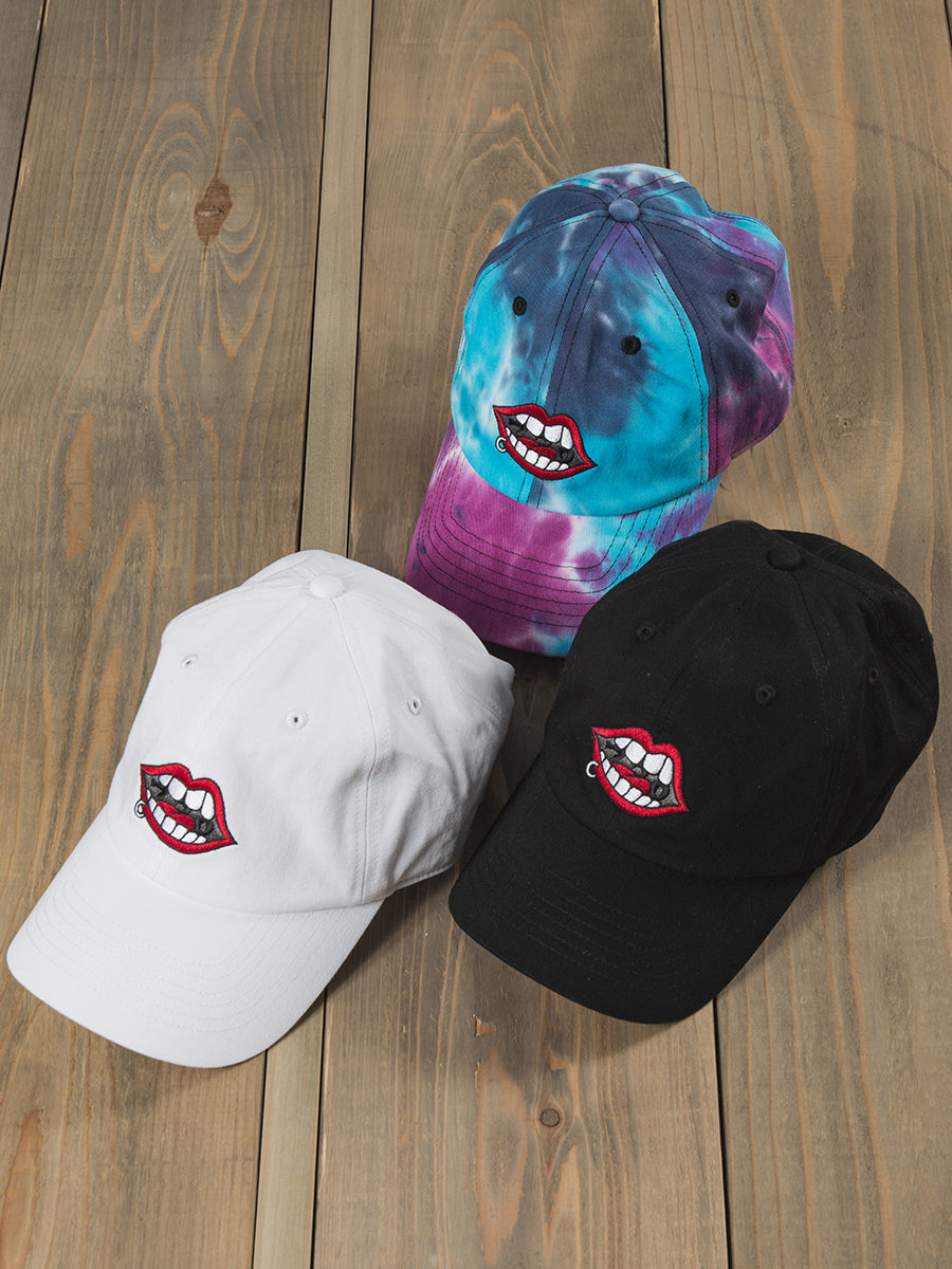 フロントにシンボルマークの刺繍を施したキャップ。被りが浅いレトロスタイルのキャップに「唇」と「スケボー」が刺繍された2種類のデザインで、白、黒のカラー及びタイダイの3色展開。