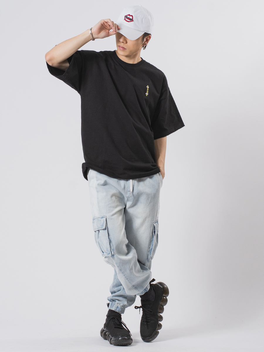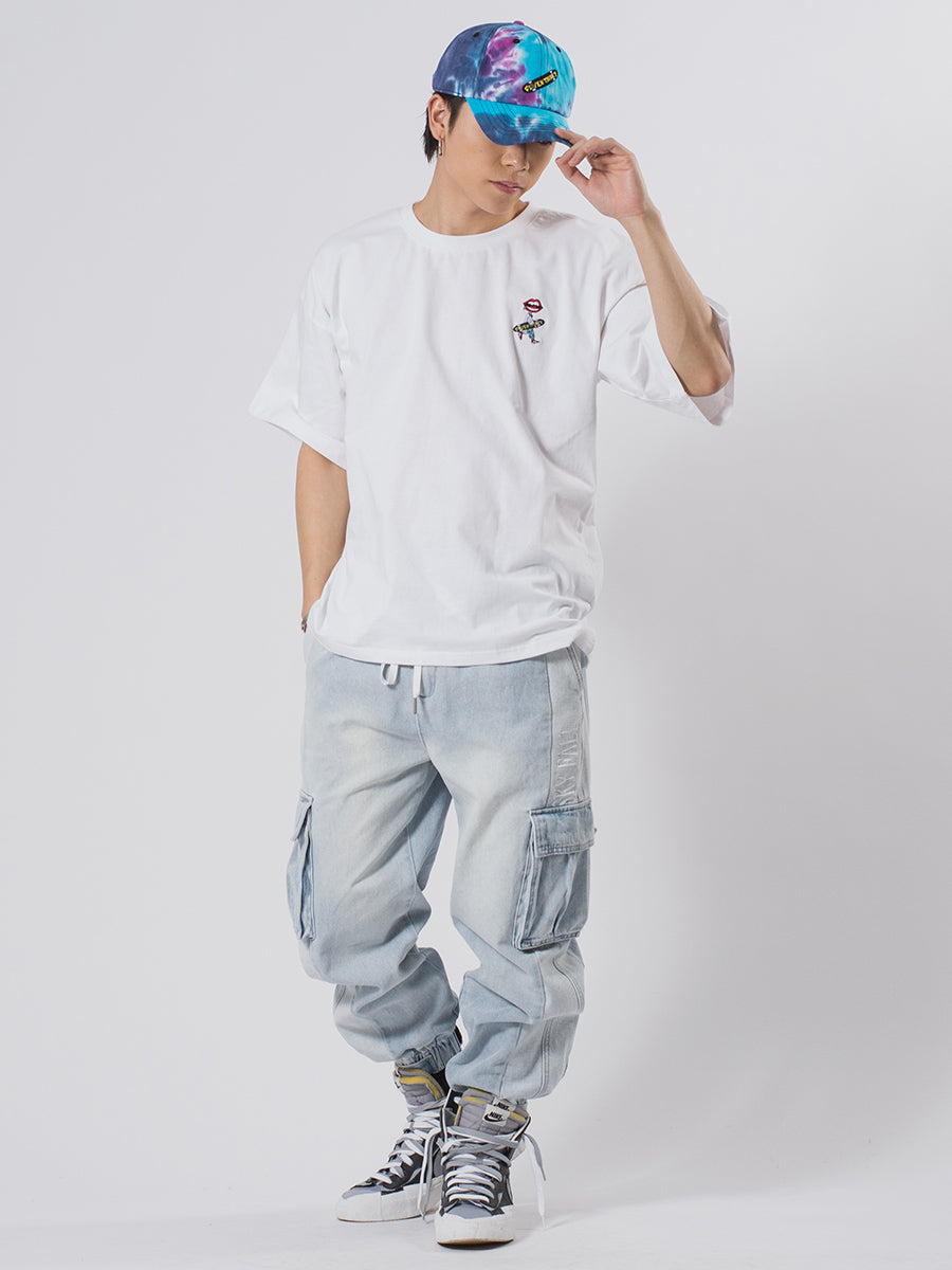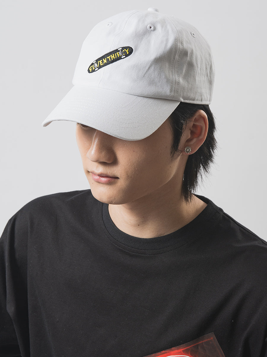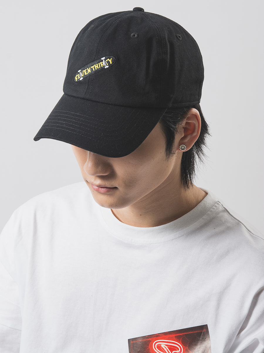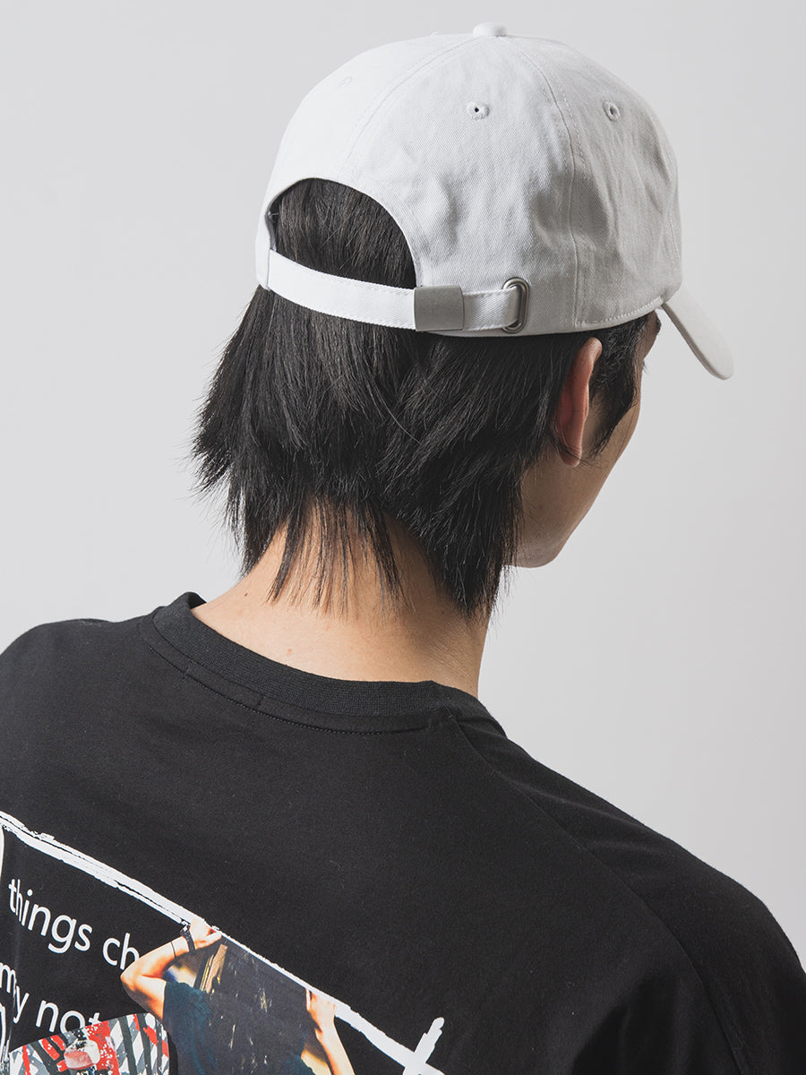 フロントにシンボルマークの刺繍を施したキャップ。被りが浅いレトロスタイルのキャップに「唇」と「スケボー」が刺繍された2種類のデザインで、白、黒のカラー及びタイダイの3色展開。