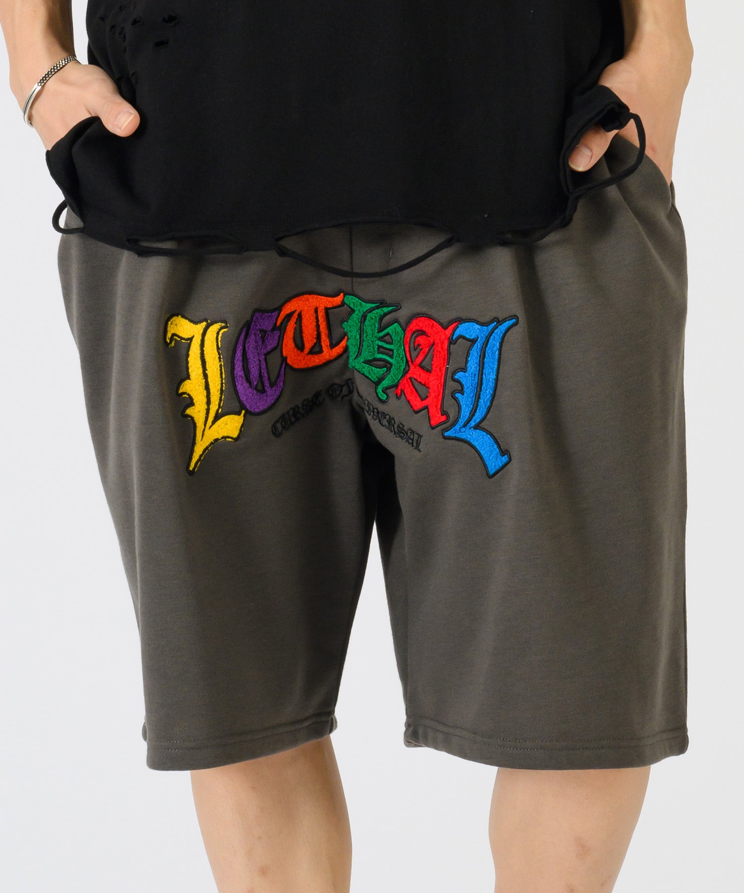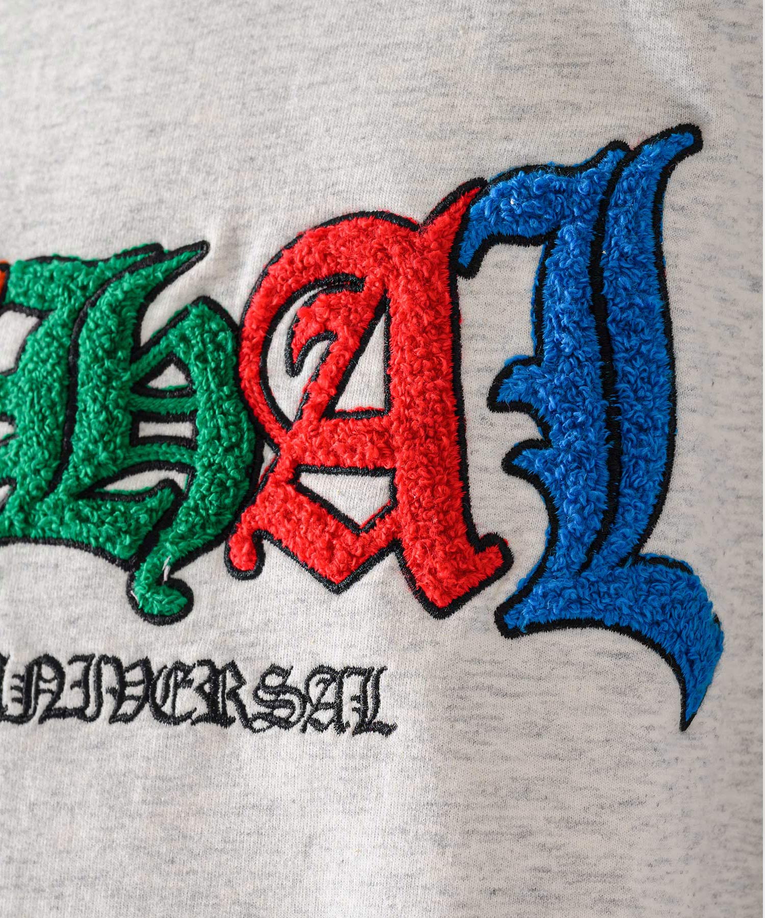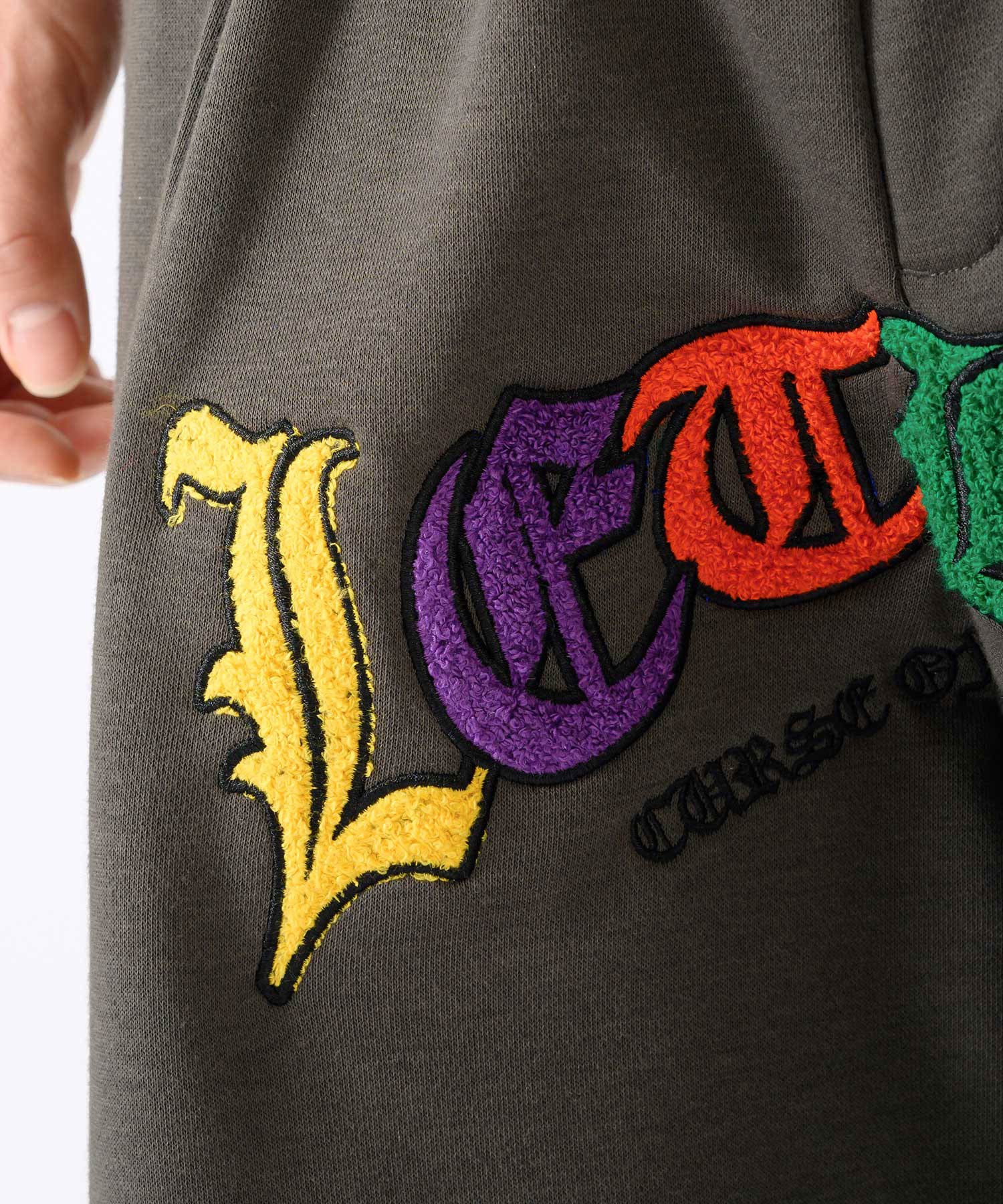 パイルの様な立体的なサガラ刺繍のカラフルなロゴを胸とボトムのフロントのに配置