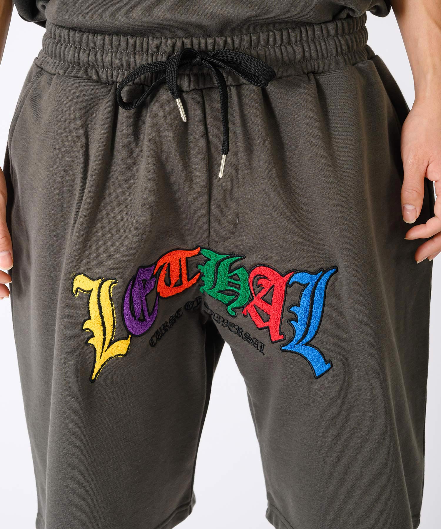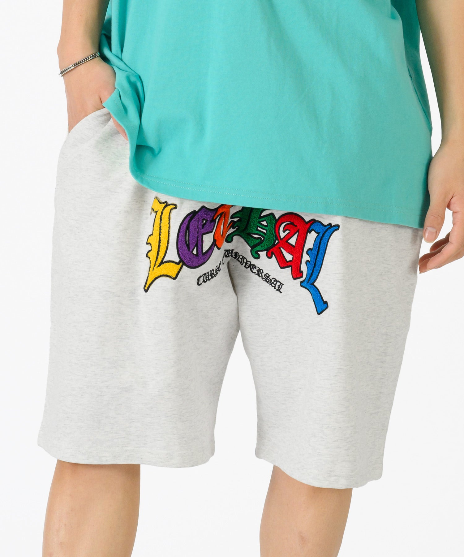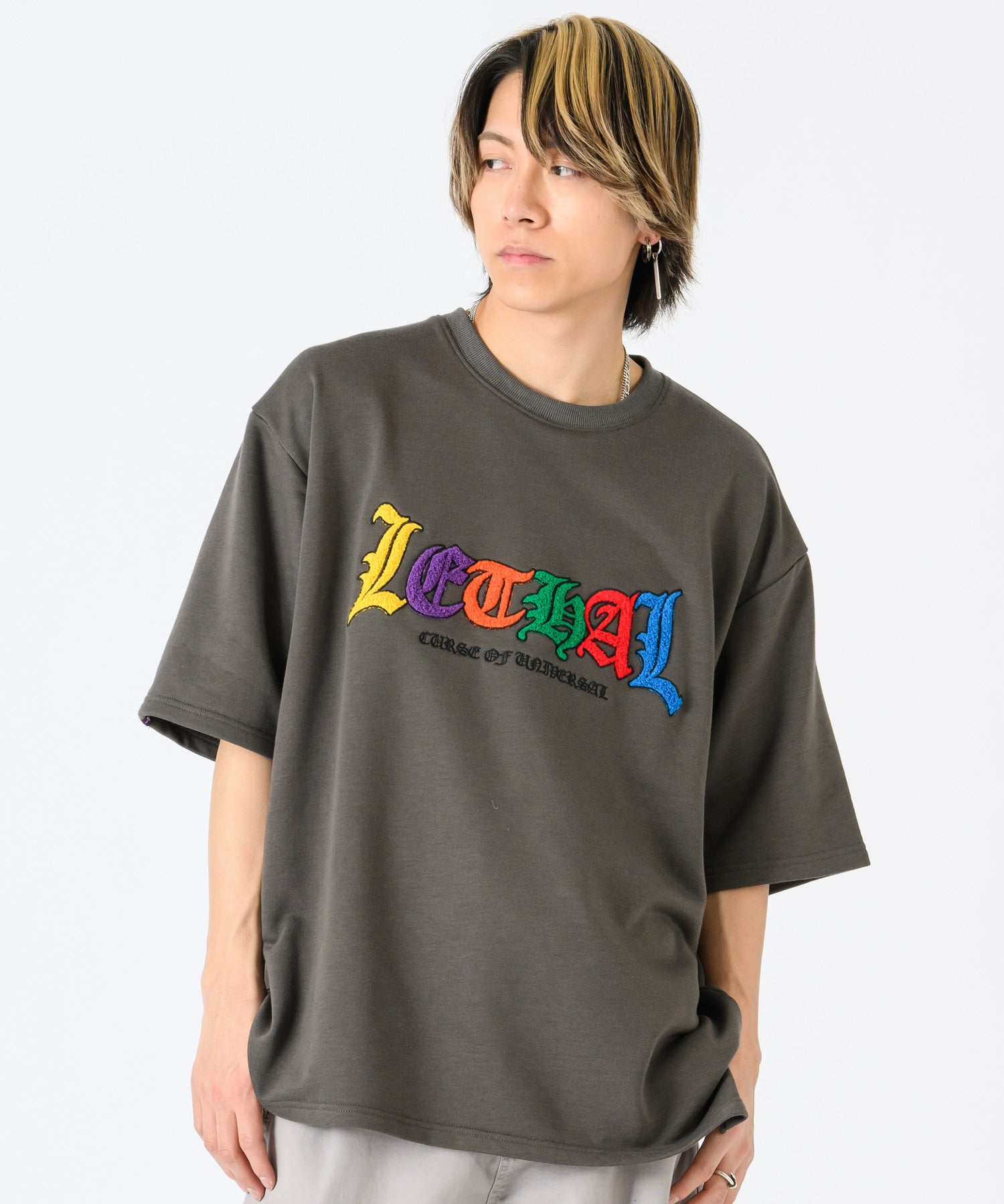パイルの様な立体的なサガラ刺繍のカラフルなロゴを胸とボトムのフロントのに配置