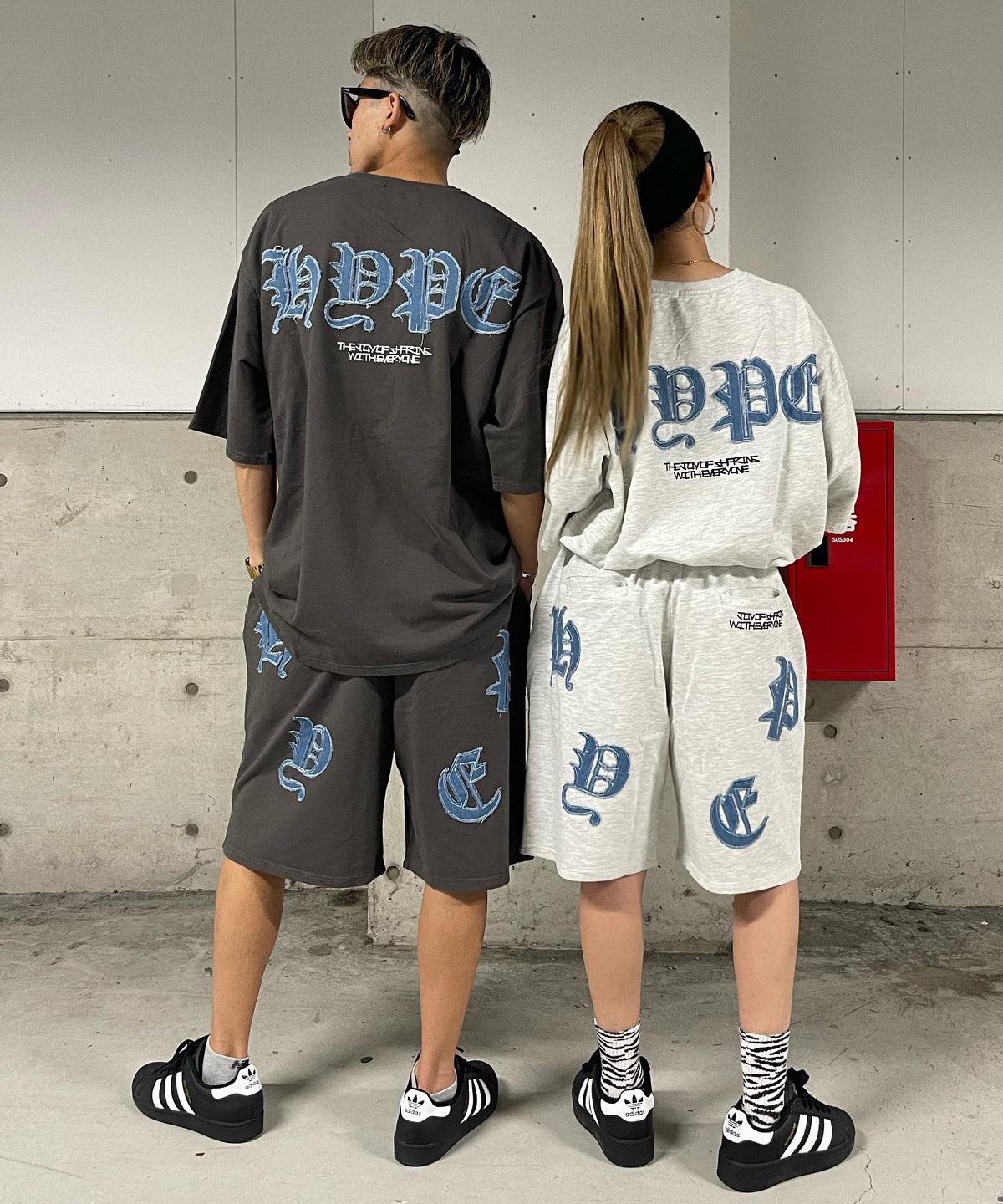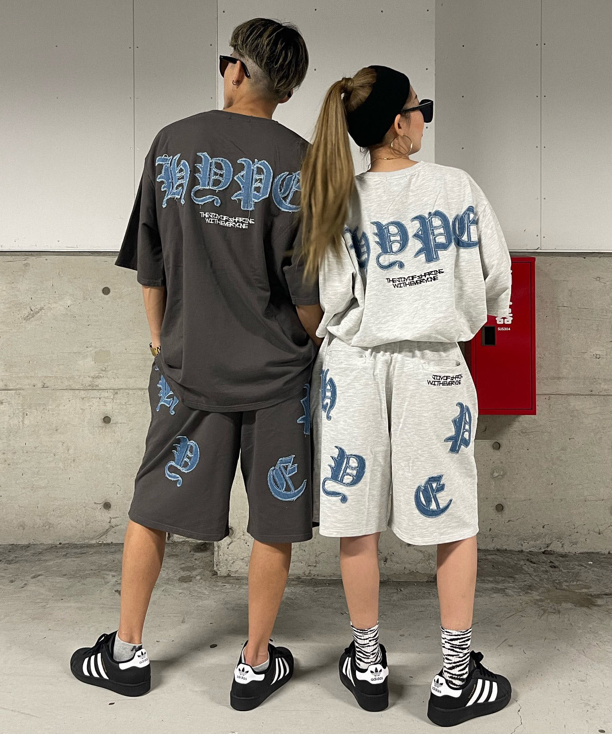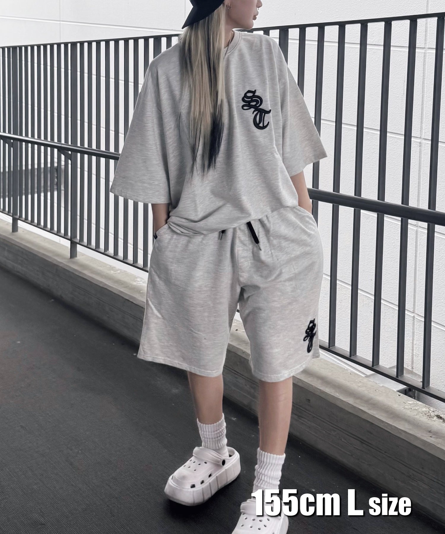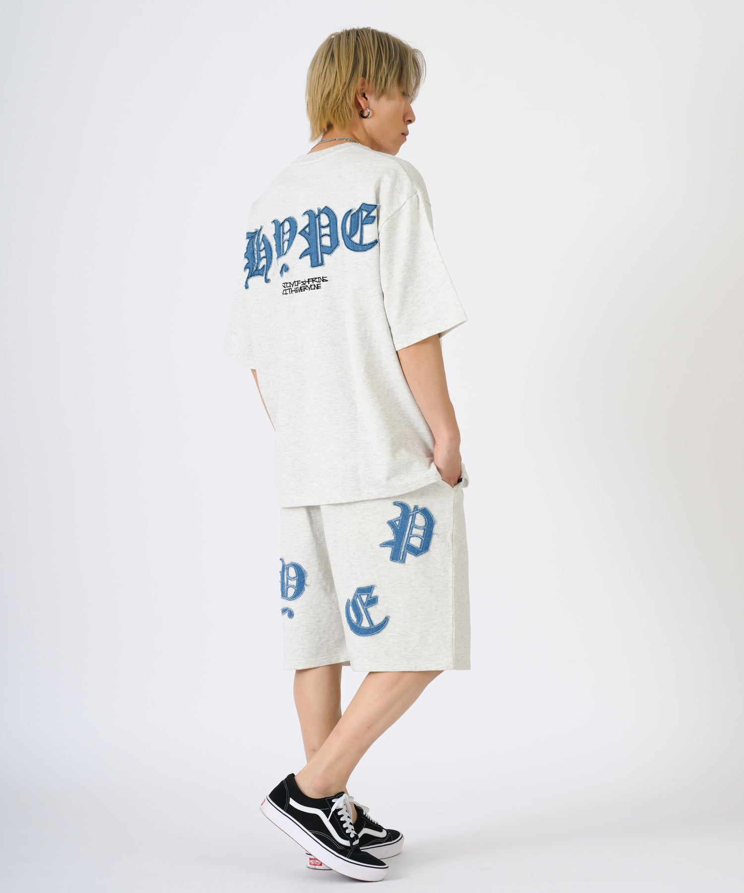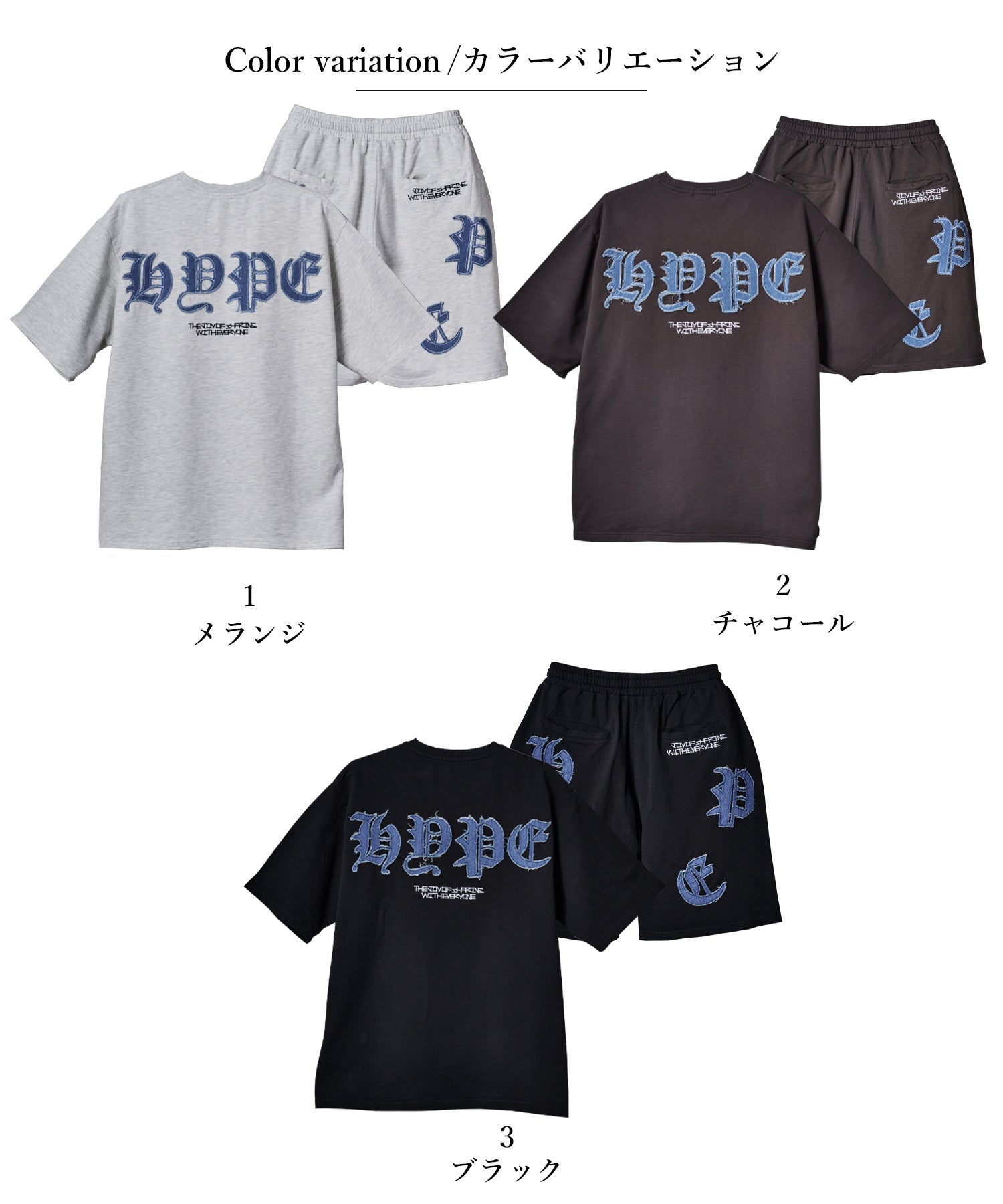 デニムのアップリケロゴが可愛いオーバーサイズのTシャツとショートパンツのセットアップ☆