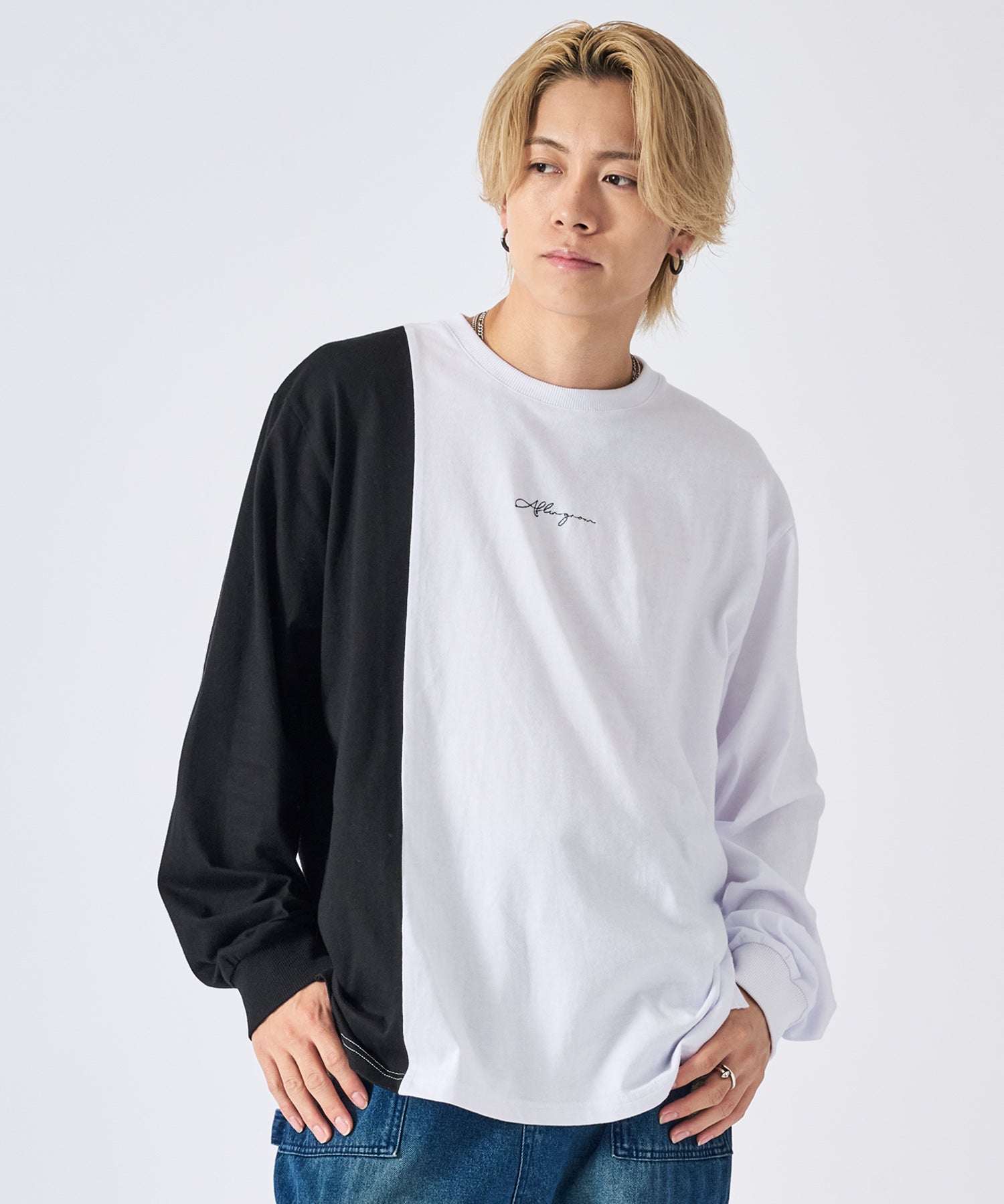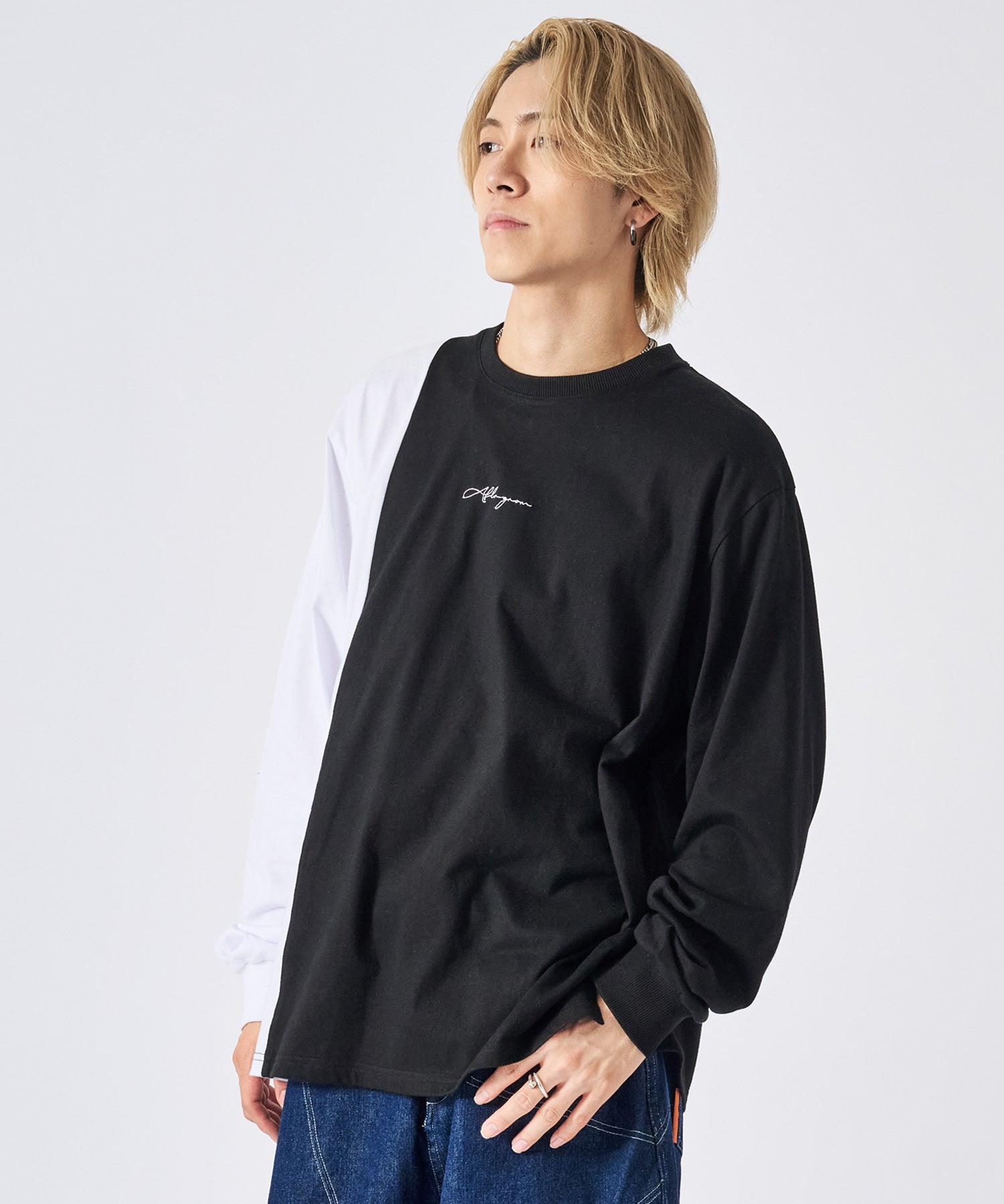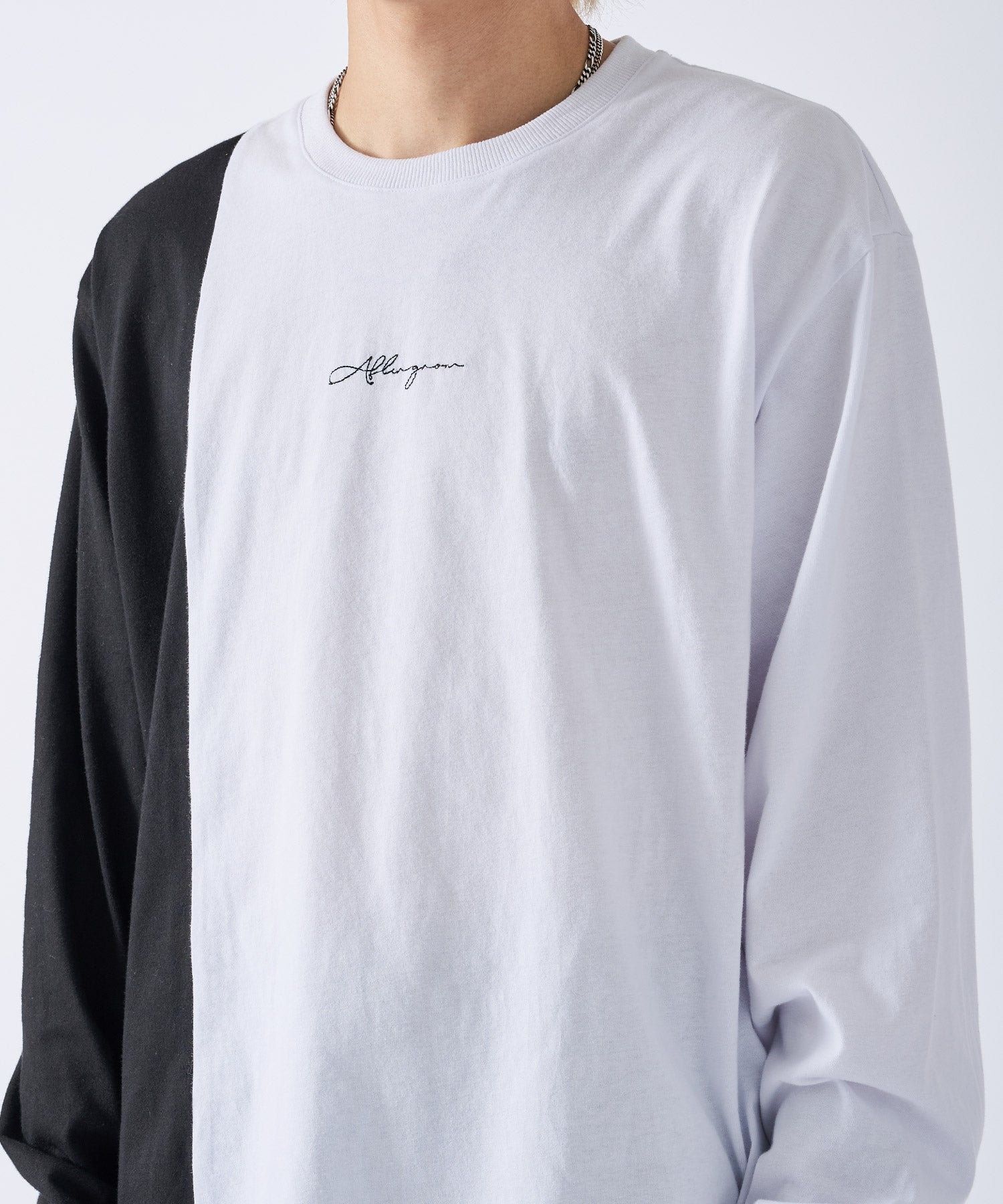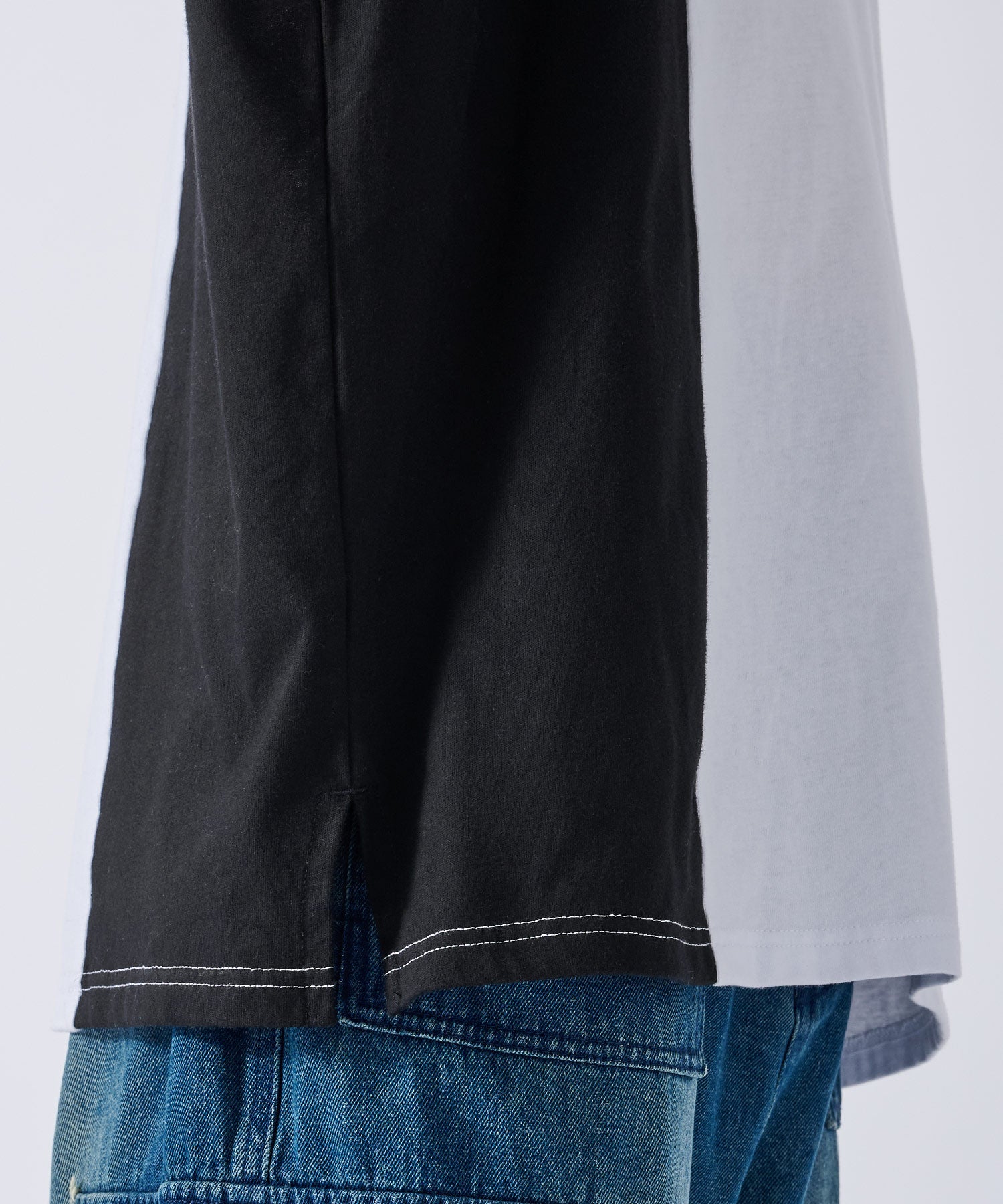 アシンメトリーな配色切り替えの長袖Tシャツ