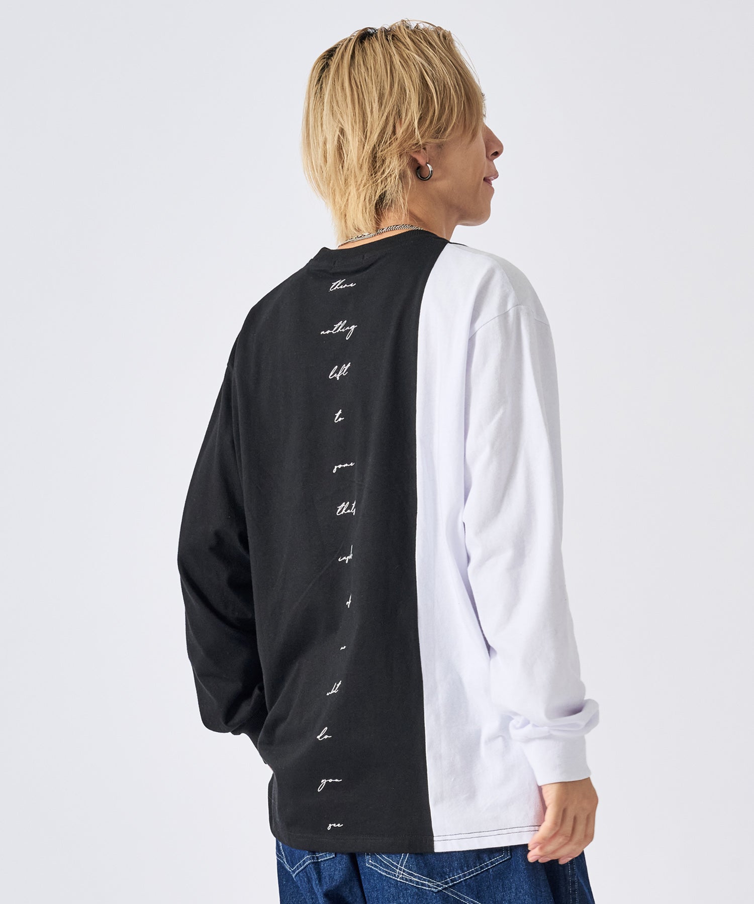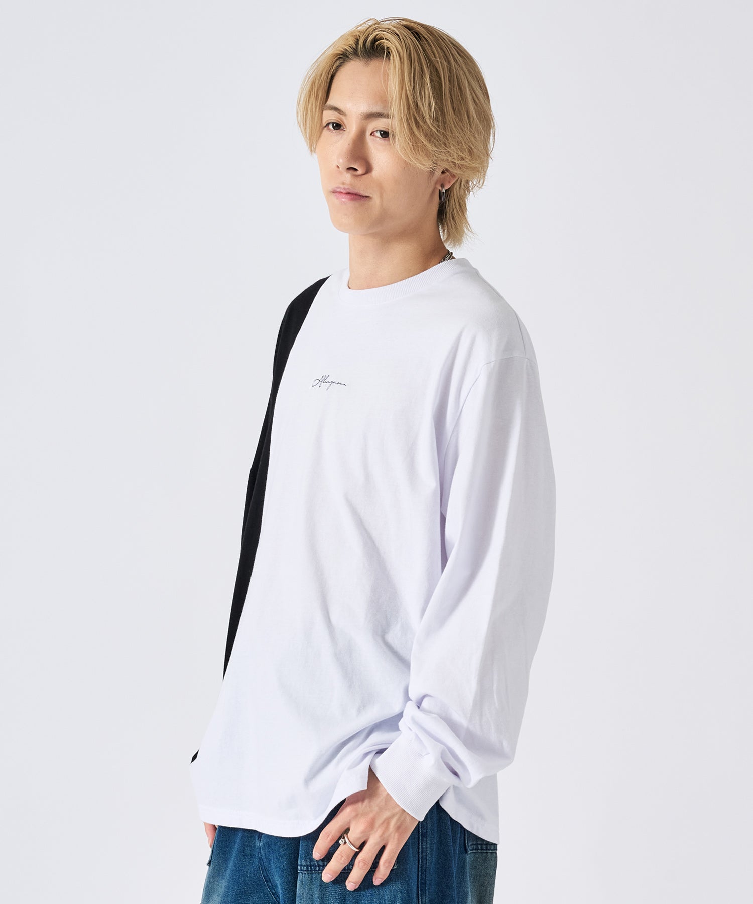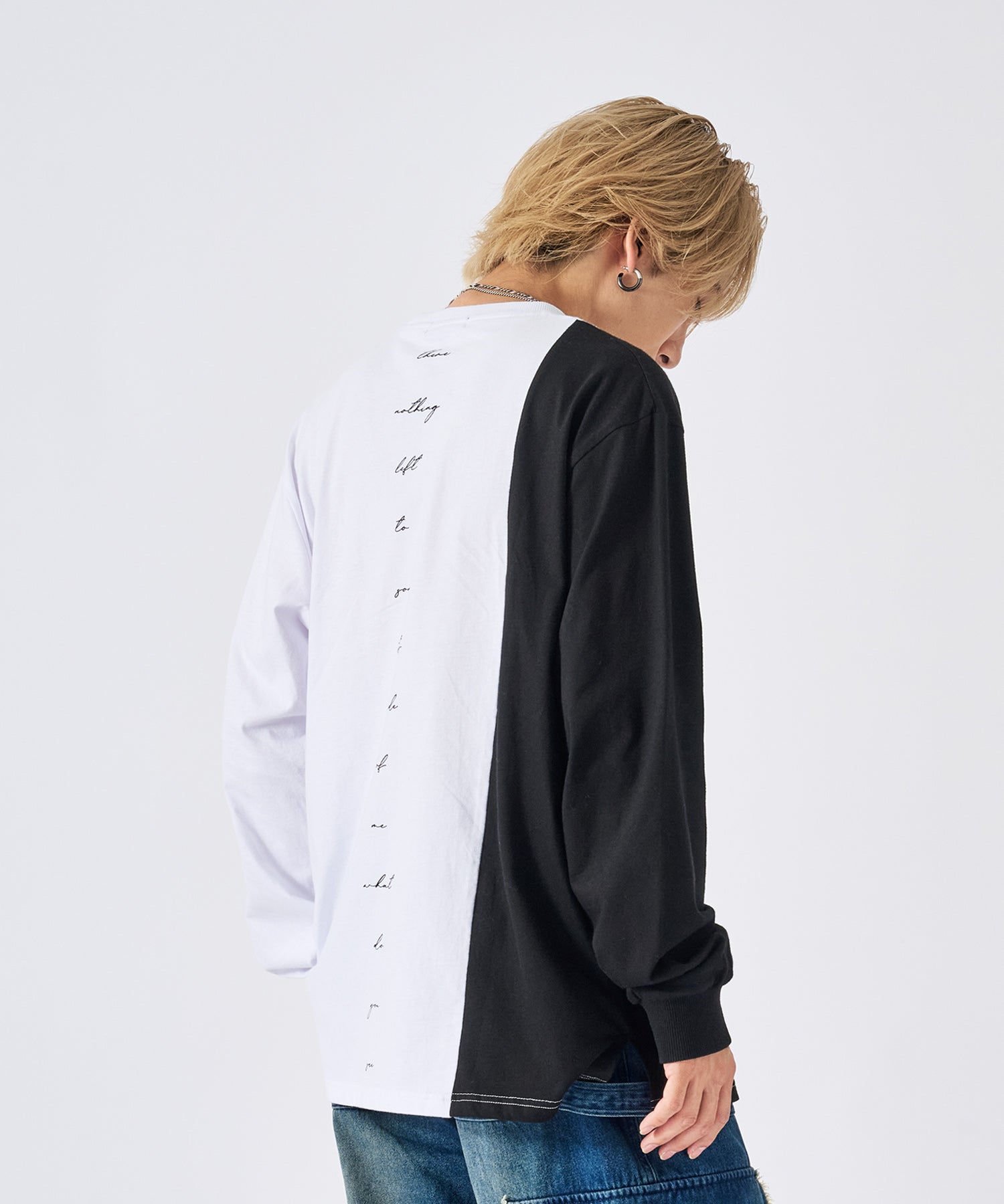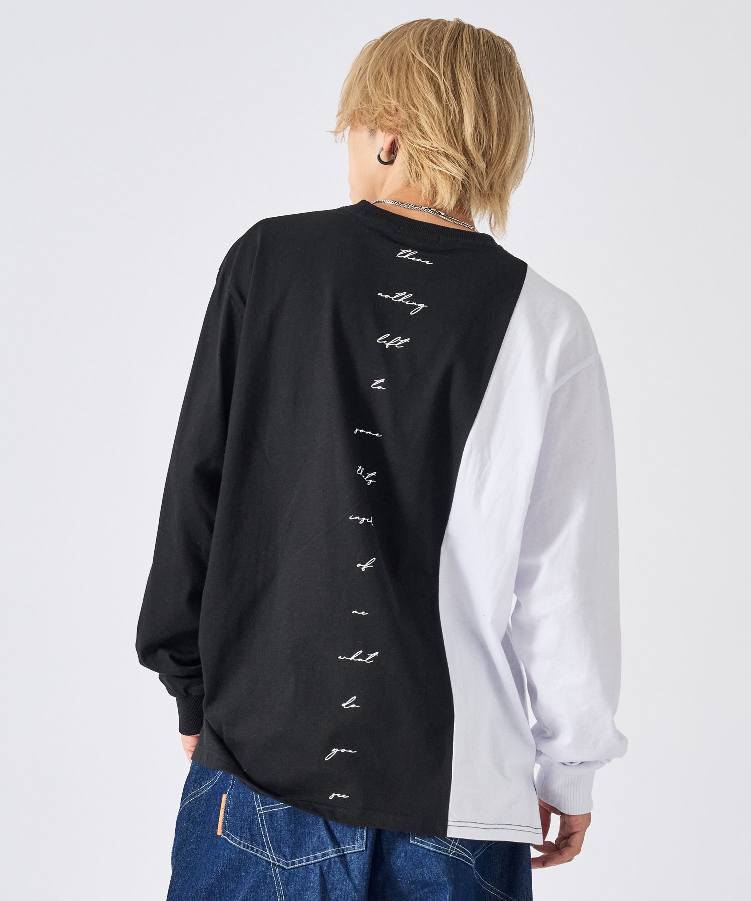 アシンメトリーな配色切り替えの長袖Tシャツ