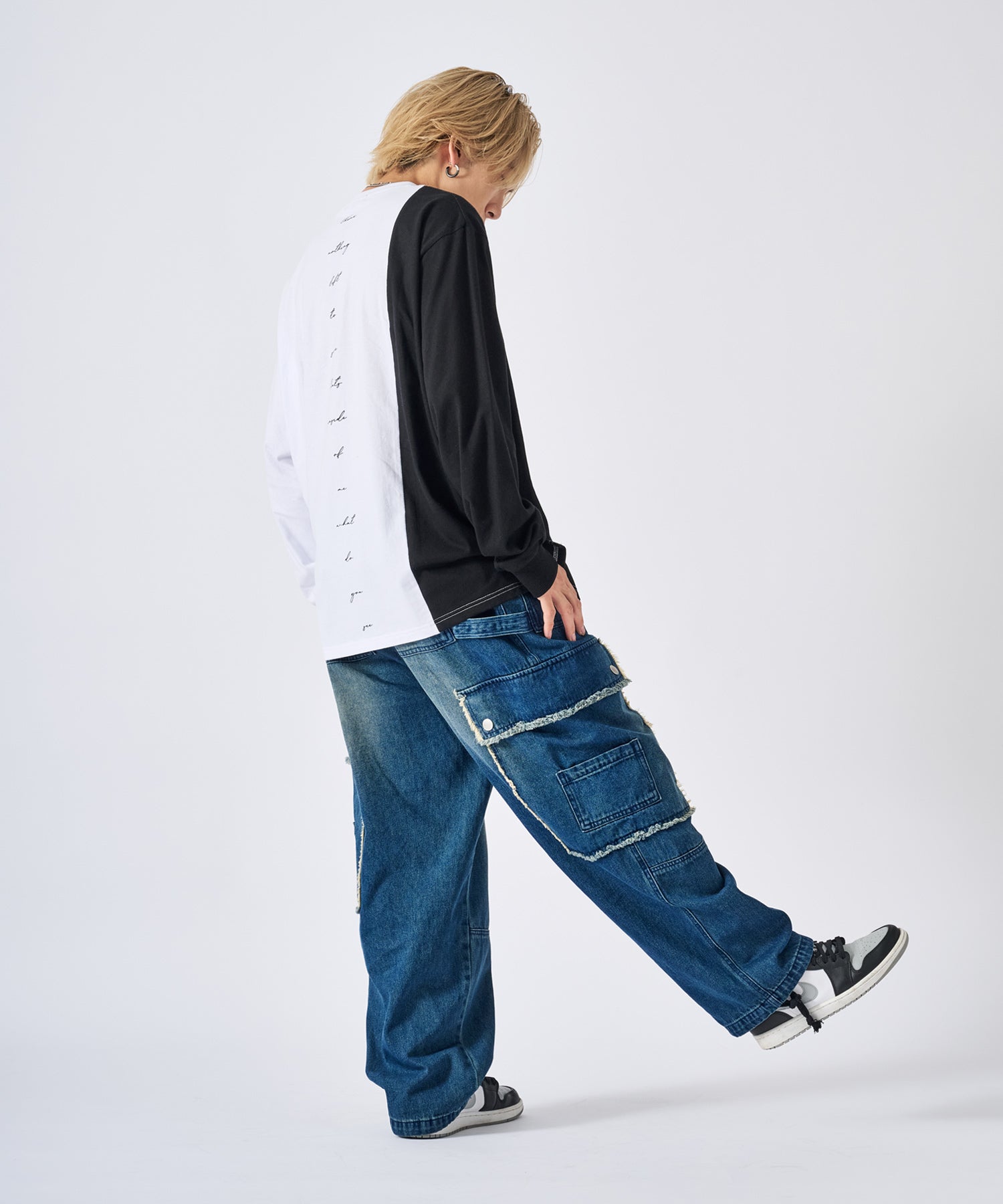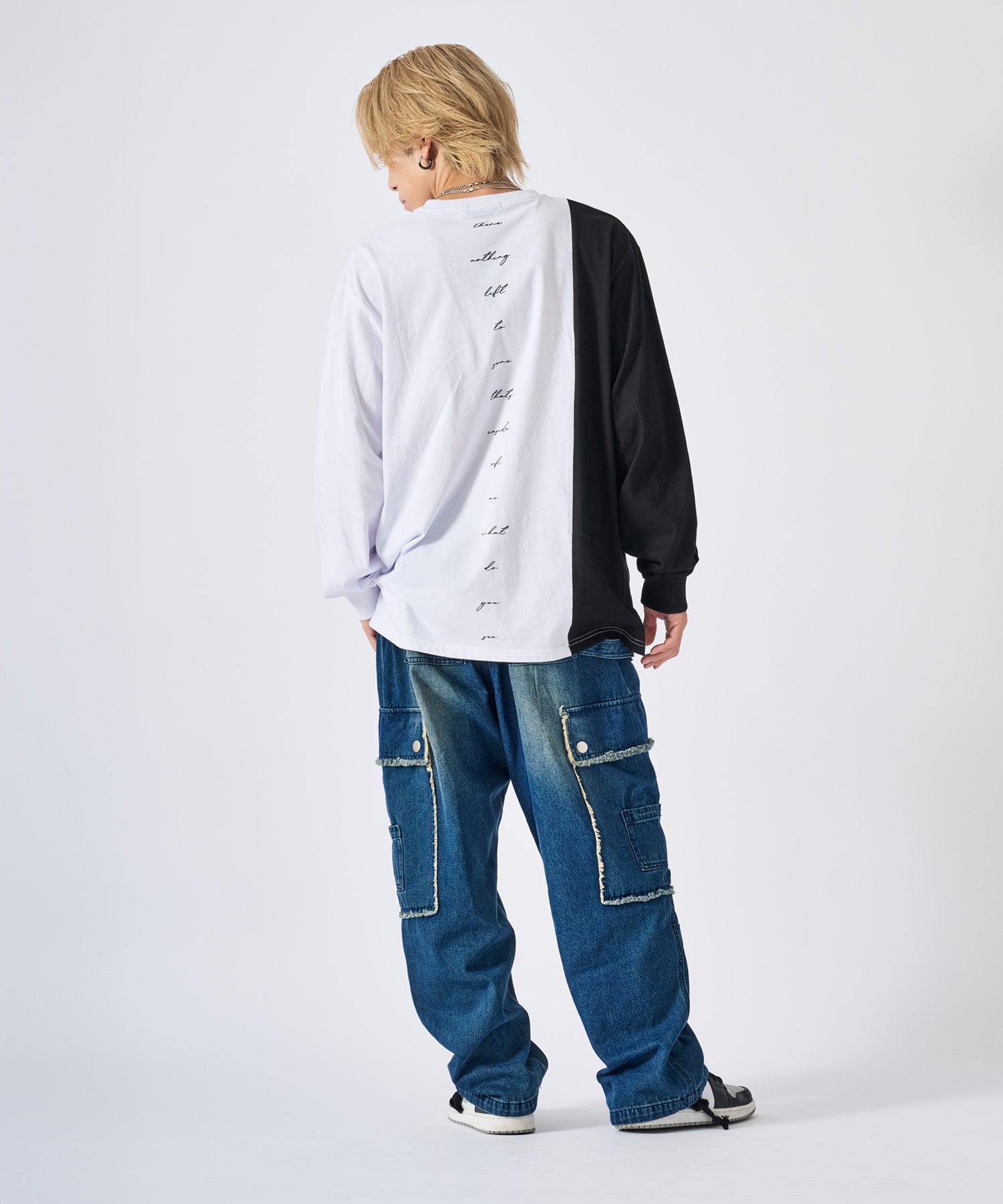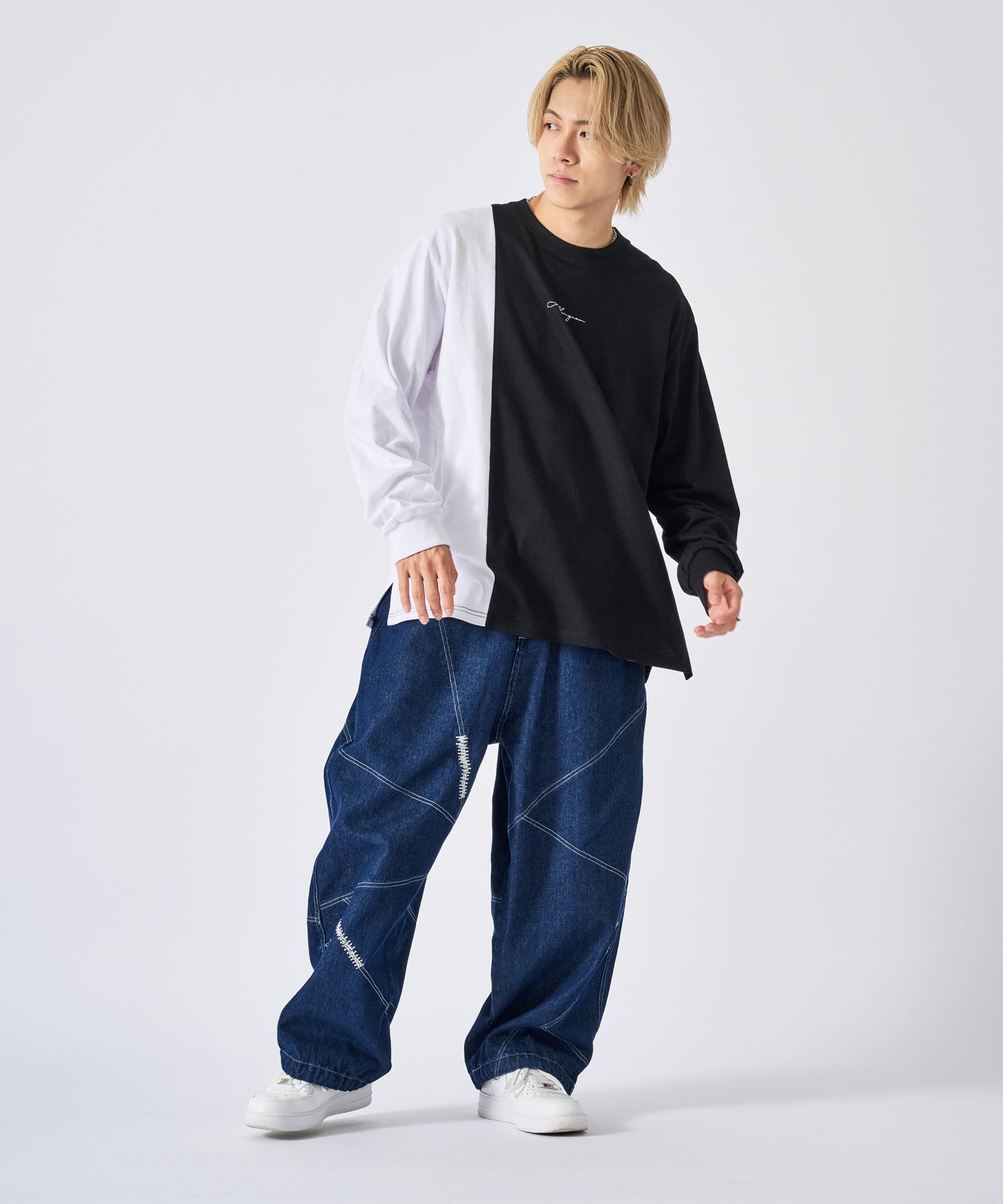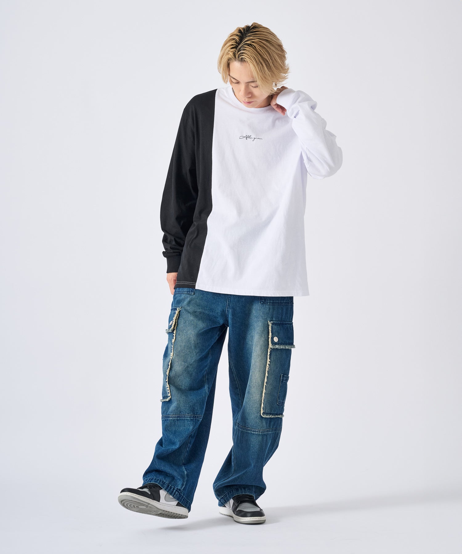 アシンメトリーな配色切り替えの長袖Tシャツ