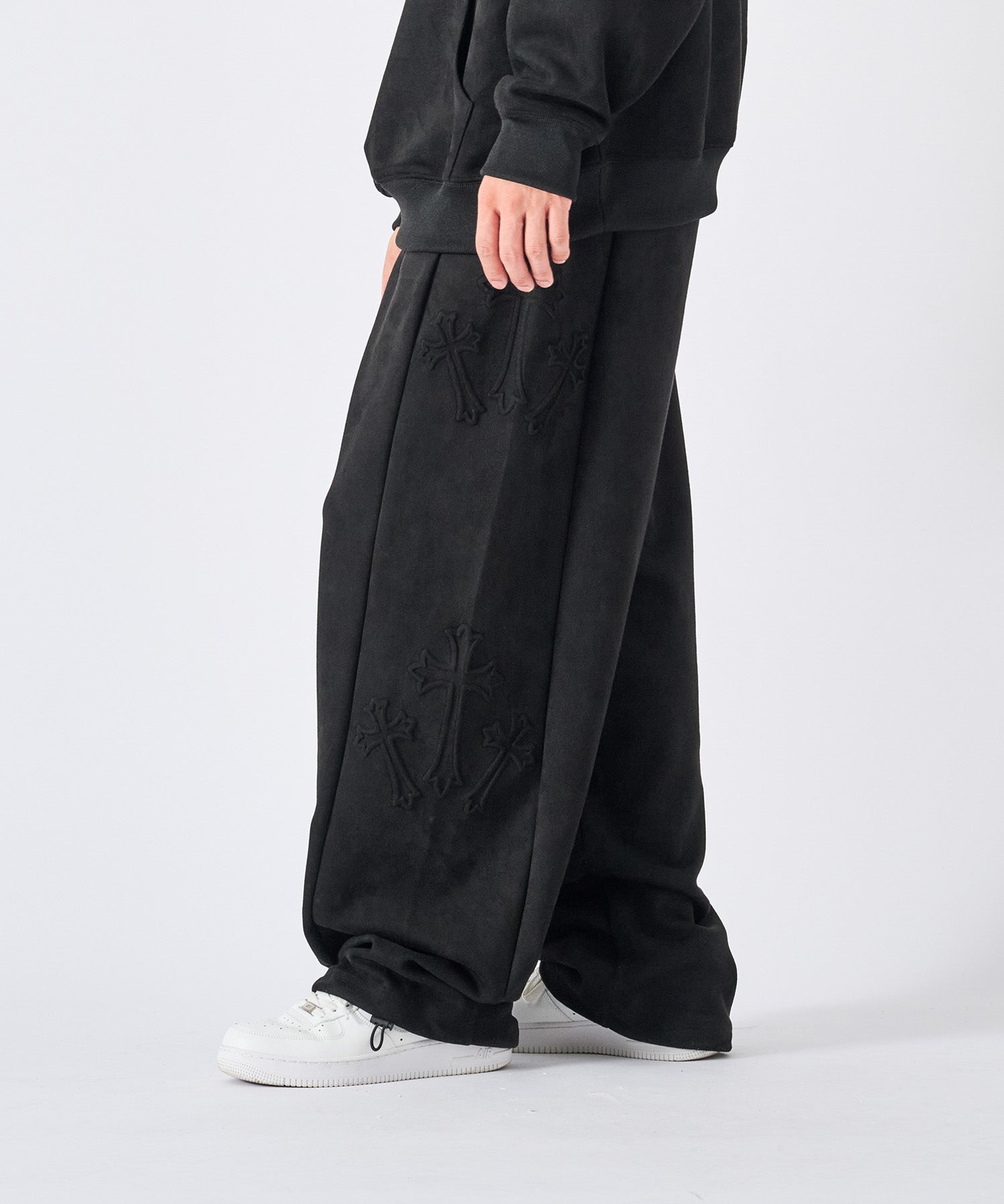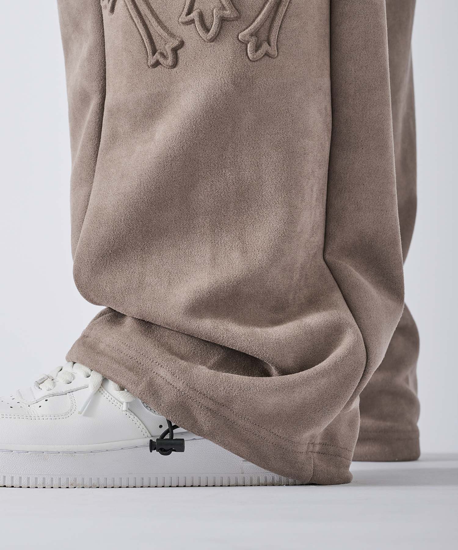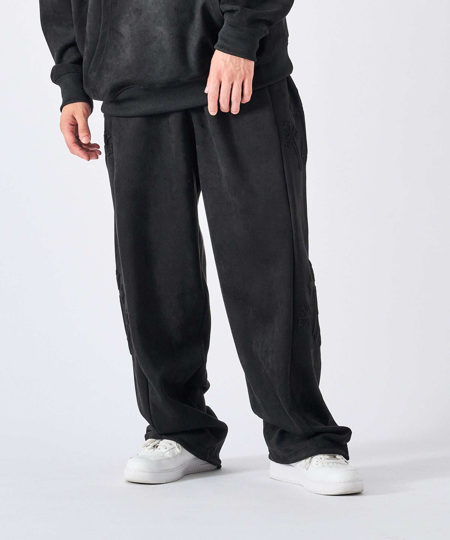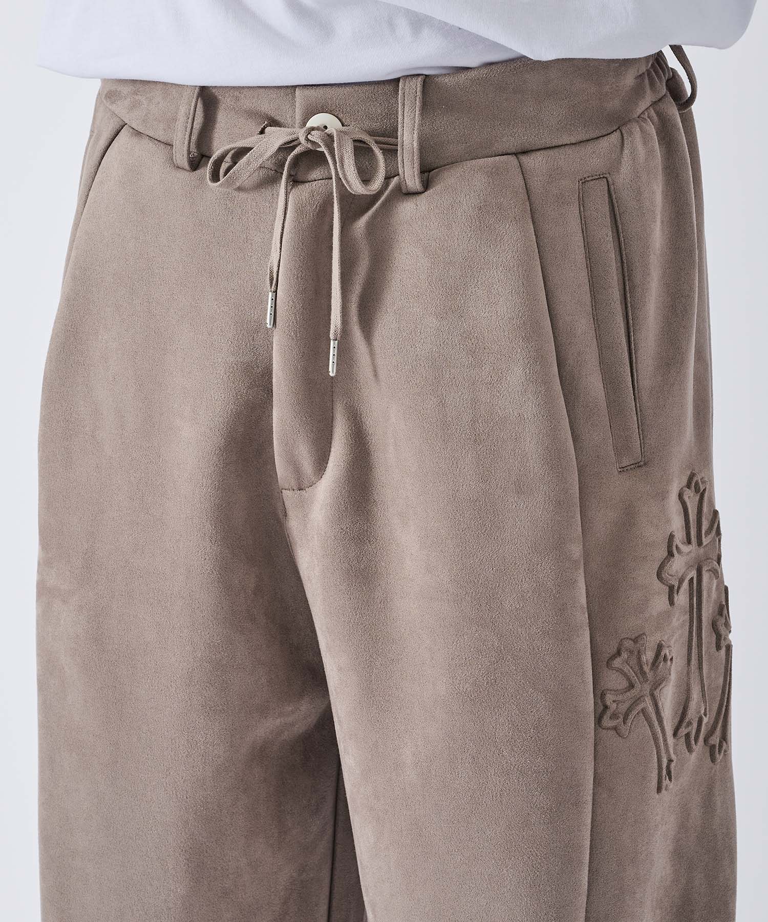 ゆったりとしたワイドシルエットながら、スエード素材だからこその独特のツヤが高級感を演出!