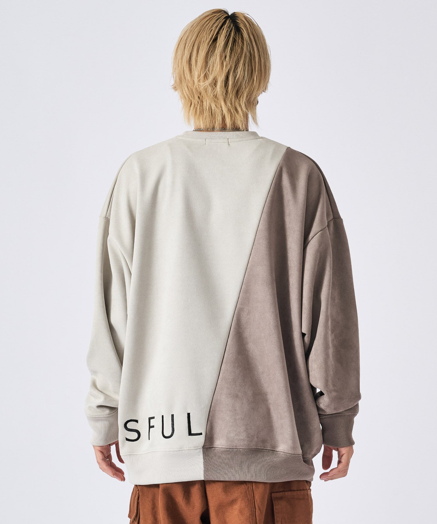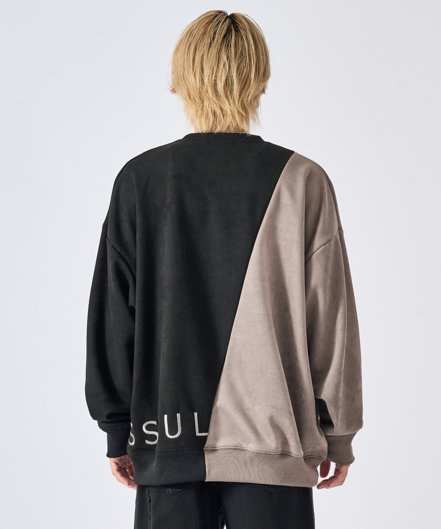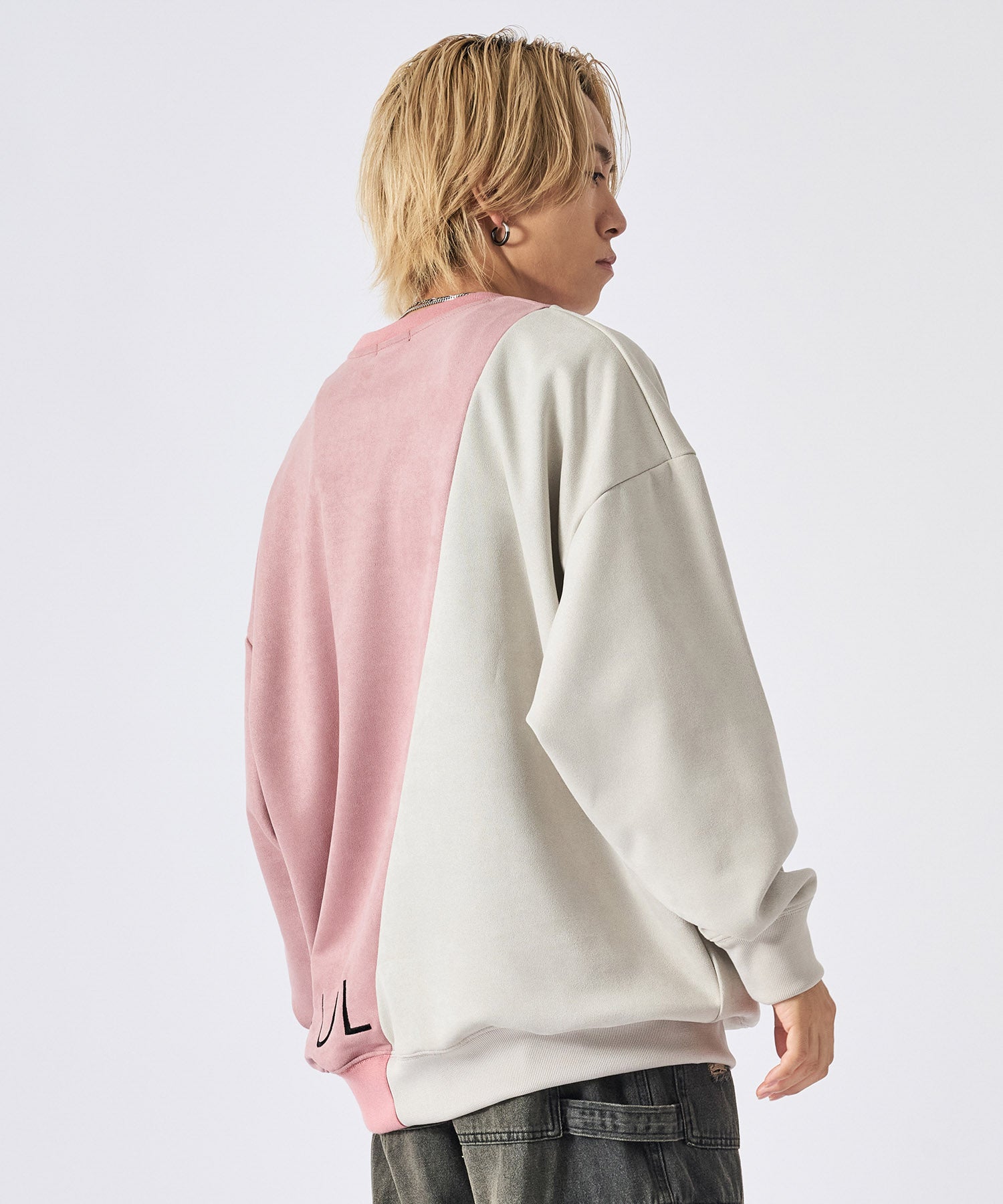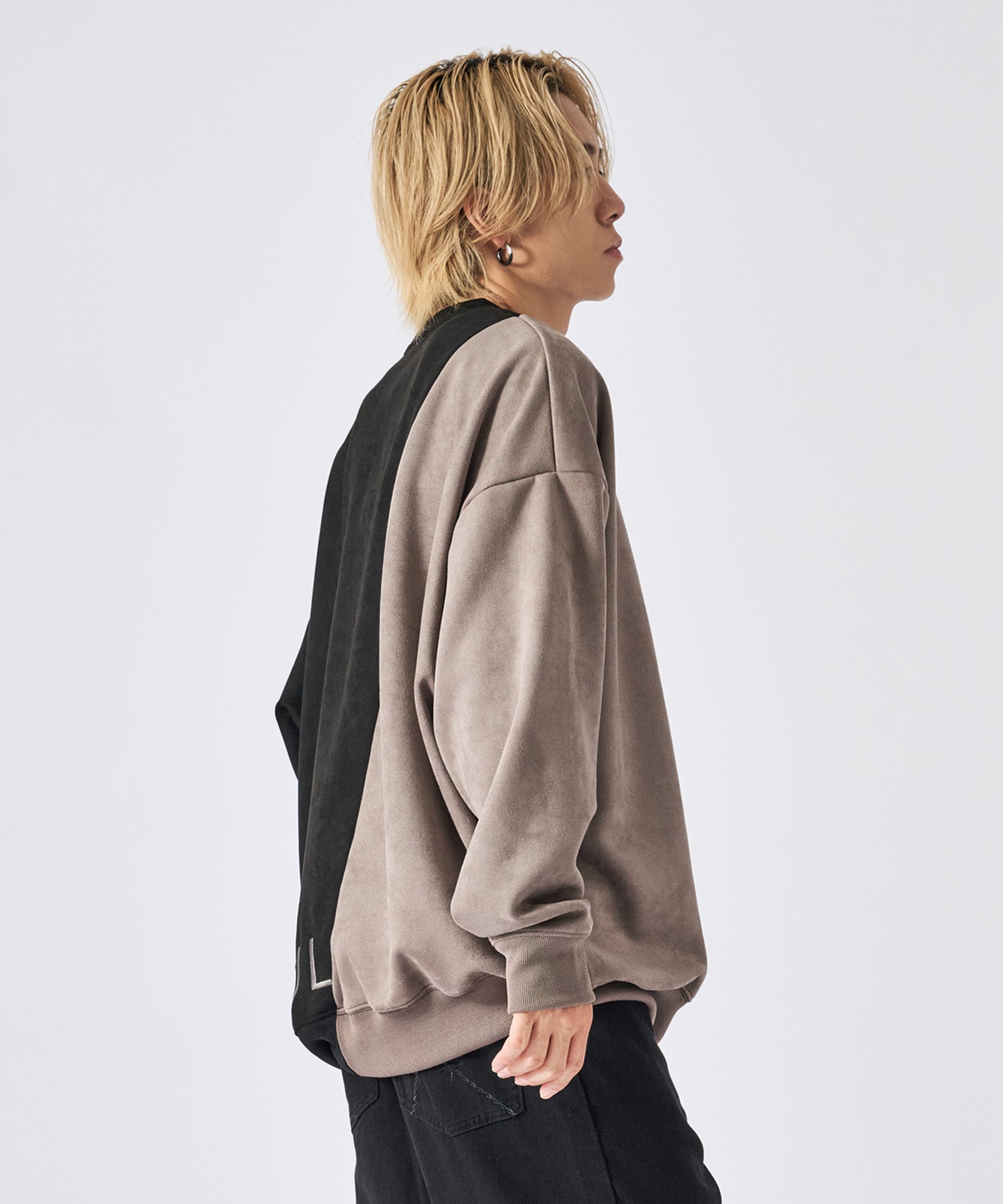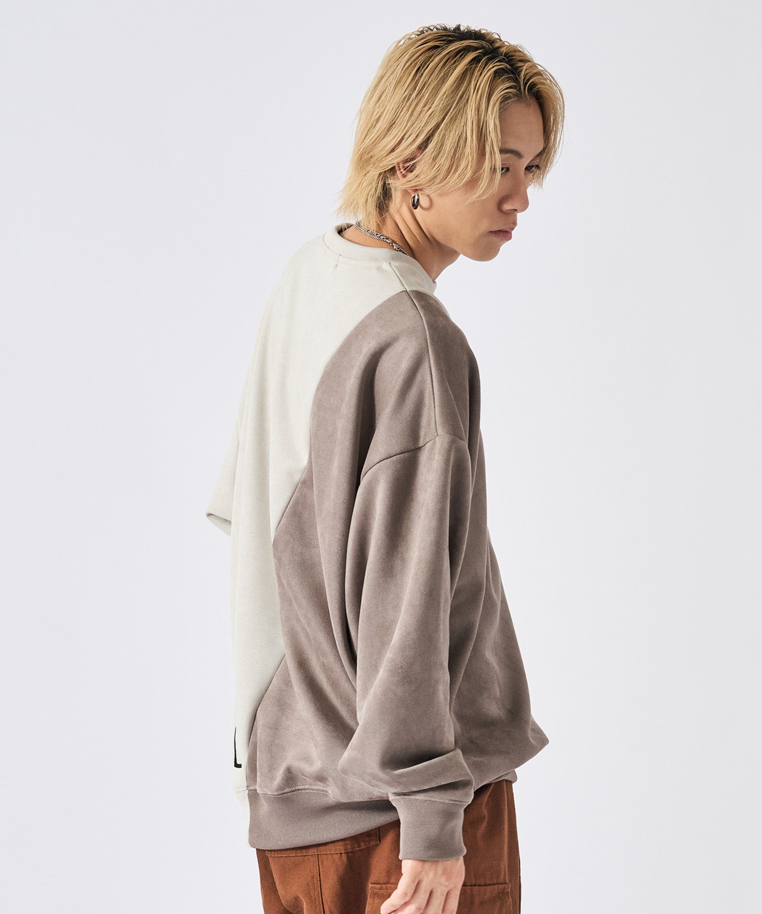 スエード調の素材をバイアスに切り替えたオーバーサイズのトレーナー