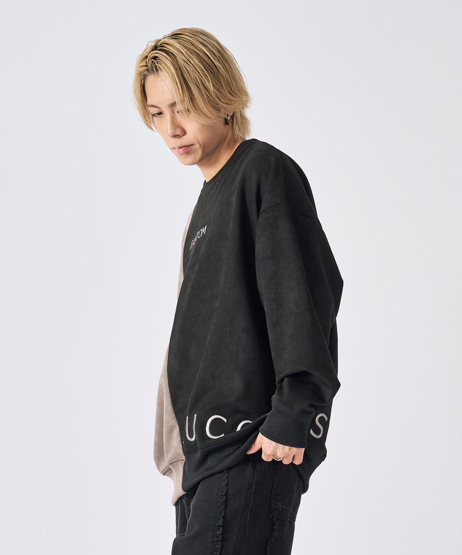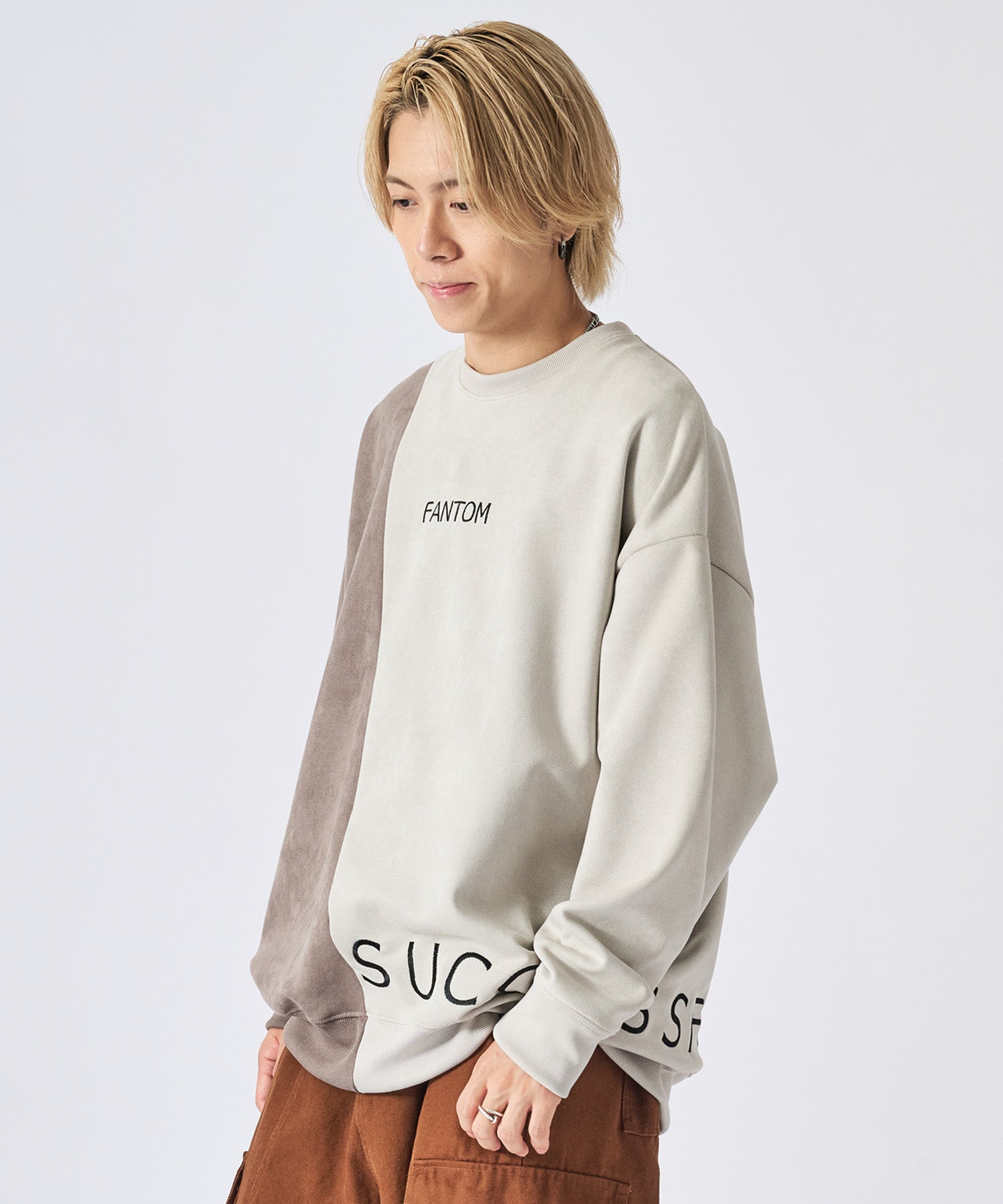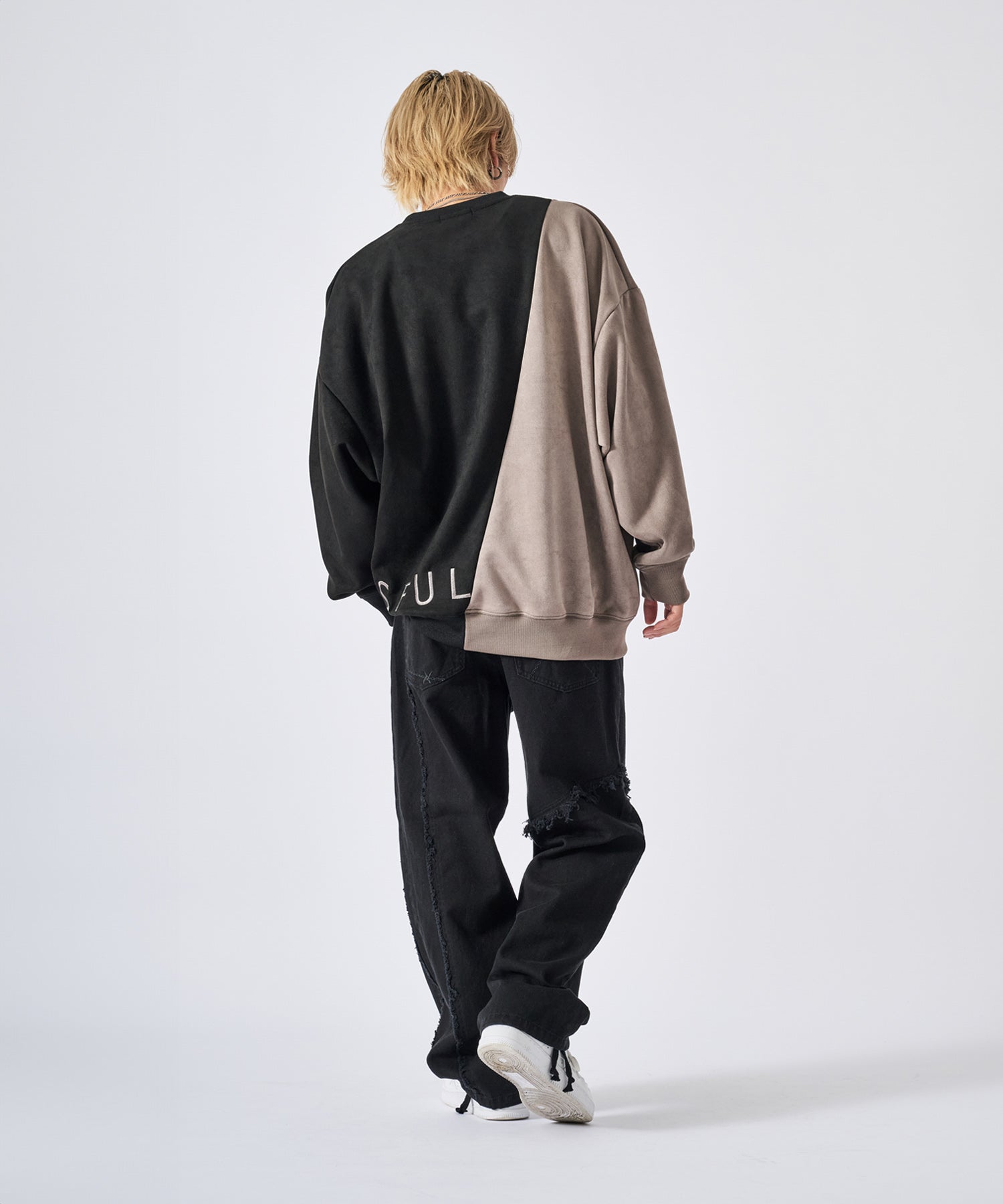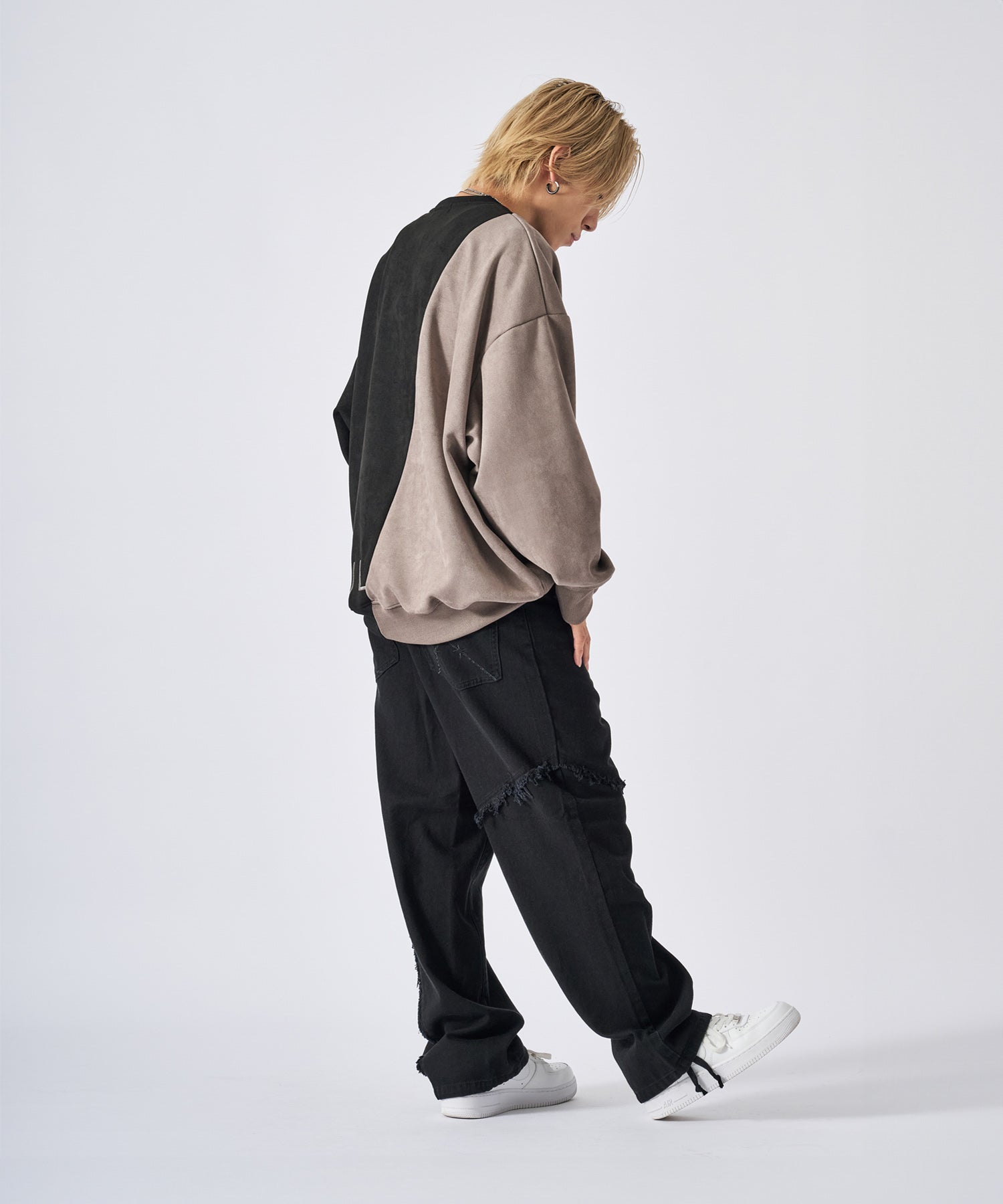 スエード調の素材をバイアスに切り替えたオーバーサイズのトレーナー
