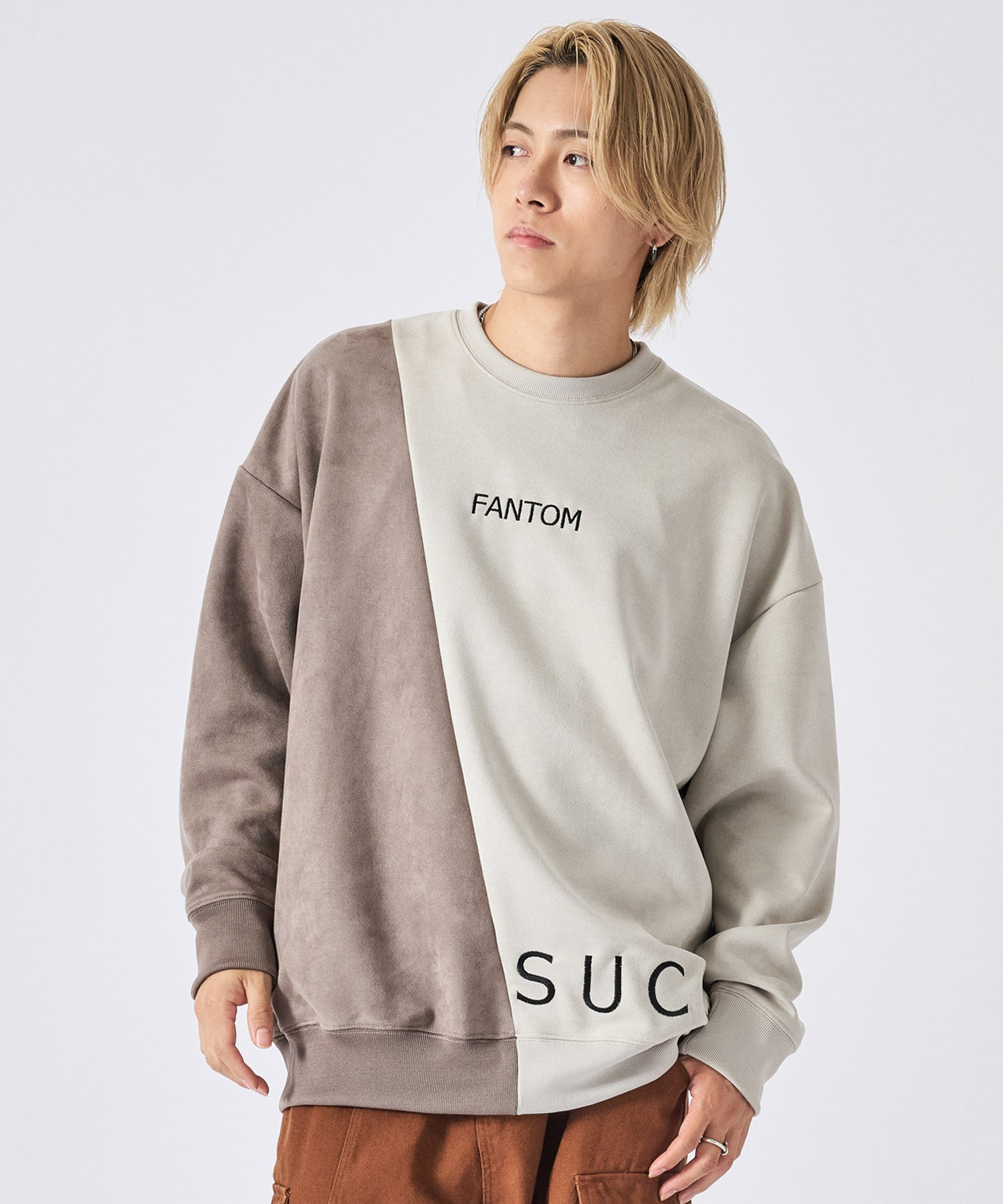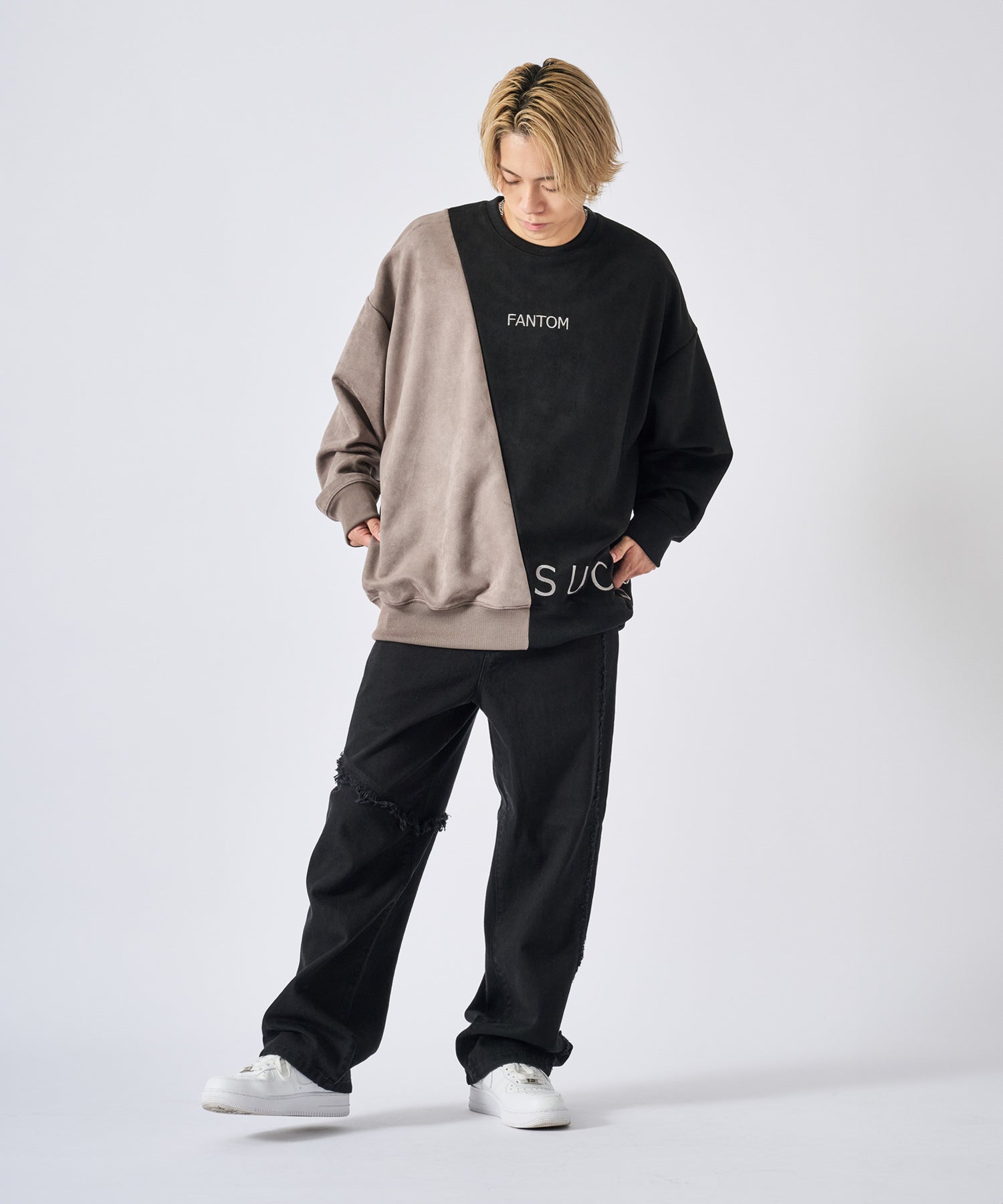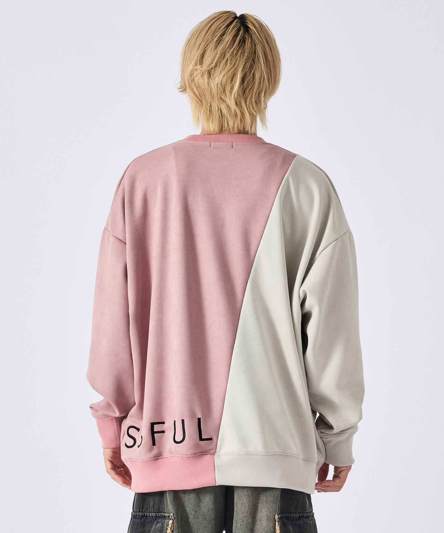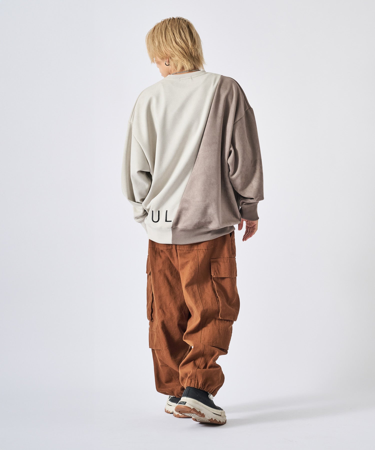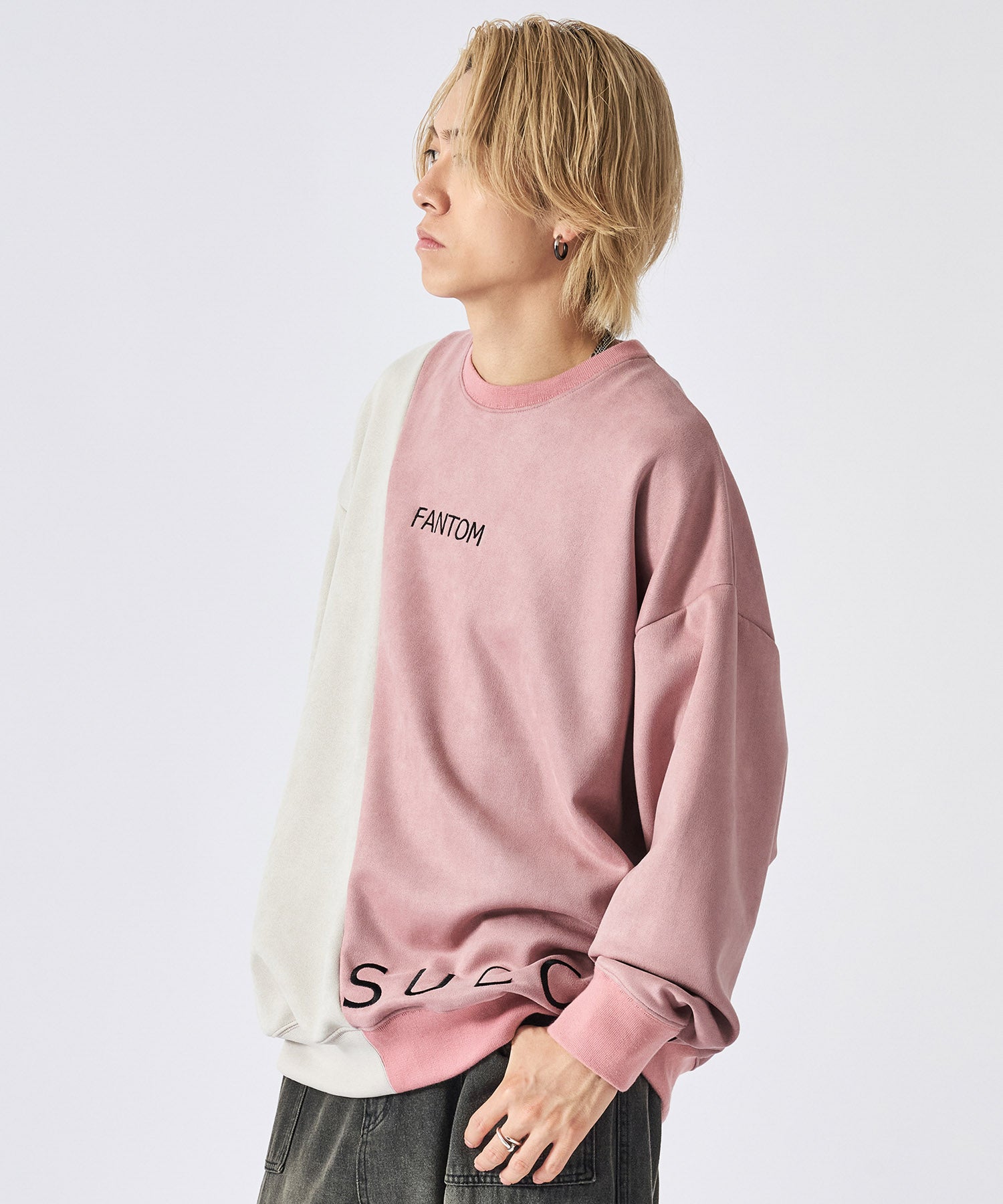 スエード調の素材をバイアスに切り替えたオーバーサイズのトレーナー