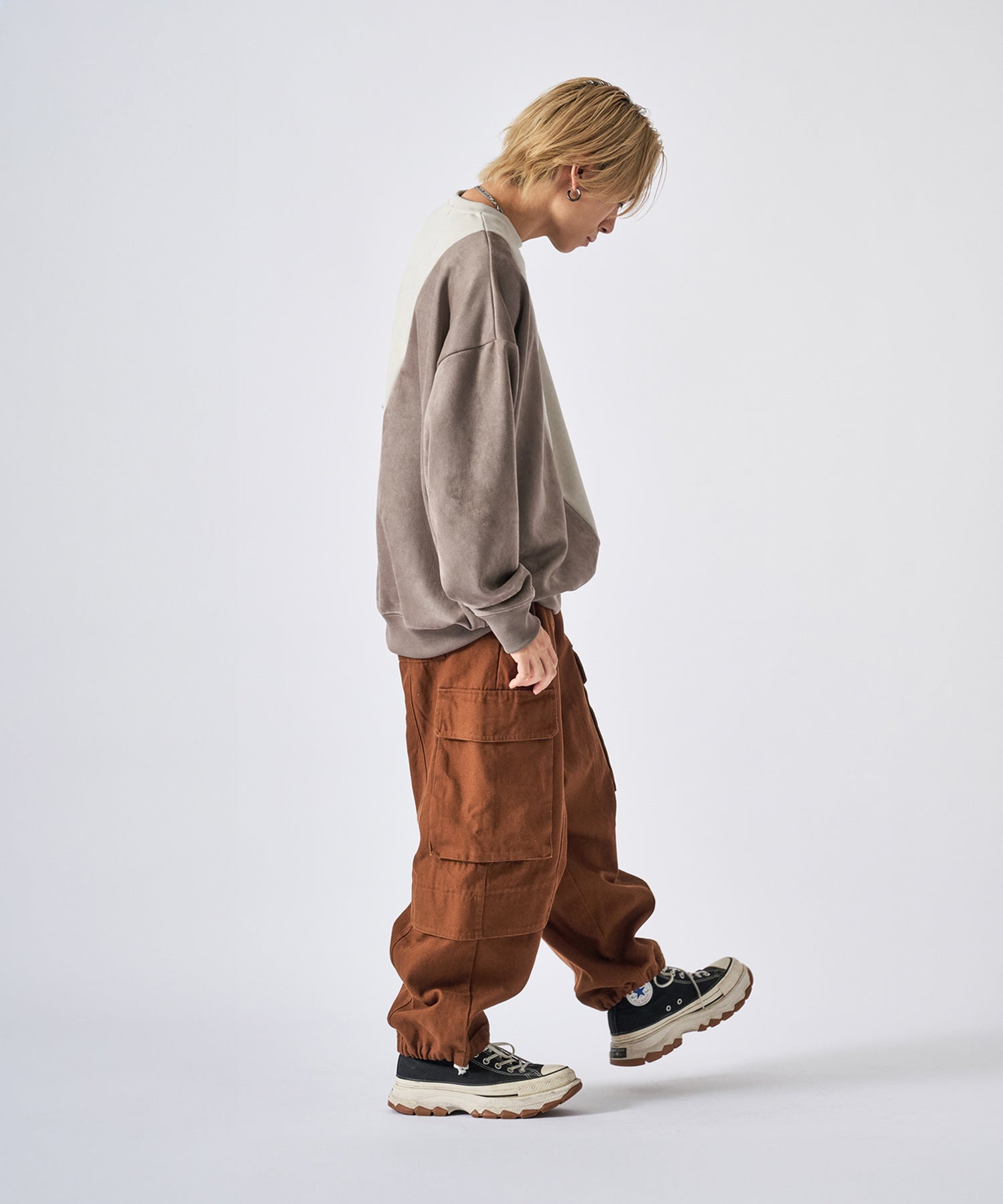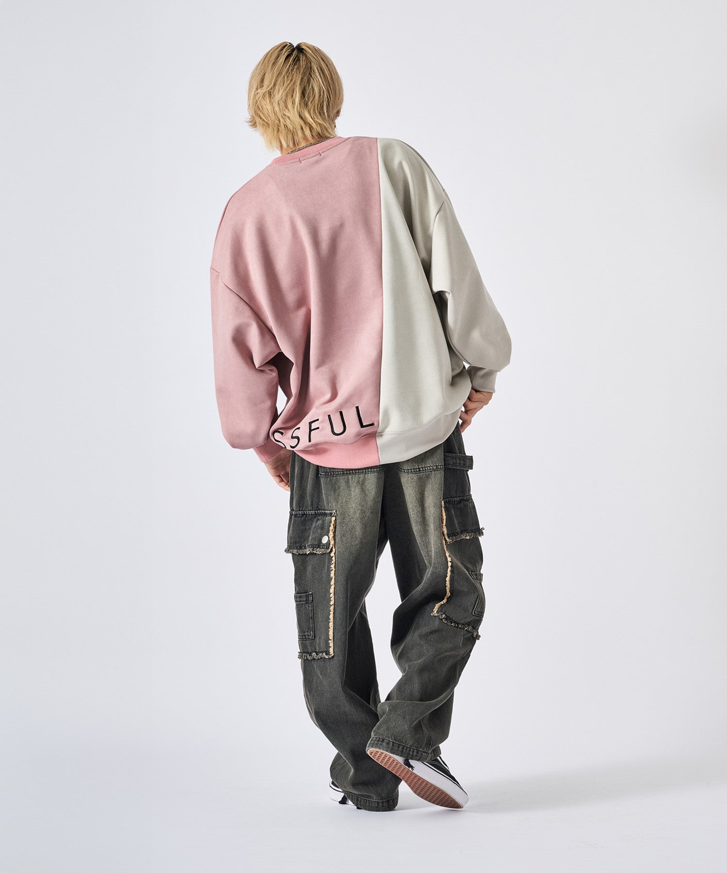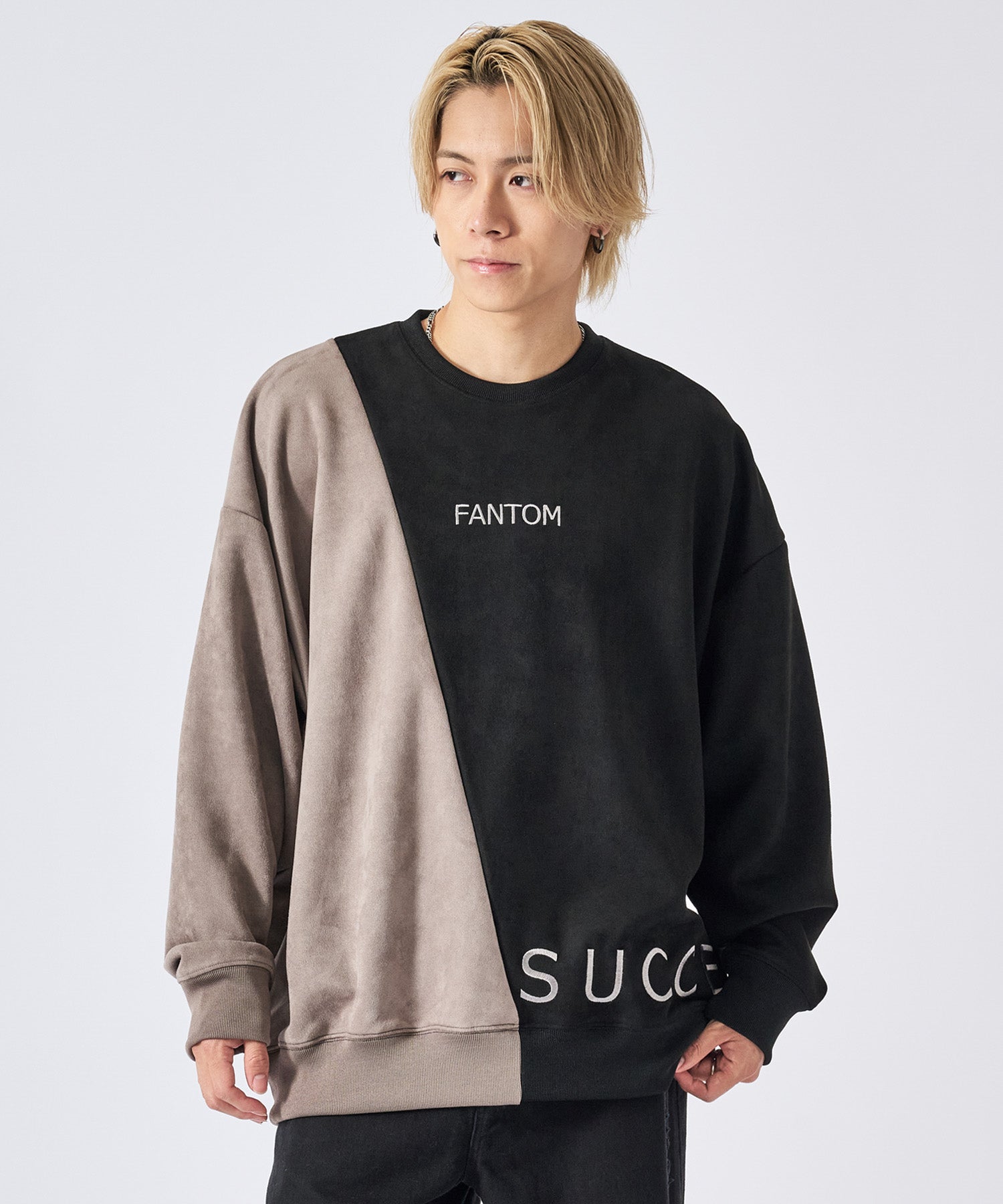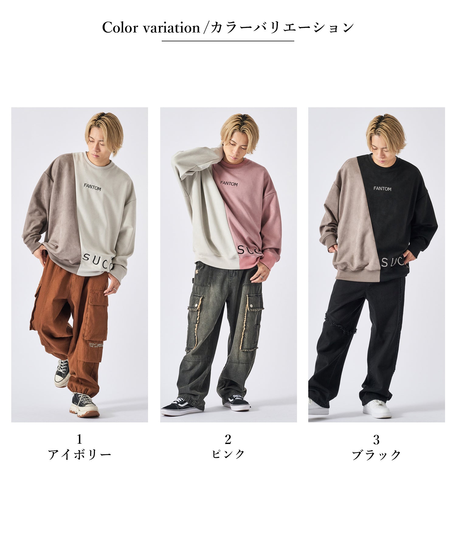 スエード調の素材をバイアスに切り替えたオーバーサイズのトレーナー