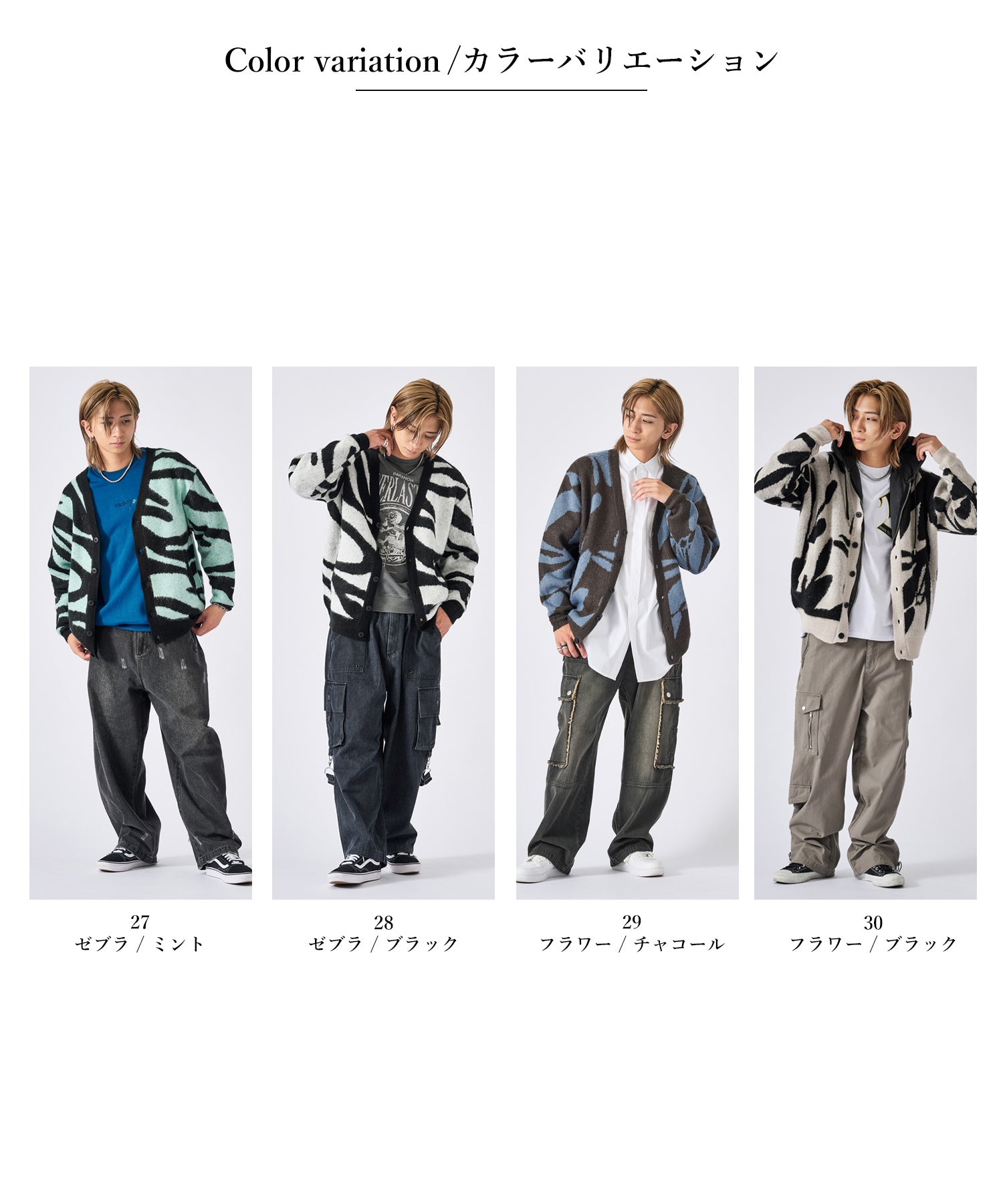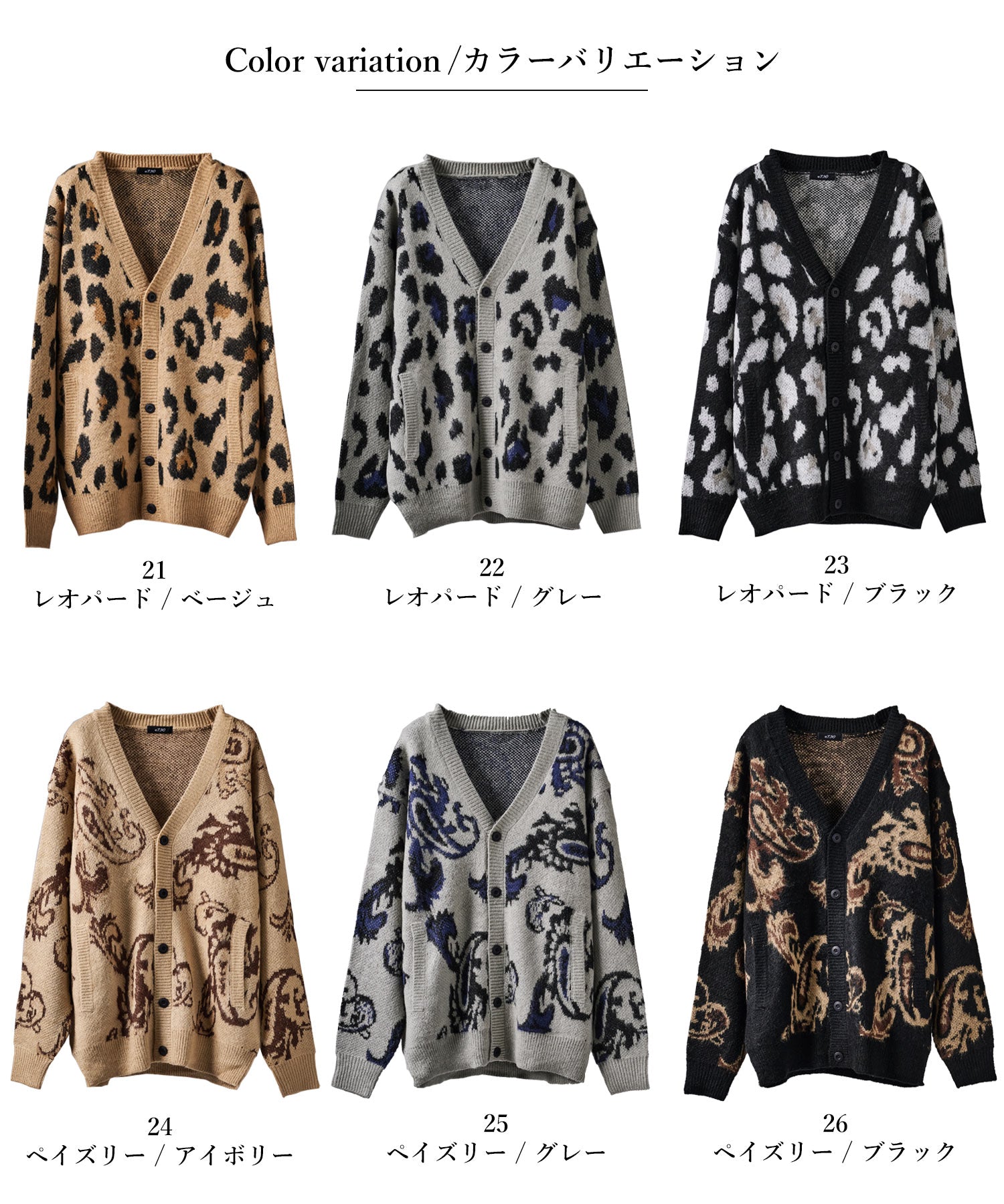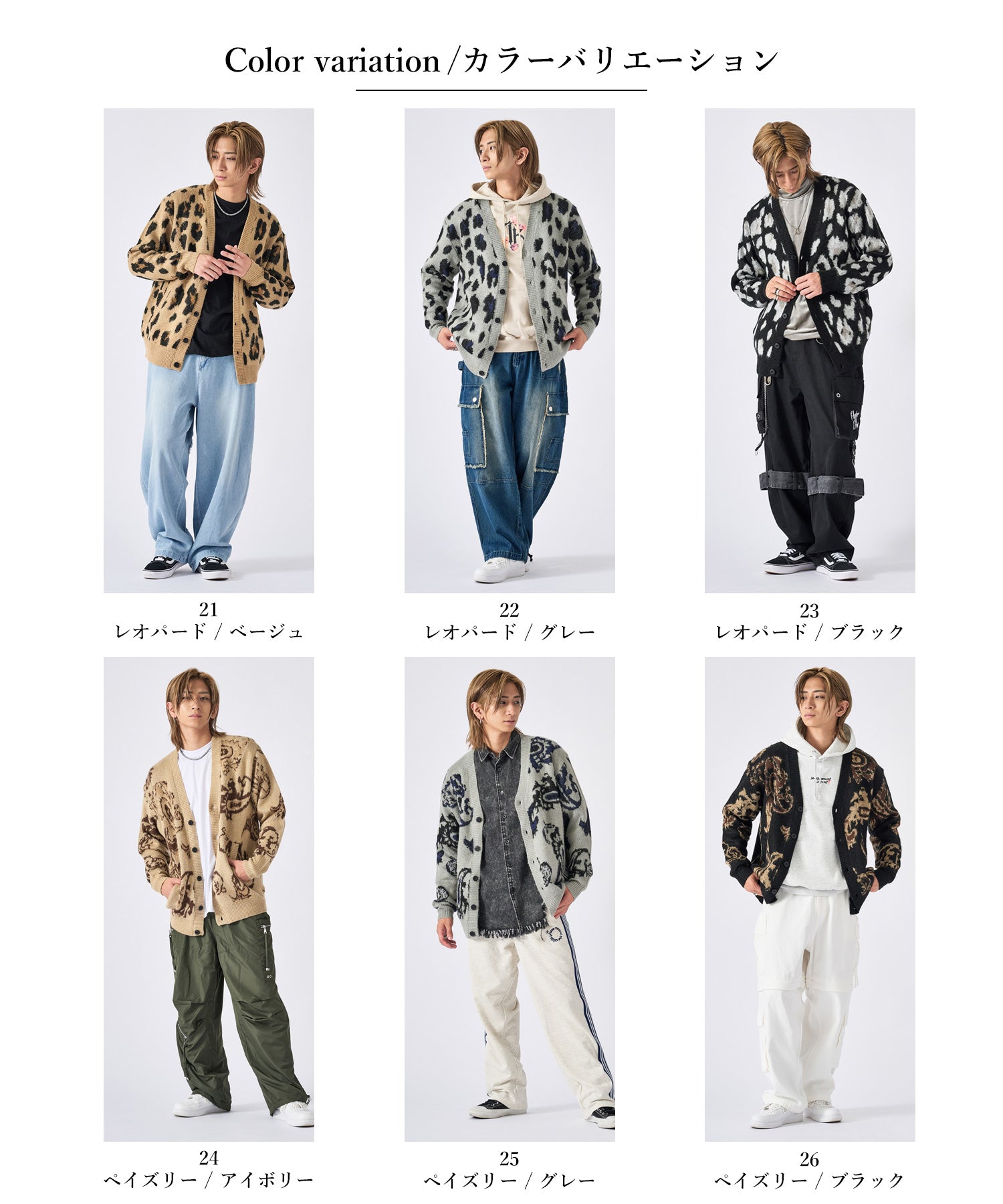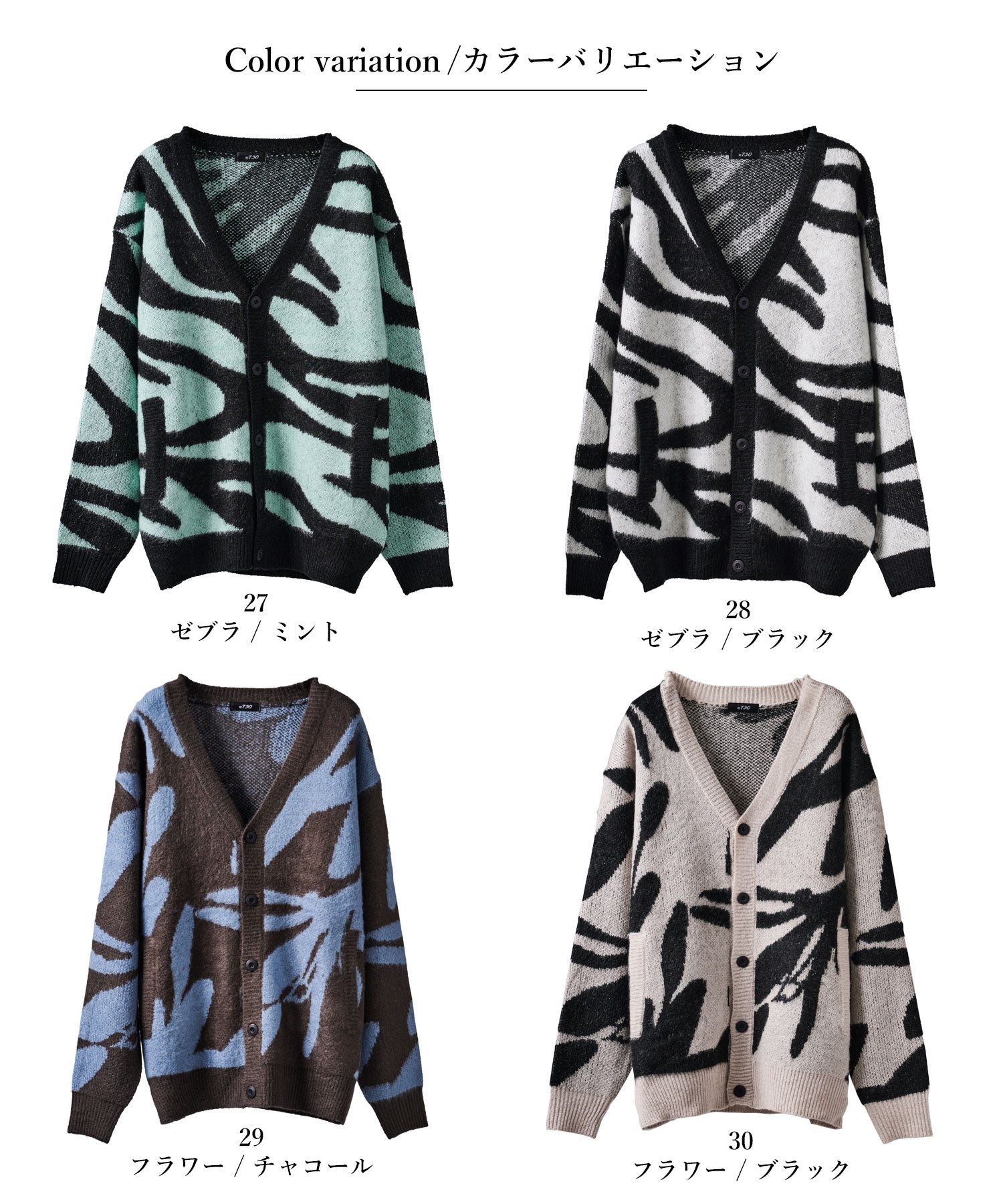 ジャガードで編み込んだ総柄が印象的で、ヒョウ柄、ペイズリー柄、ゼブラ柄に加えて、フラワー柄となど柄バリエーションが豊富なビッグシルエットでライトアウターとして着回せるアイテム