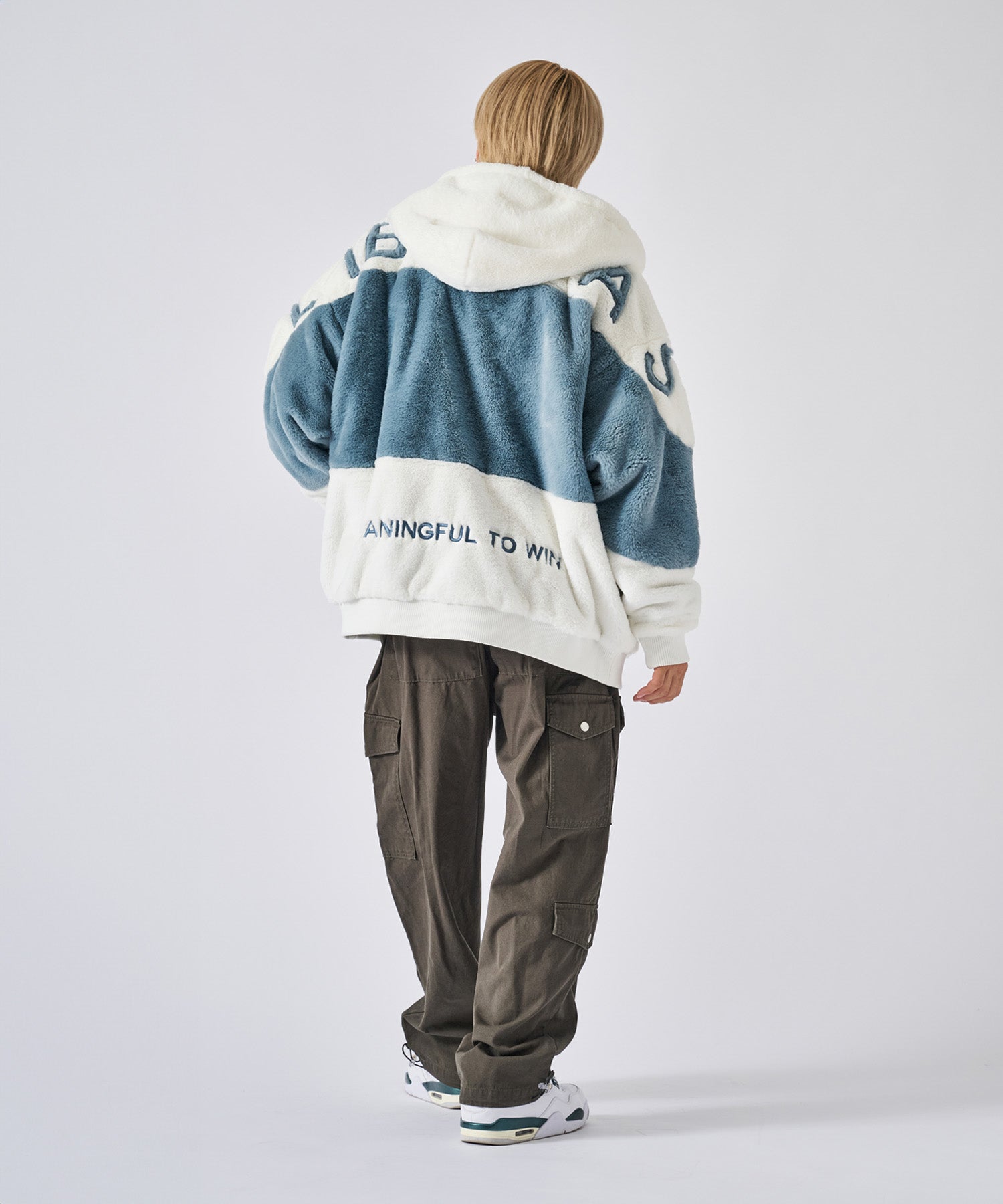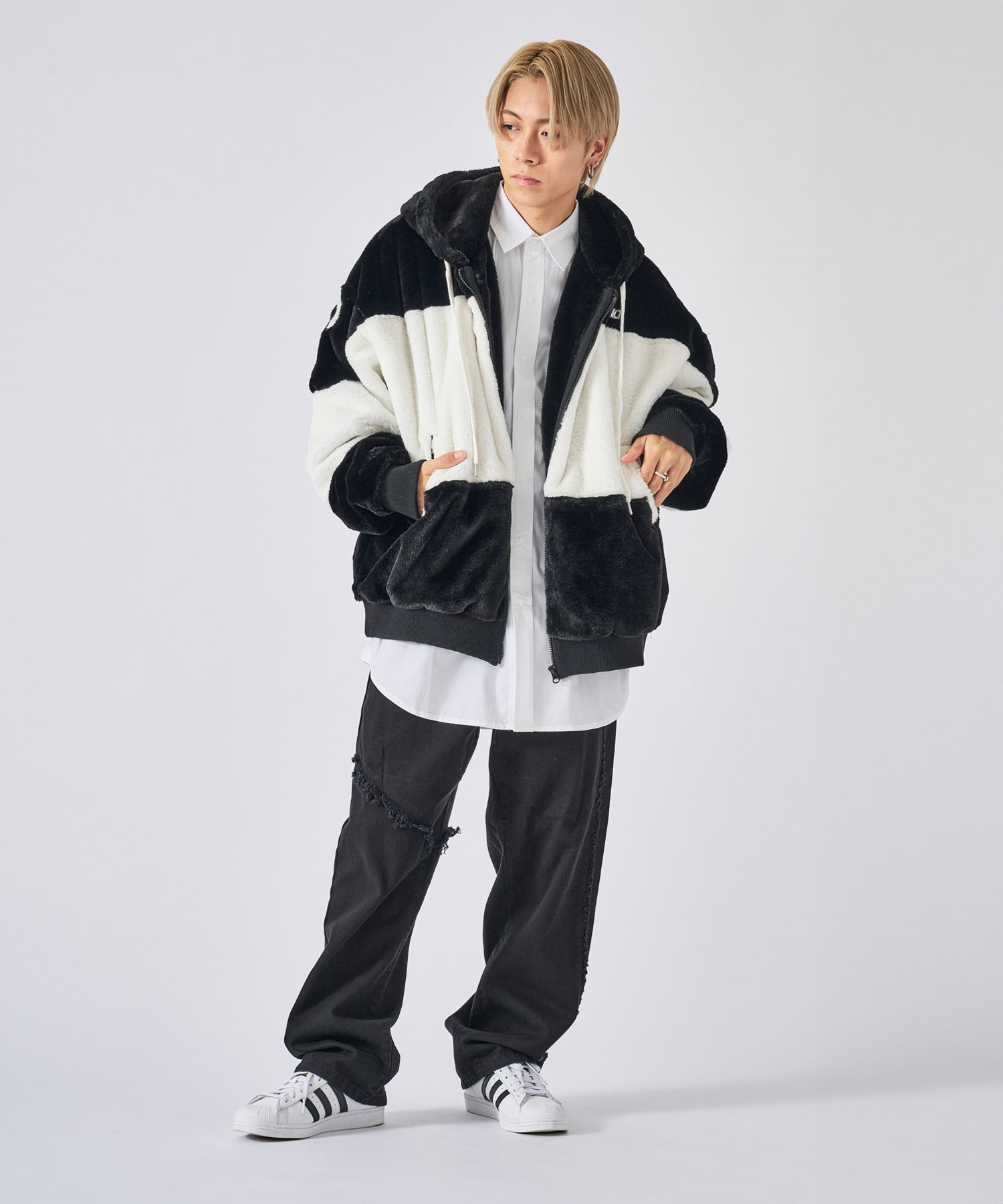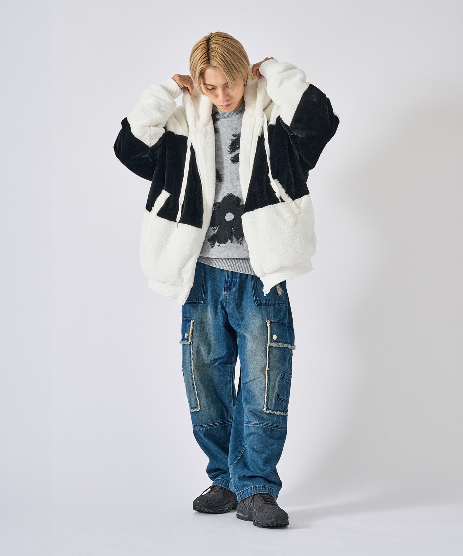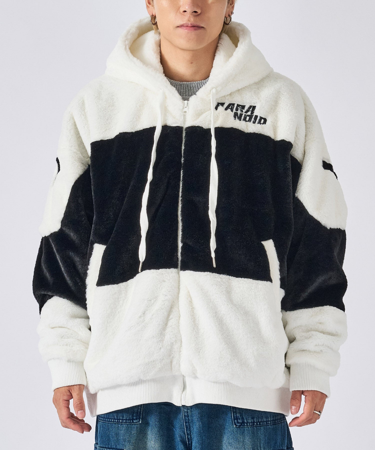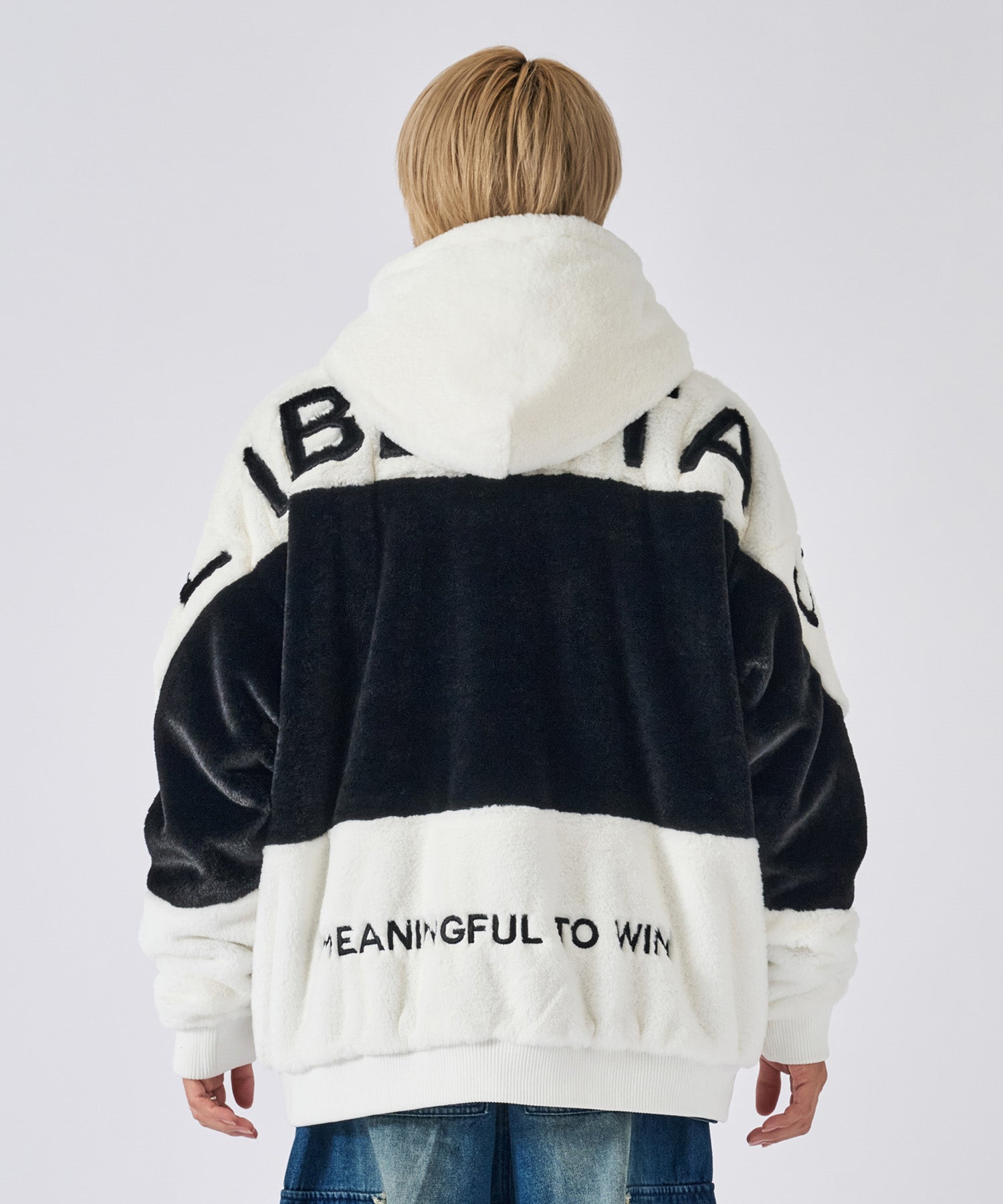 毛足の長いポリエステルのストレートファーを使用しており、ボリューム感があって暖かく、またその肌触りの良さは多くのお客様から支持され続けている素材