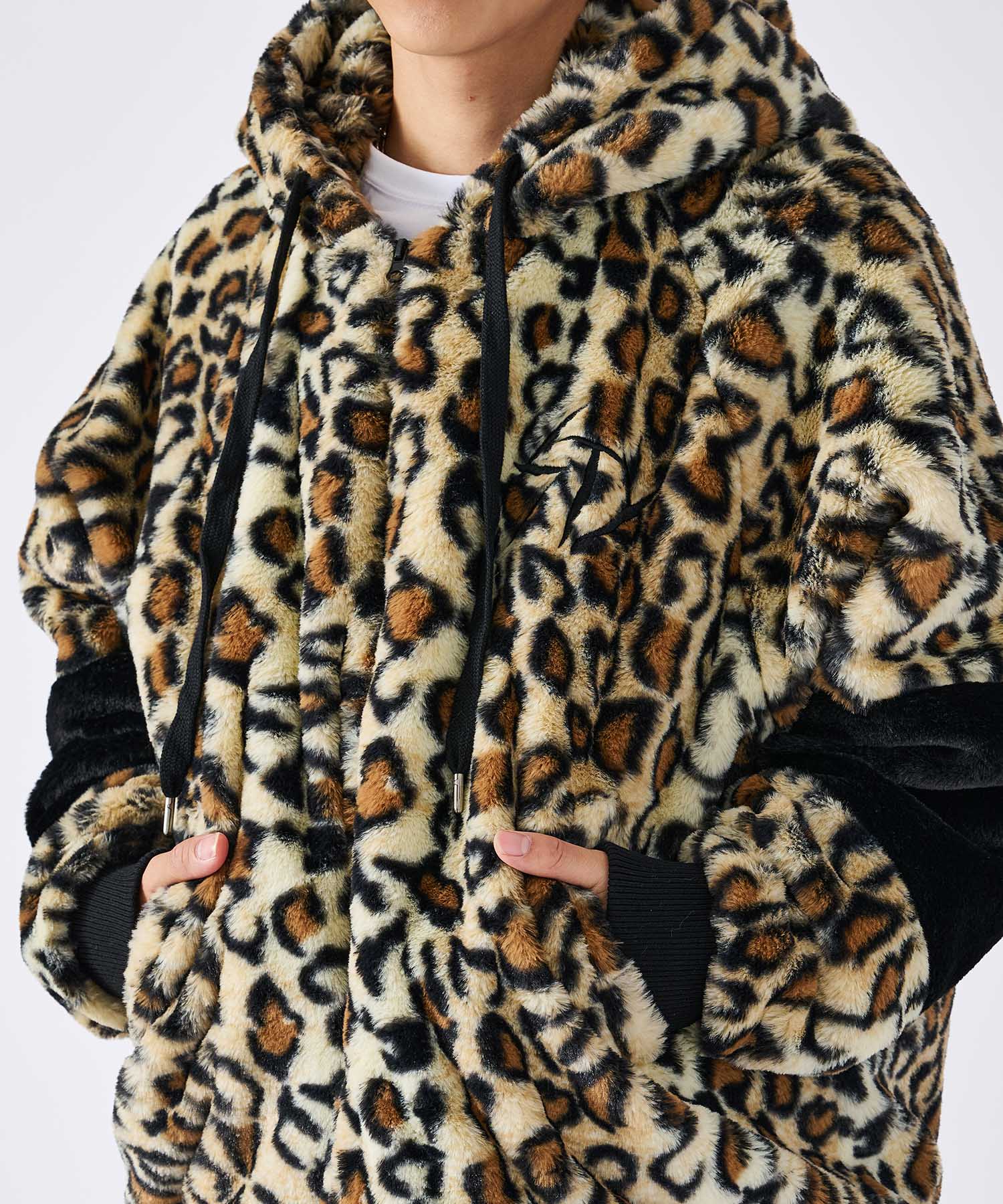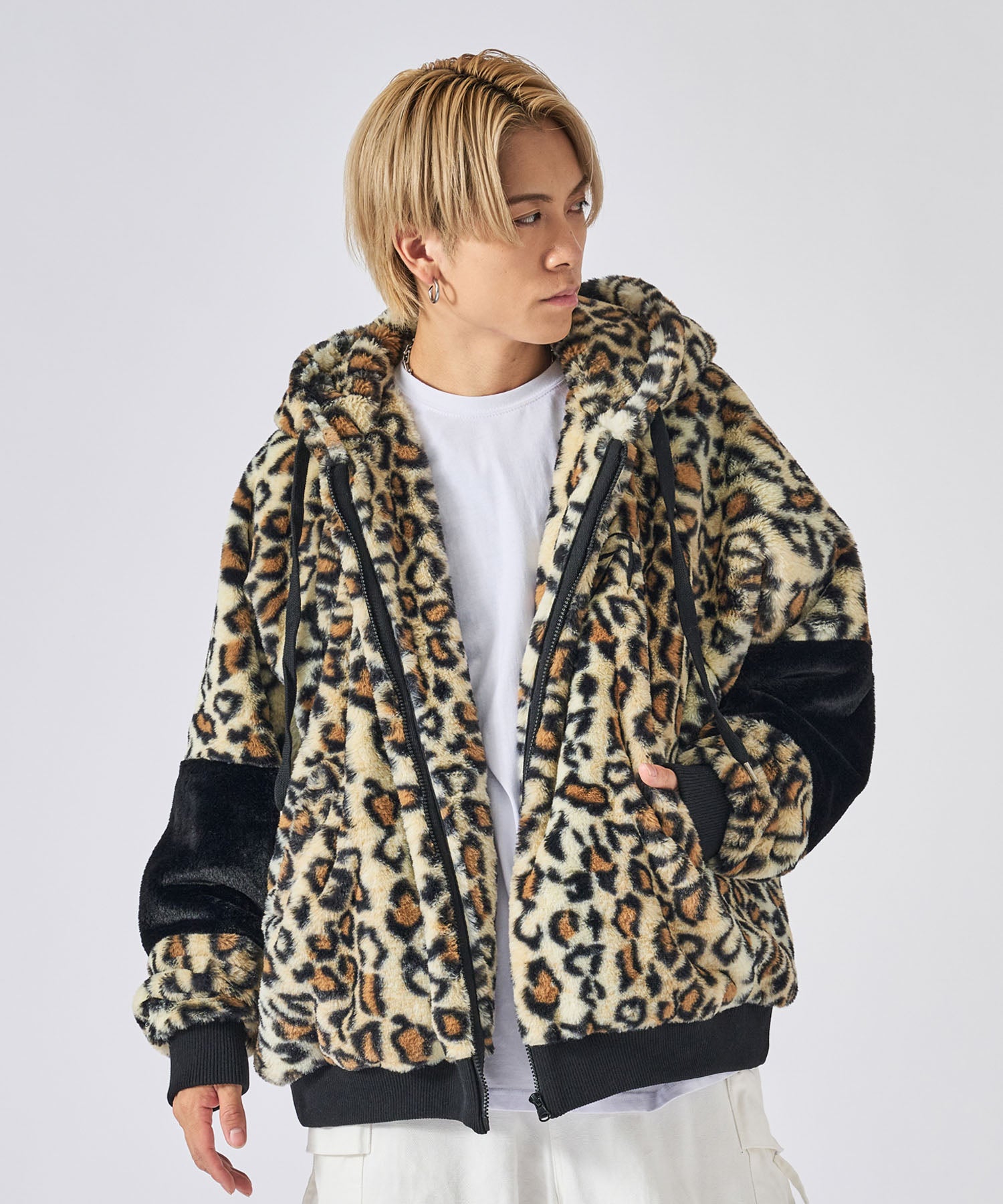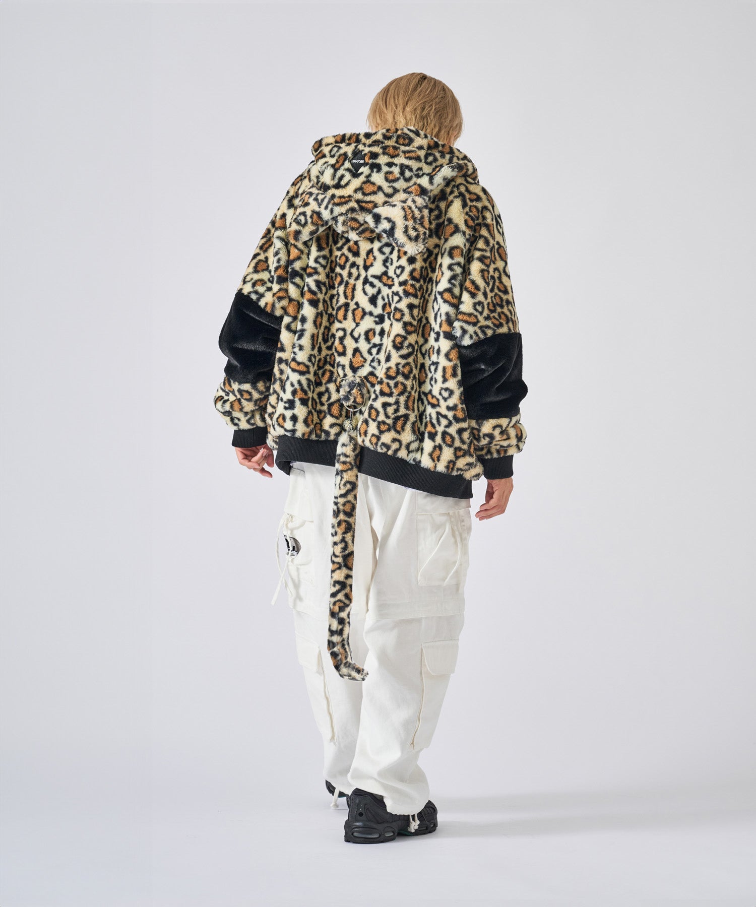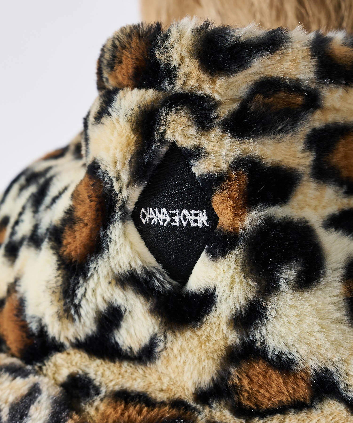 毛足の長いポリエステルのストレートファーを使用しており、ボリューム感があって暖かく、またその肌触りも最高で豹柄と黒の2パターンを用意☆