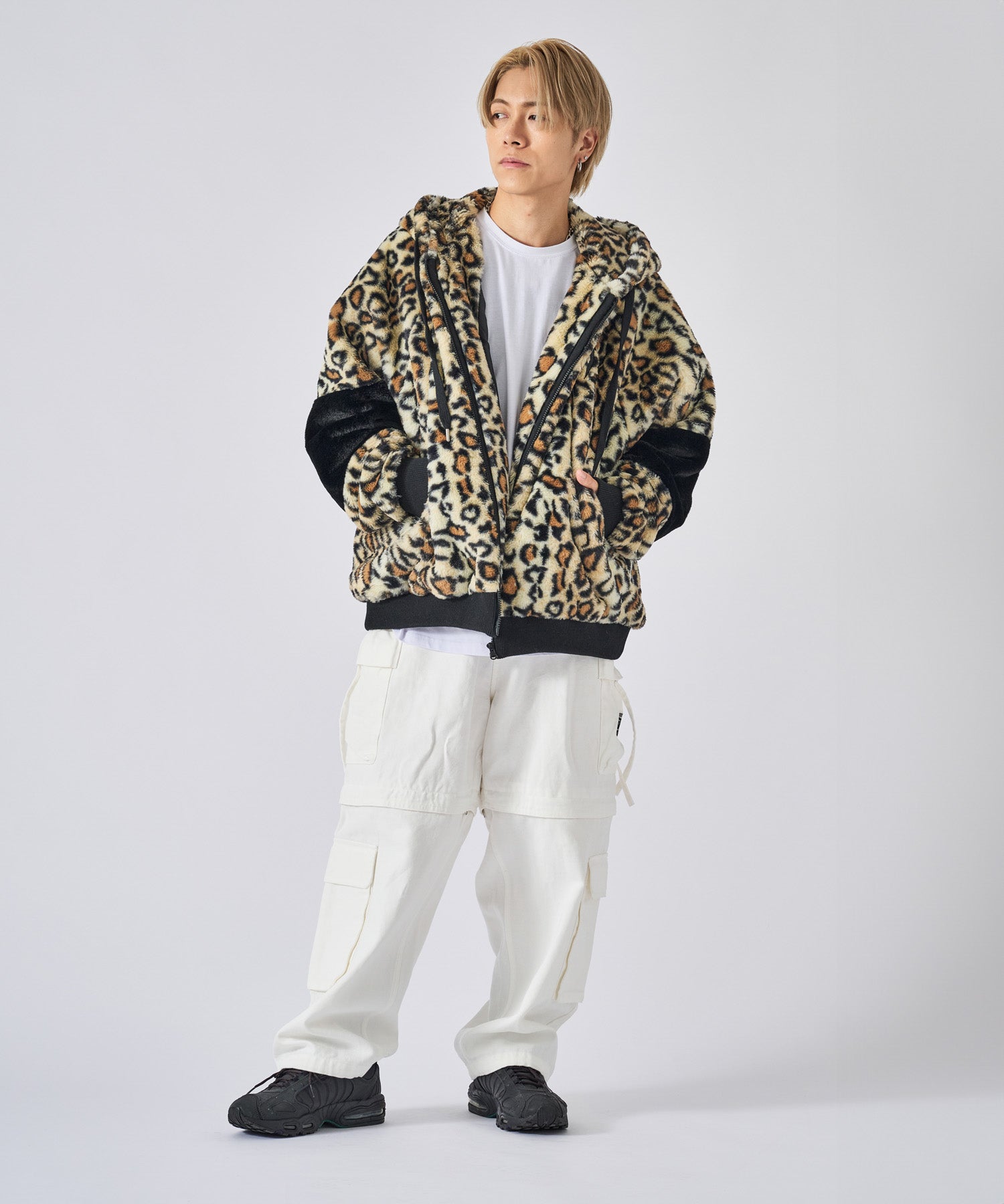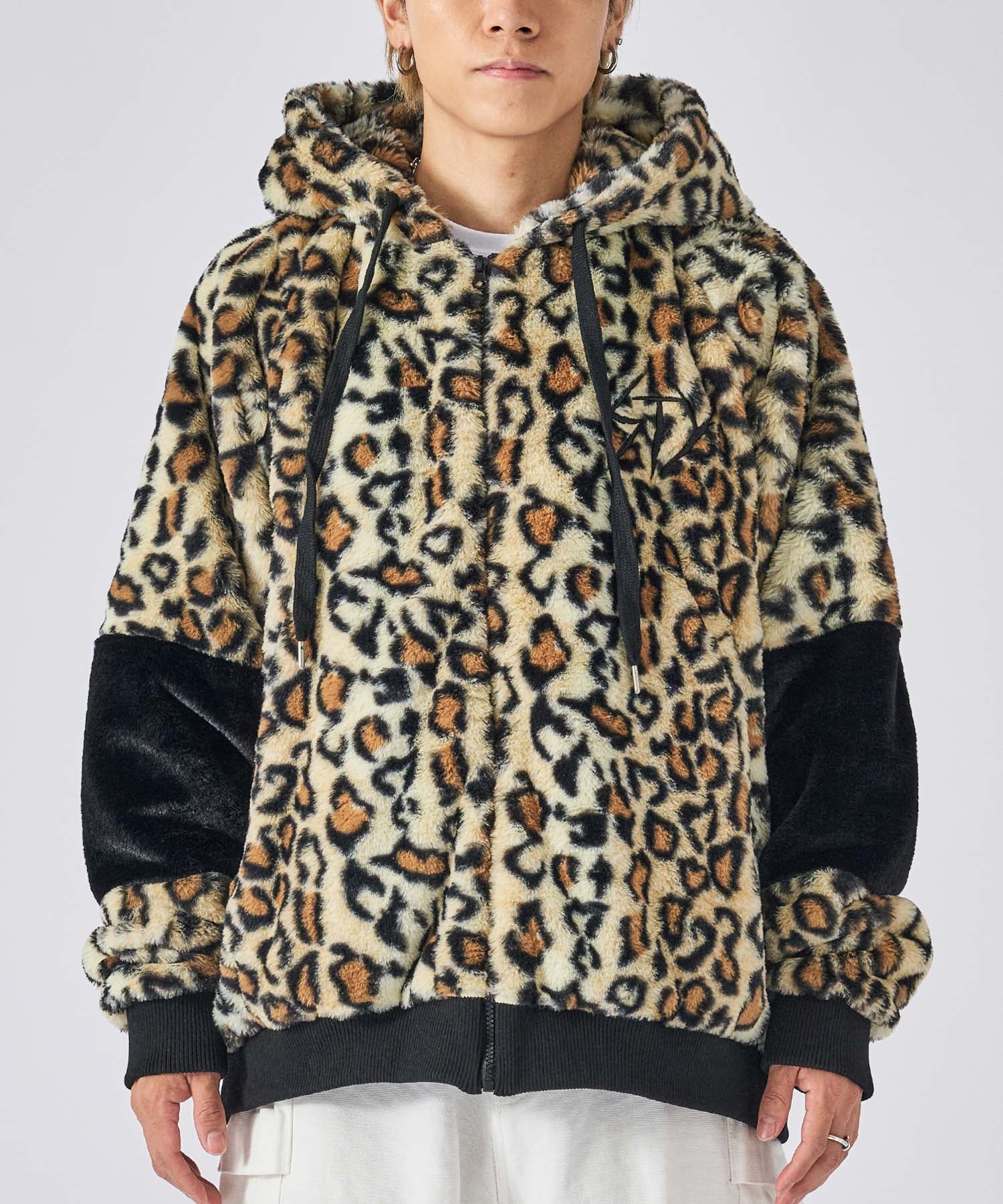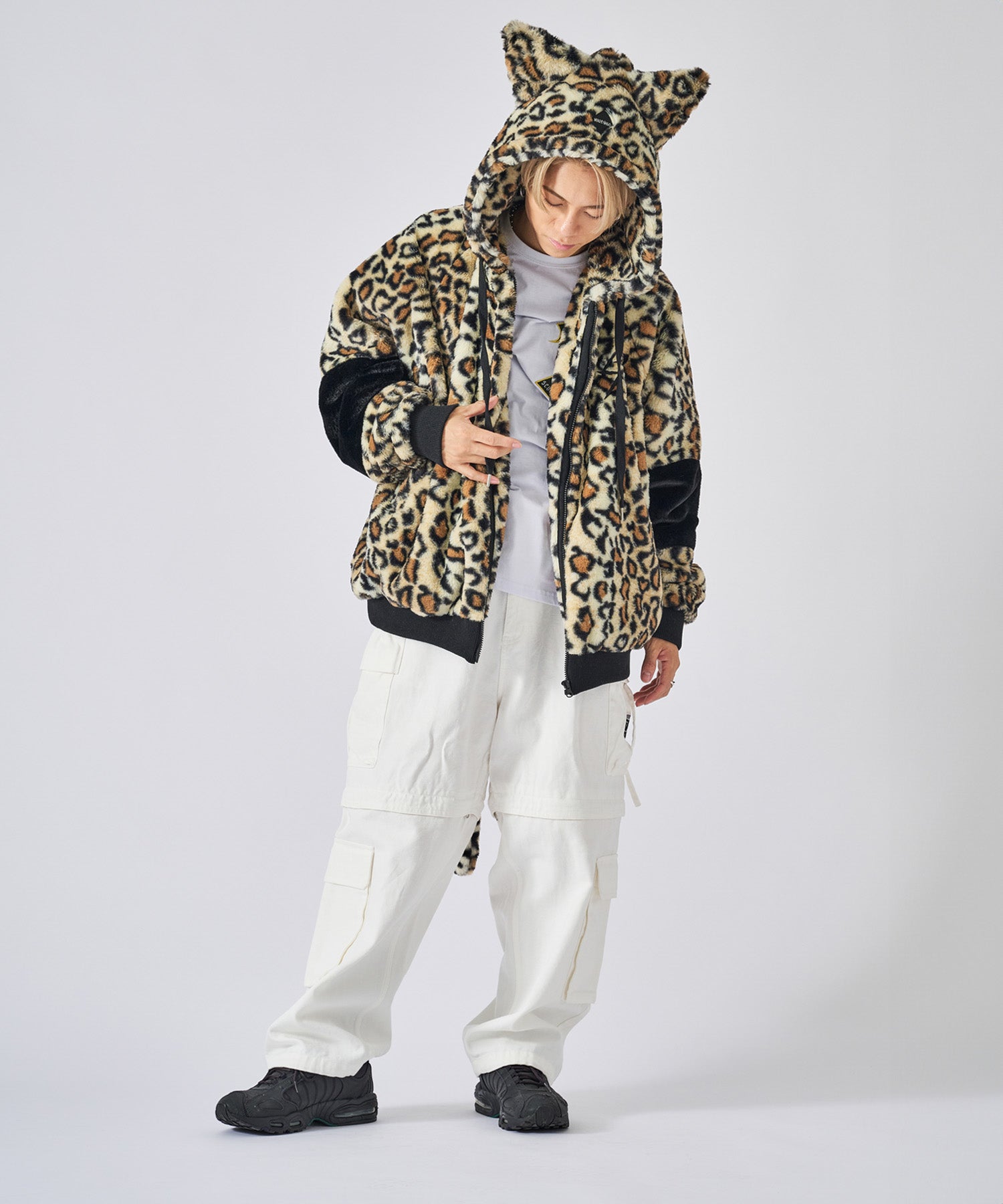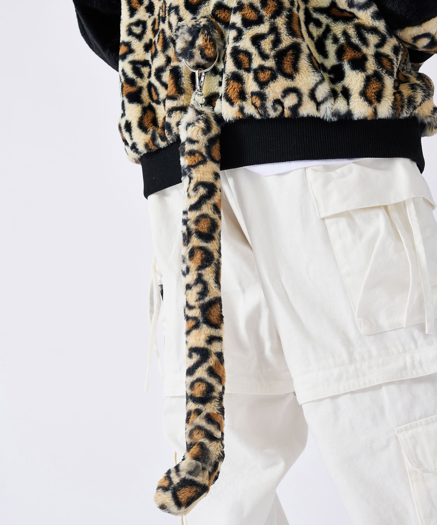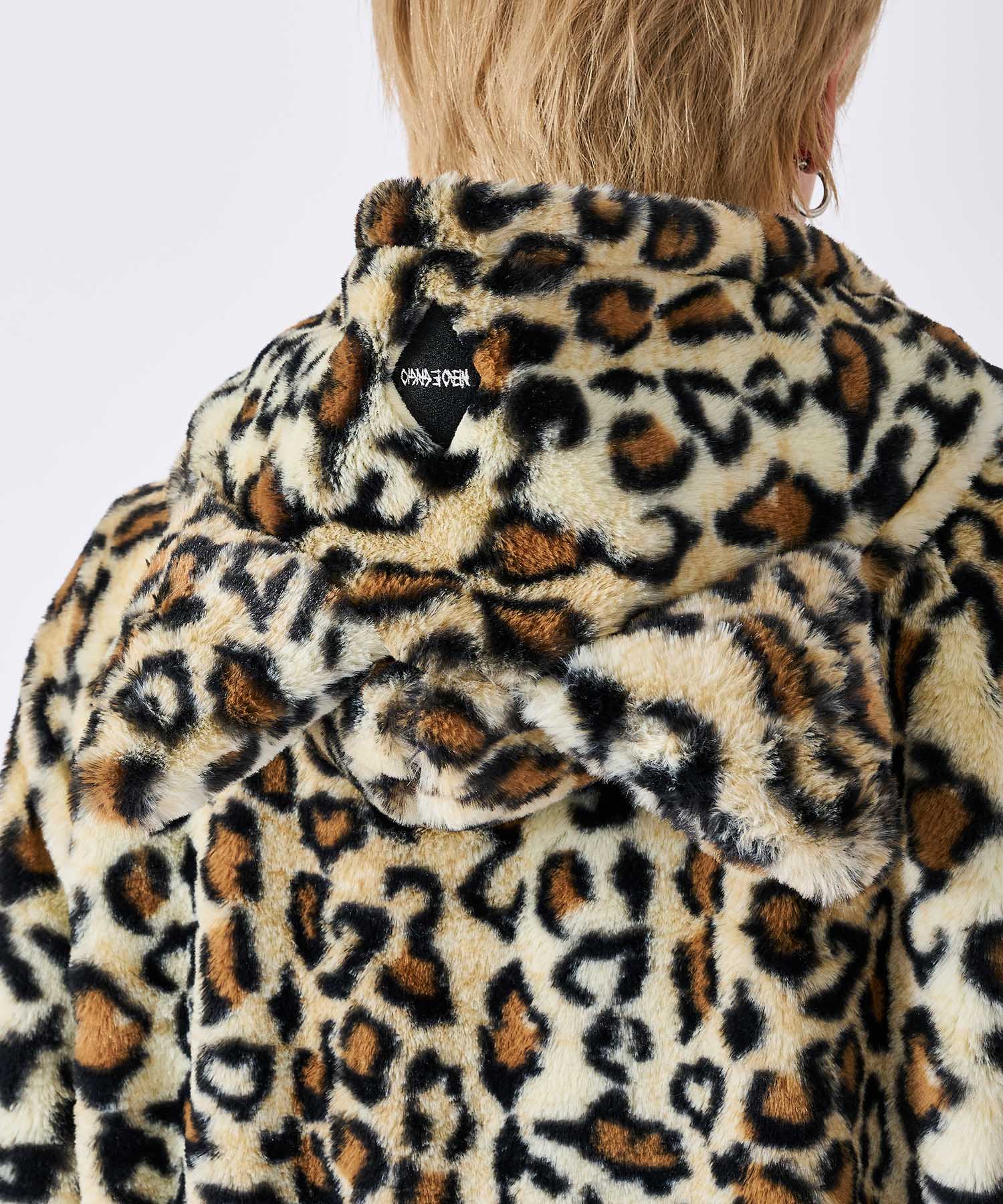 毛足の長いポリエステルのストレートファーを使用しており、ボリューム感があって暖かく、またその肌触りも最高で豹柄と黒の2パターンを用意☆