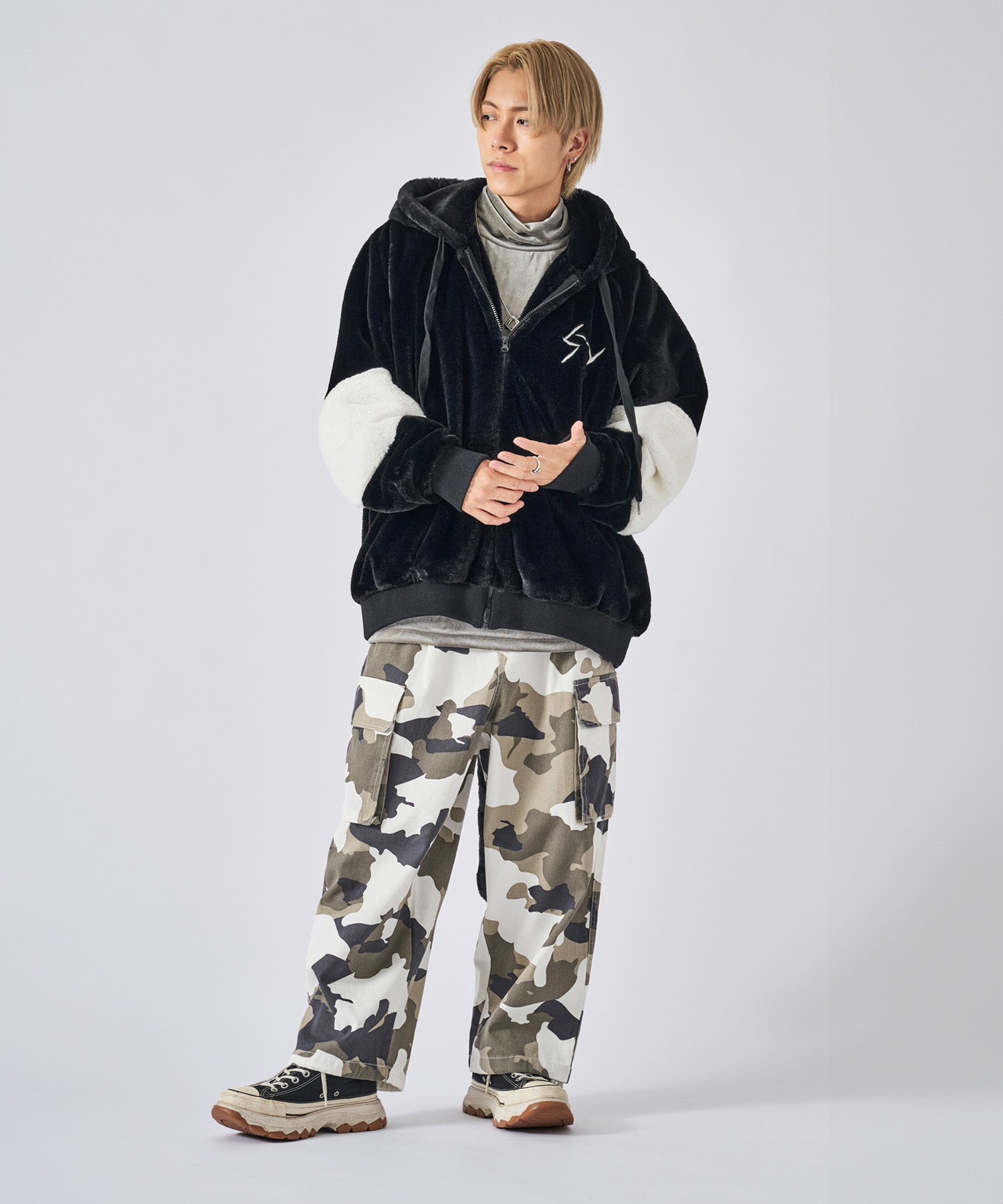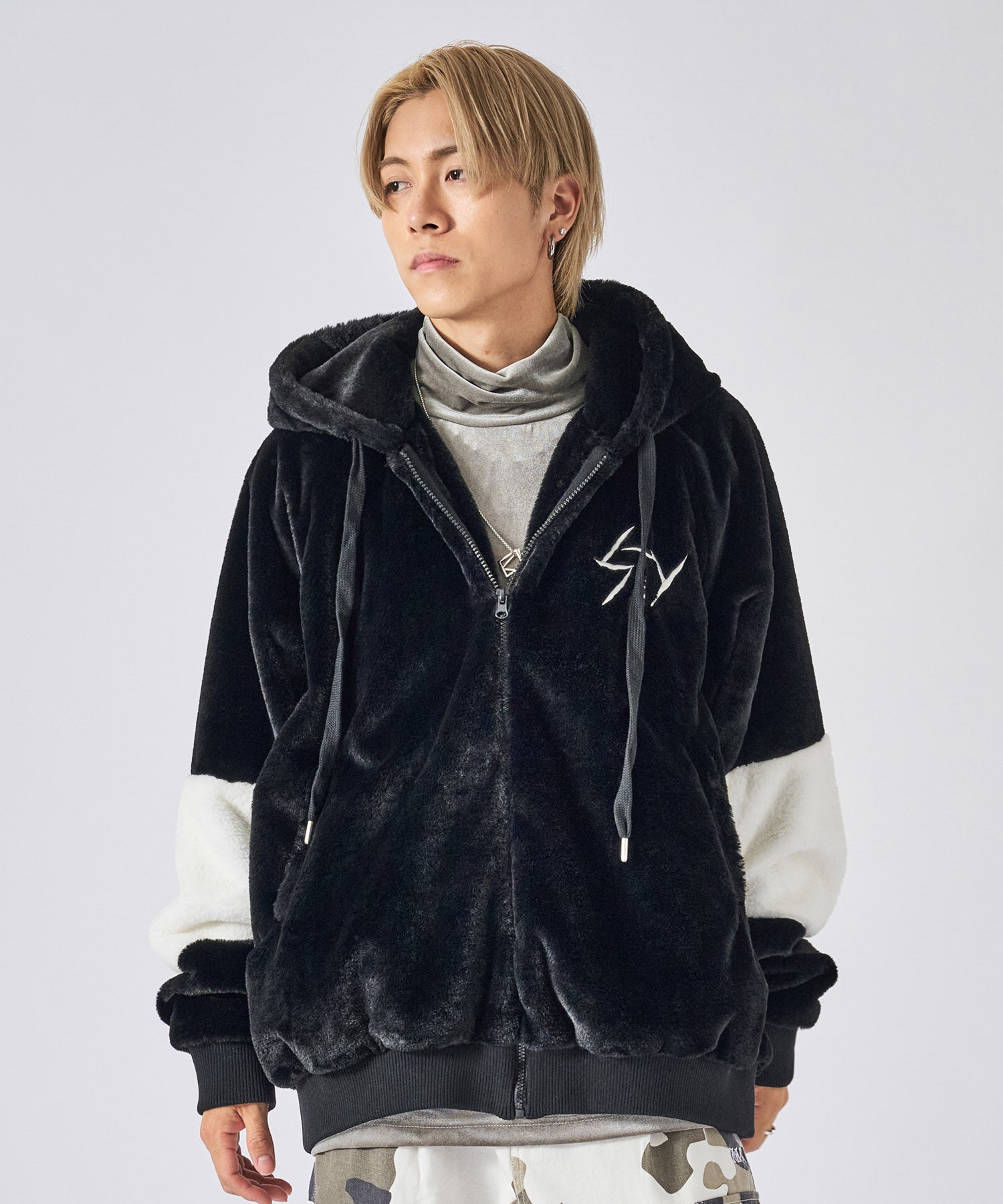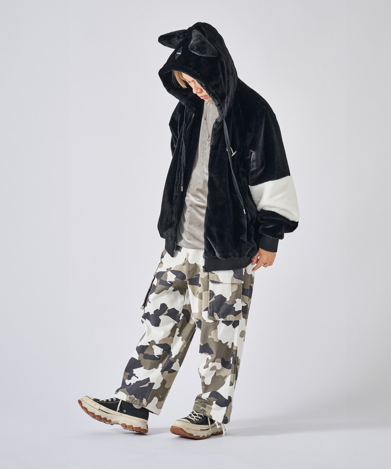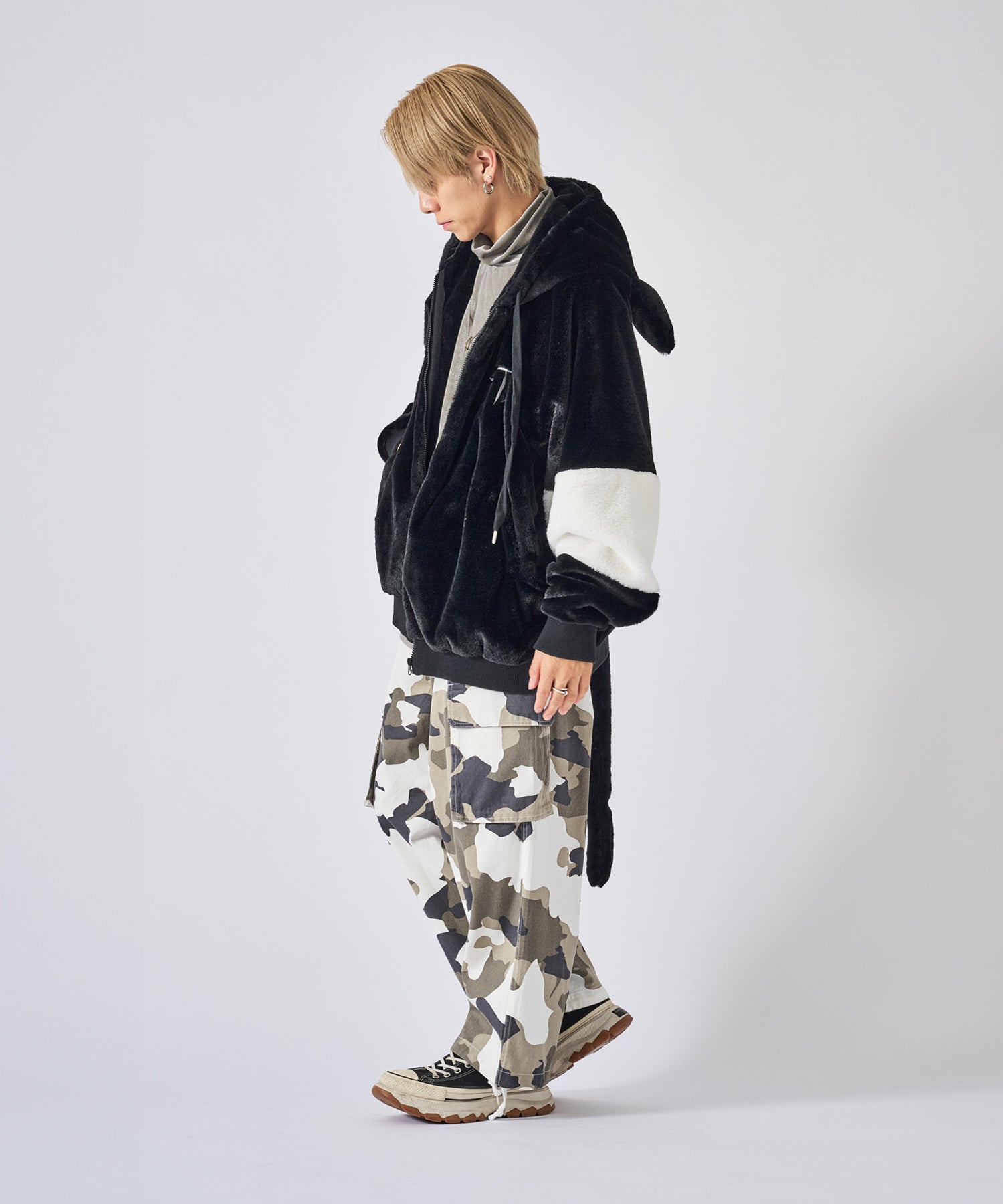 毛足の長いポリエステルのストレートファーを使用しており、ボリューム感があって暖かく、またその肌触りも最高で豹柄と黒の2パターンを用意☆