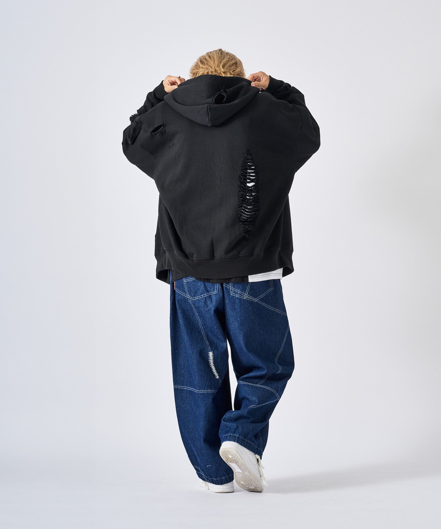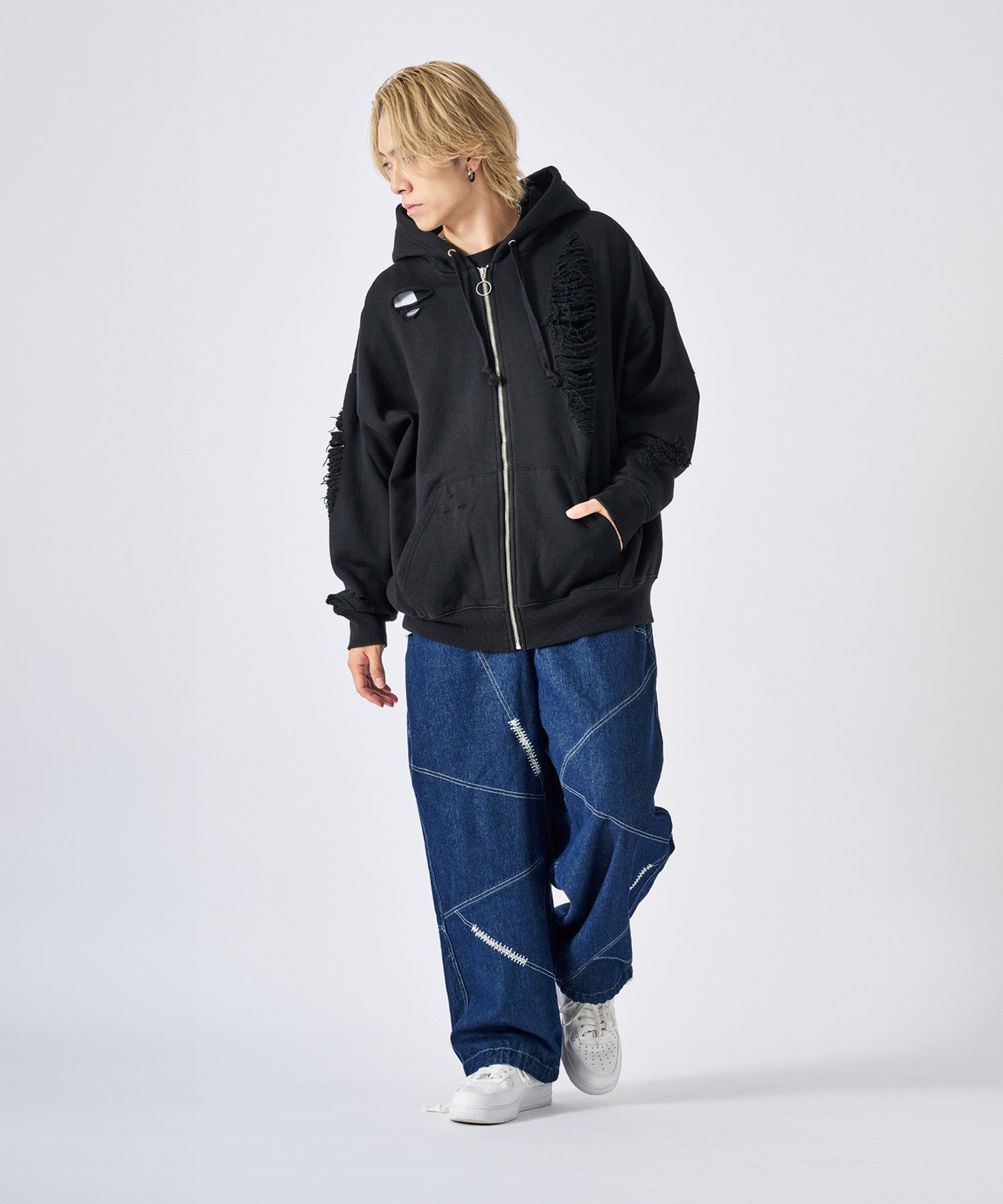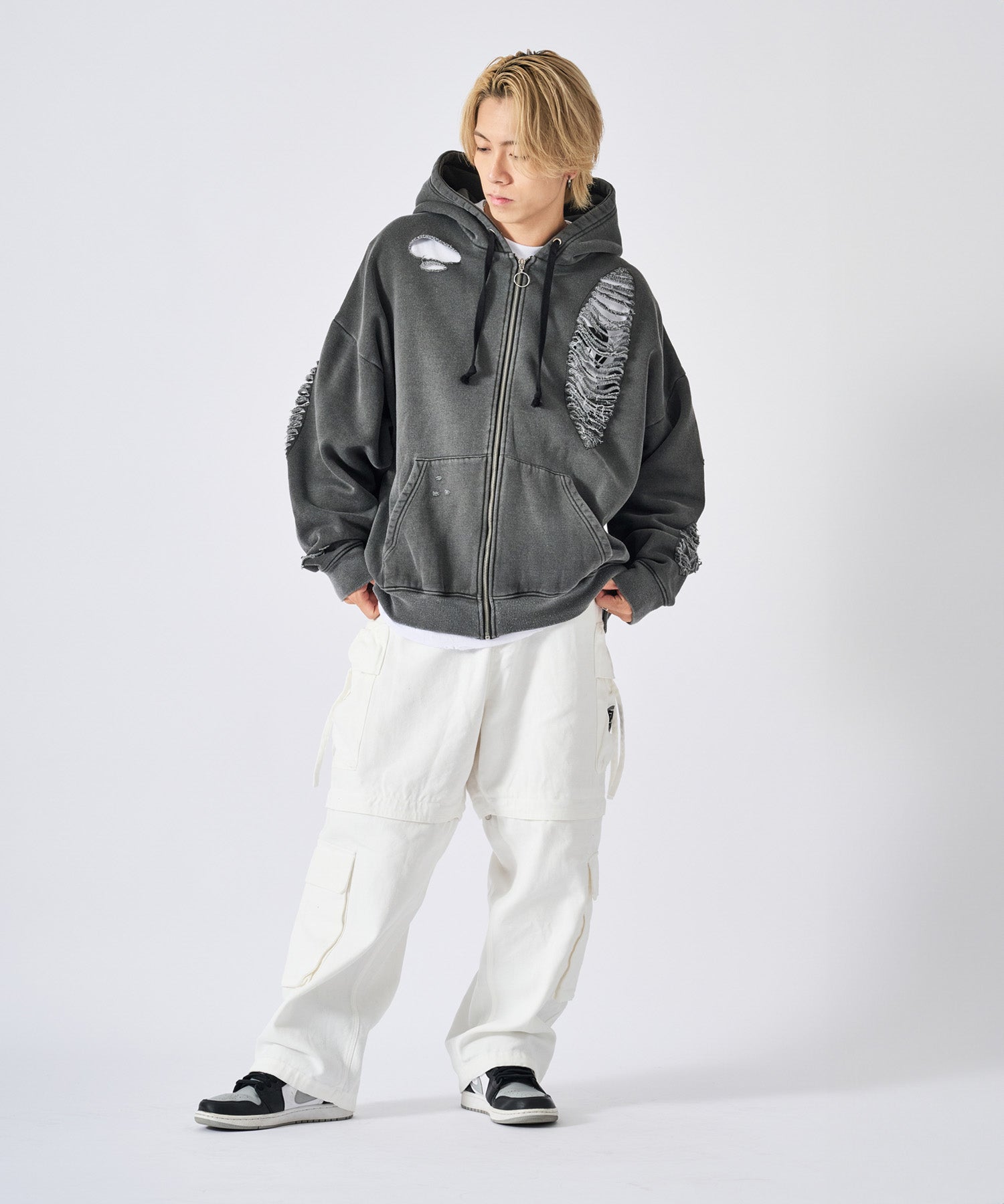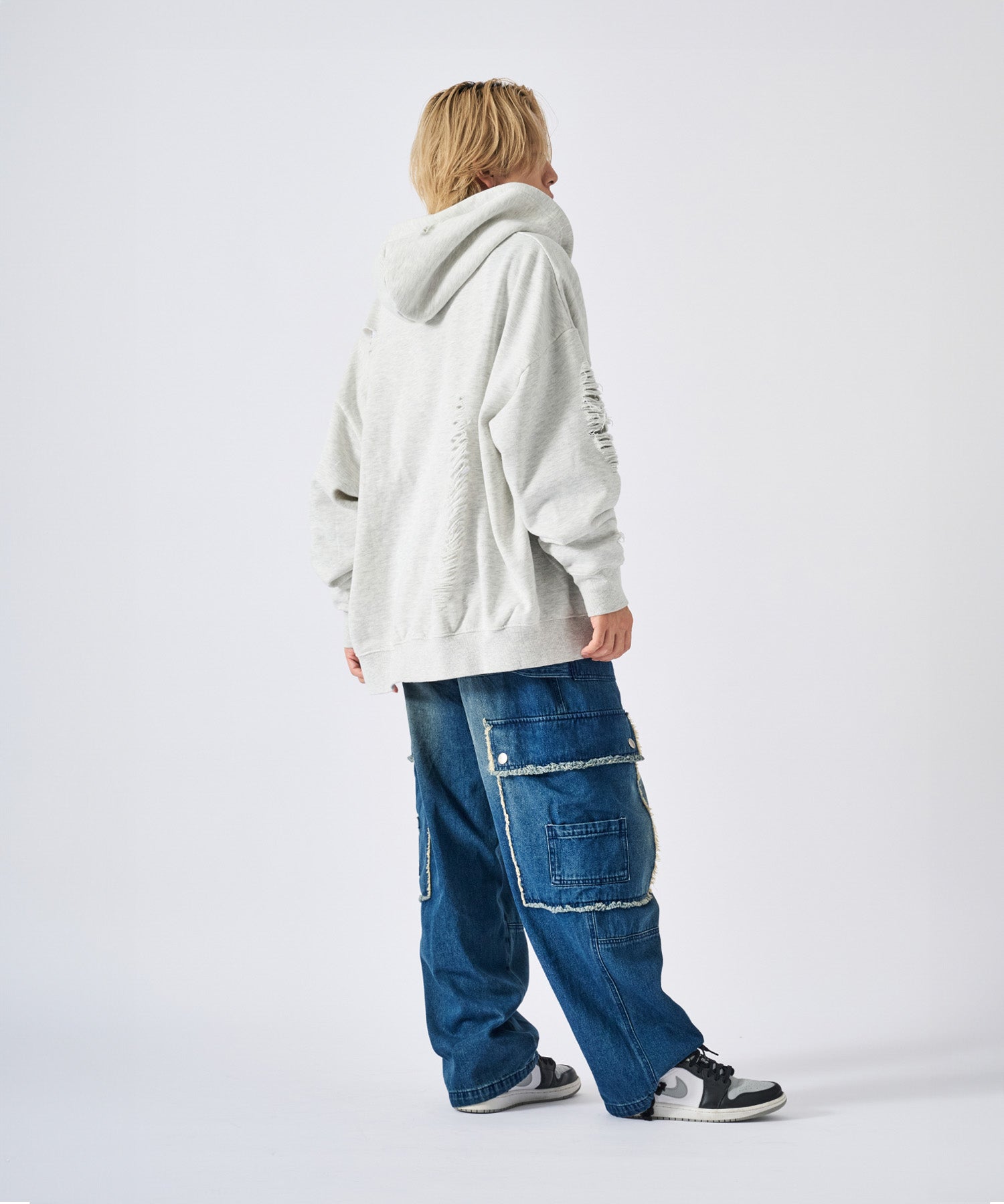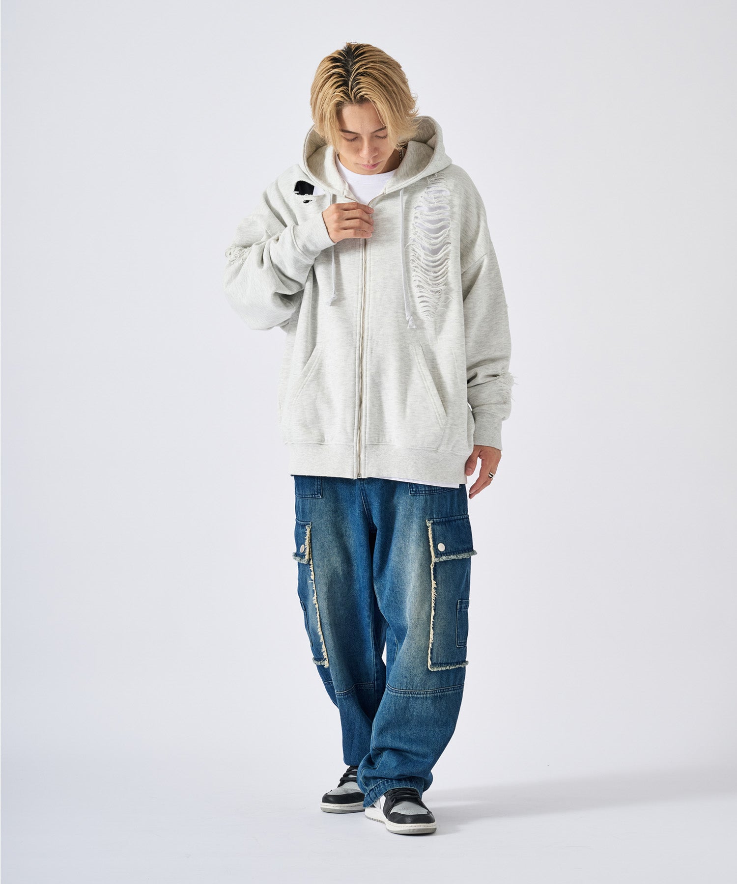 前後左右、大小のダメージ加工を施し、古着感のある色合いもかっこいい☆ポケットに配置したレトロ感のあるファスナーが雰囲気抜群☆