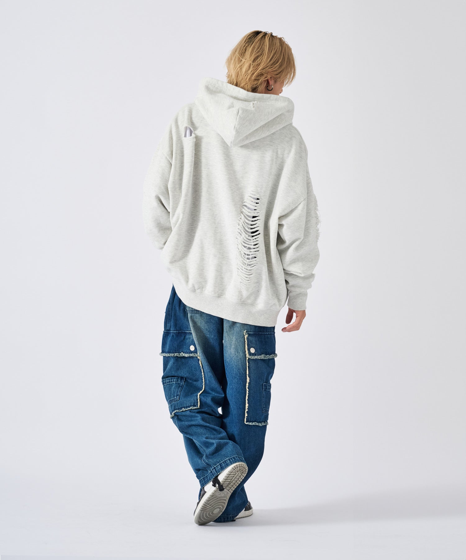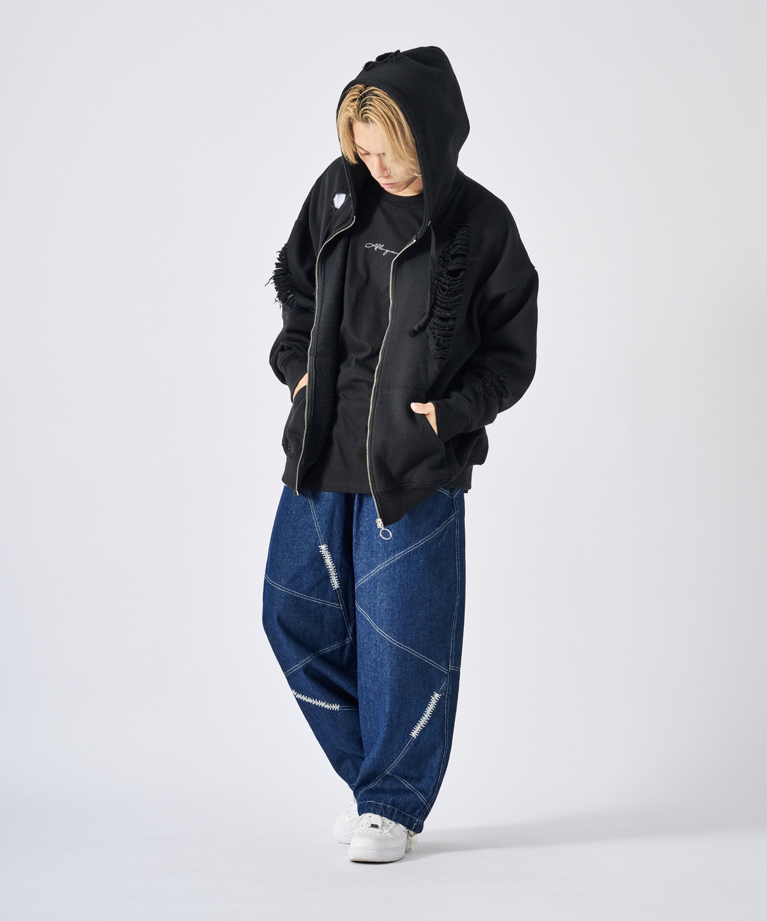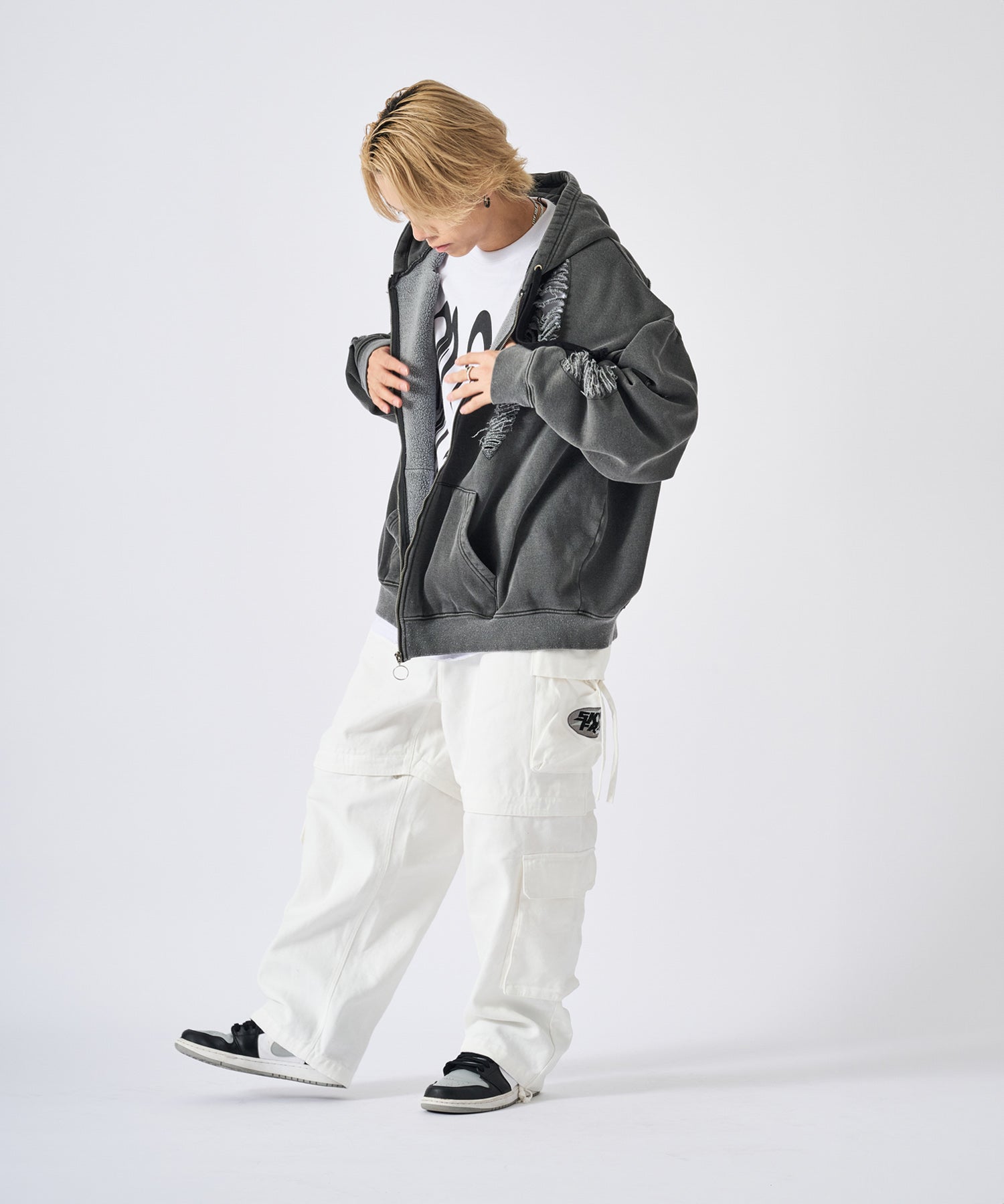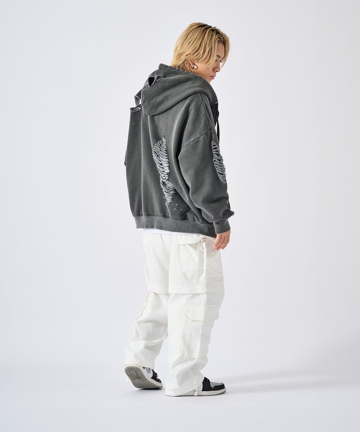 前後左右、大小のダメージ加工を施し、古着感のある色合いもかっこいい☆ポケットに配置したレトロ感のあるファスナーが雰囲気抜群☆