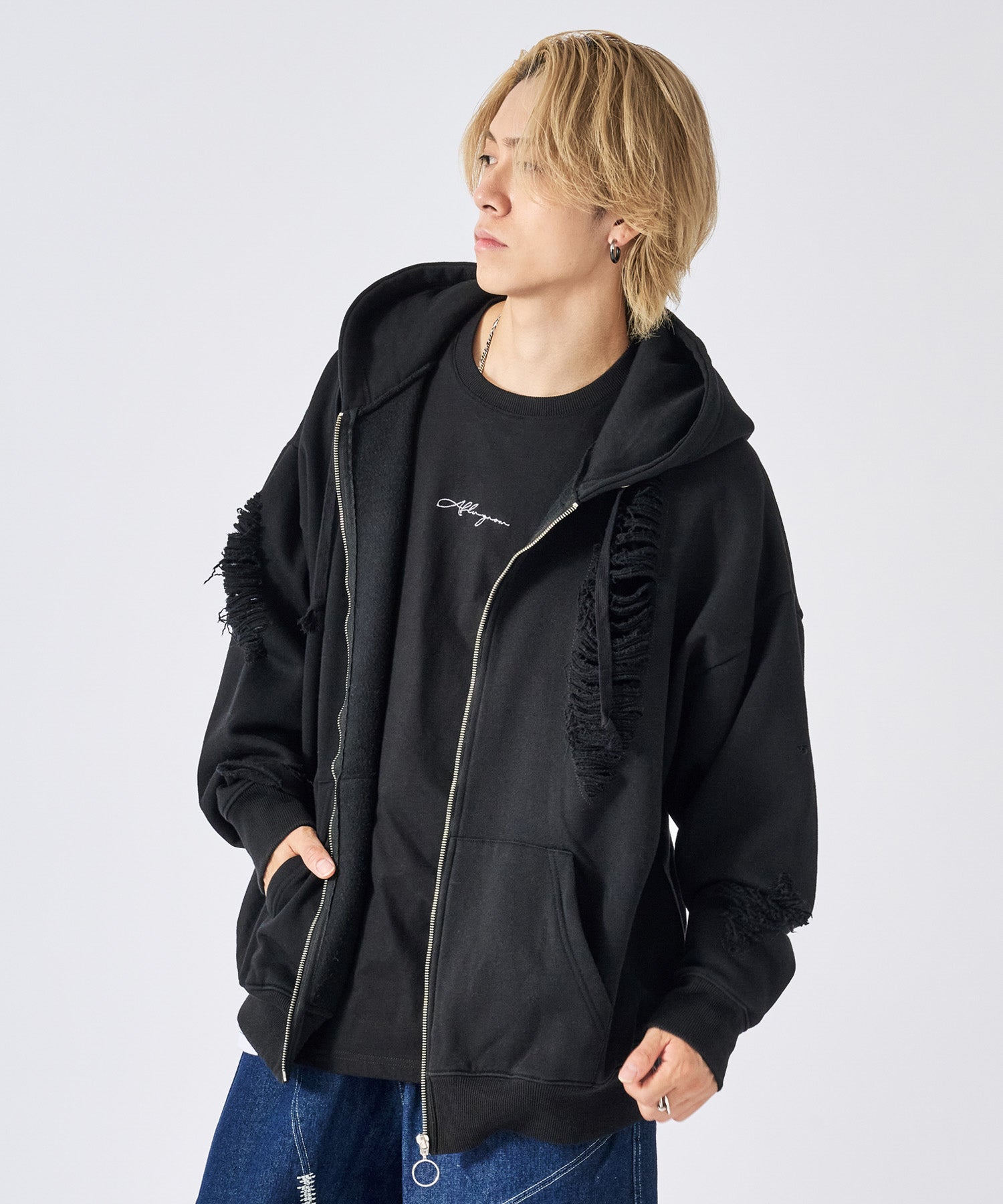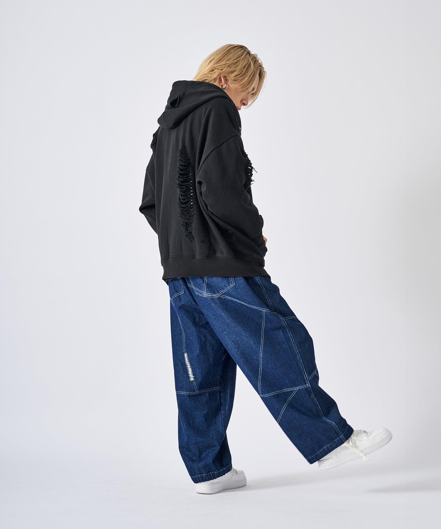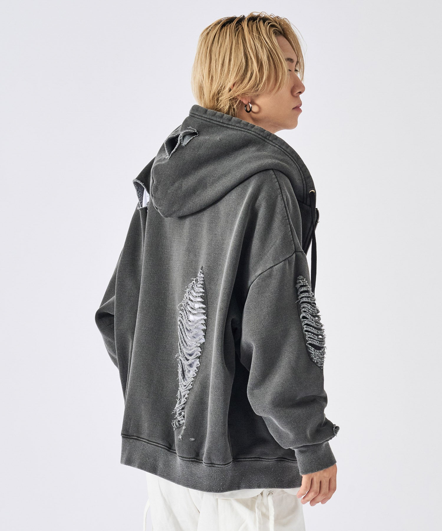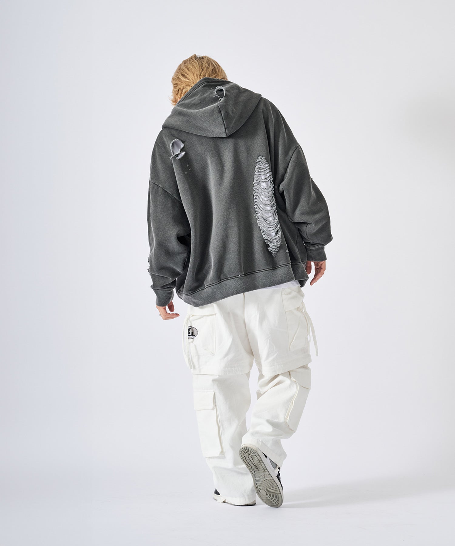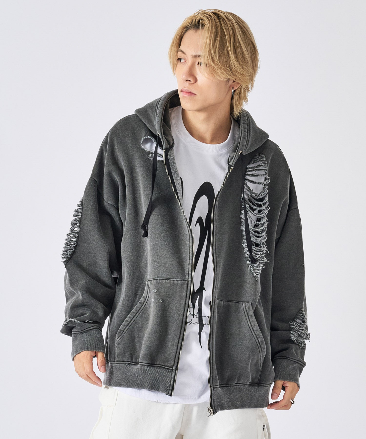 前後左右、大小のダメージ加工を施し、古着感のある色合いもかっこいい☆ポケットに配置したレトロ感のあるファスナーが雰囲気抜群☆