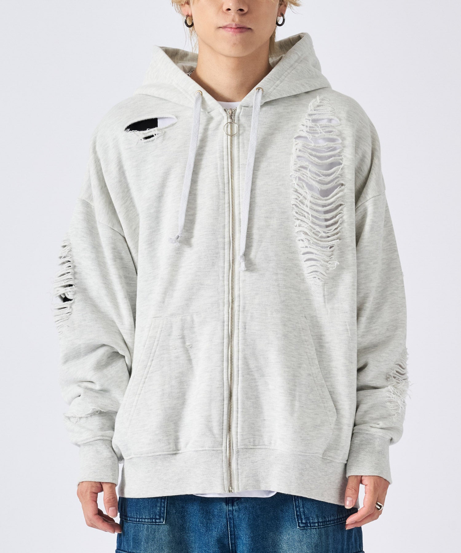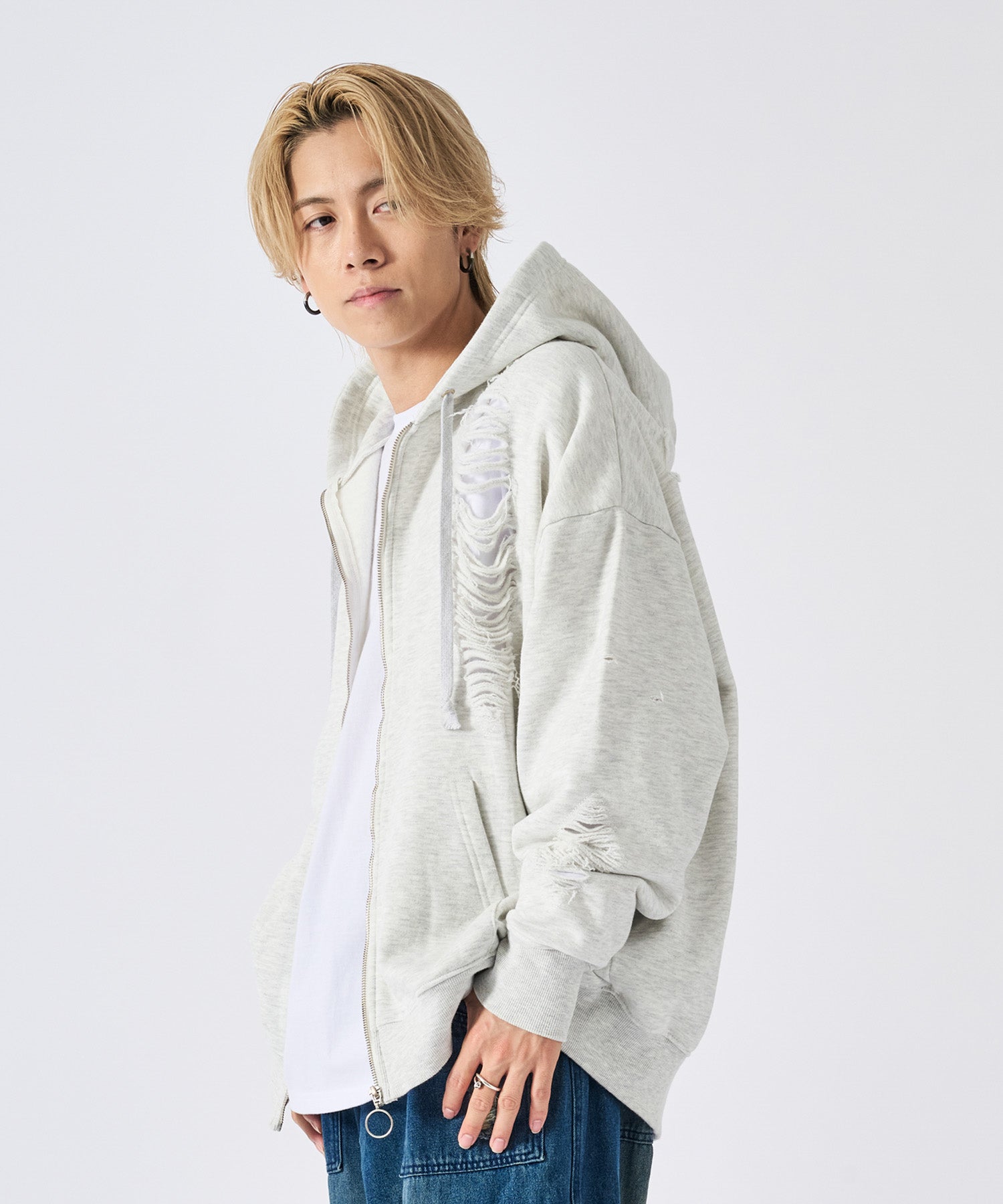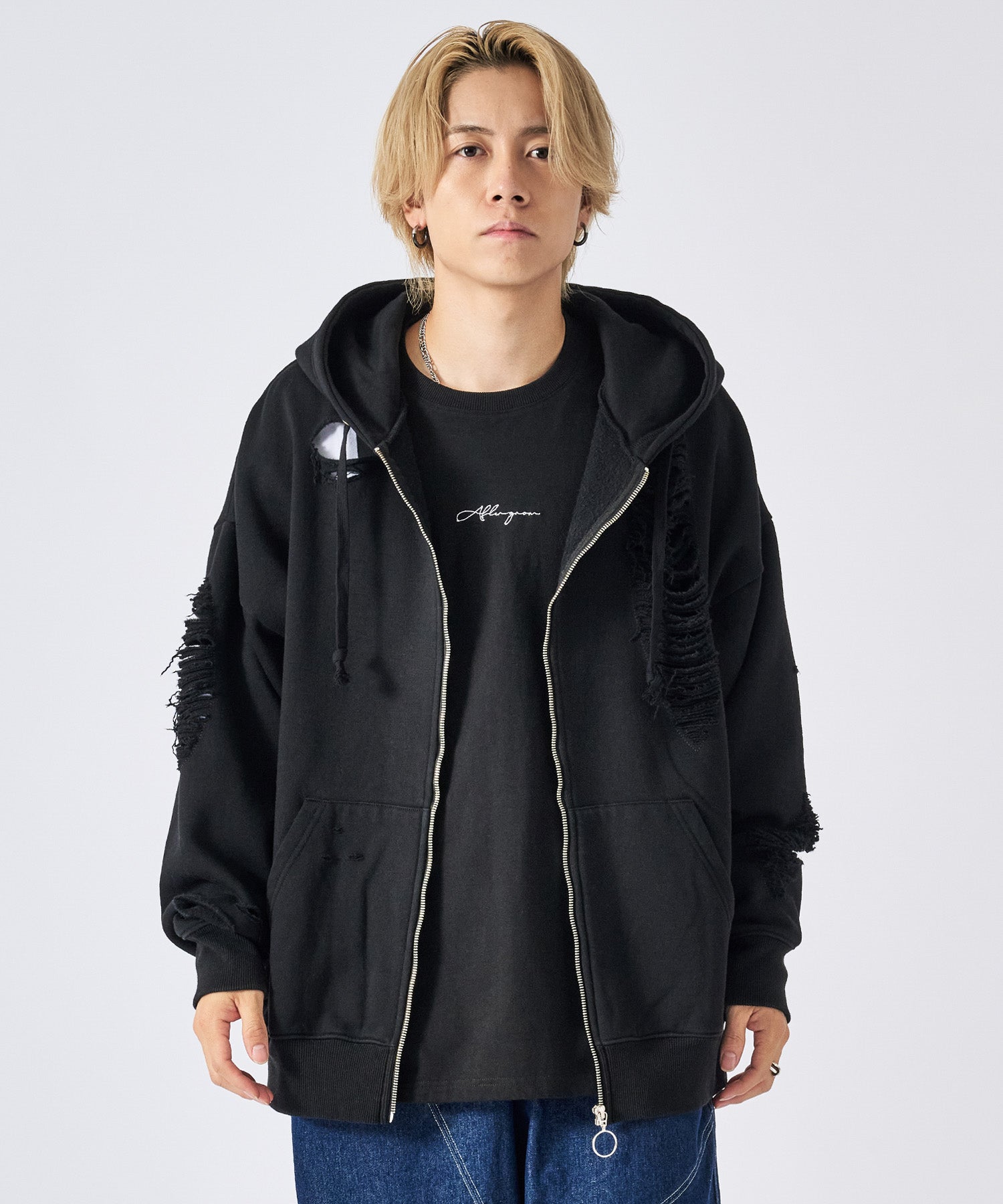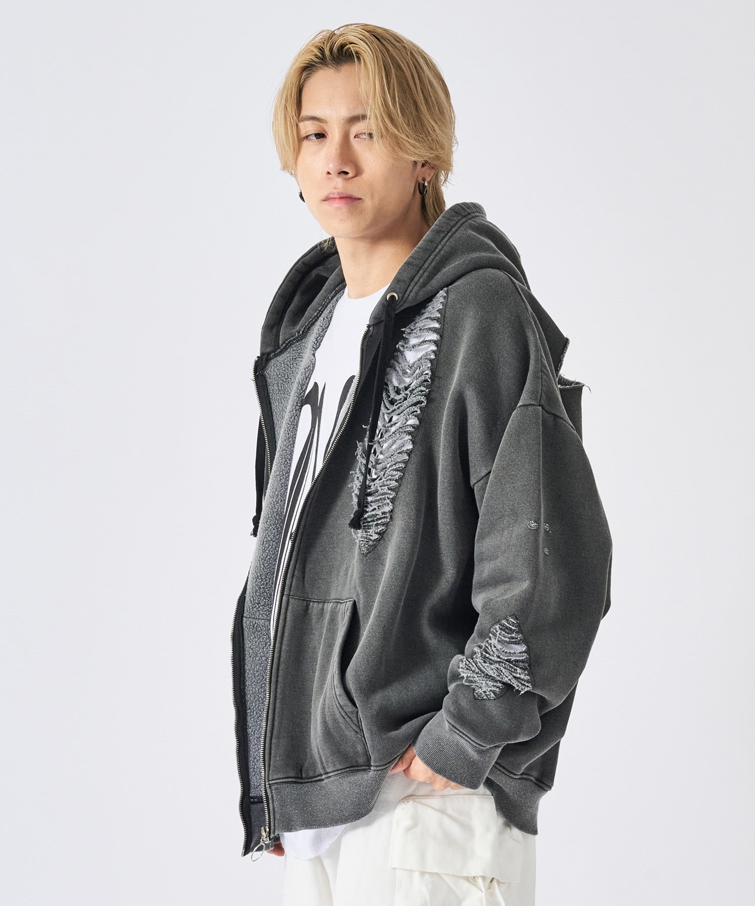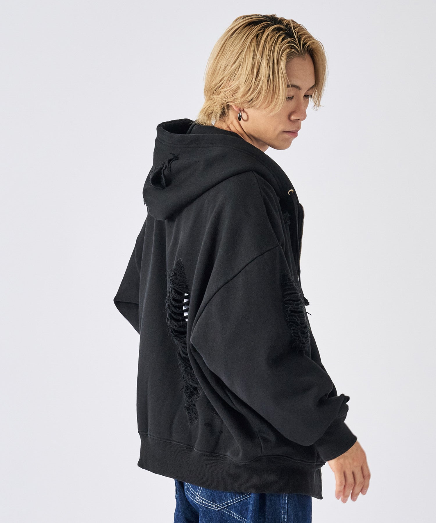 前後左右、大小のダメージ加工を施し、古着感のある色合いもかっこいい☆ポケットに配置したレトロ感のあるファスナーが雰囲気抜群☆