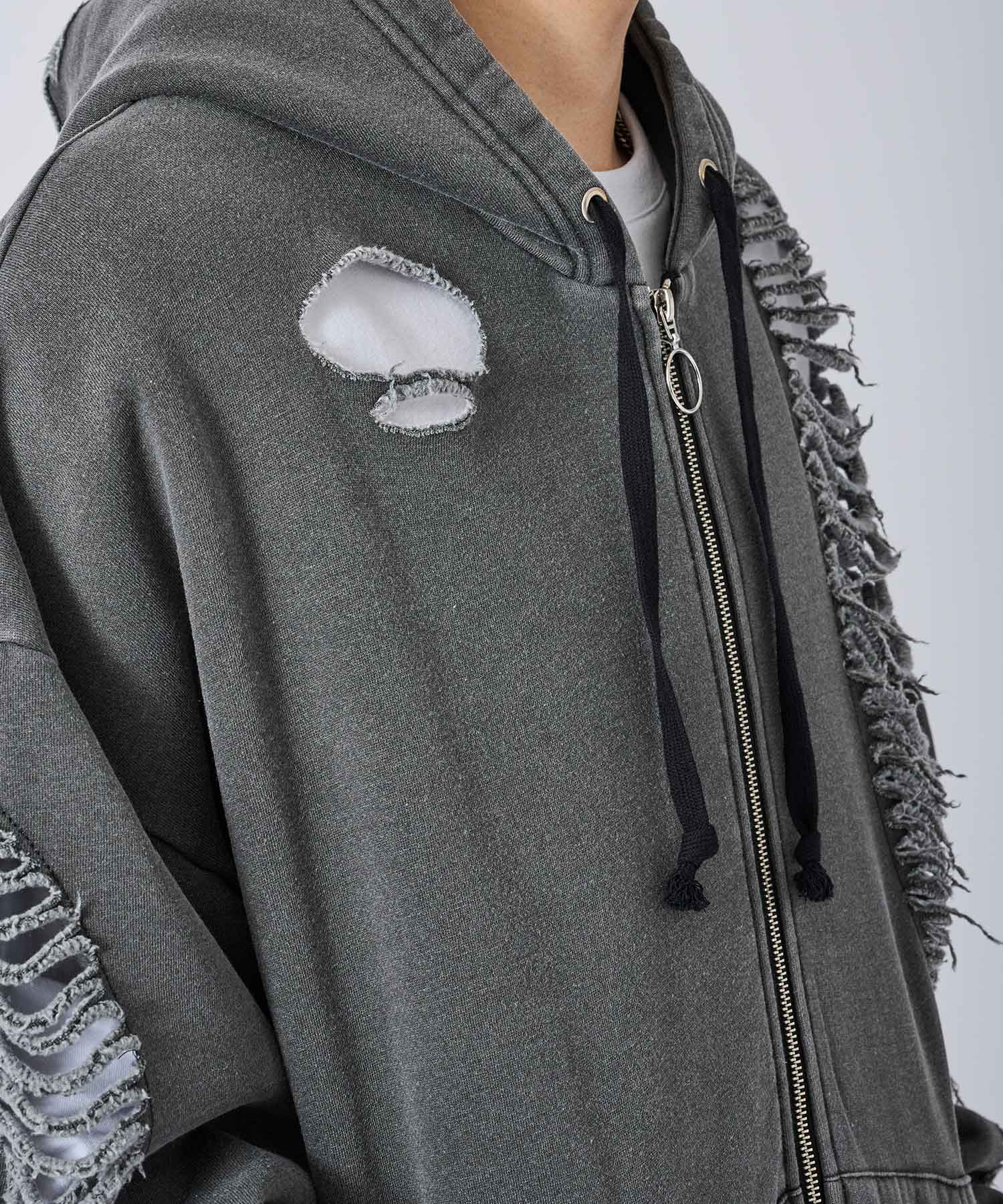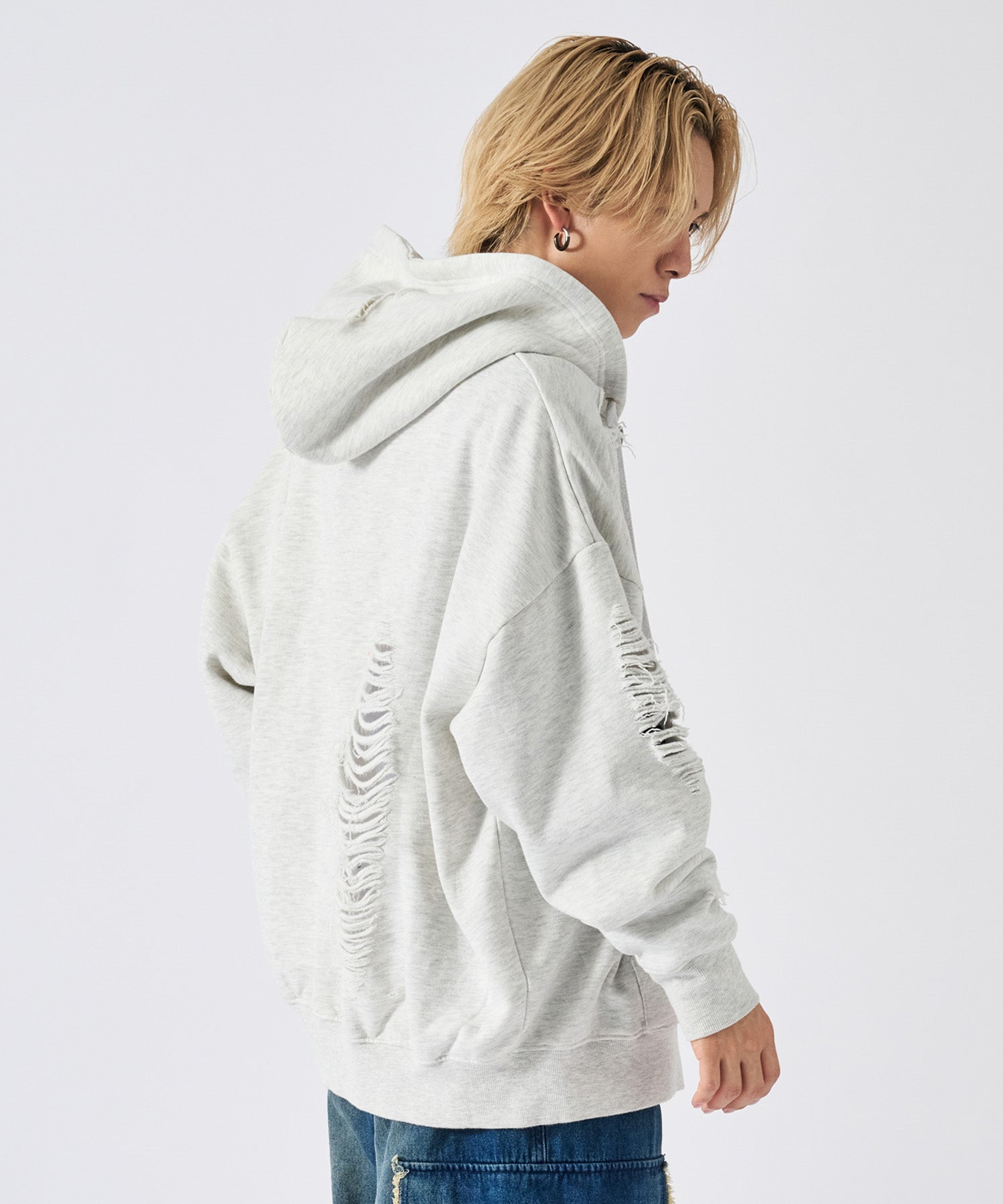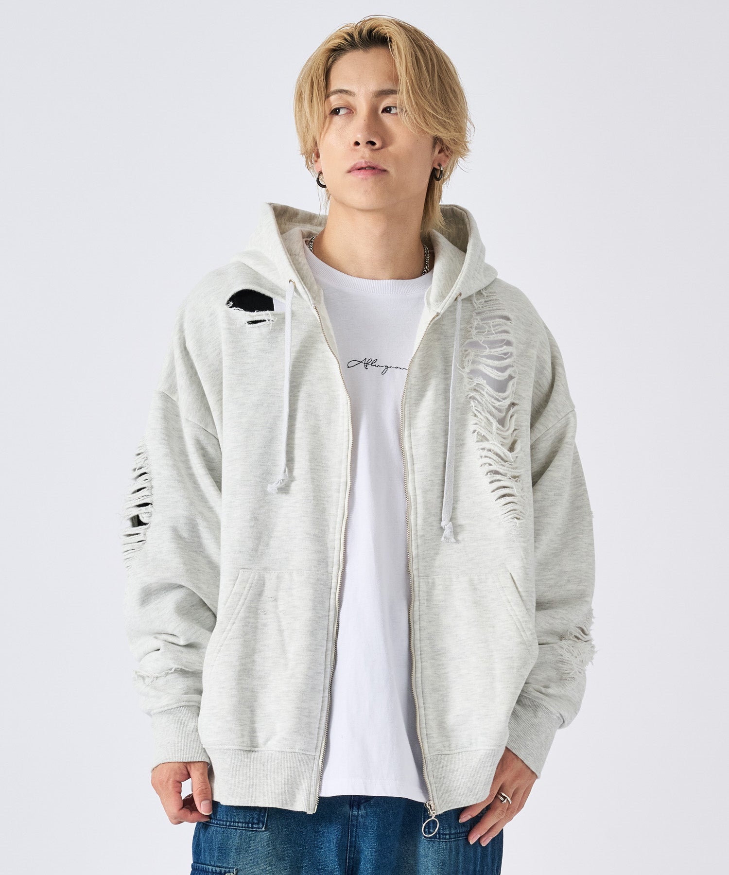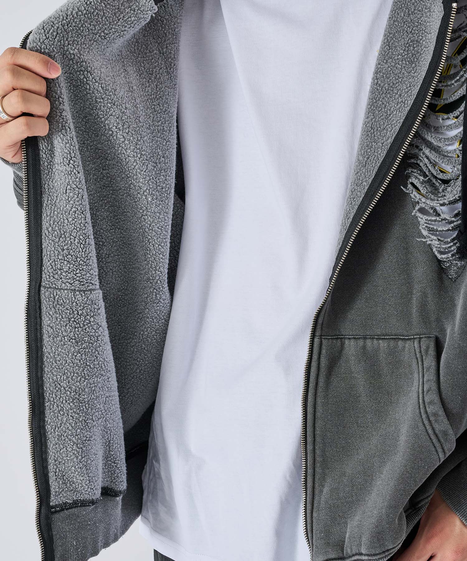 前後左右、大小のダメージ加工を施し、古着感のある色合いもかっこいい☆ポケットに配置したレトロ感のあるファスナーが雰囲気抜群☆