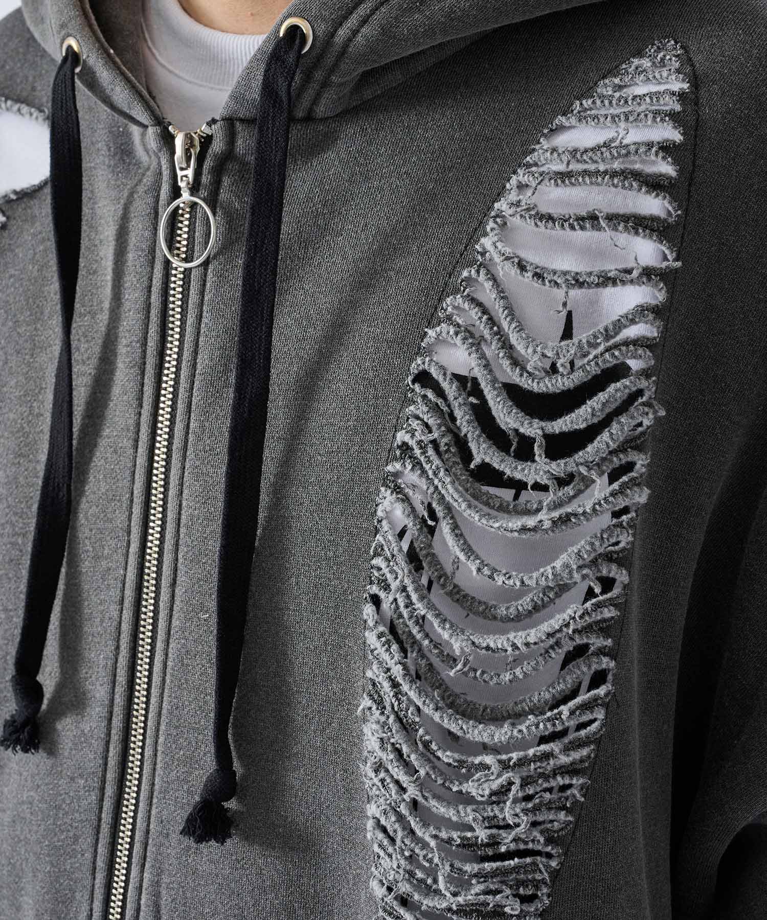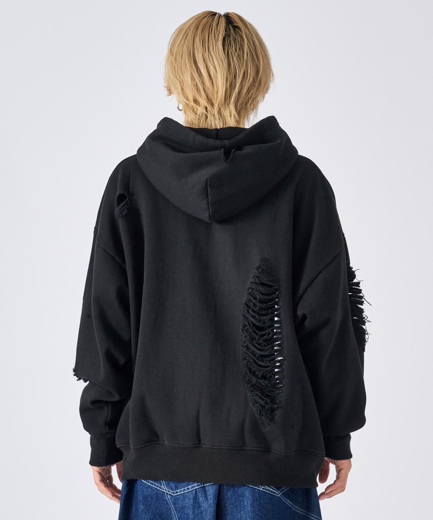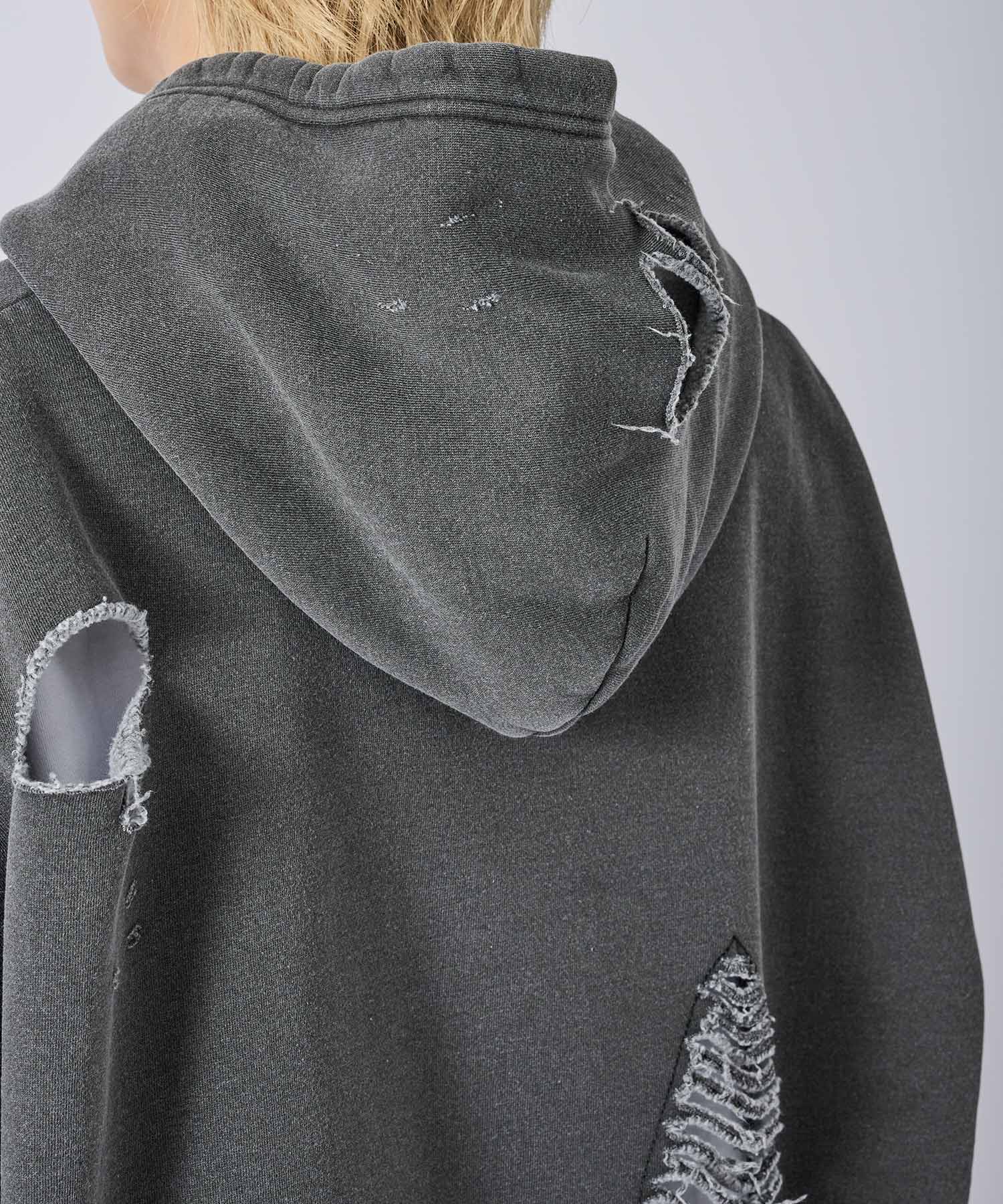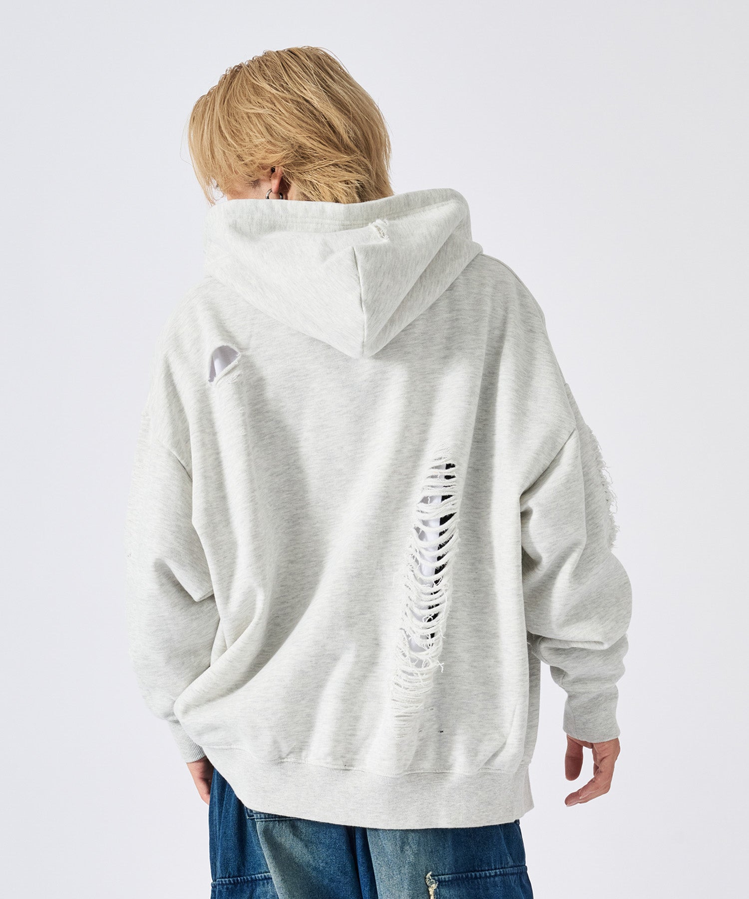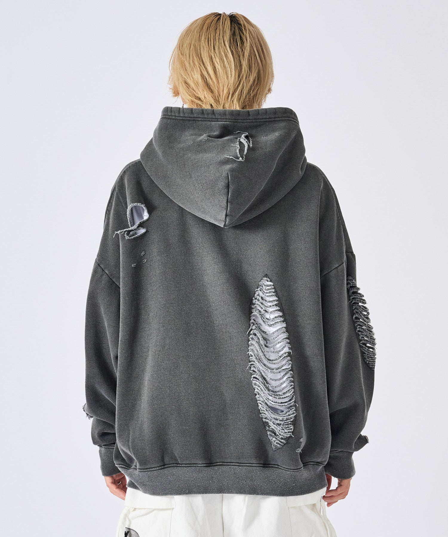 前後左右、大小のダメージ加工を施し、古着感のある色合いもかっこいい☆ポケットに配置したレトロ感のあるファスナーが雰囲気抜群☆