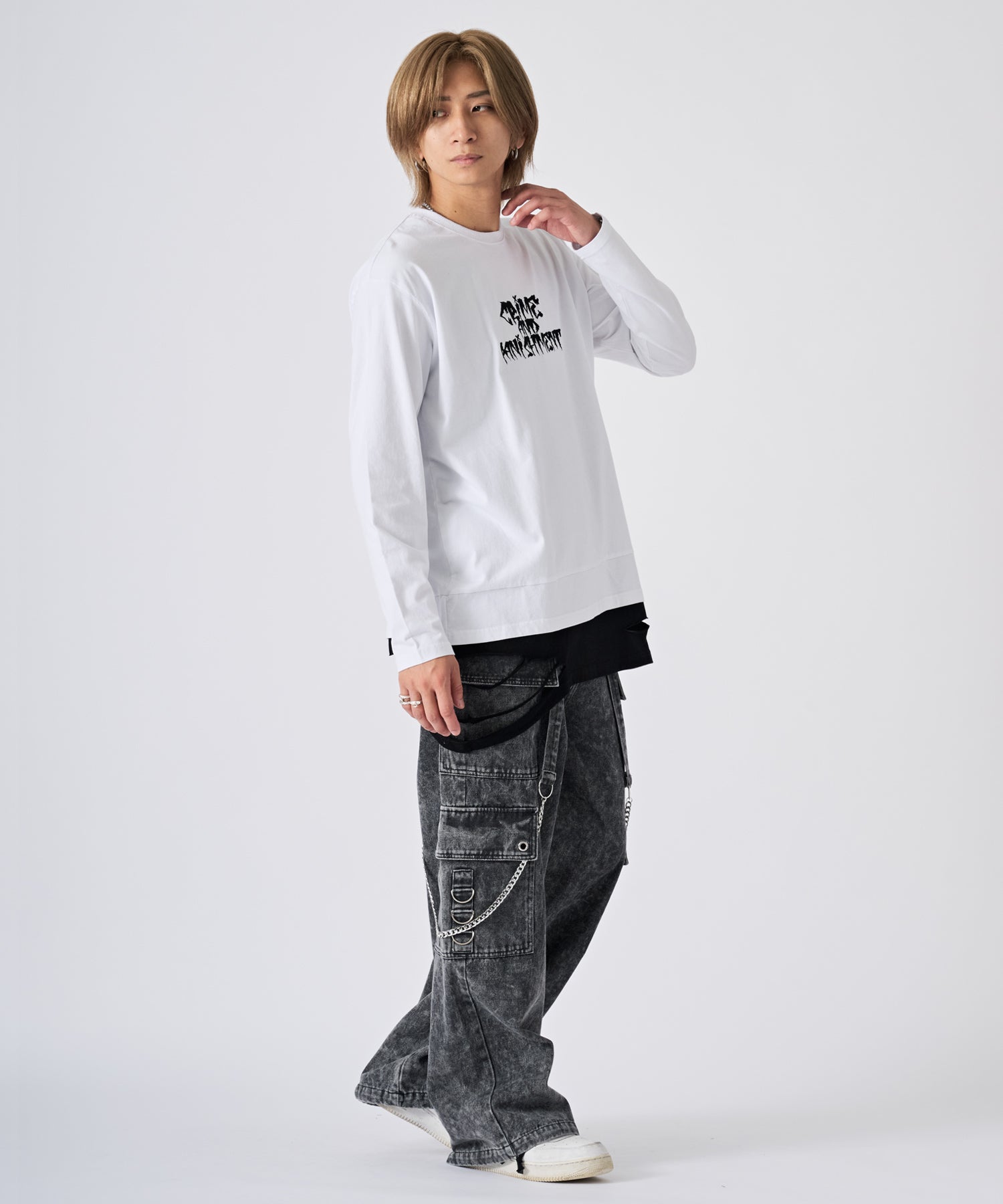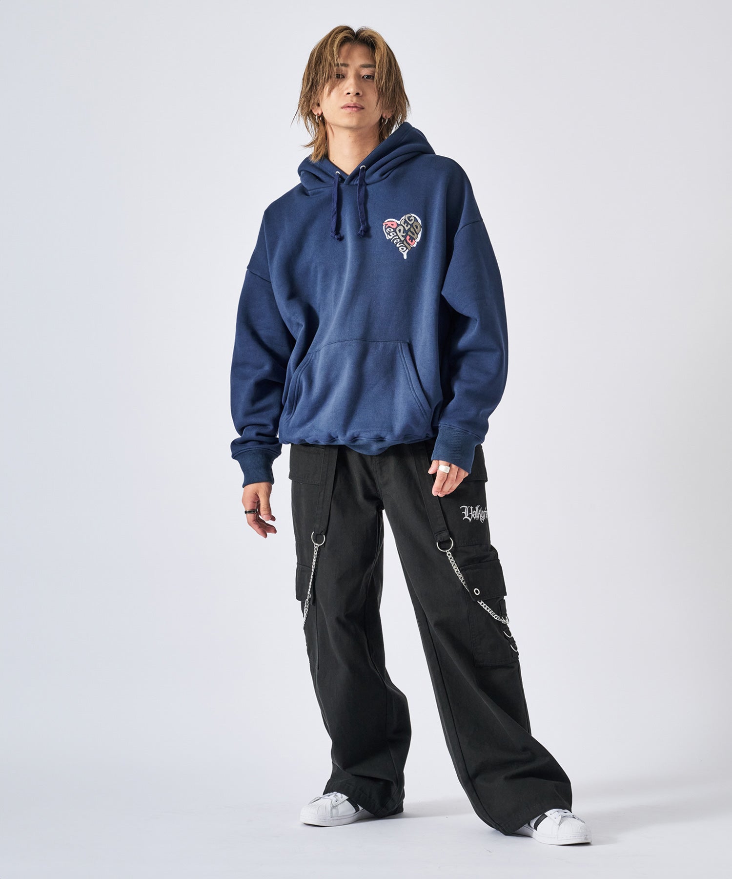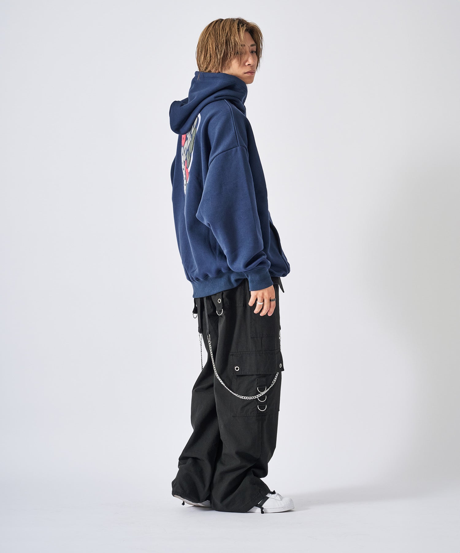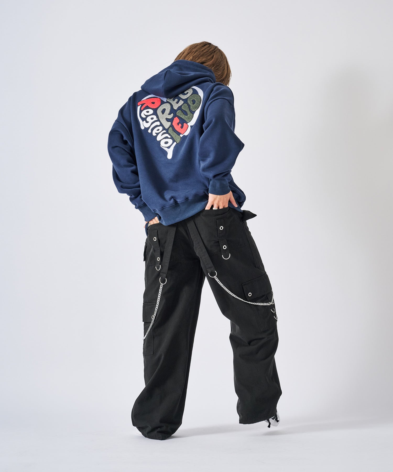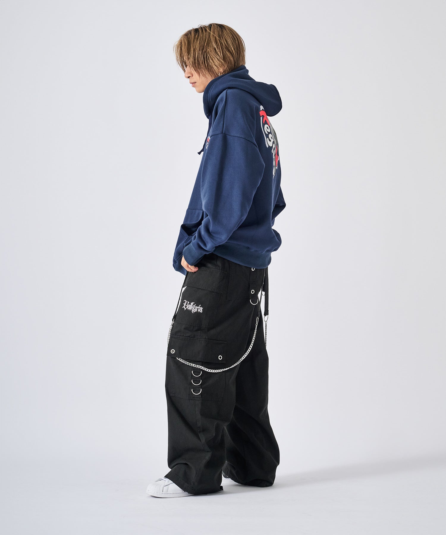 取り外しできるチェーンはアクセサリーとして付け方を楽しめるデザイン☆バギータイプのワイドシルエットで、腰位置にもフラップポケットを配置したダブルカーゴ仕様☆ウエストはシャーリングとドローコードでサイズを調整できる(^^♪