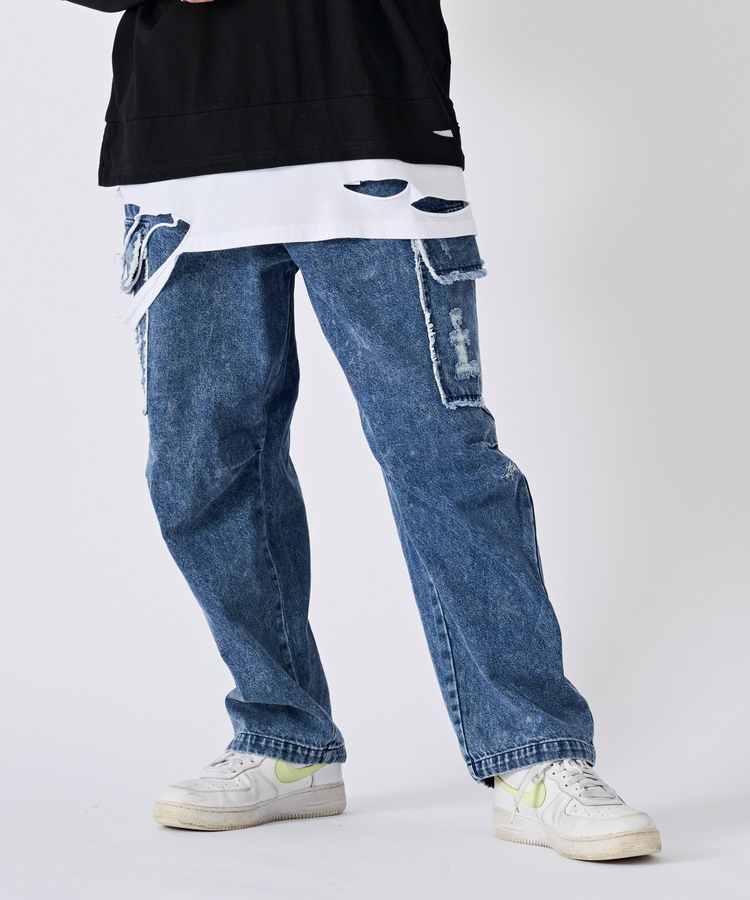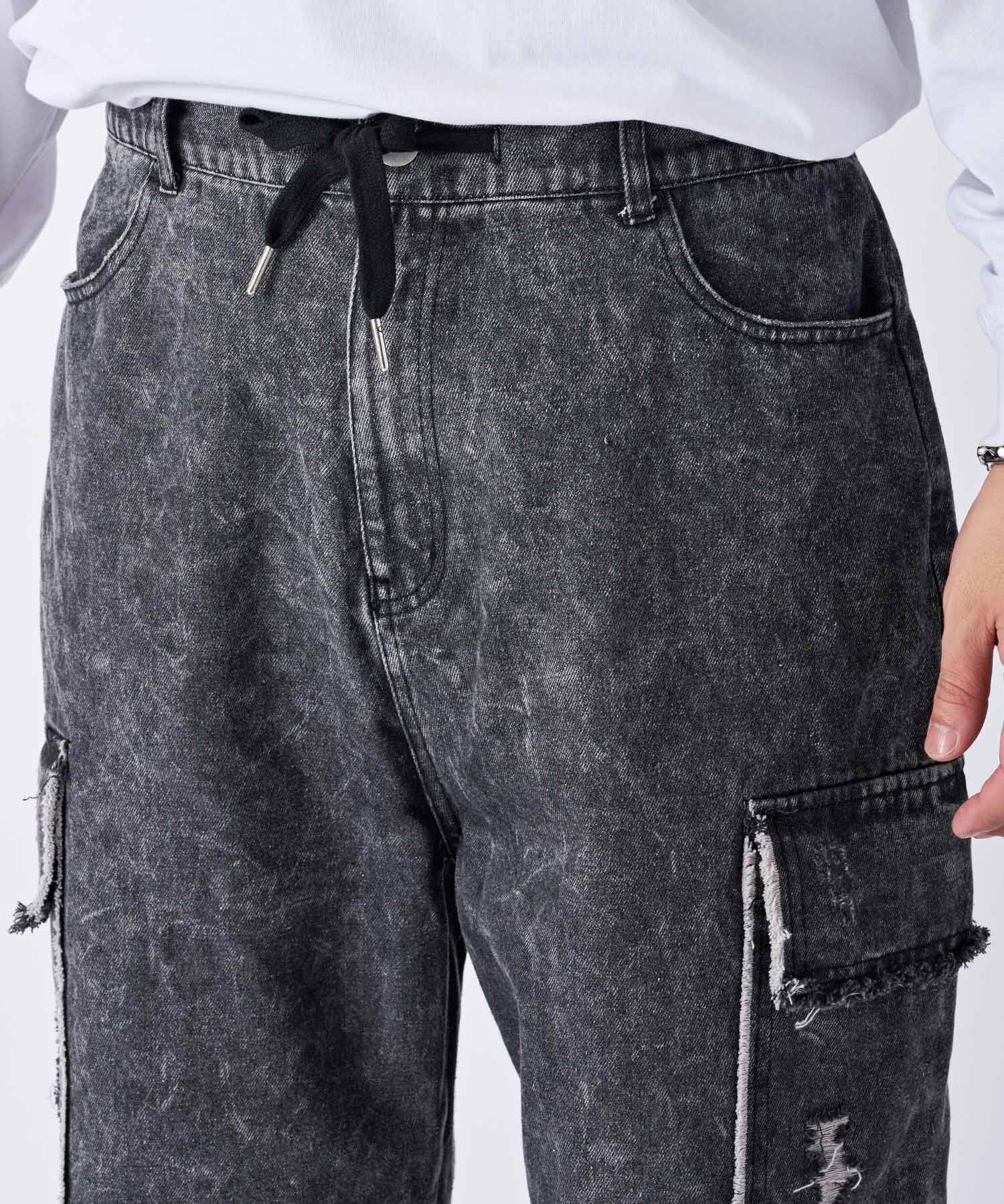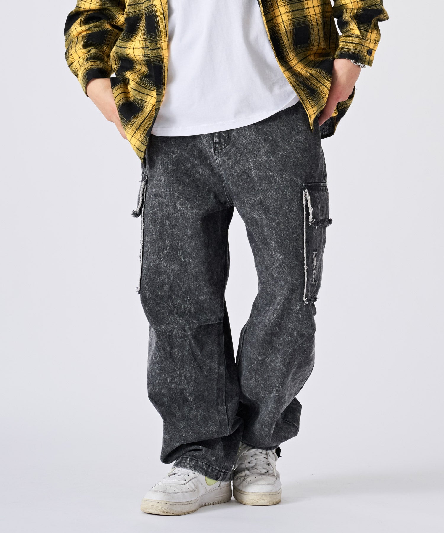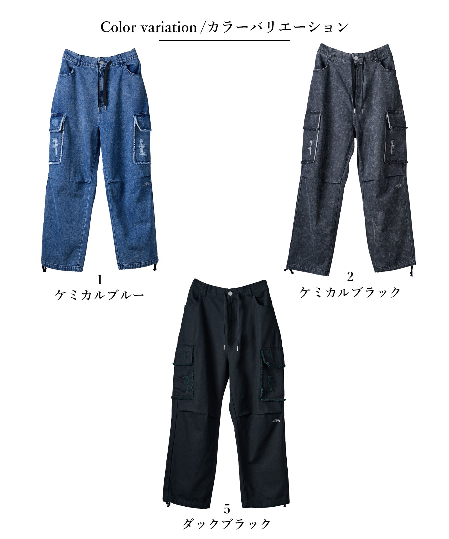ワイドパンツに適したデニムを使用し、ケミカル加工の色合いがトレンド!