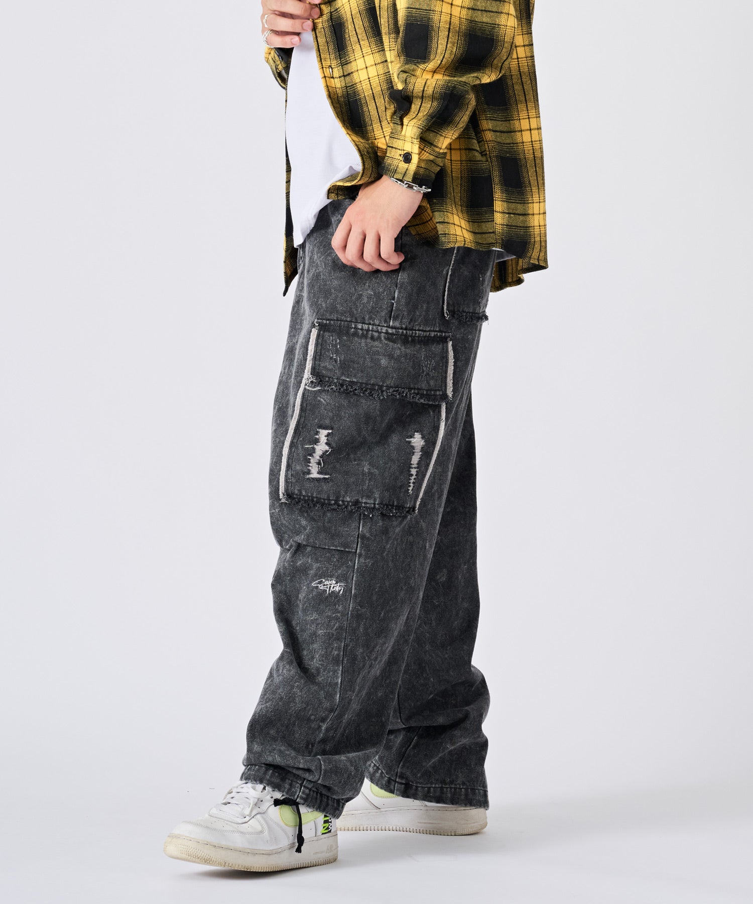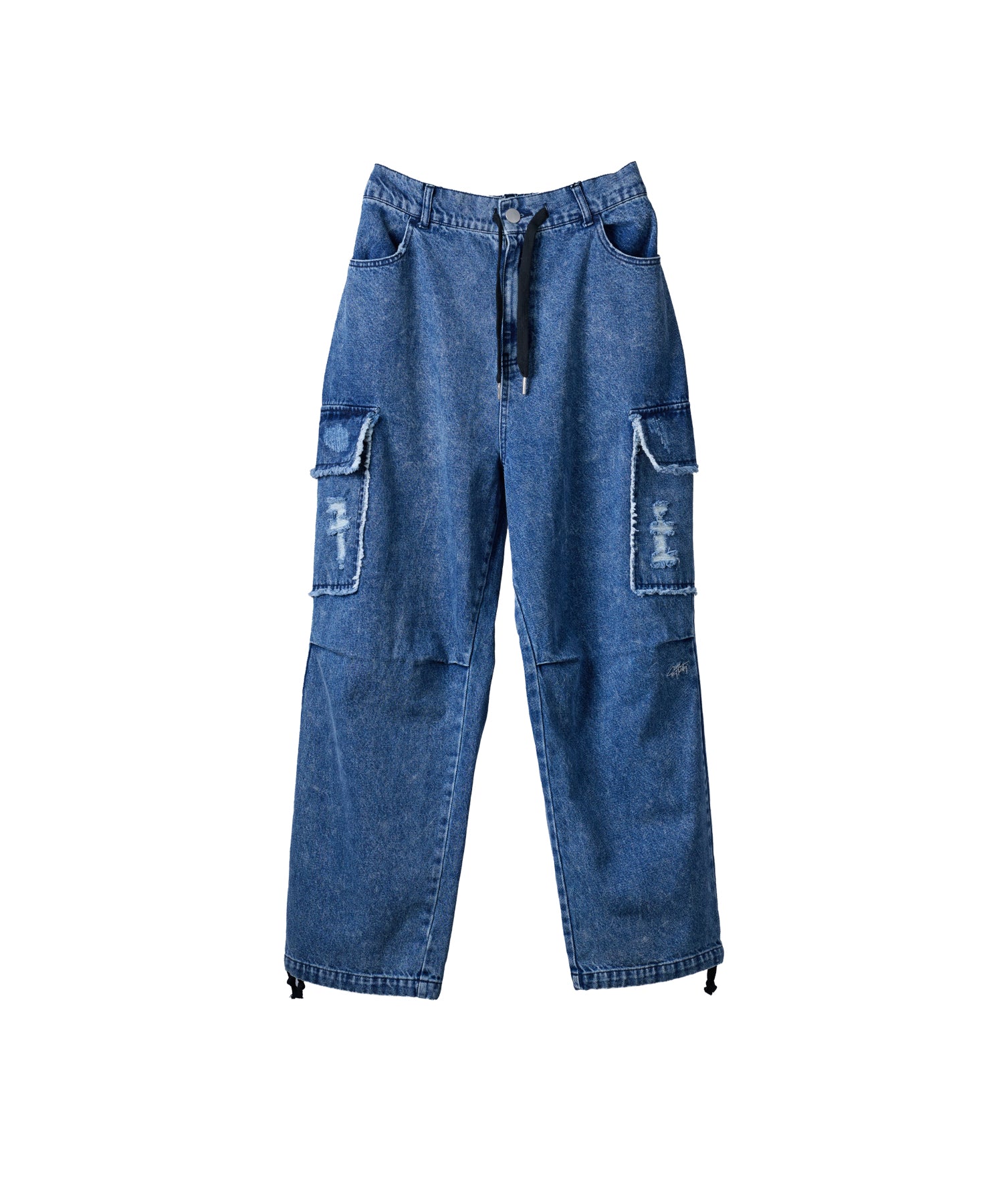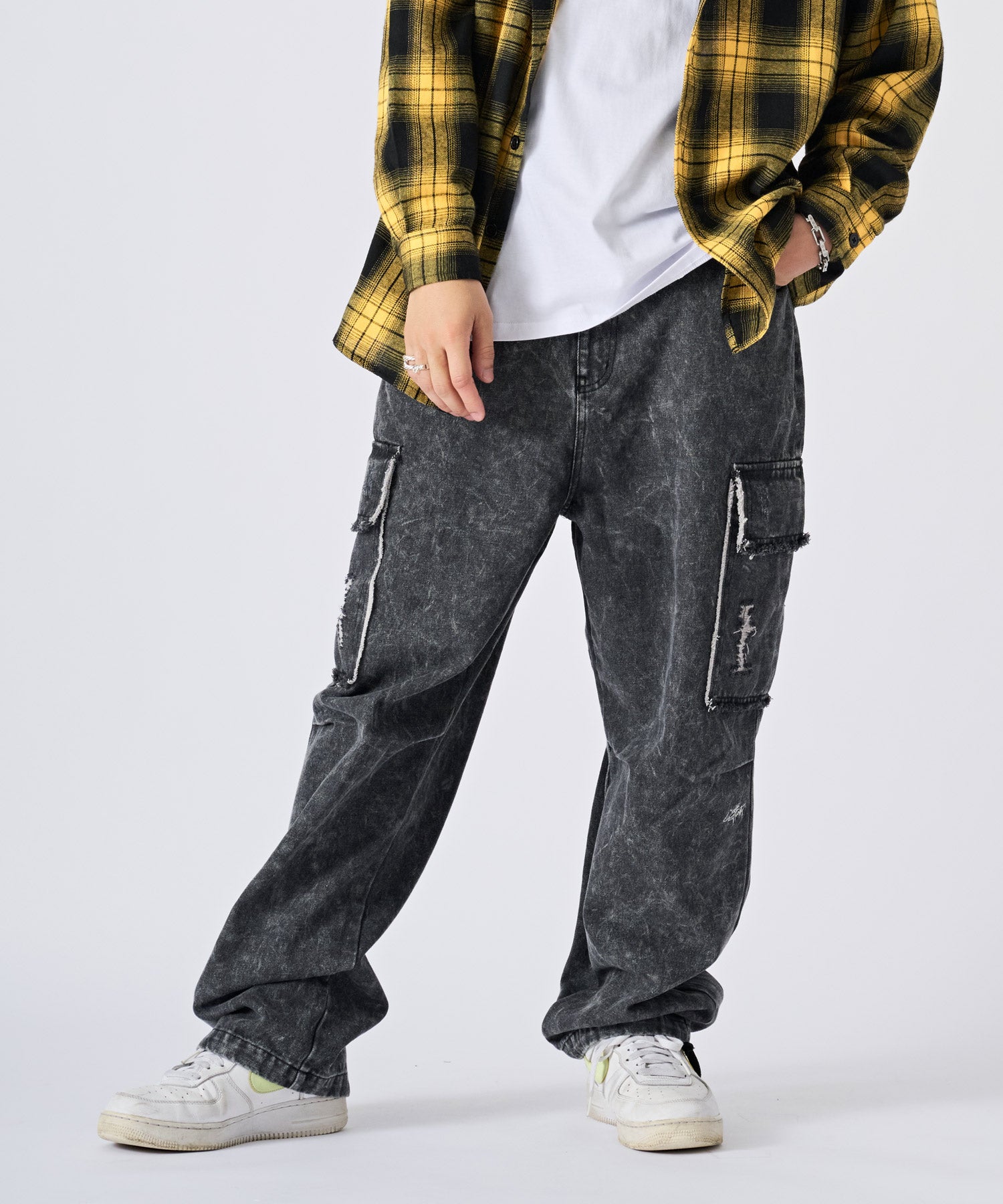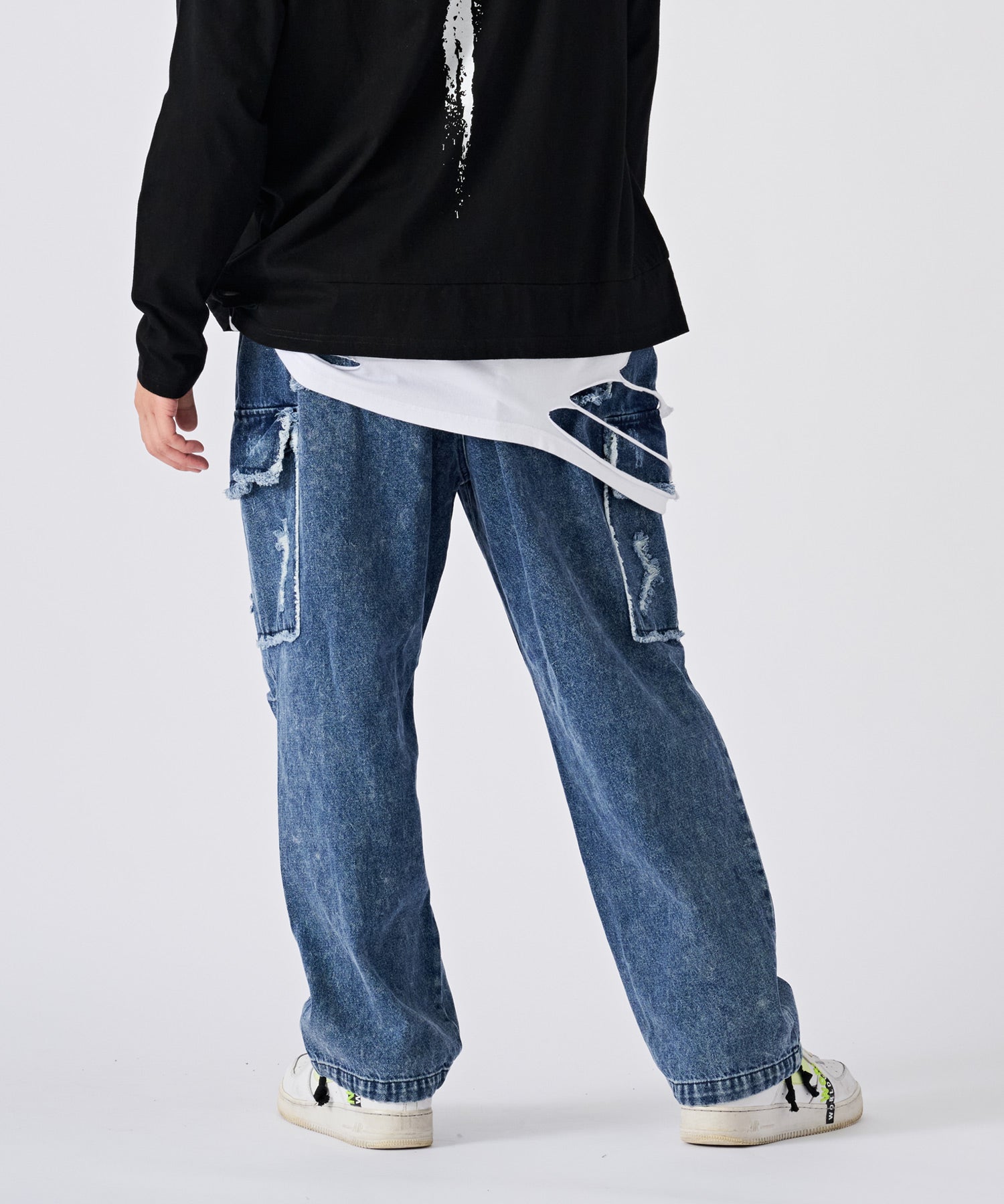 ワイドパンツに適したデニムを使用し、ケミカル加工の色合いがトレンド!