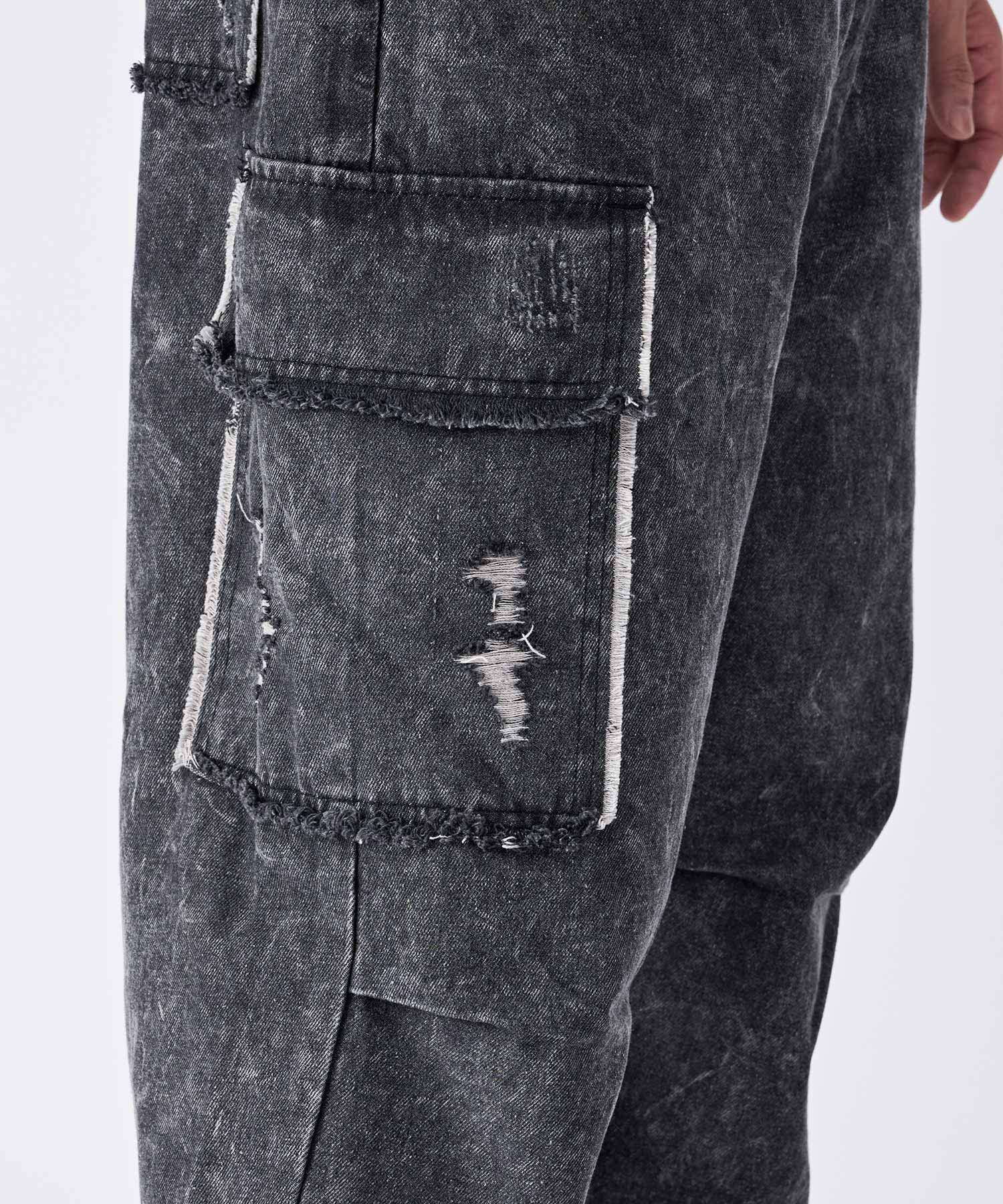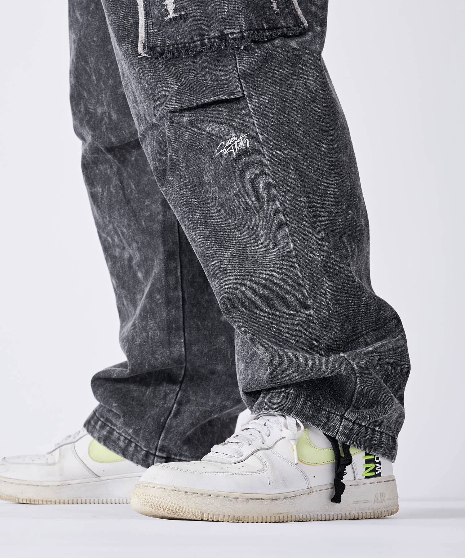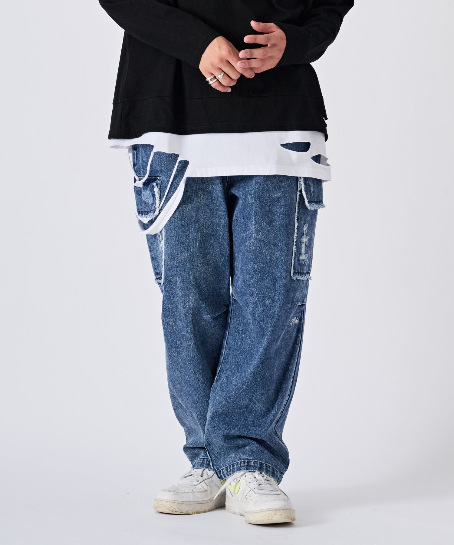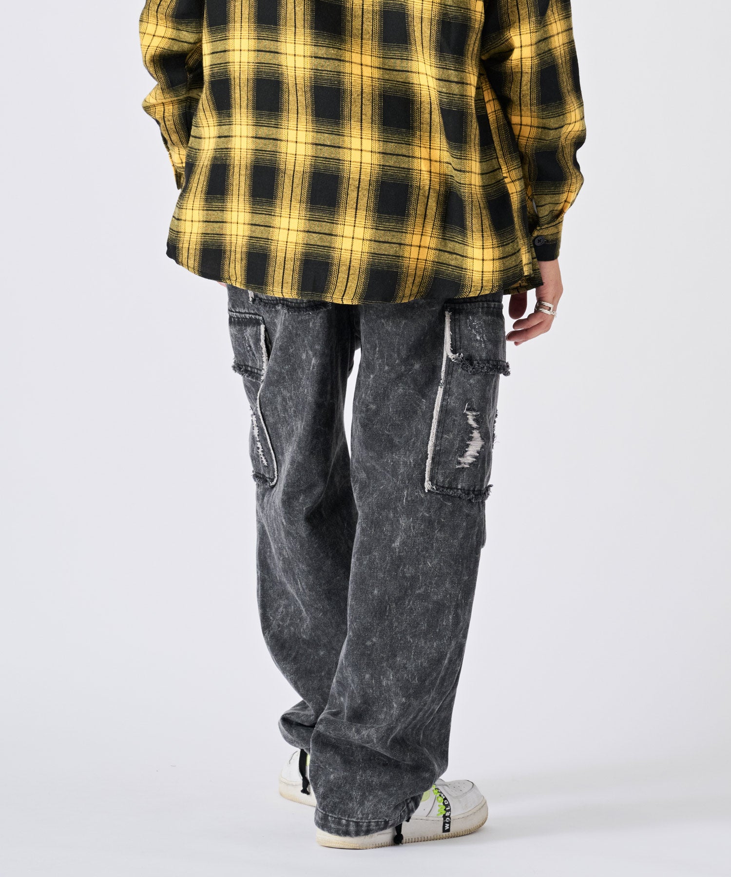 ワイドパンツに適したデニムを使用し、ケミカル加工の色合いがトレンド!