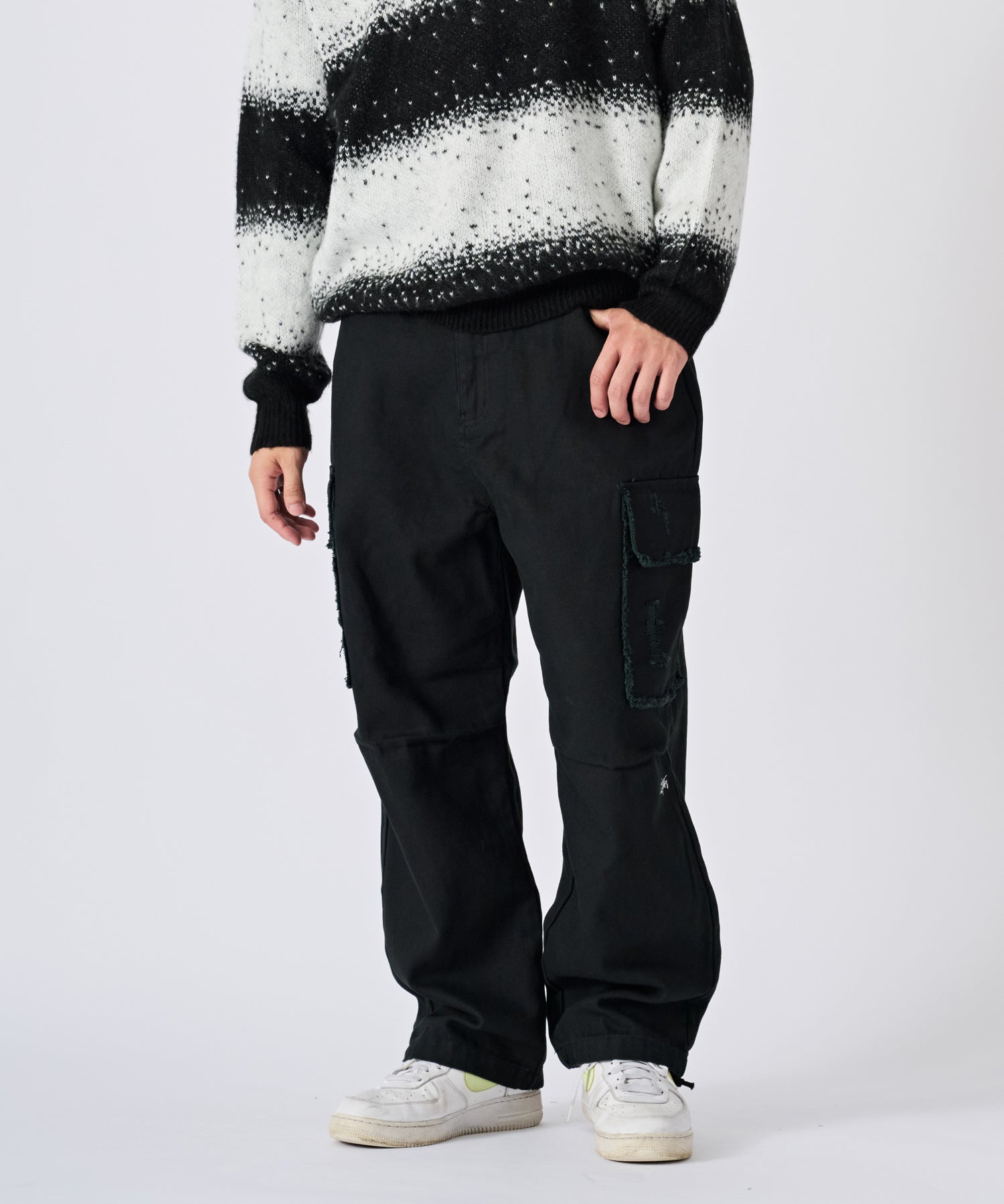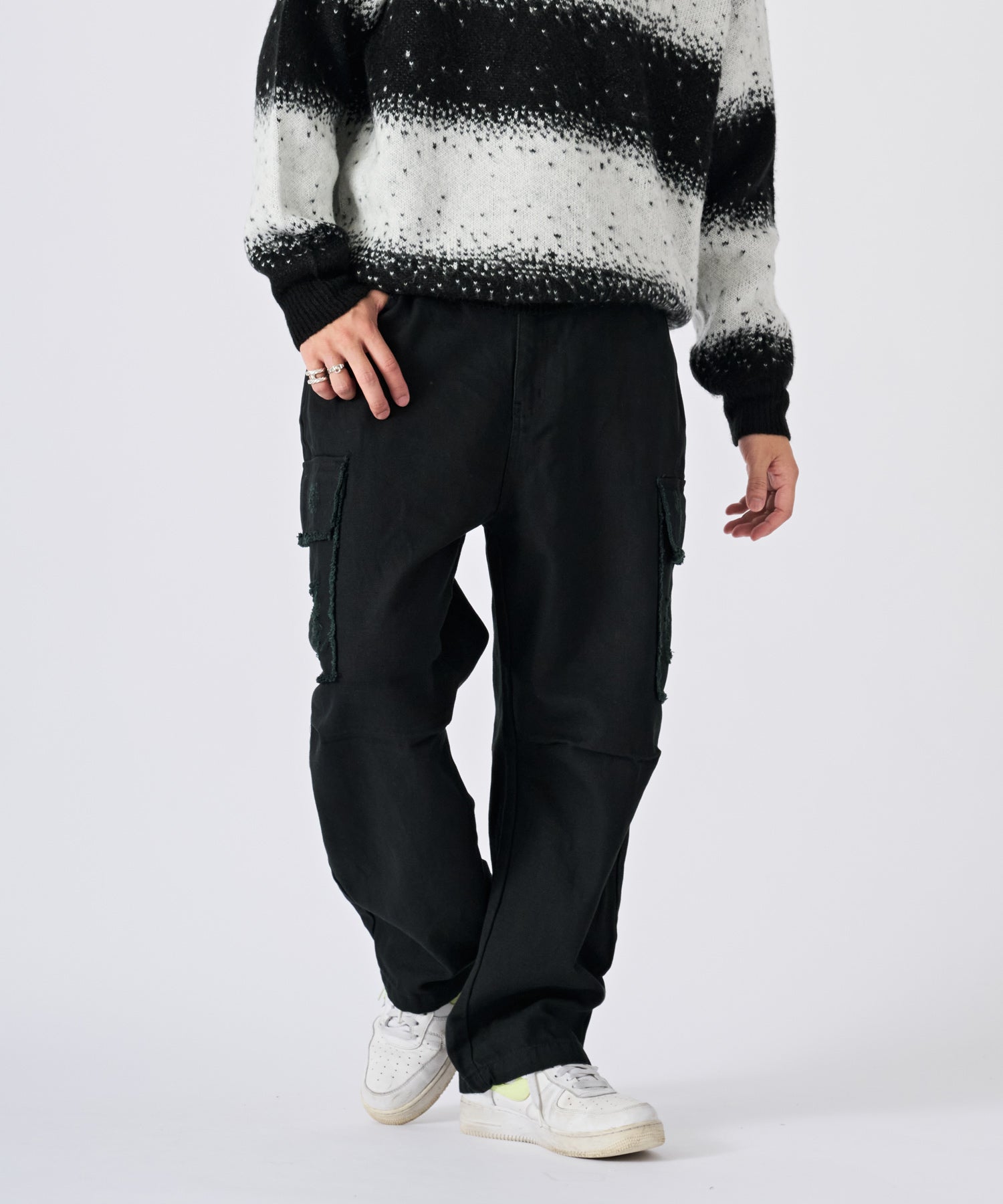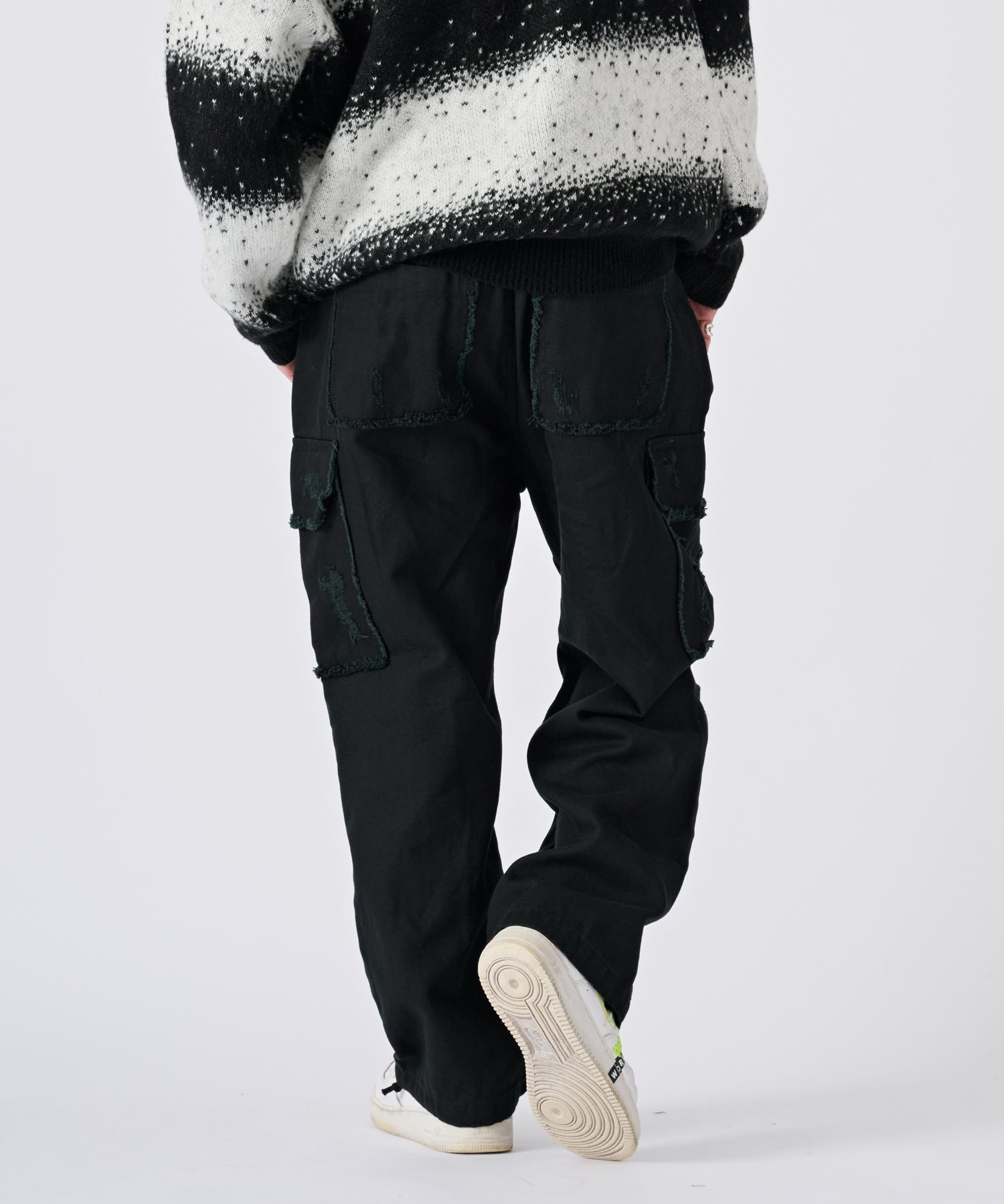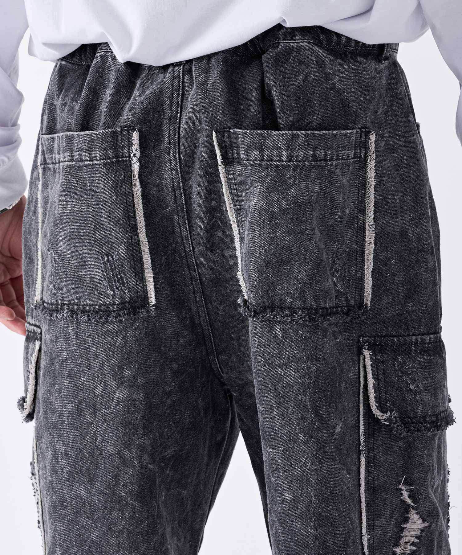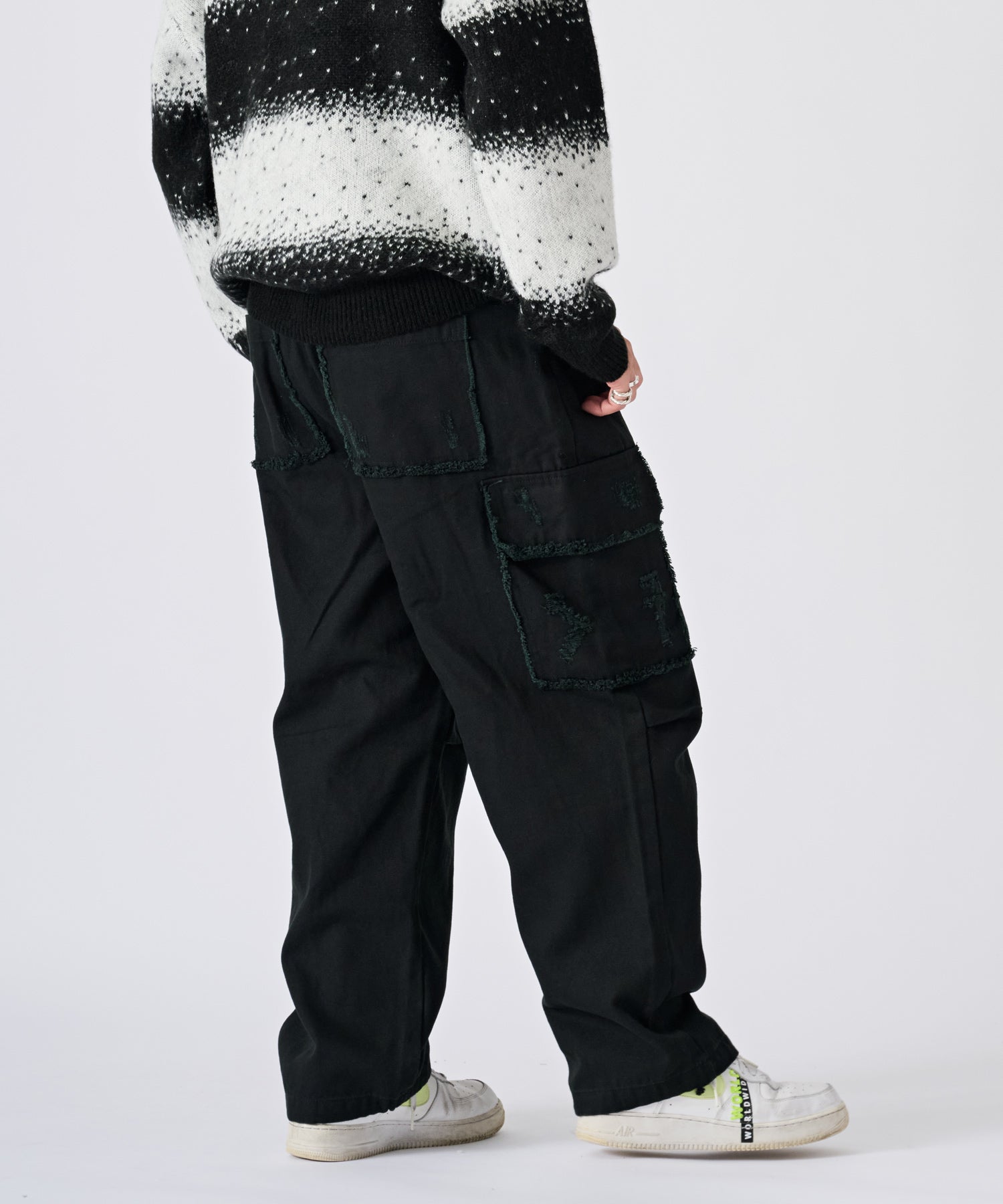 あえて処理してないポケットの縁がアクセントになったデザイン☆更に各所にダメージ加工とリペア加工を施したユーズド感あるアイテム☆ワイドシルエットでウエストはシャーリングになったイージーパンツ(^^♪