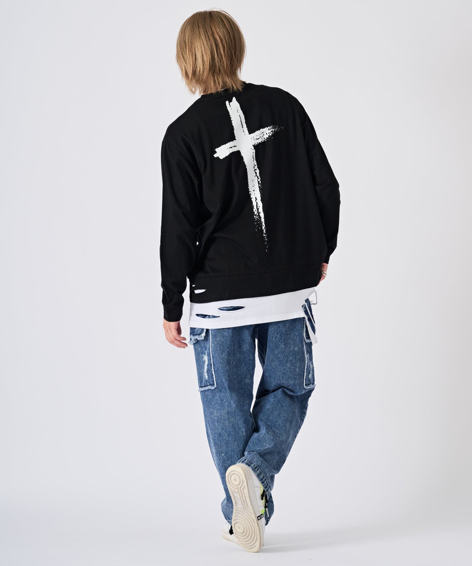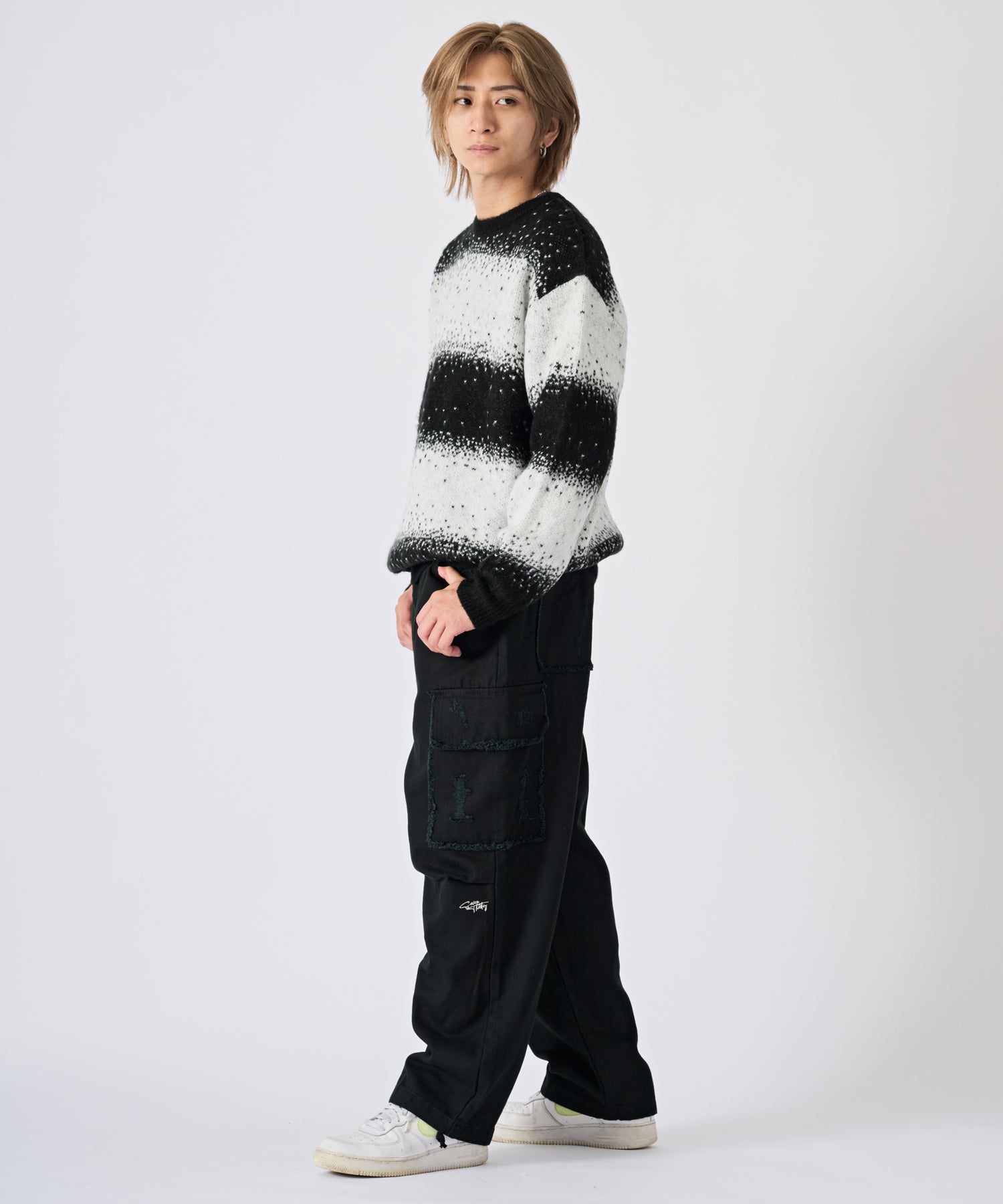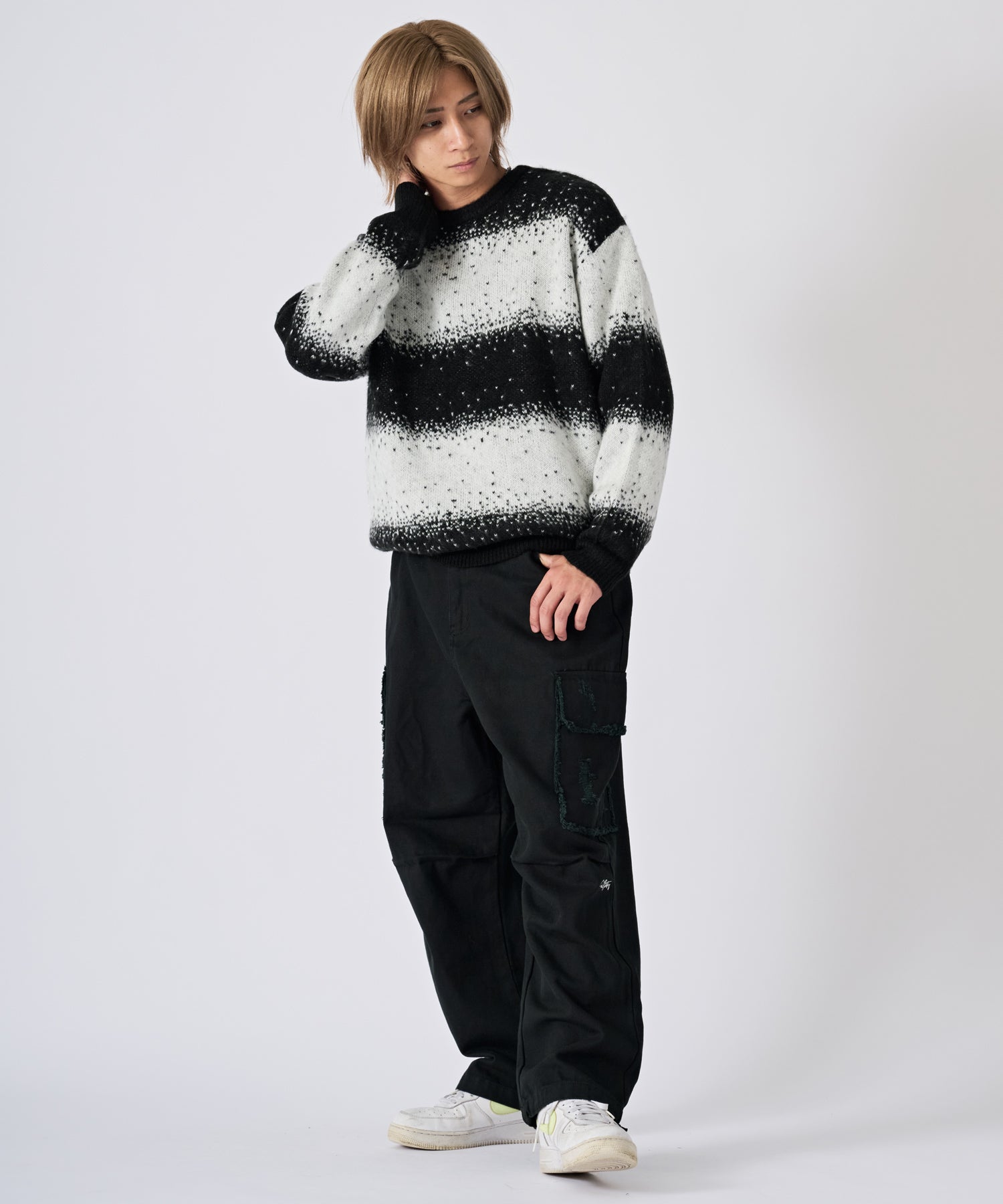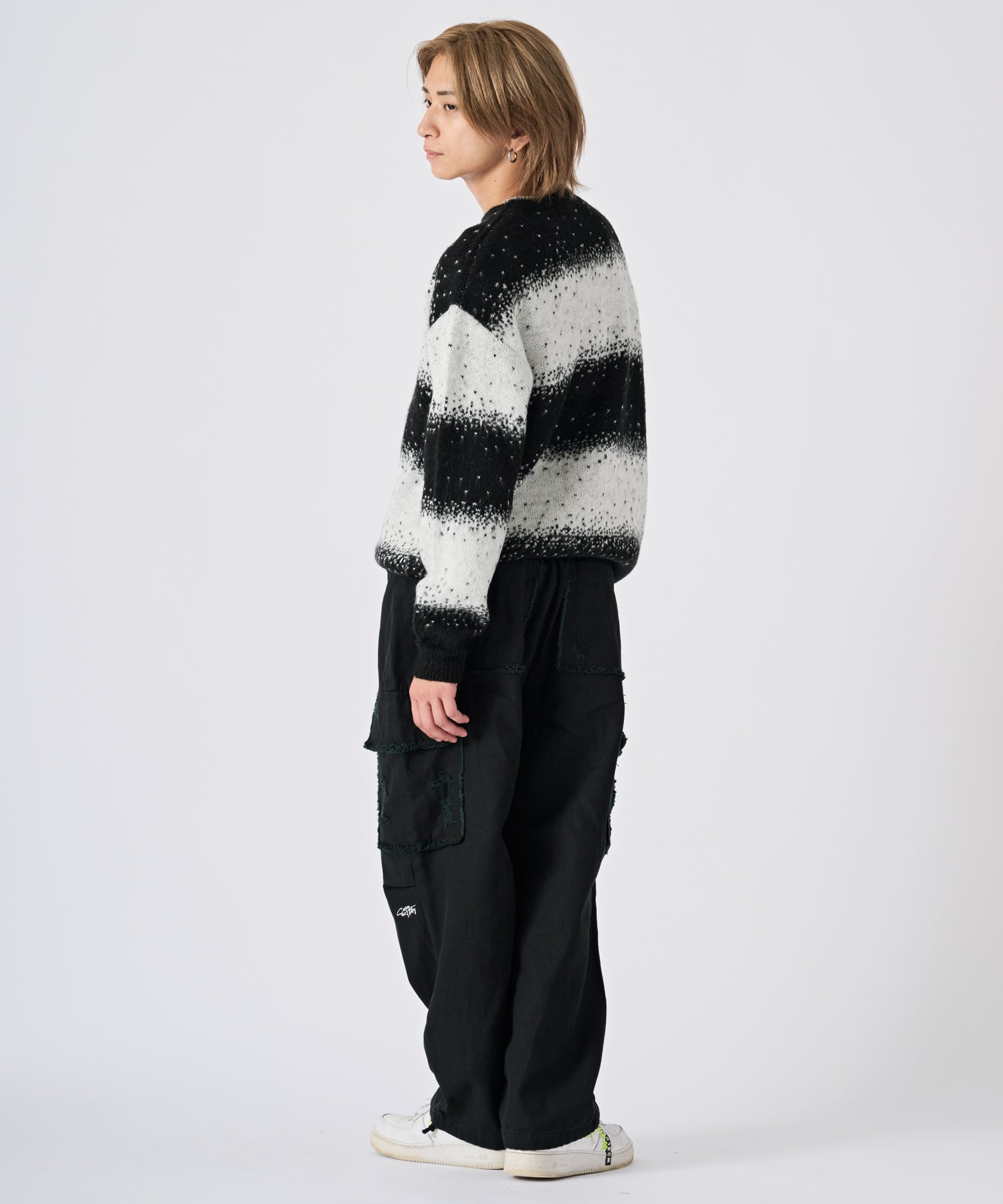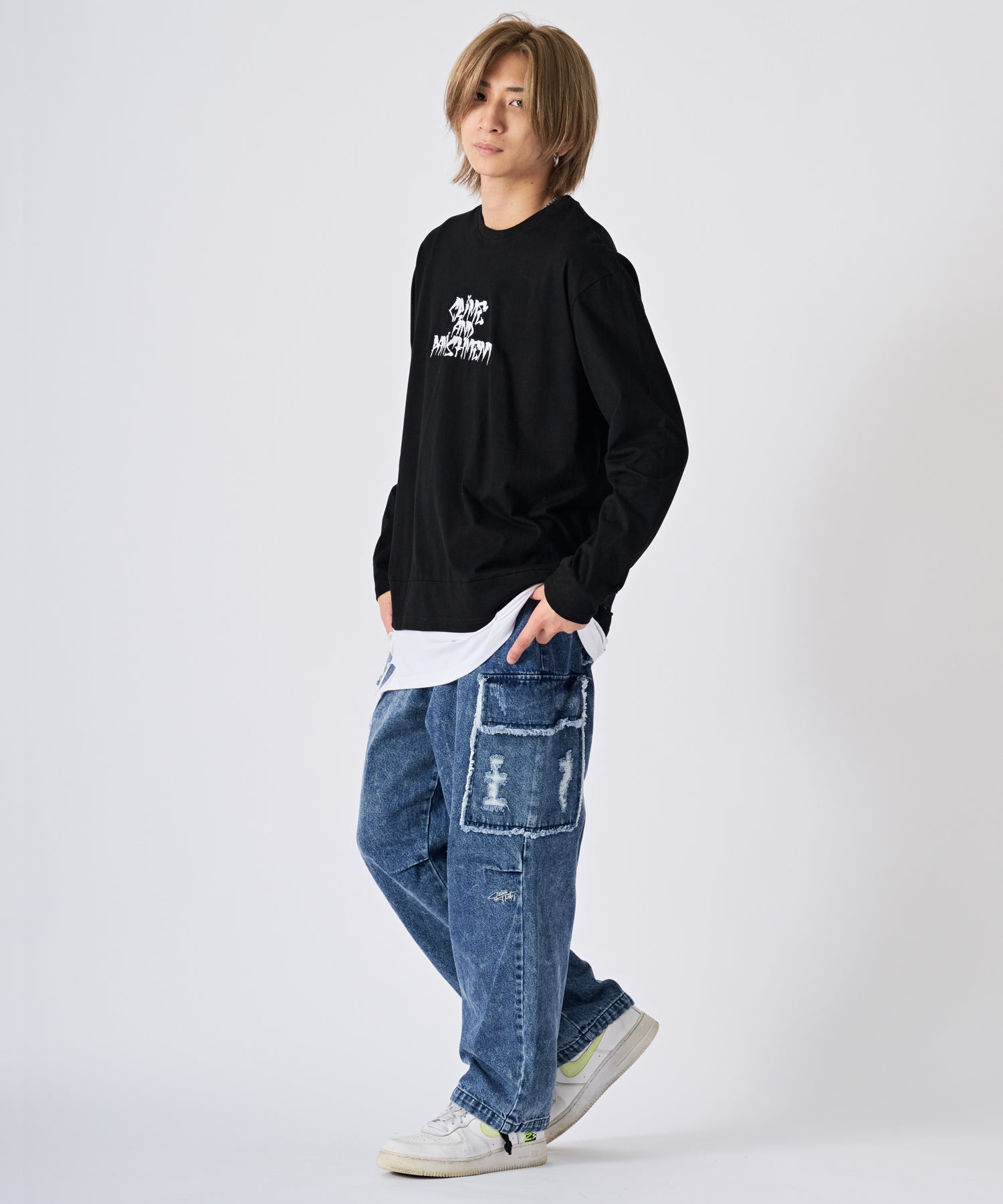 あえて処理してないポケットの縁がアクセントになったデザイン☆更に各所にダメージ加工とリペア加工を施したユーズド感あるアイテム☆ワイドシルエットでウエストはシャーリングになったイージーパンツ(^^♪