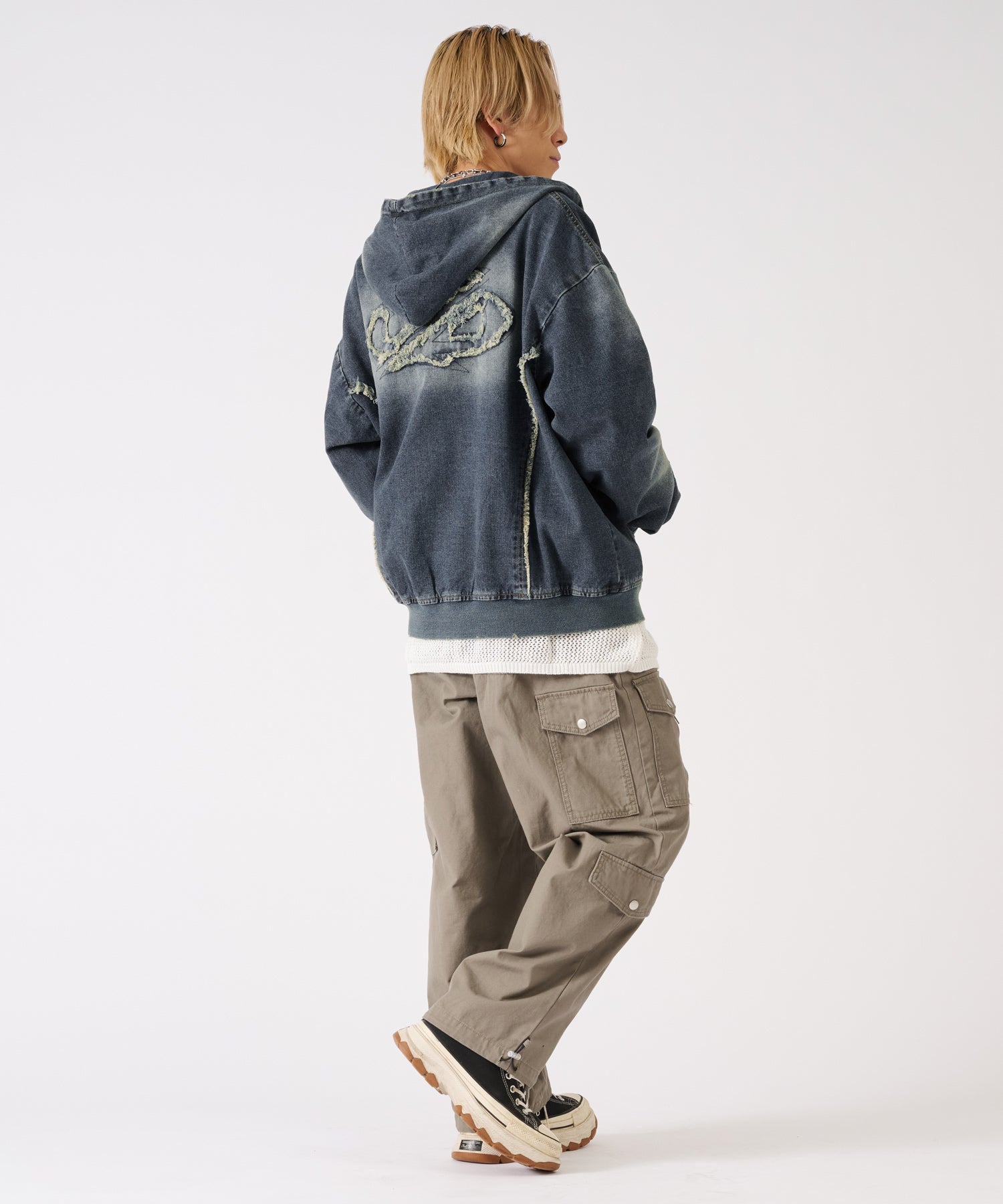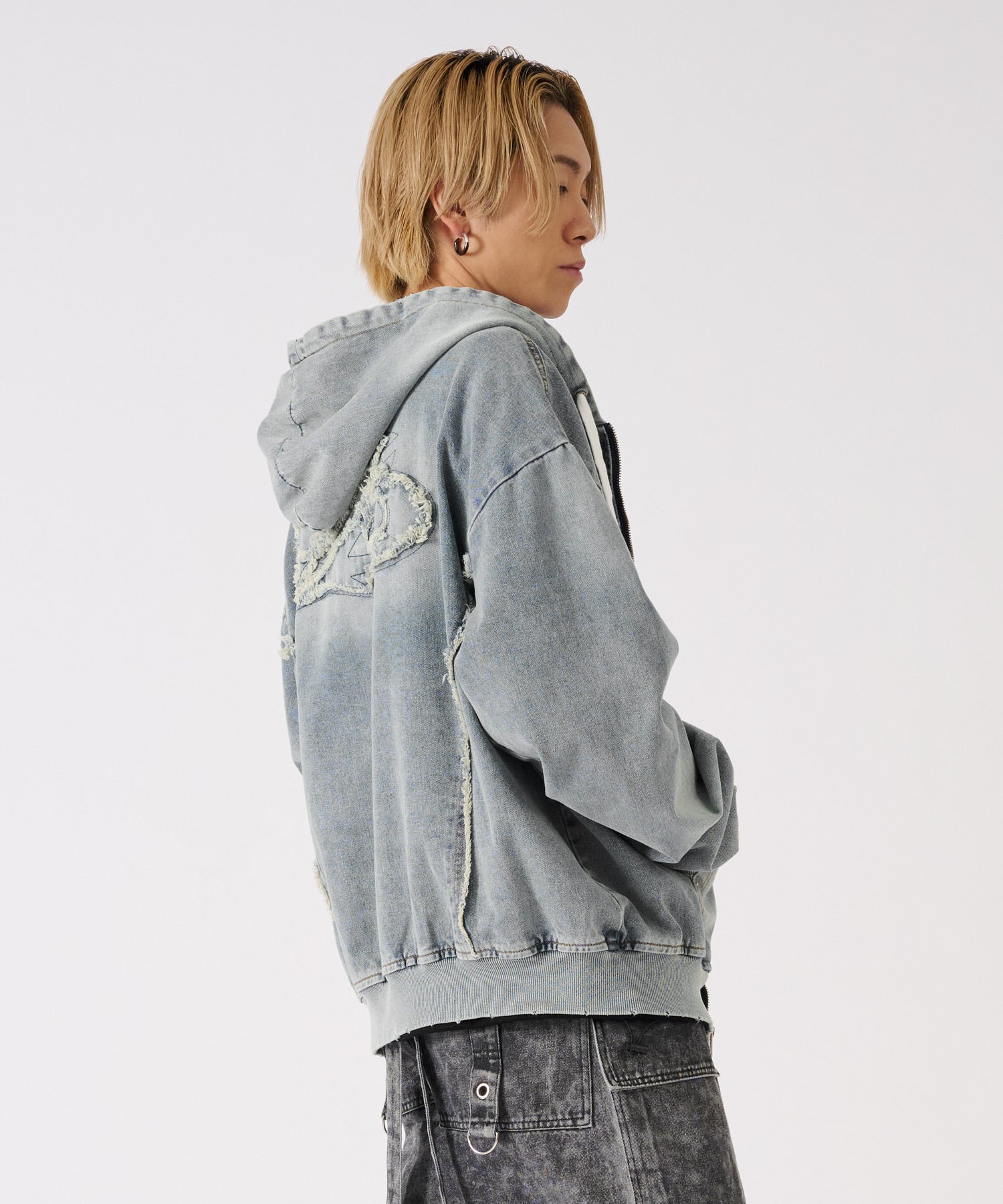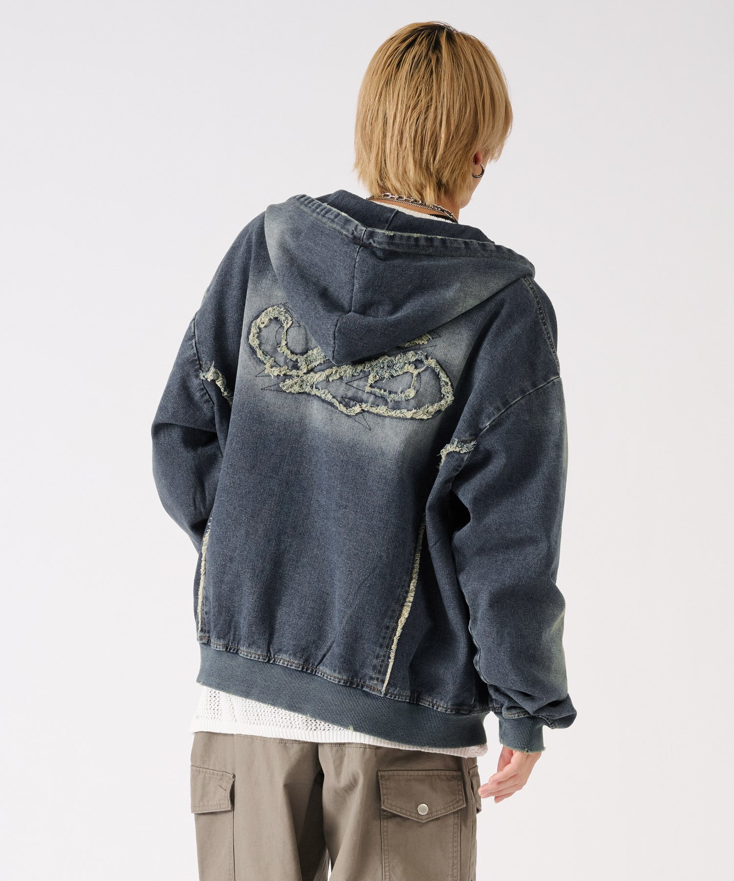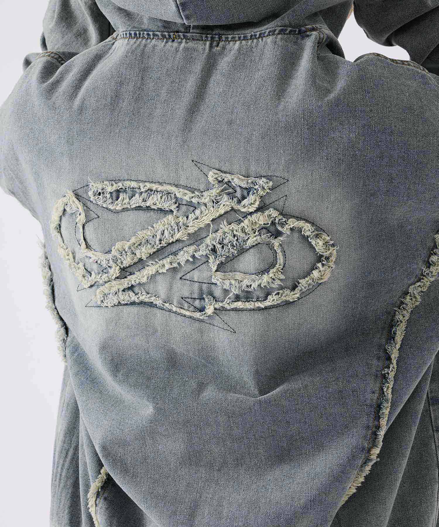 印象的な背中のアップリケの端や、切り替え部分は生地の端をフリンジにしたデザインで、そして胸や背中、袖にもデニムならではの色落ち感を施し、更に袖やリブの雰囲気も古着っぽくて超かっこいいです!!