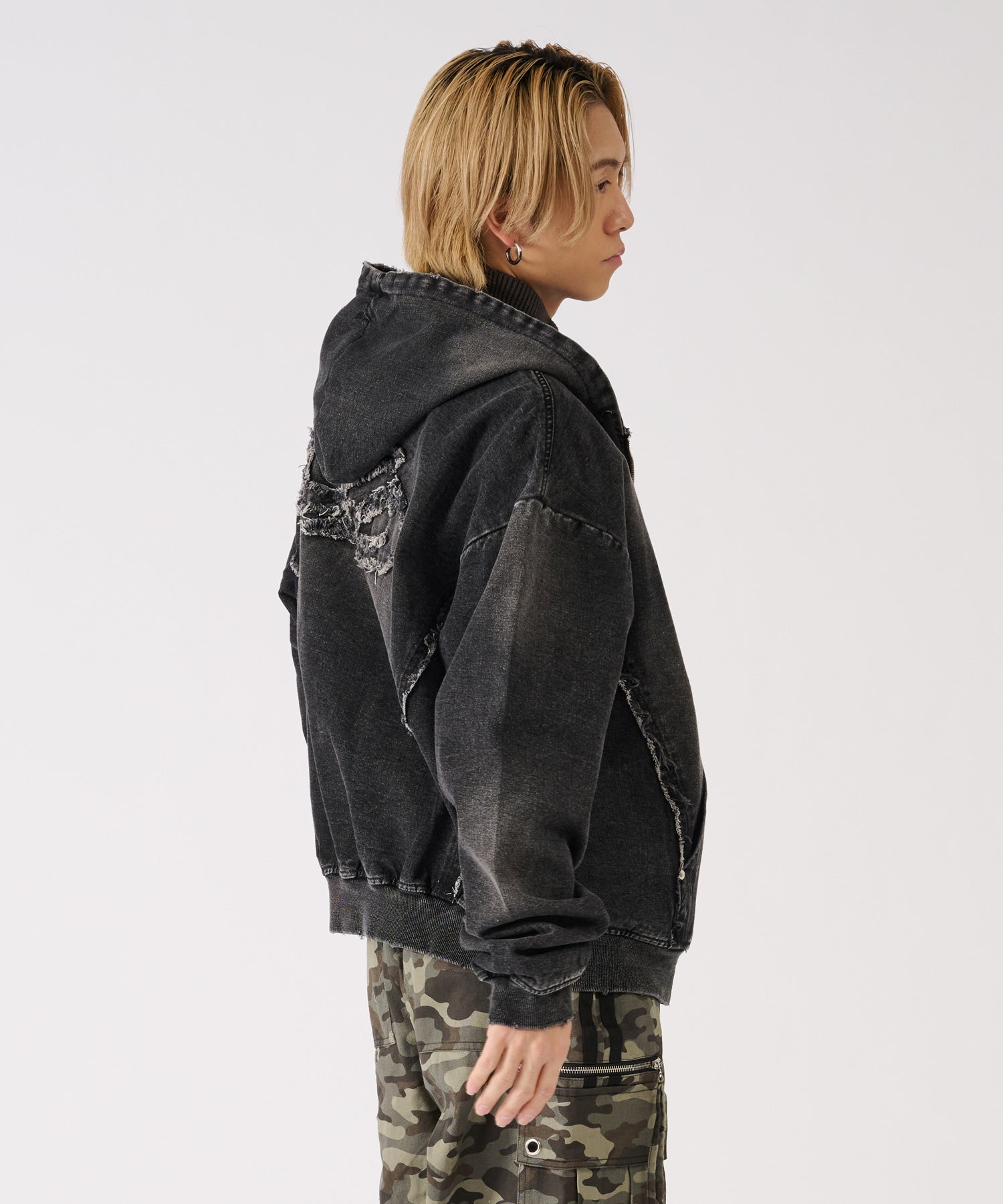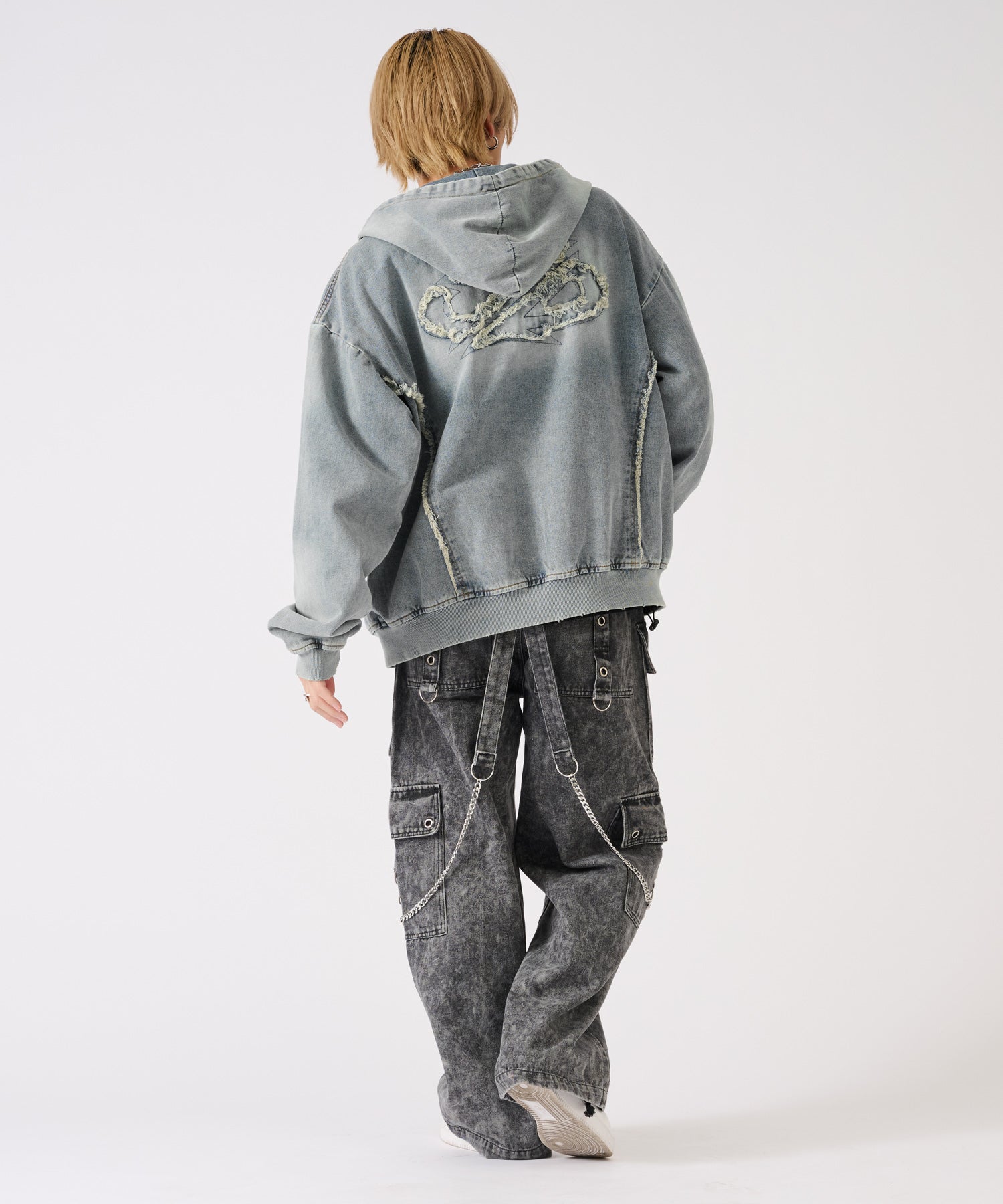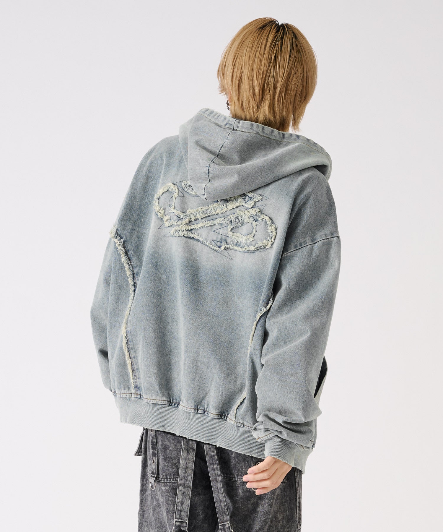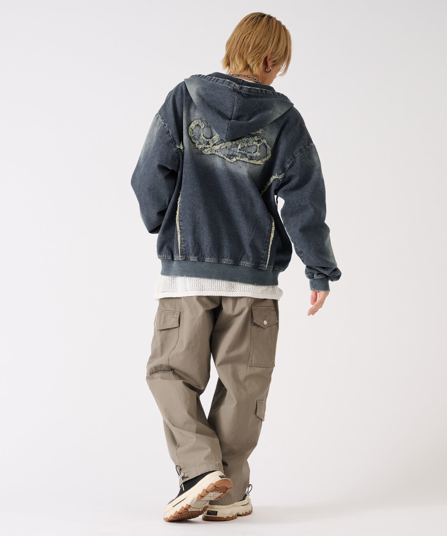 印象的な背中のアップリケの端や、切り替え部分は生地の端をフリンジにしたデザインで、そして胸や背中、袖にもデニムならではの色落ち感を施し、更に袖やリブの雰囲気も古着っぽくて超かっこいいです!!