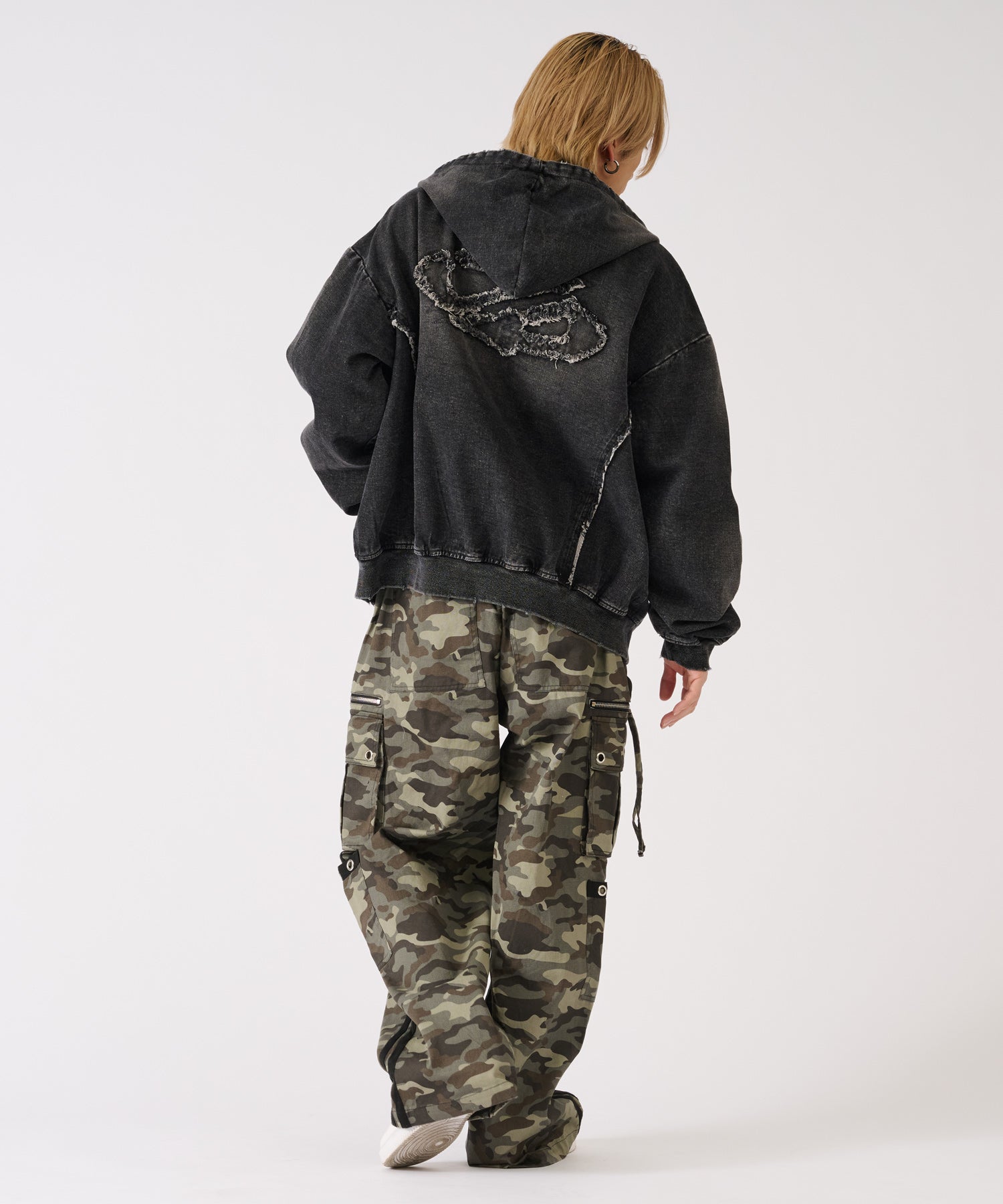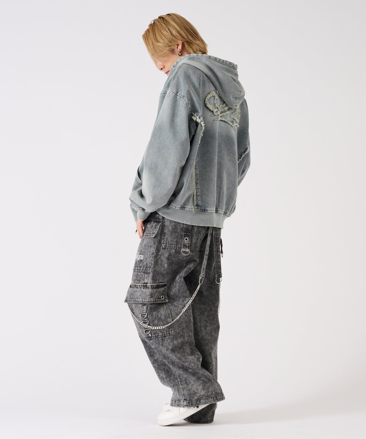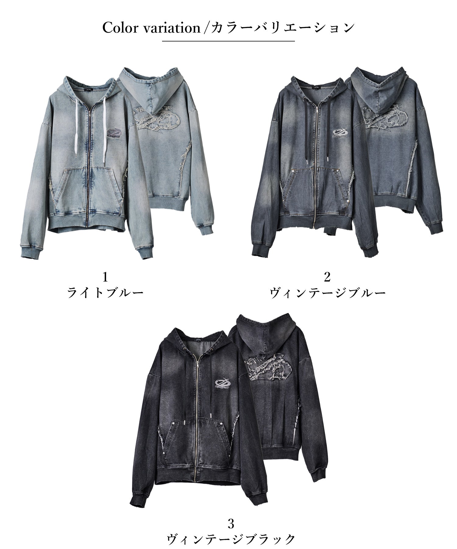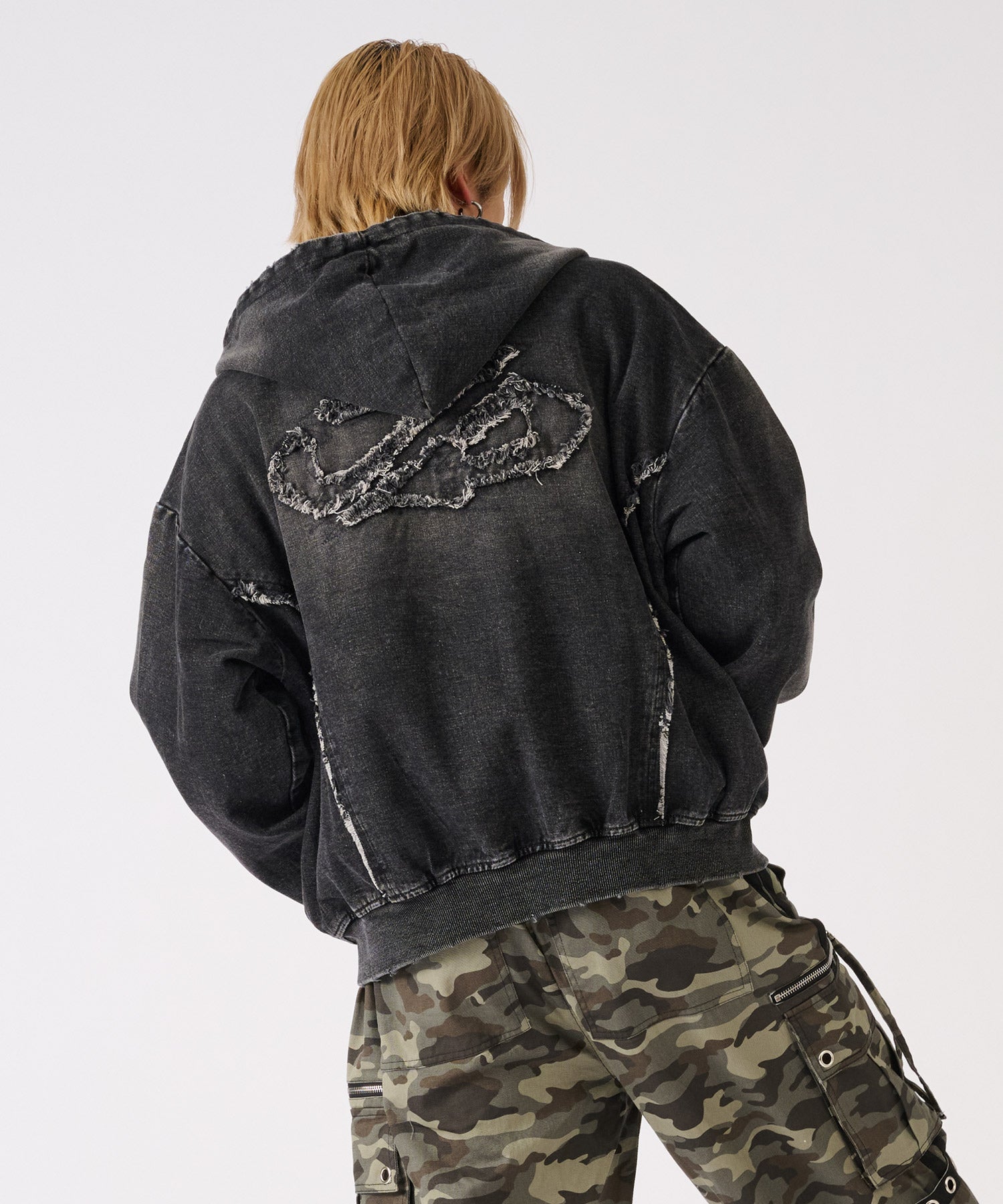 印象的な背中のアップリケの端や、切り替え部分は生地の端をフリンジにしたデザインで、そして胸や背中、袖にもデニムならではの色落ち感を施し、更に袖やリブの雰囲気も古着っぽくて超かっこいいです!!
