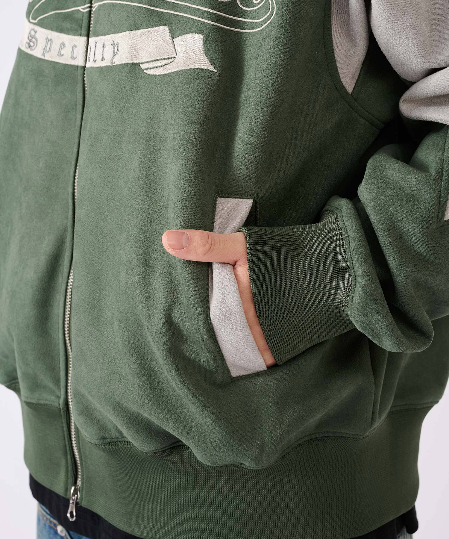 同素材のカラーを切り替えたデザインで、胸のロゴは全て刺繍で表現しているんです!!!スタジャン風にも着られます☆