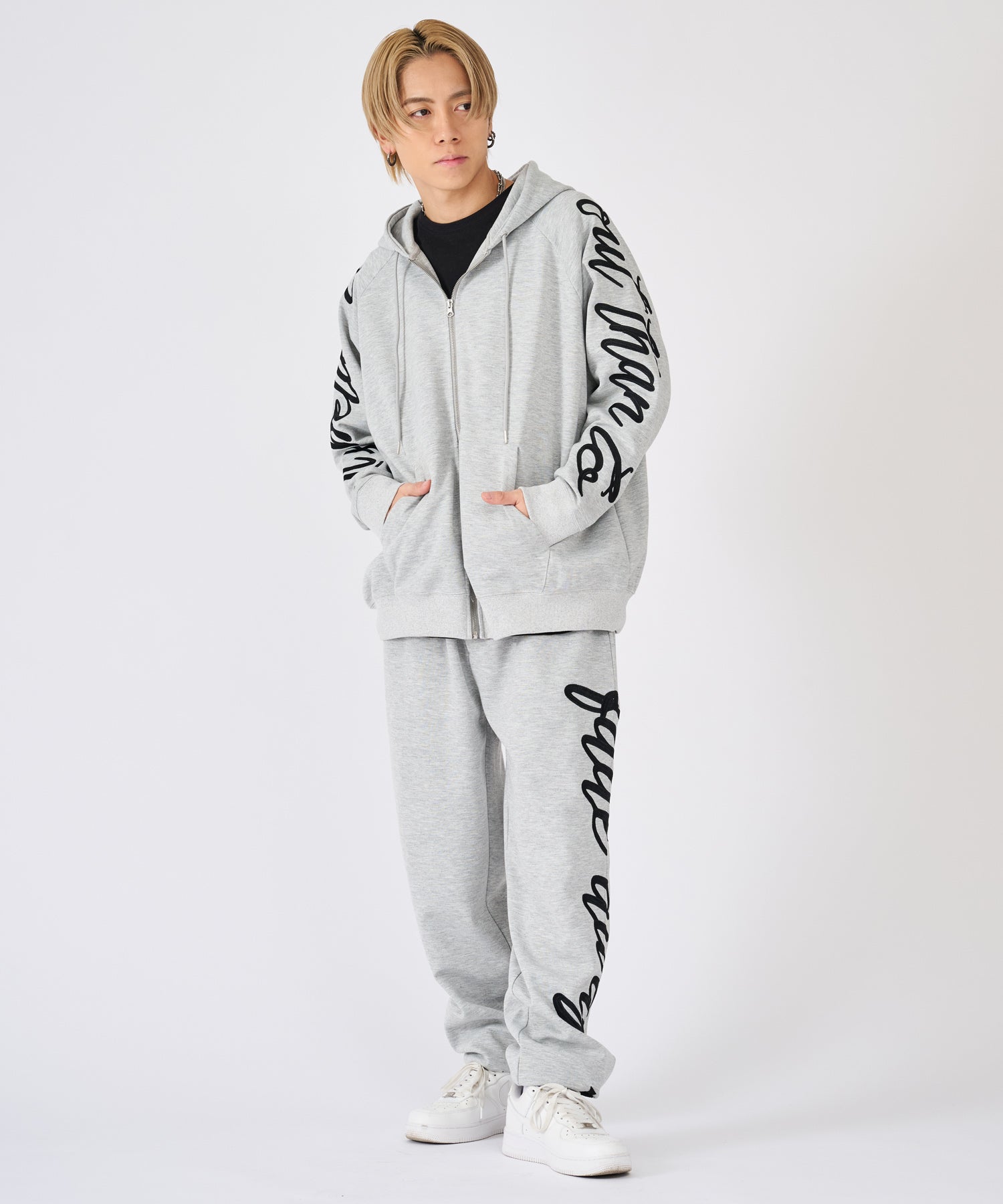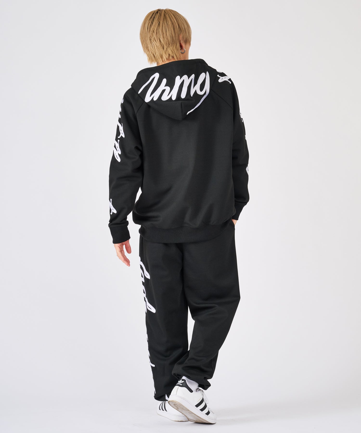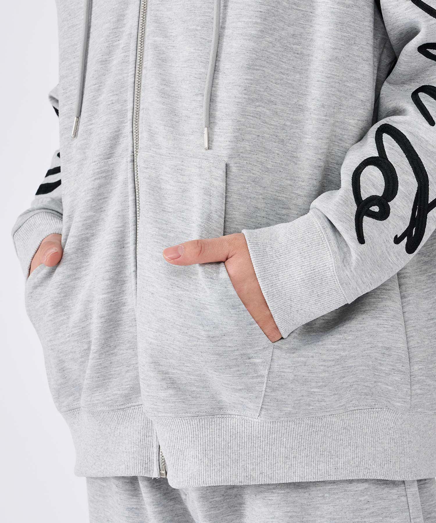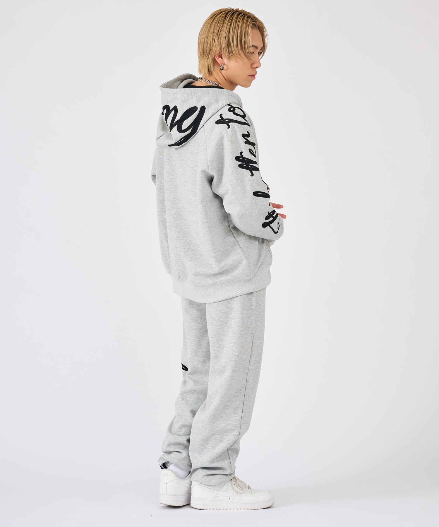 刺繍が印象的なプルパーカーとスウェットパンツのセットアップ