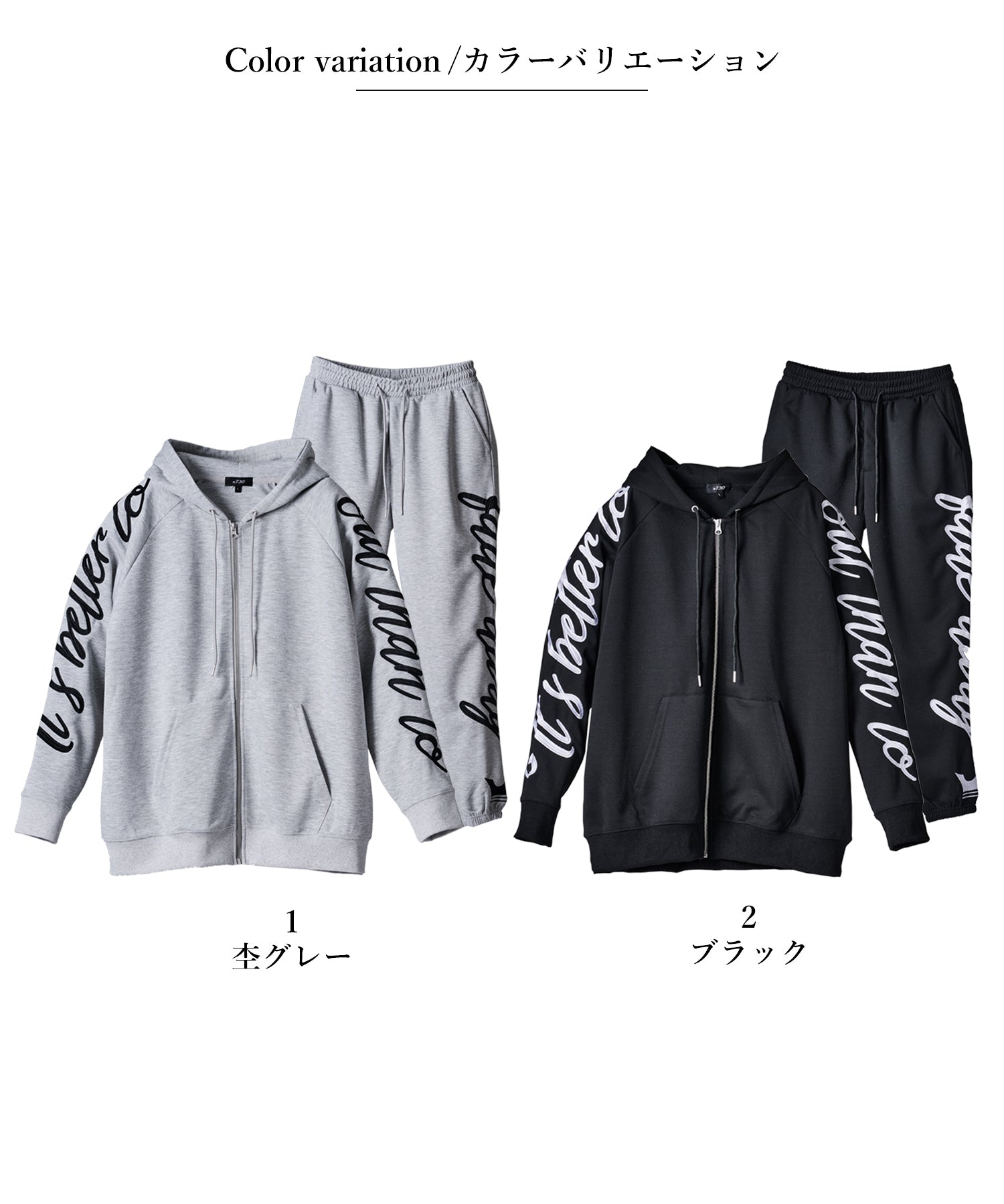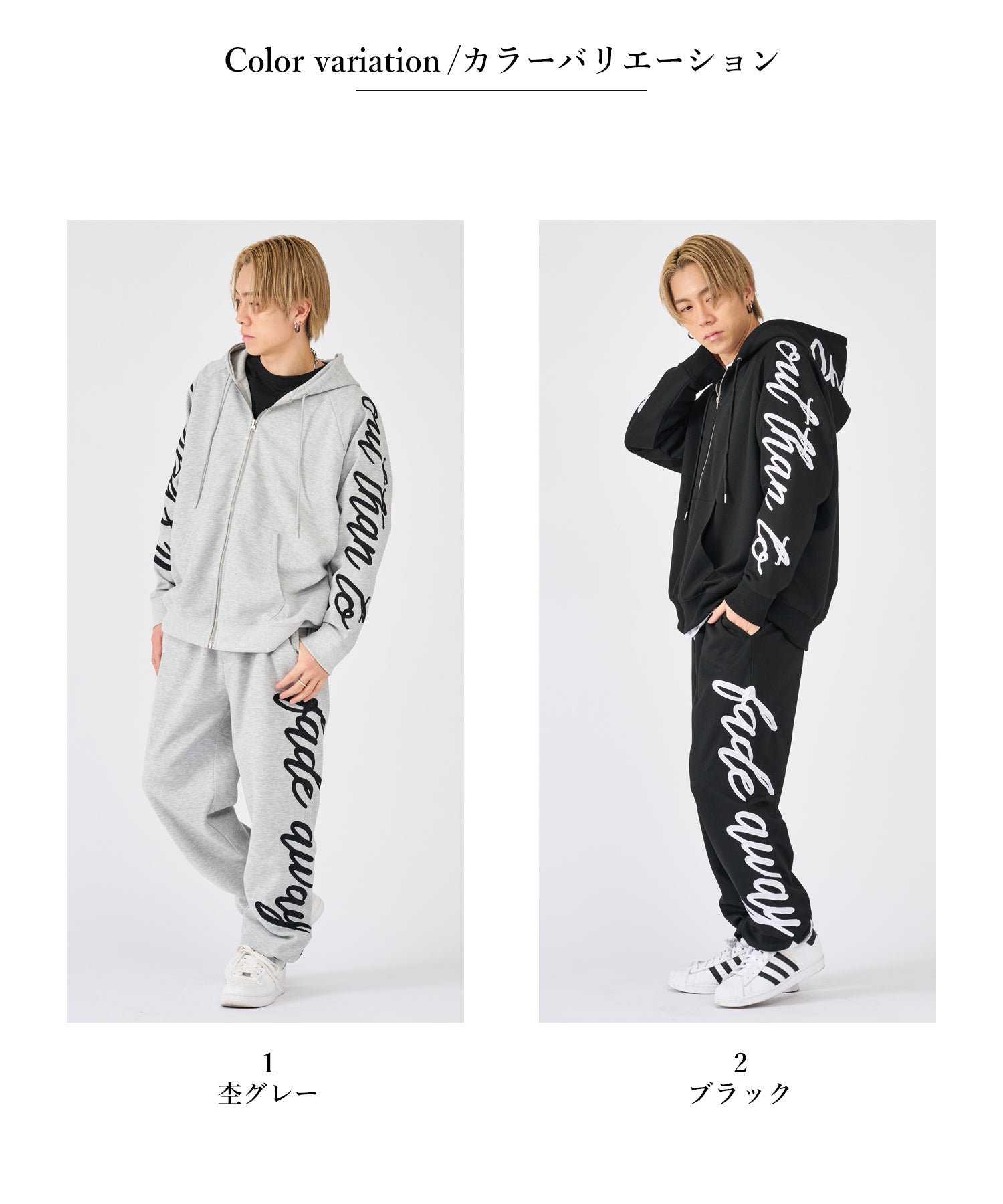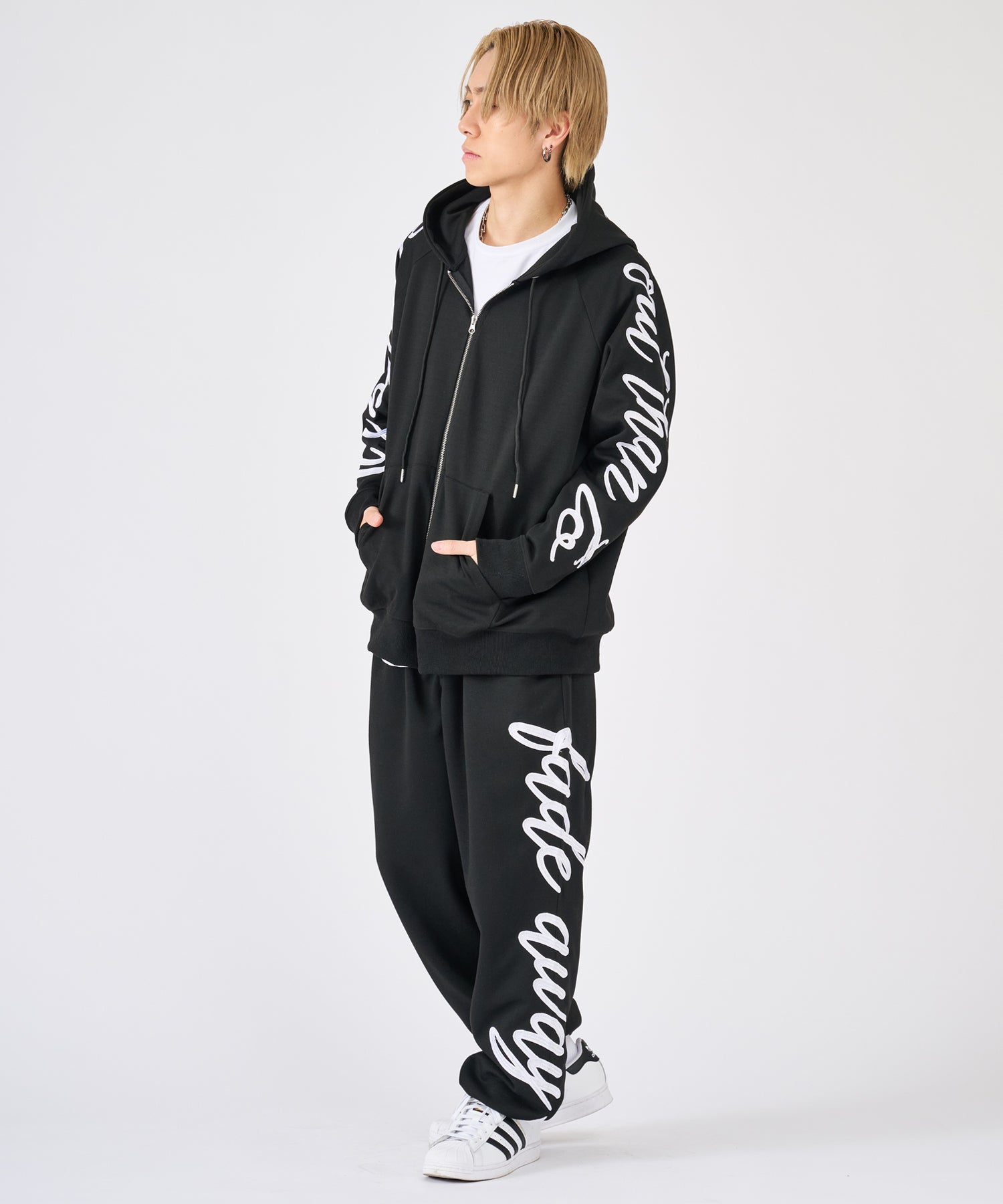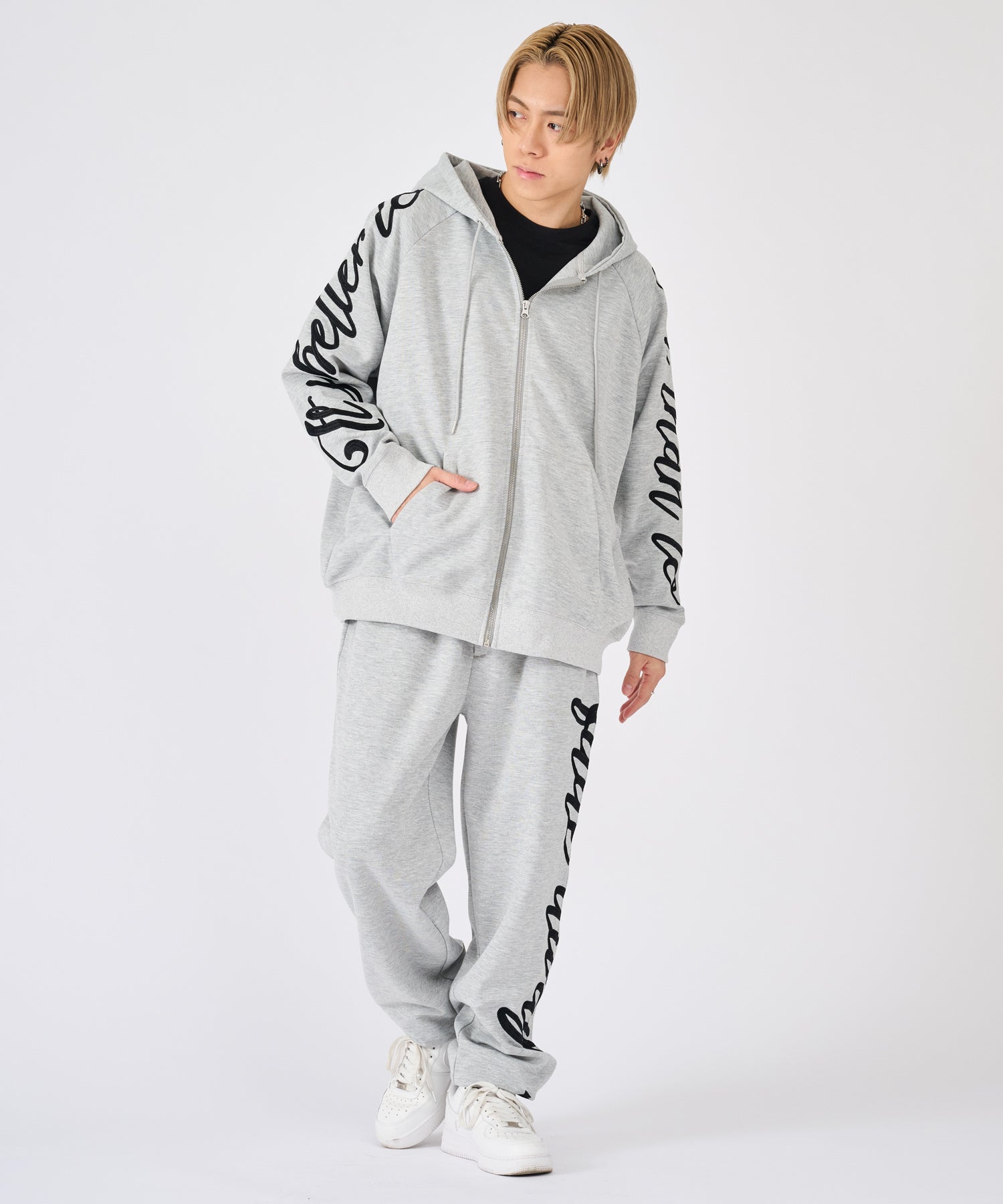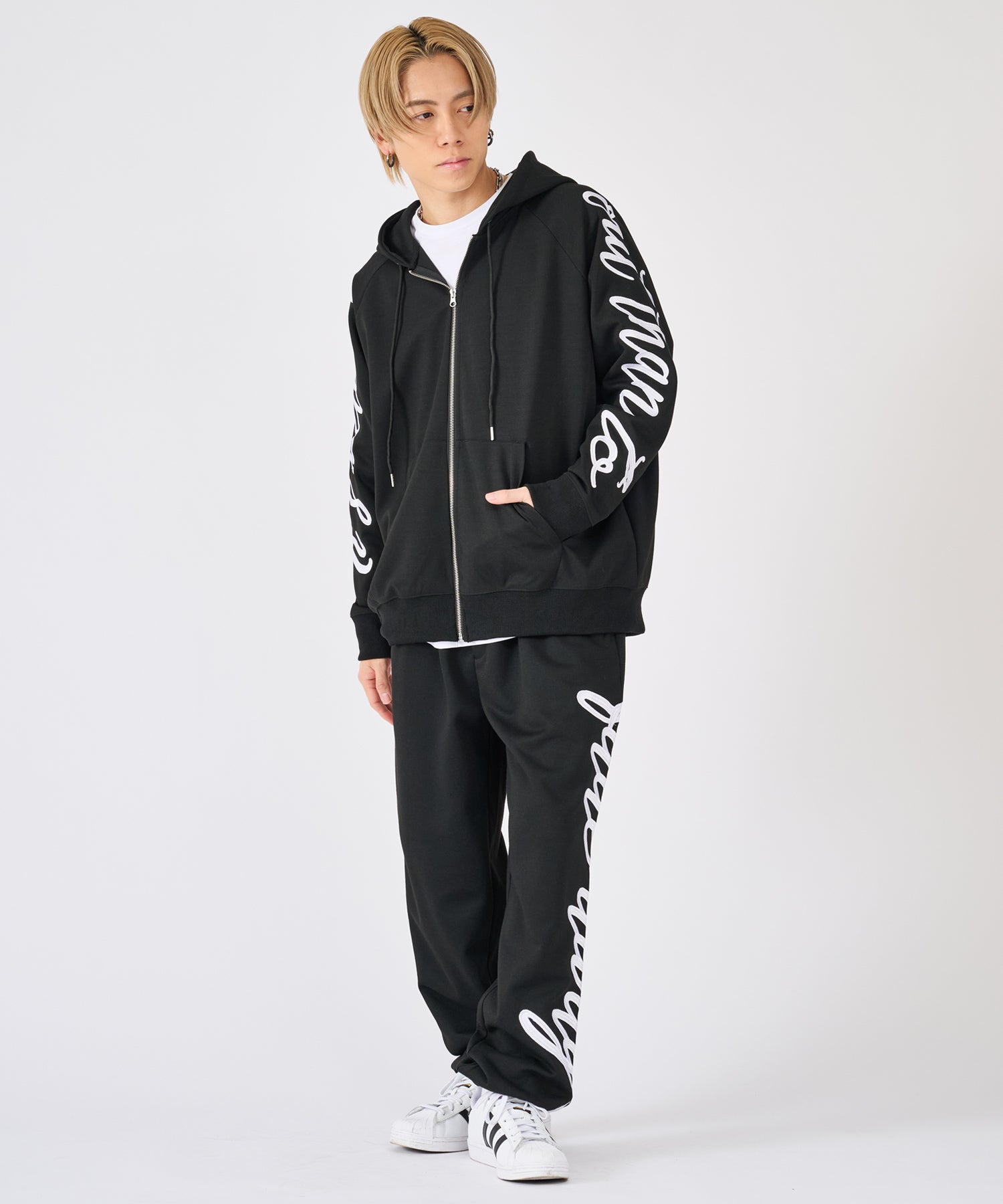 刺繍が印象的なプルパーカーとスウェットパンツのセットアップ