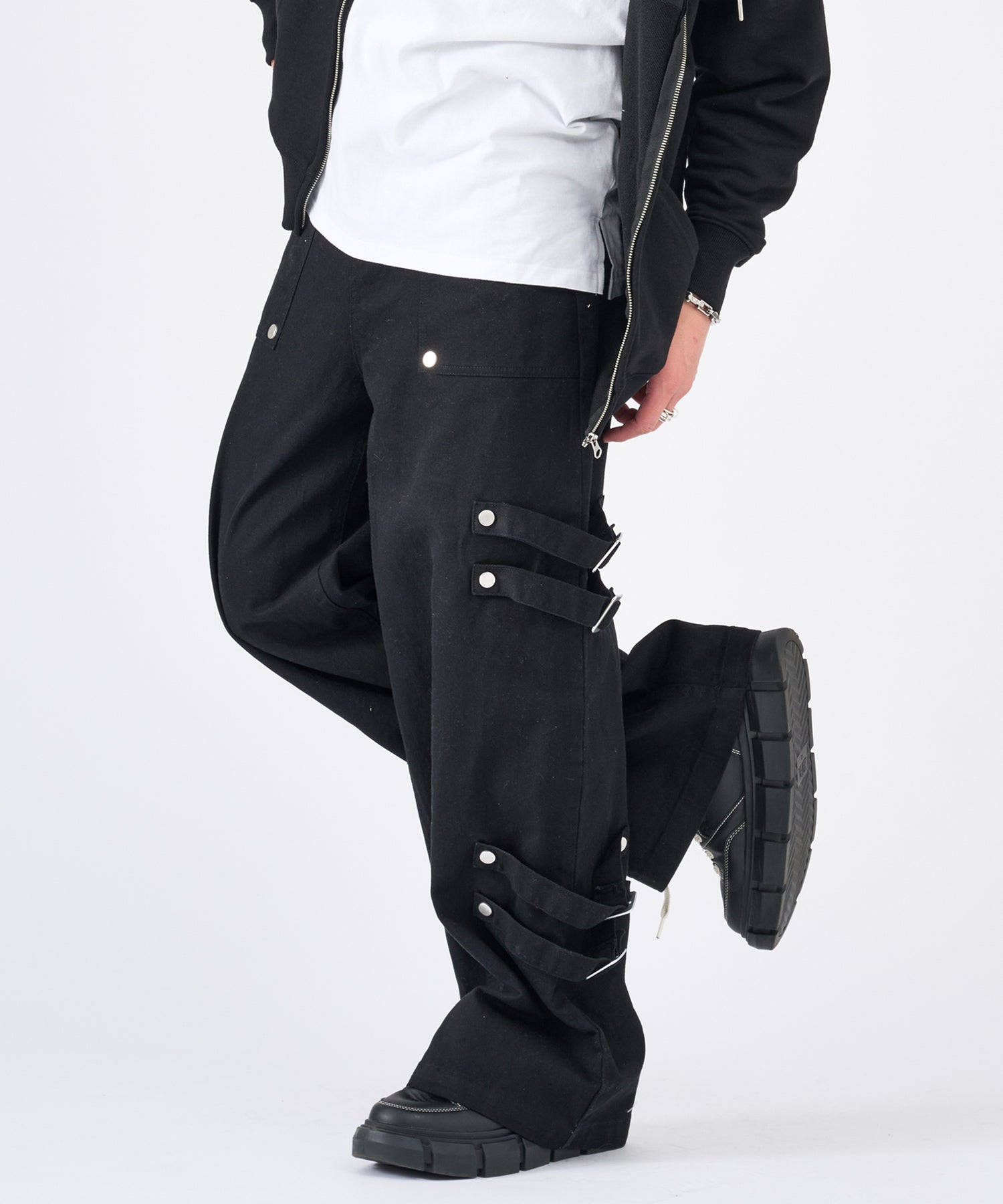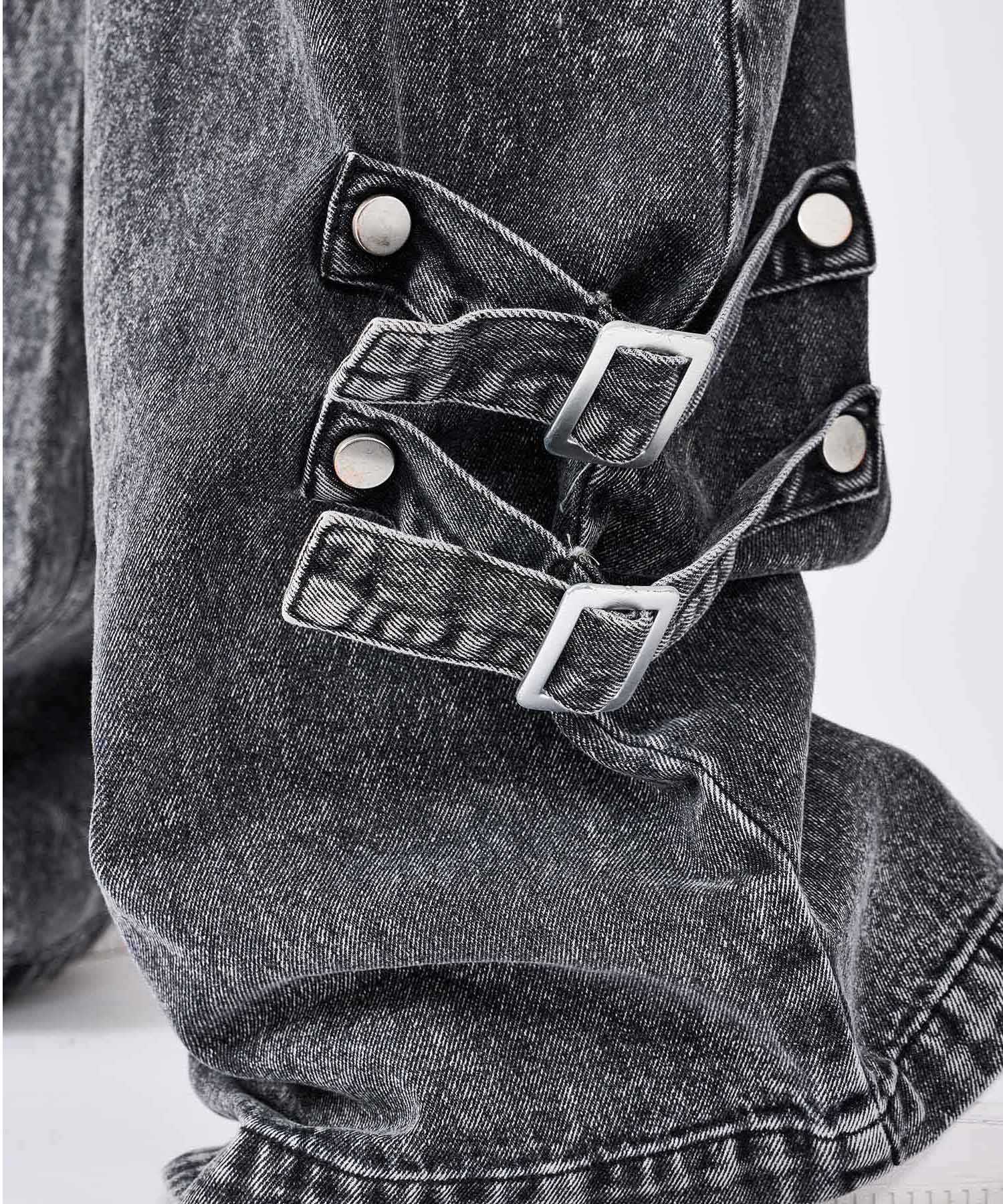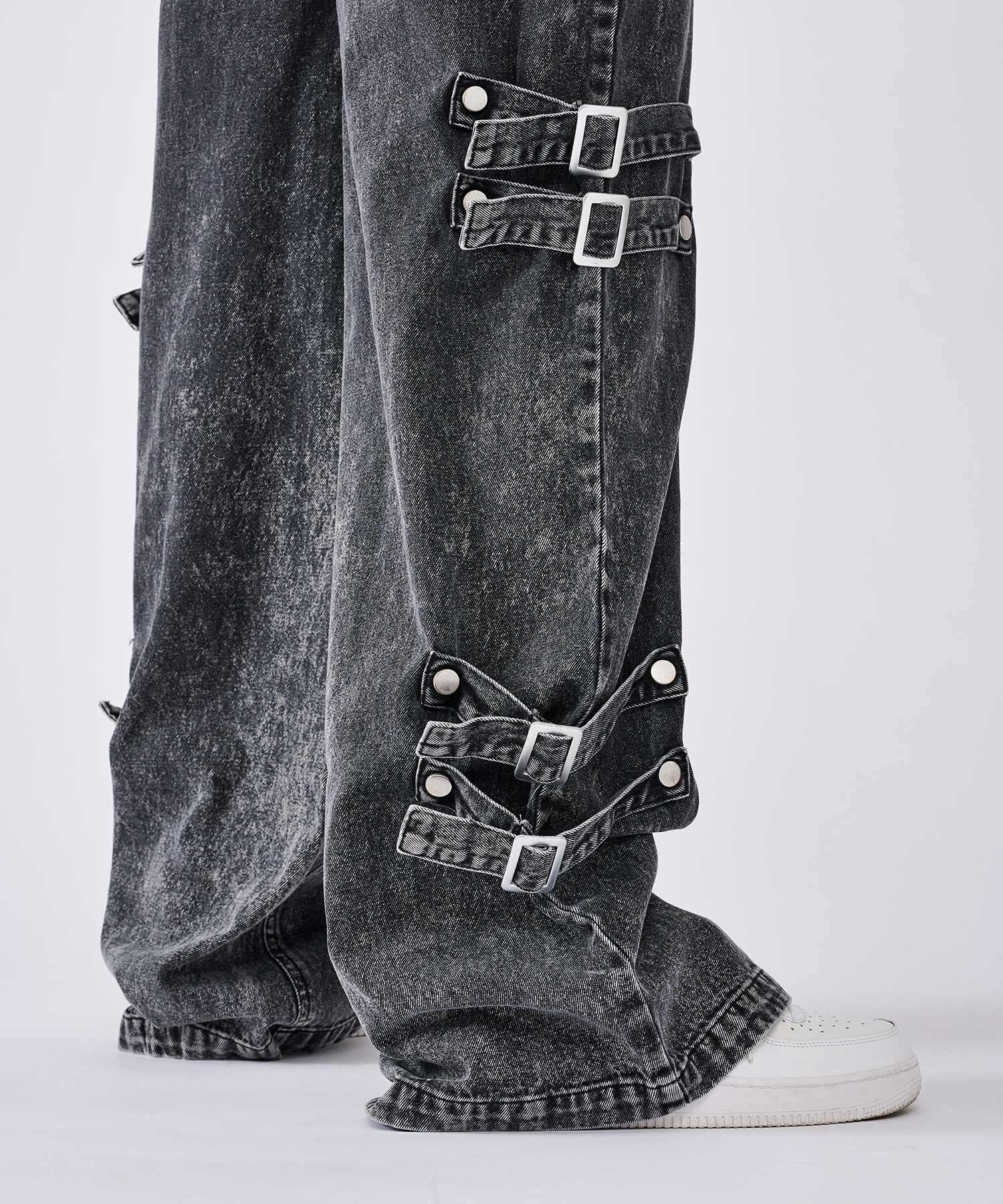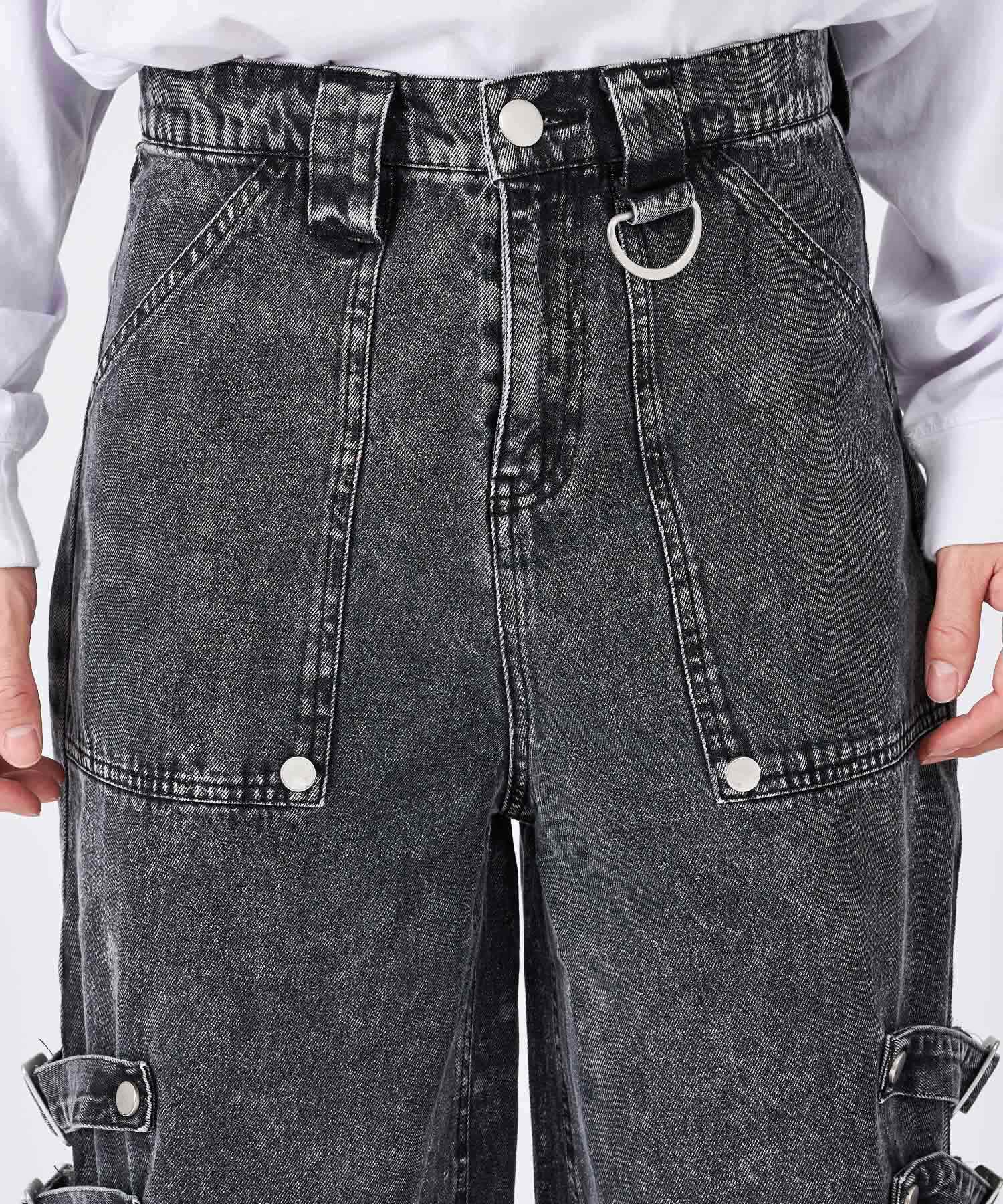 ボンテージ風のベルトデザインが目を引くワイドパンツです☆