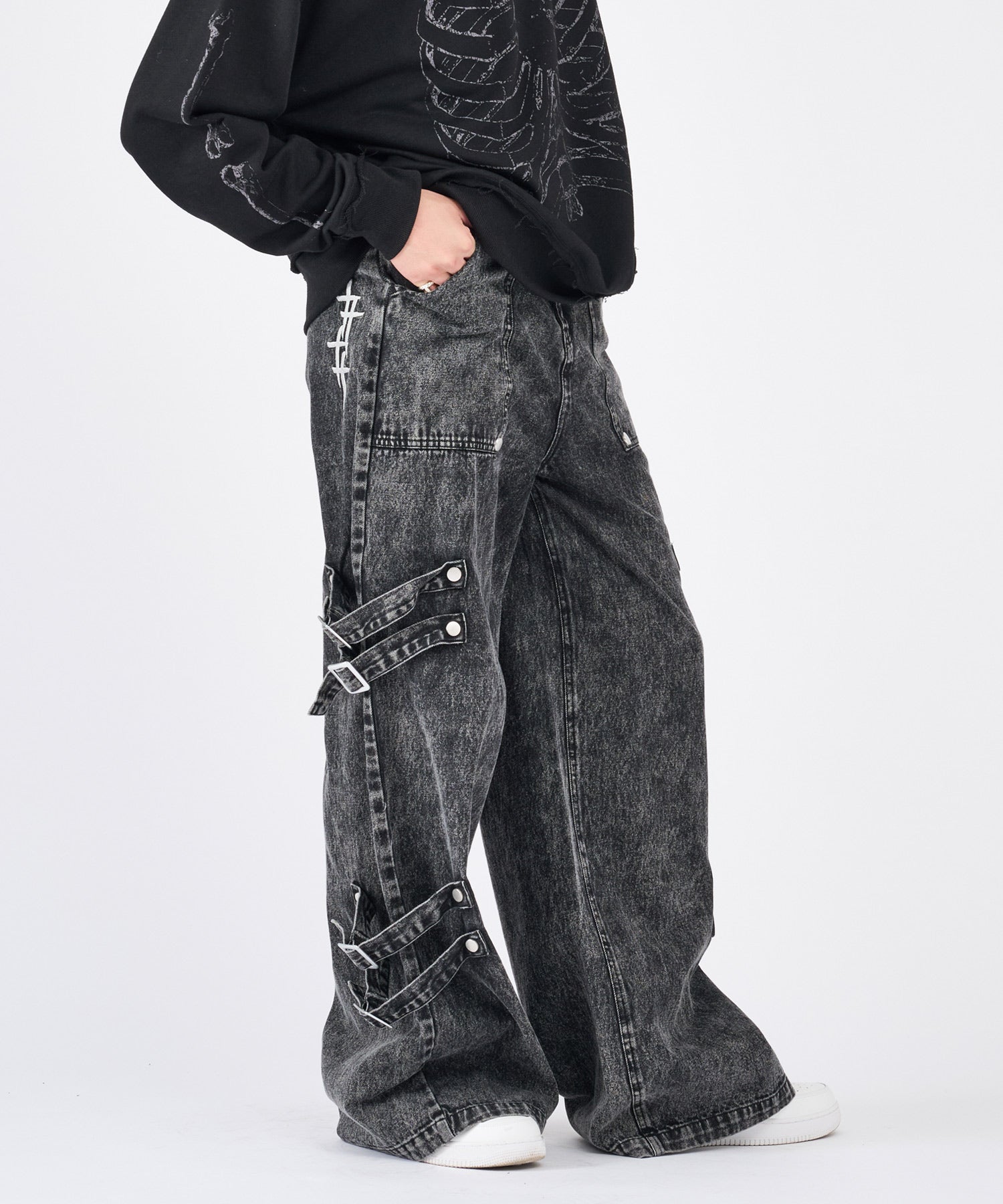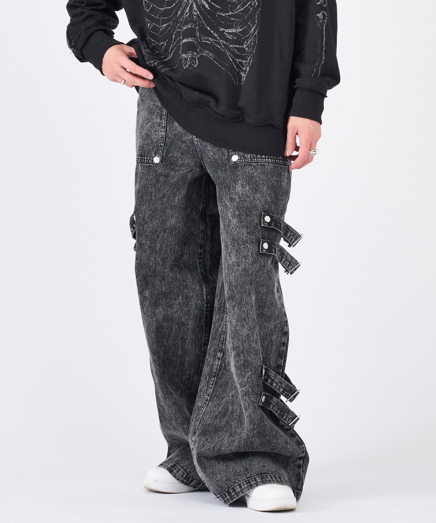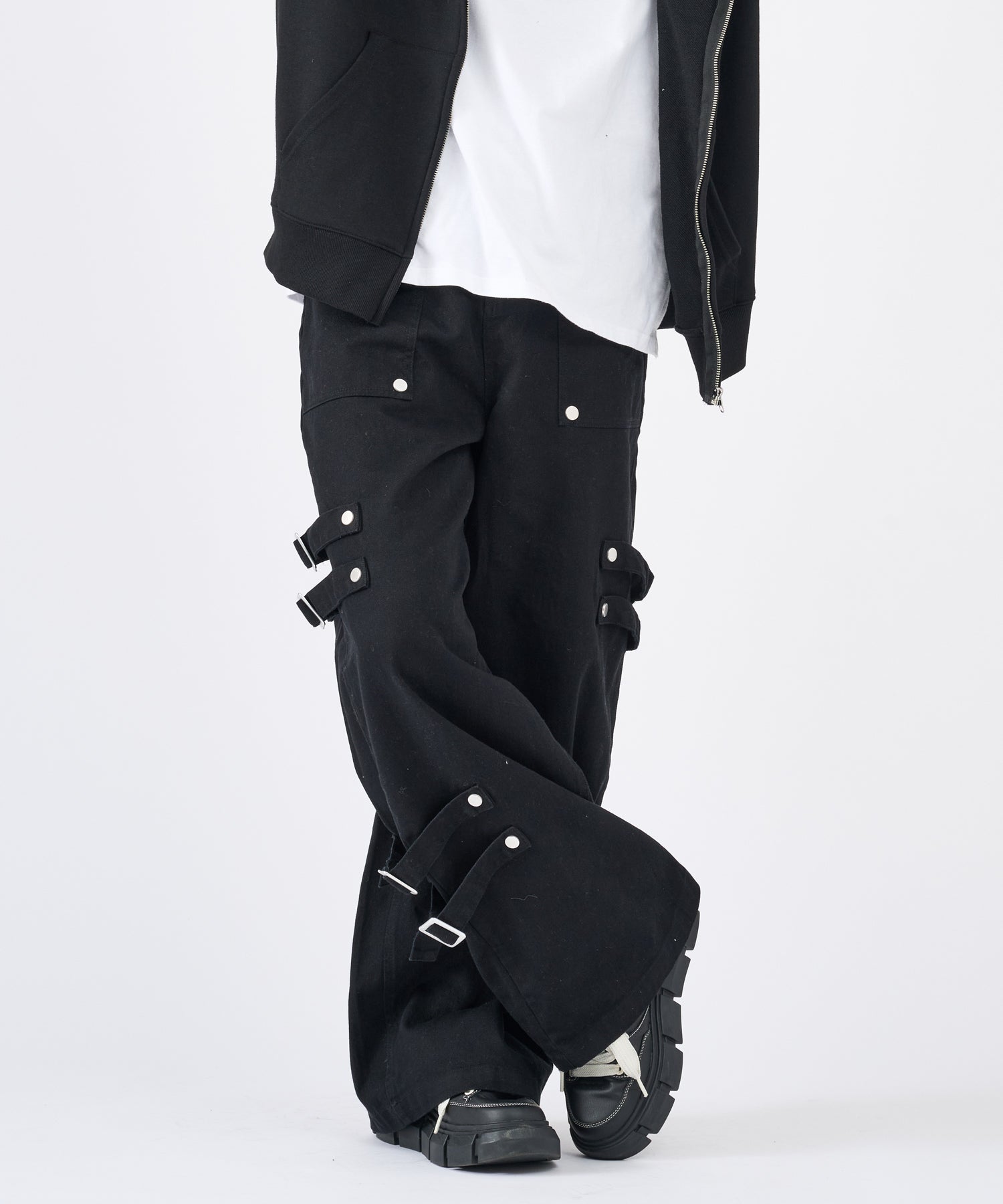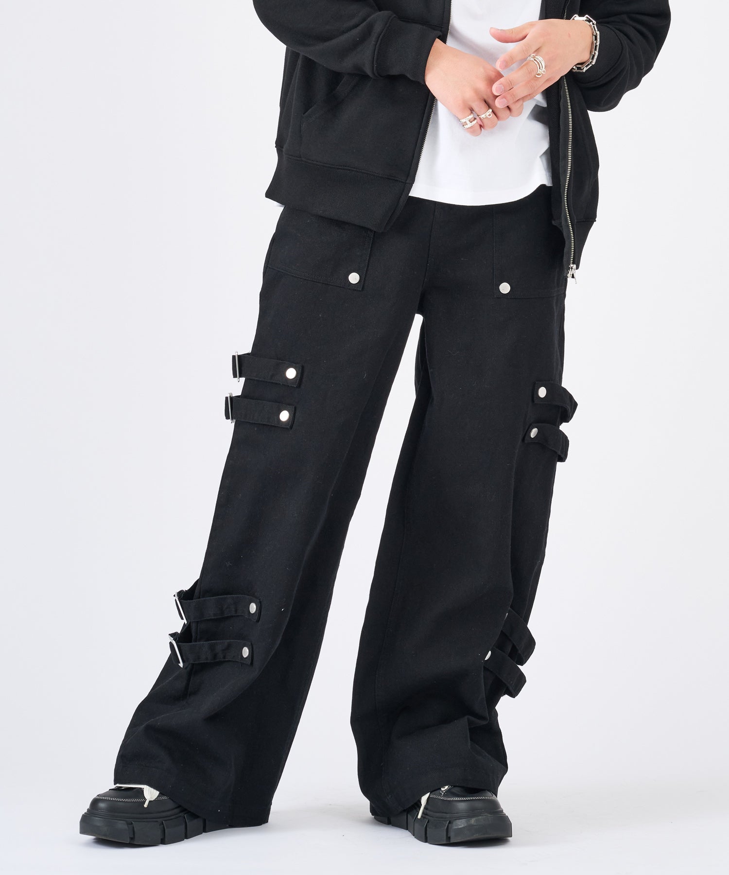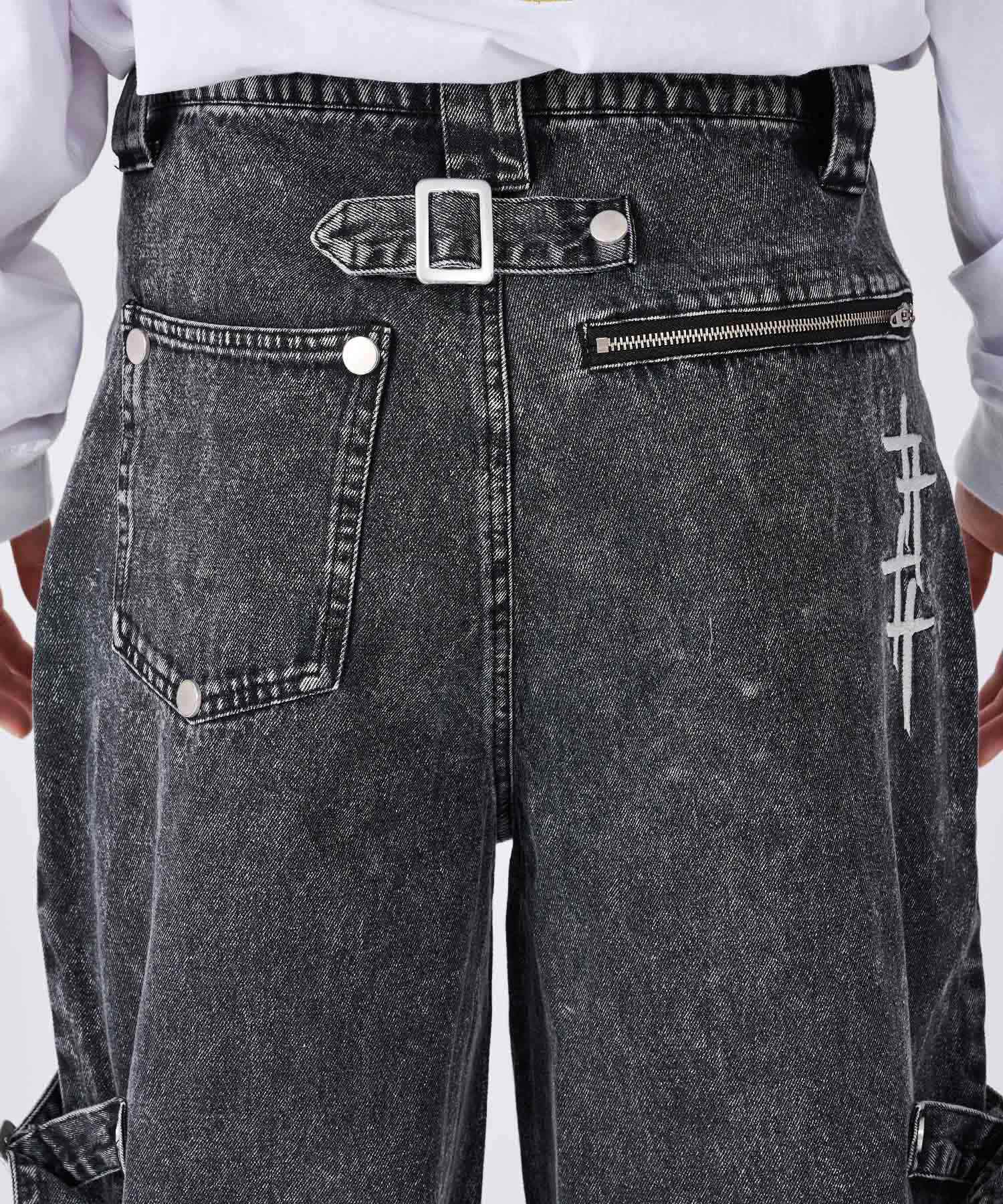 ボンテージ風のベルトデザインが目を引くワイドパンツです☆