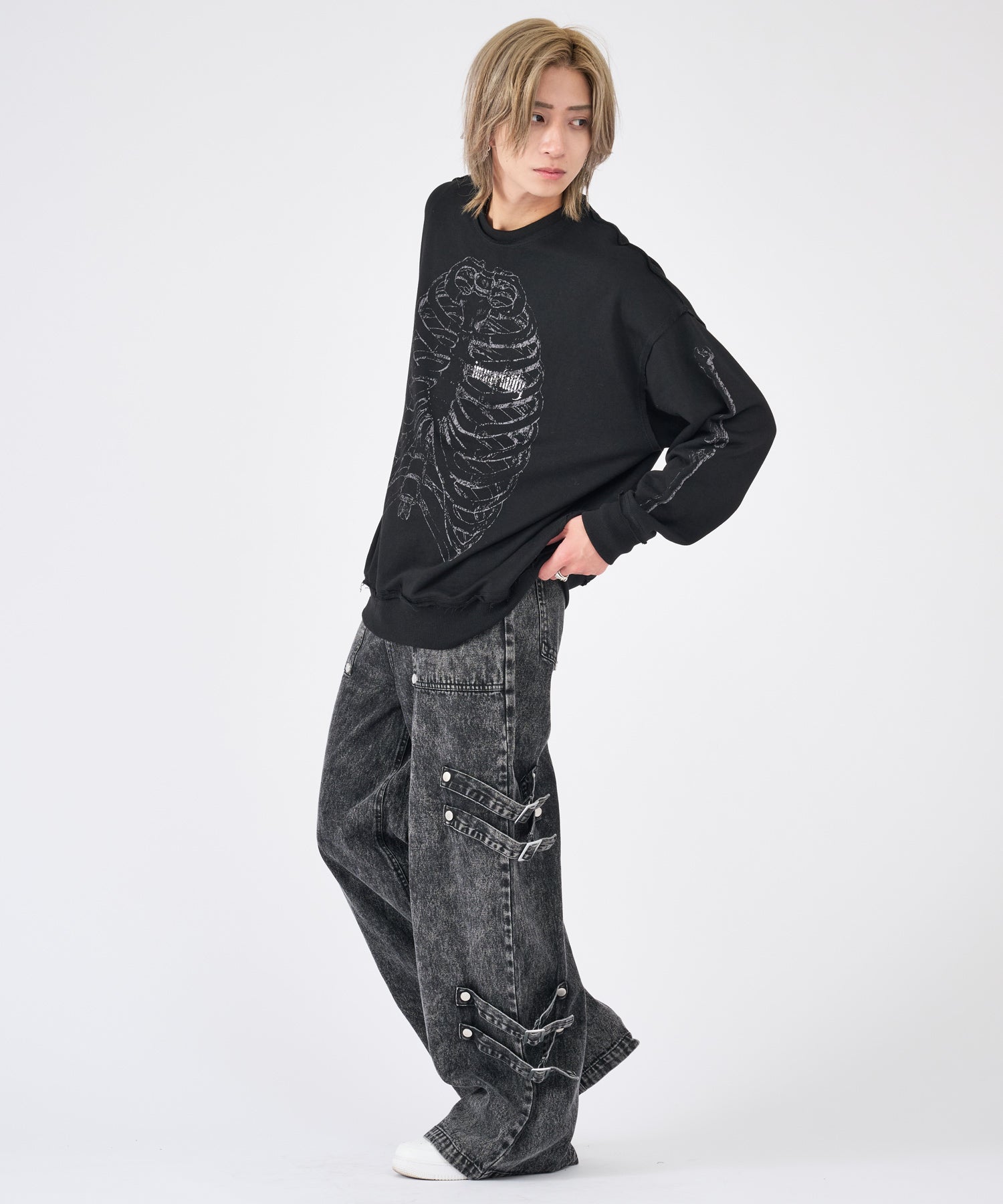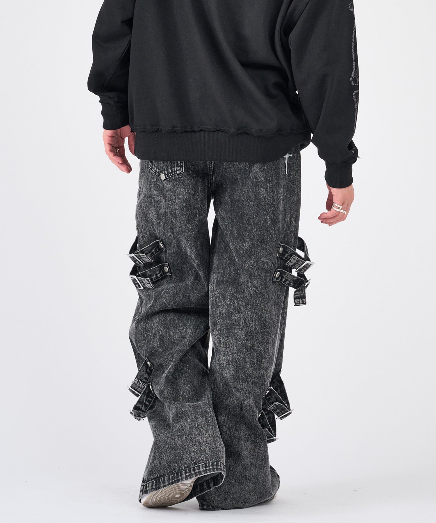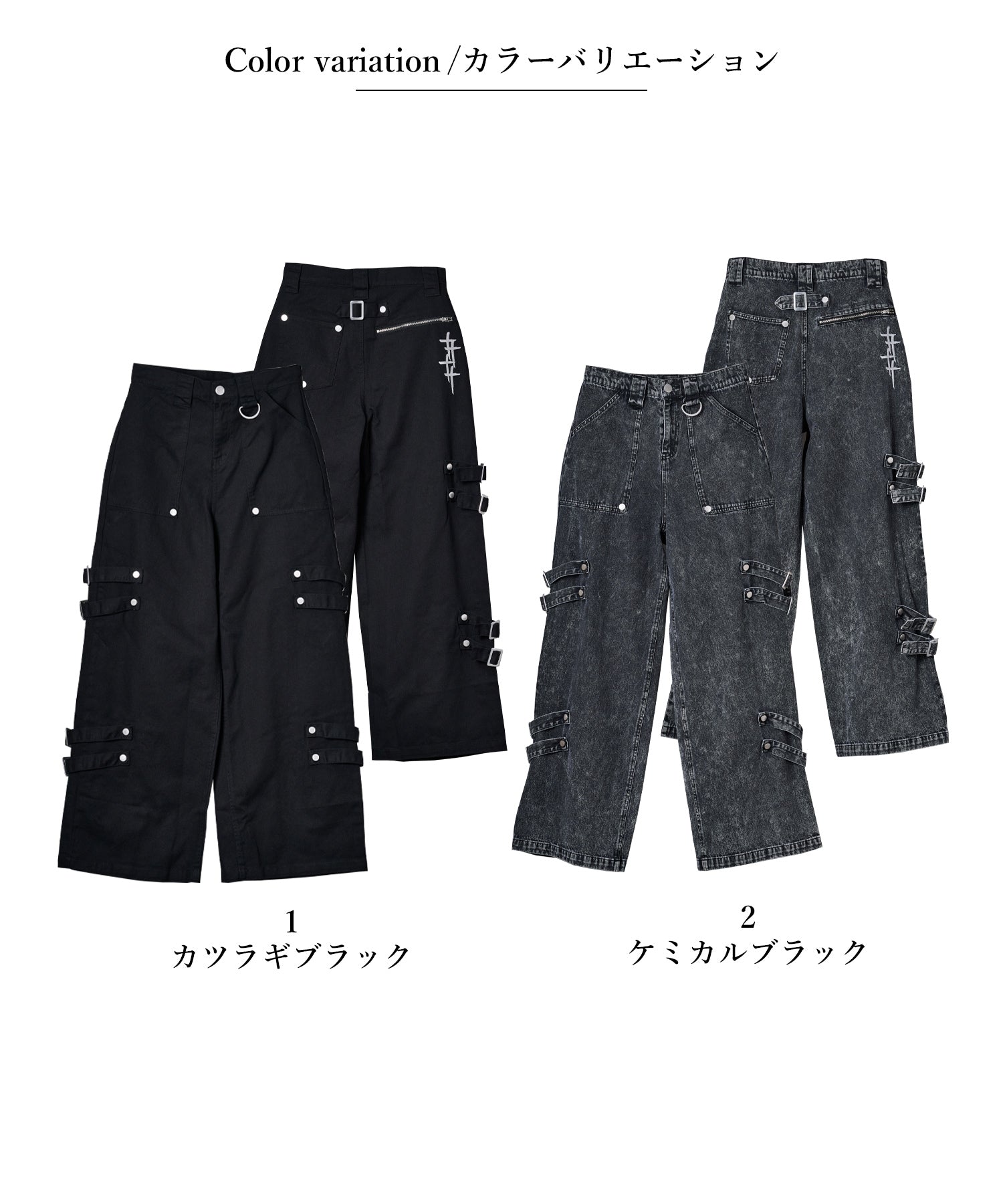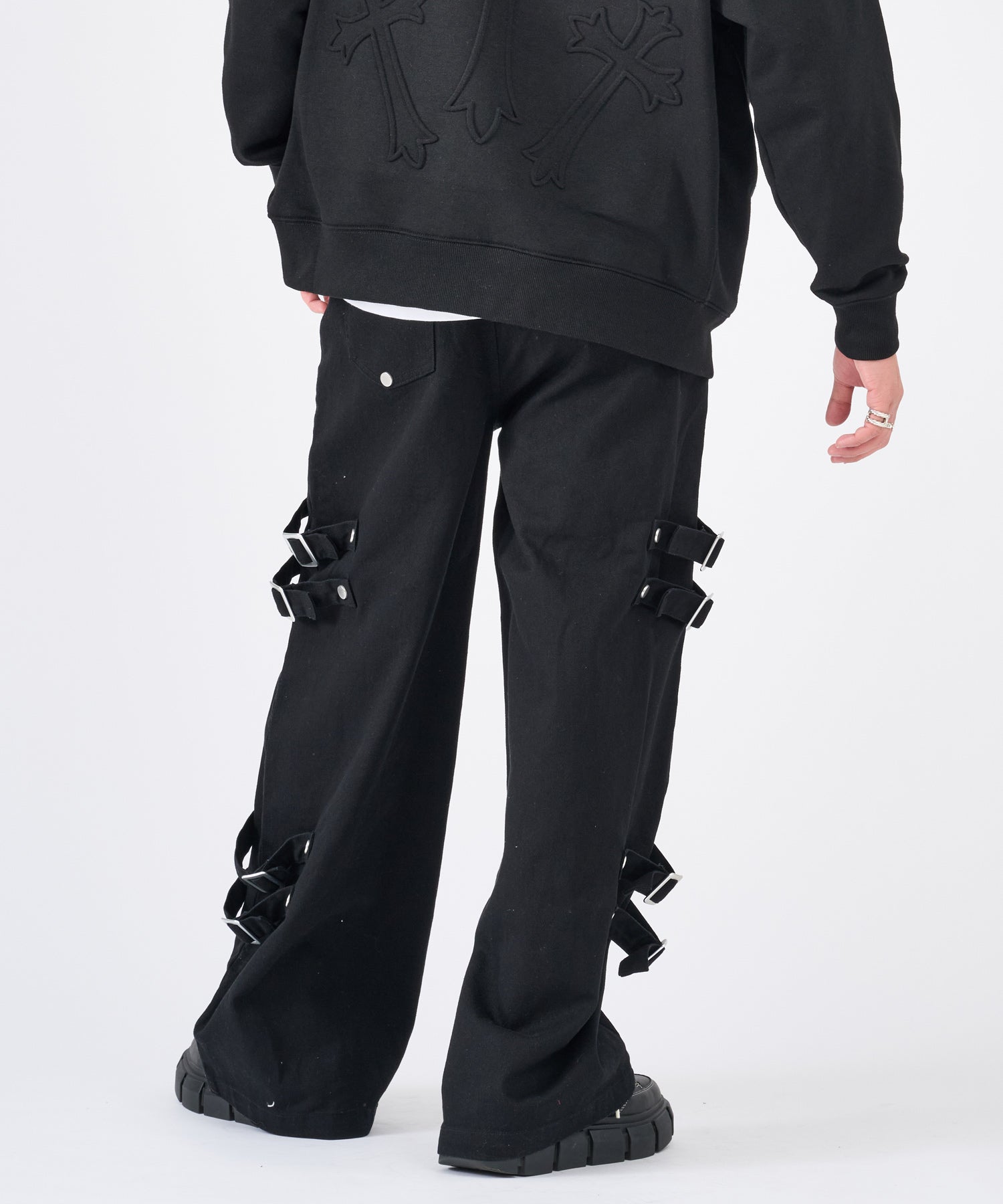 ボンテージ風のベルトデザインが目を引くワイドパンツです☆