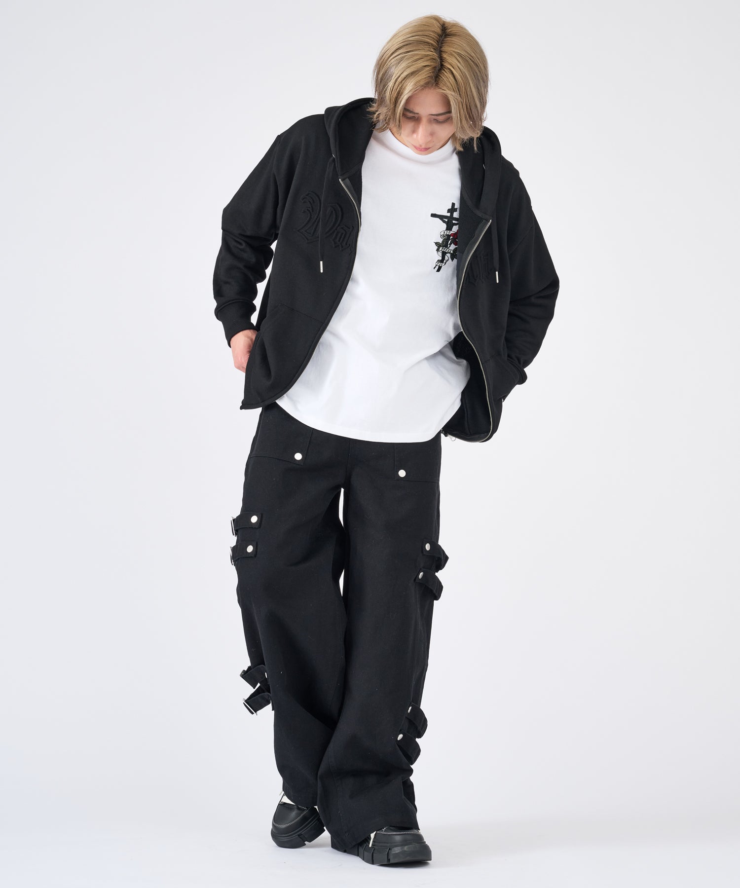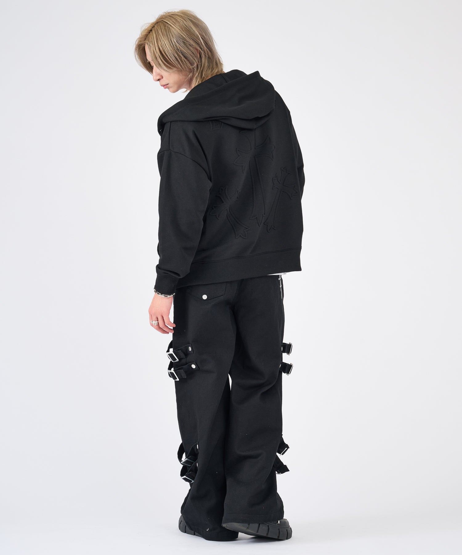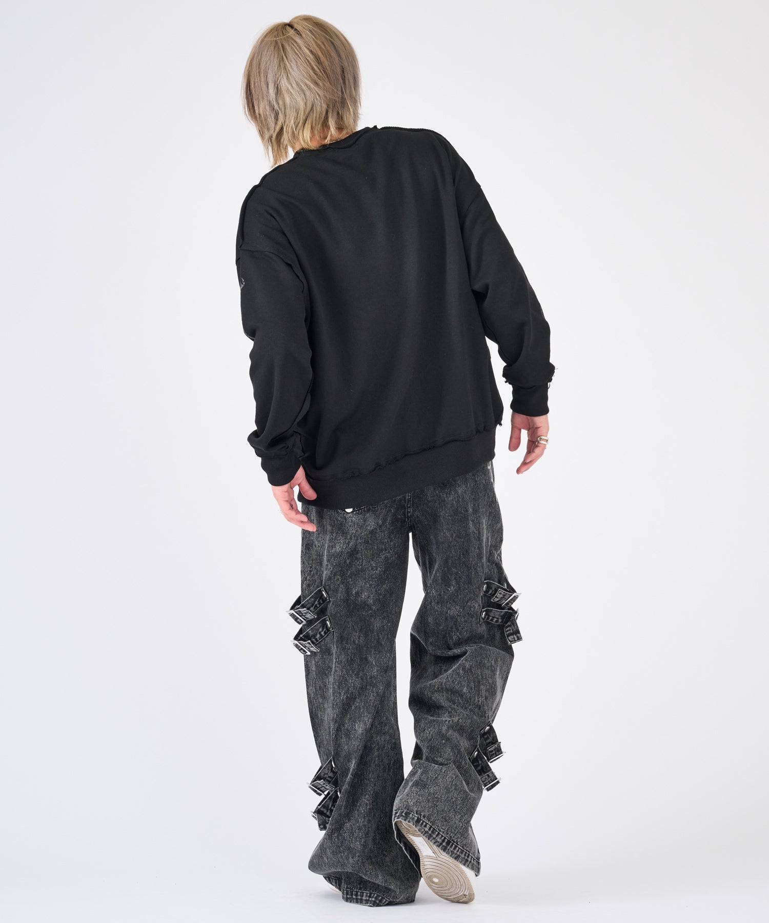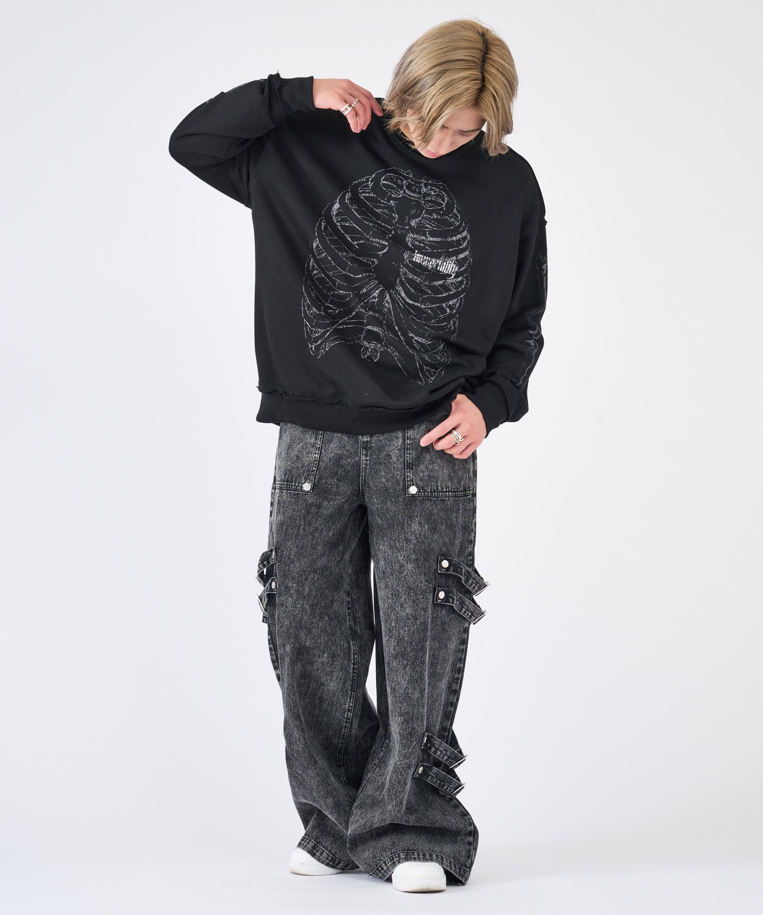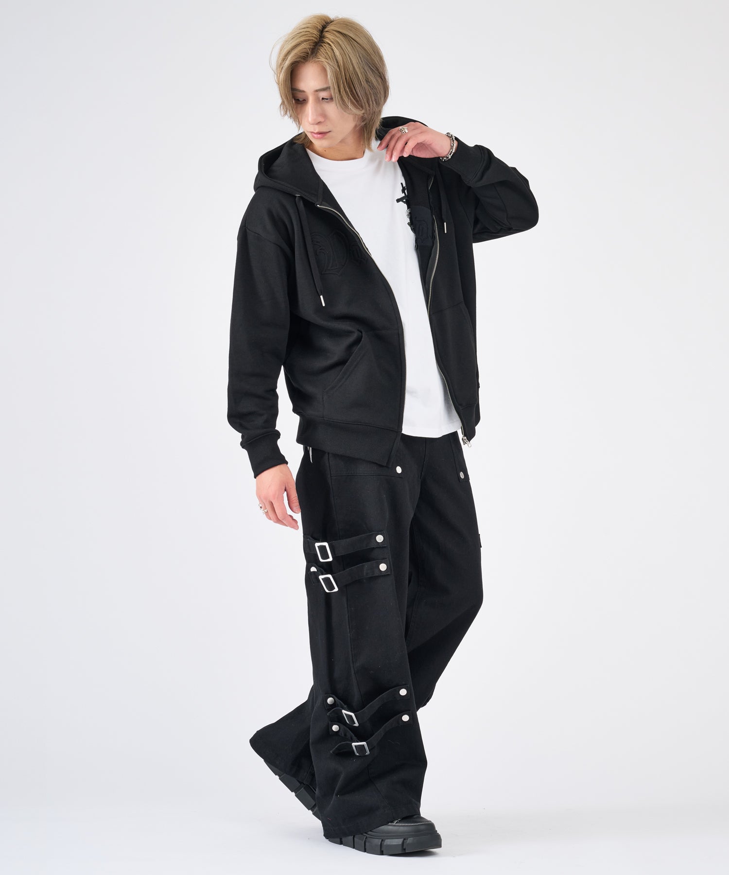 ボンテージ風のベルトデザインが目を引くワイドパンツです☆