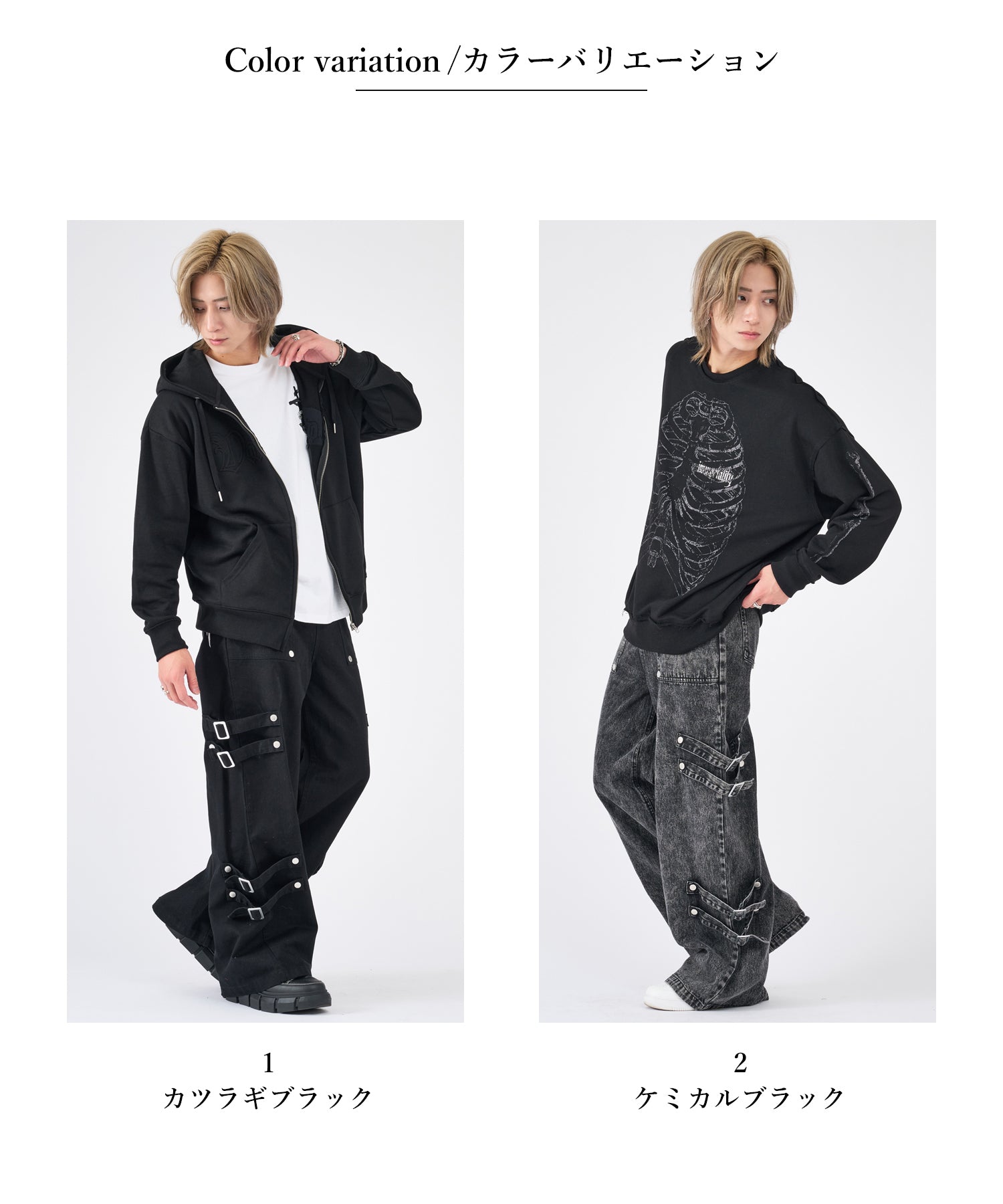 ブラックとケミカルブラックの2色展開で、ブラックは生地の張りがしっかりしたカツラギを使用し、一方はブラックデニムをまだらに色落ちさせたケミカル加工(^^)