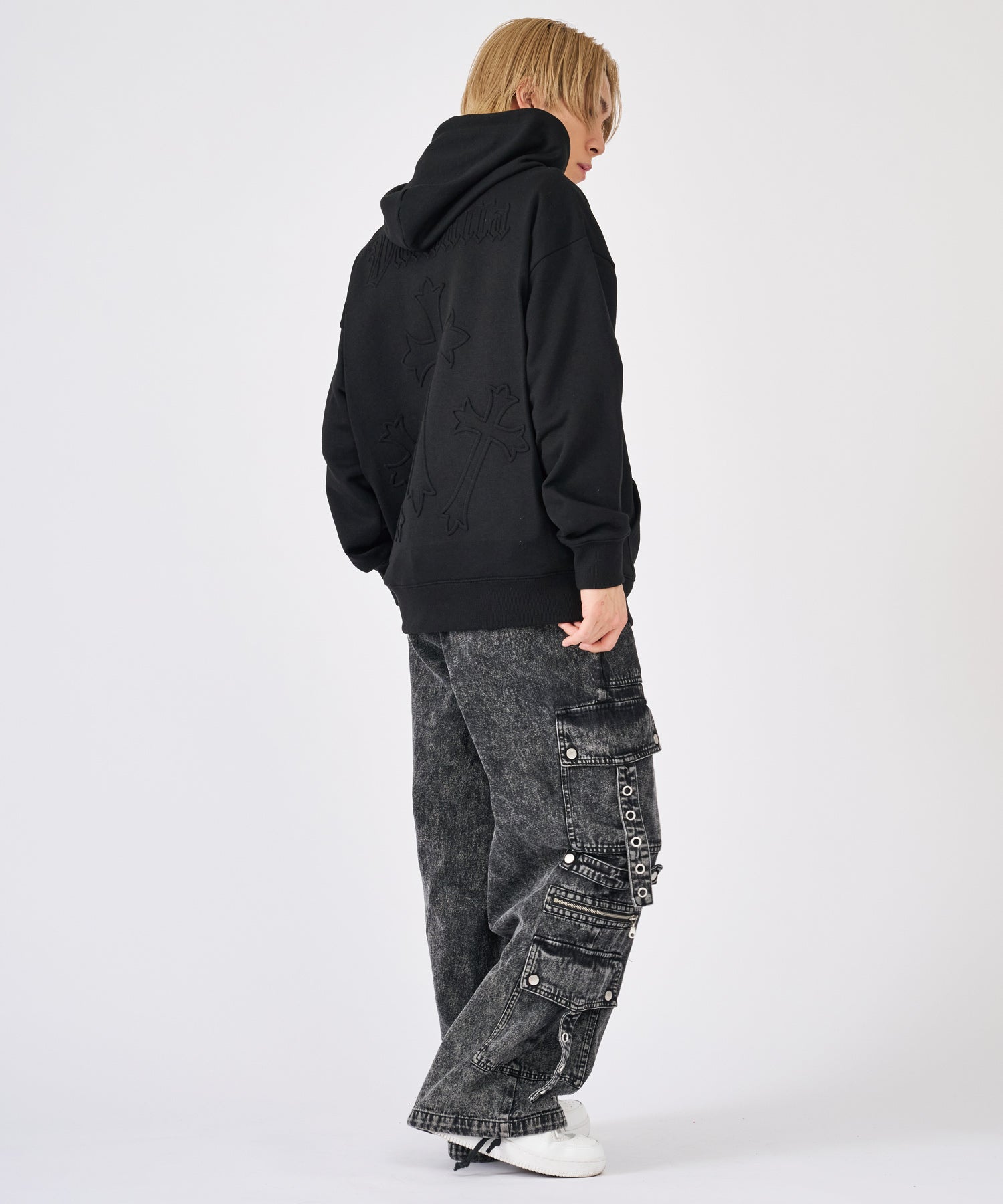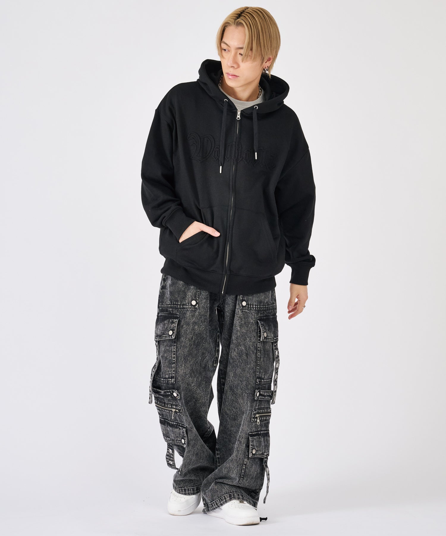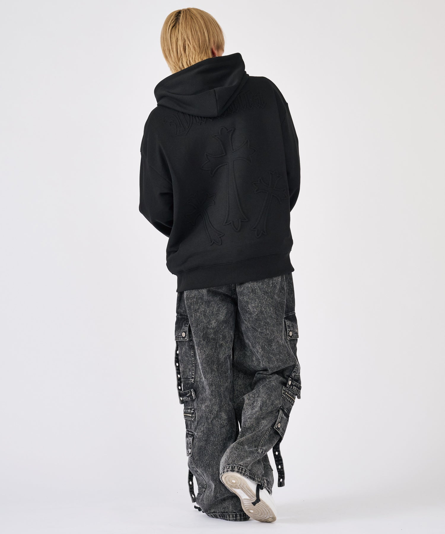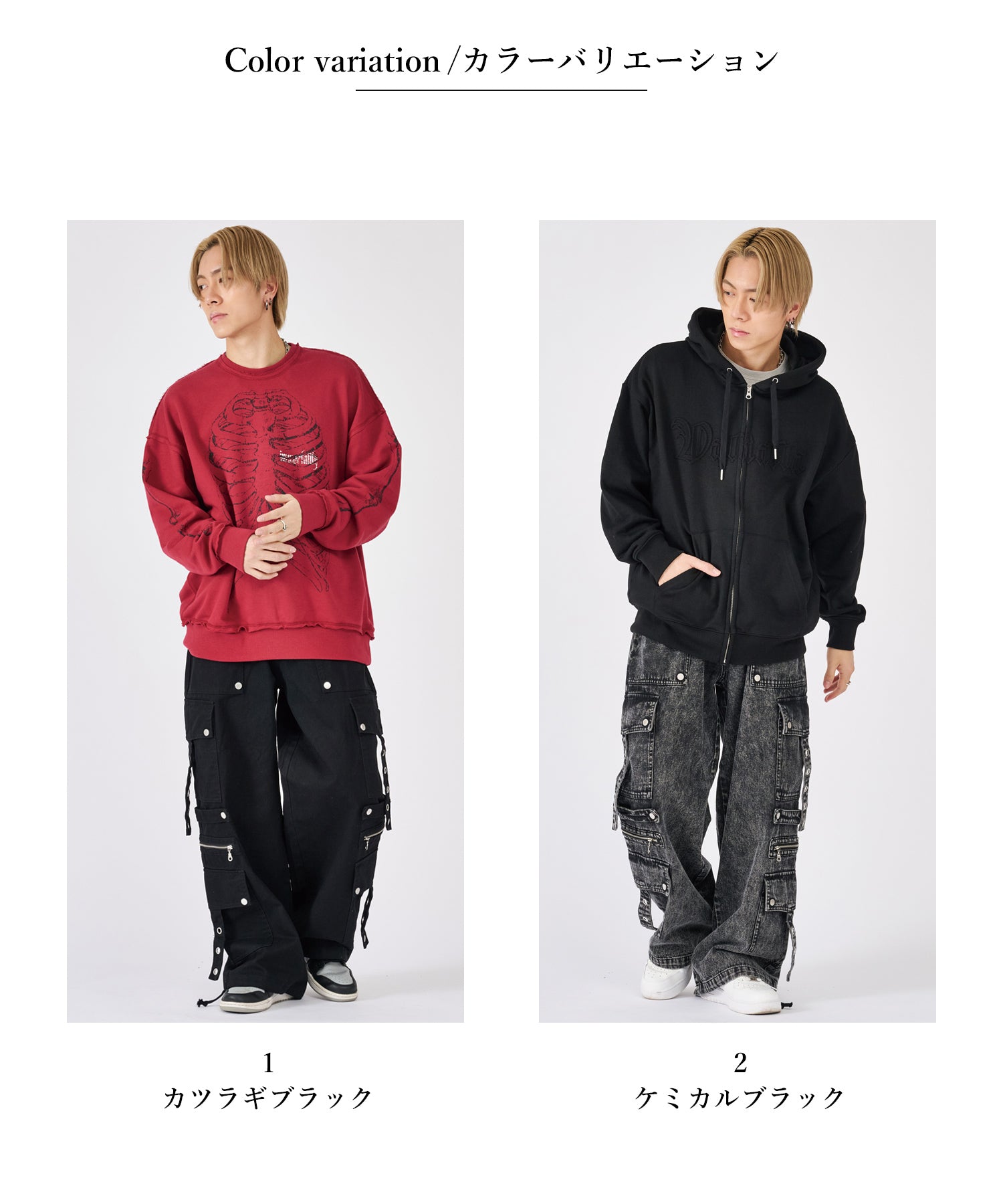 ブラックとケミカルブラックの2色展開で、ブラックは生地の張りがしっかりしたカツラギを使用し、一方はブラックデニムをまだらに色落ちさせたケミカル加工☆