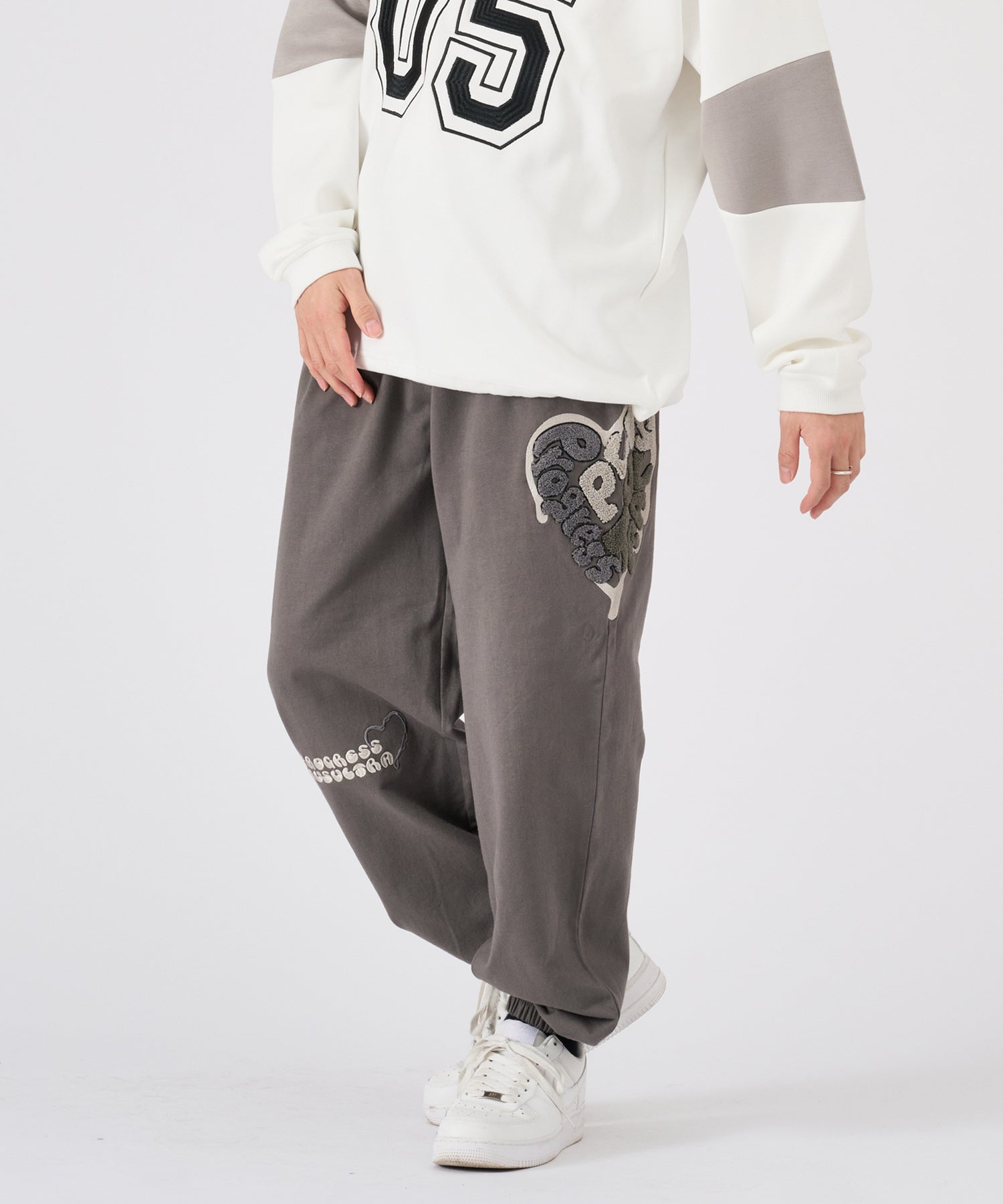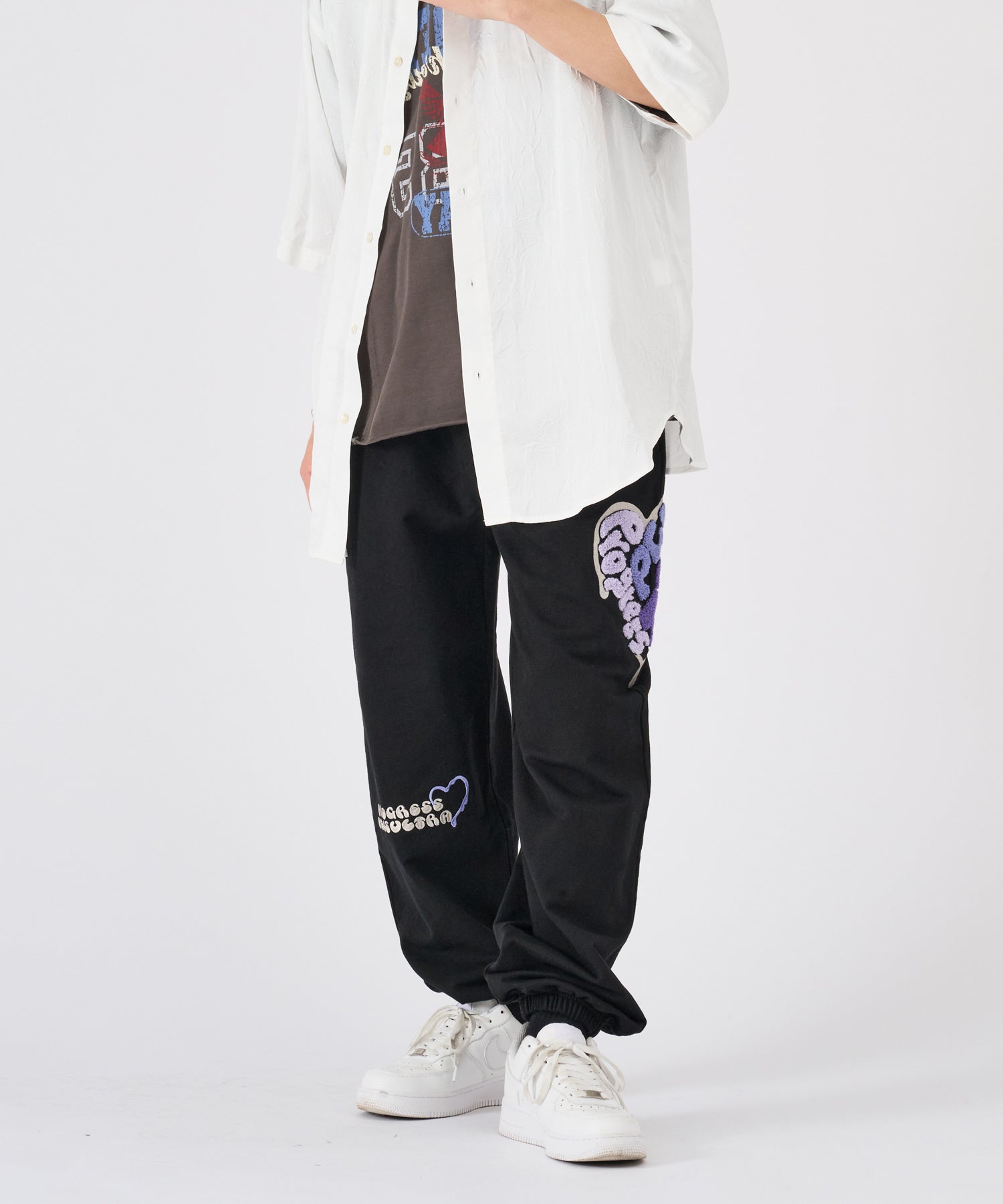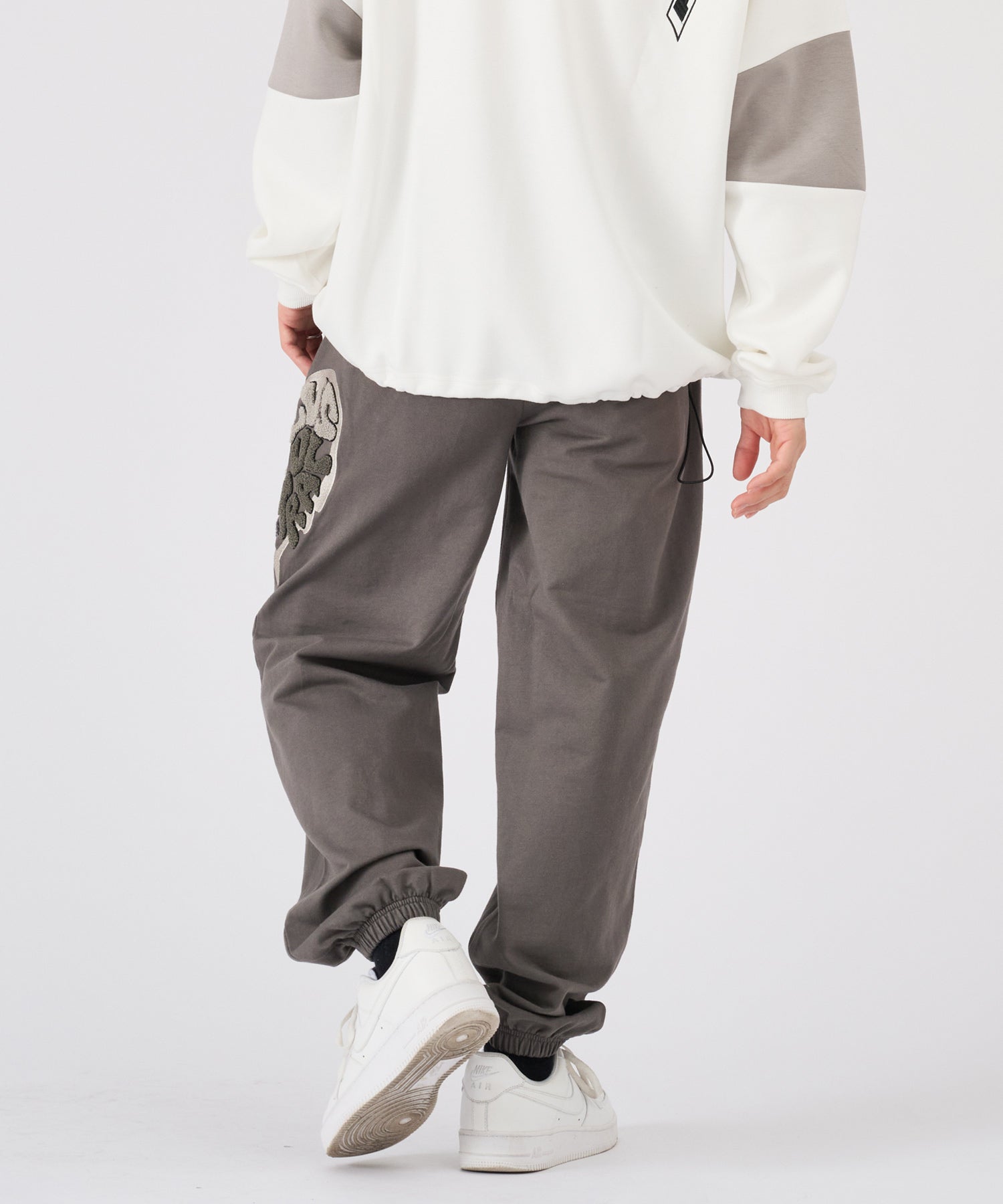 左のポケット下の柄は、ふわふわのサガラ刺繍のロゴをグラデーションカラーでハート柄にかたどったデザインサイドに配置することで前後、サイドからも目に付くアクセントになっています