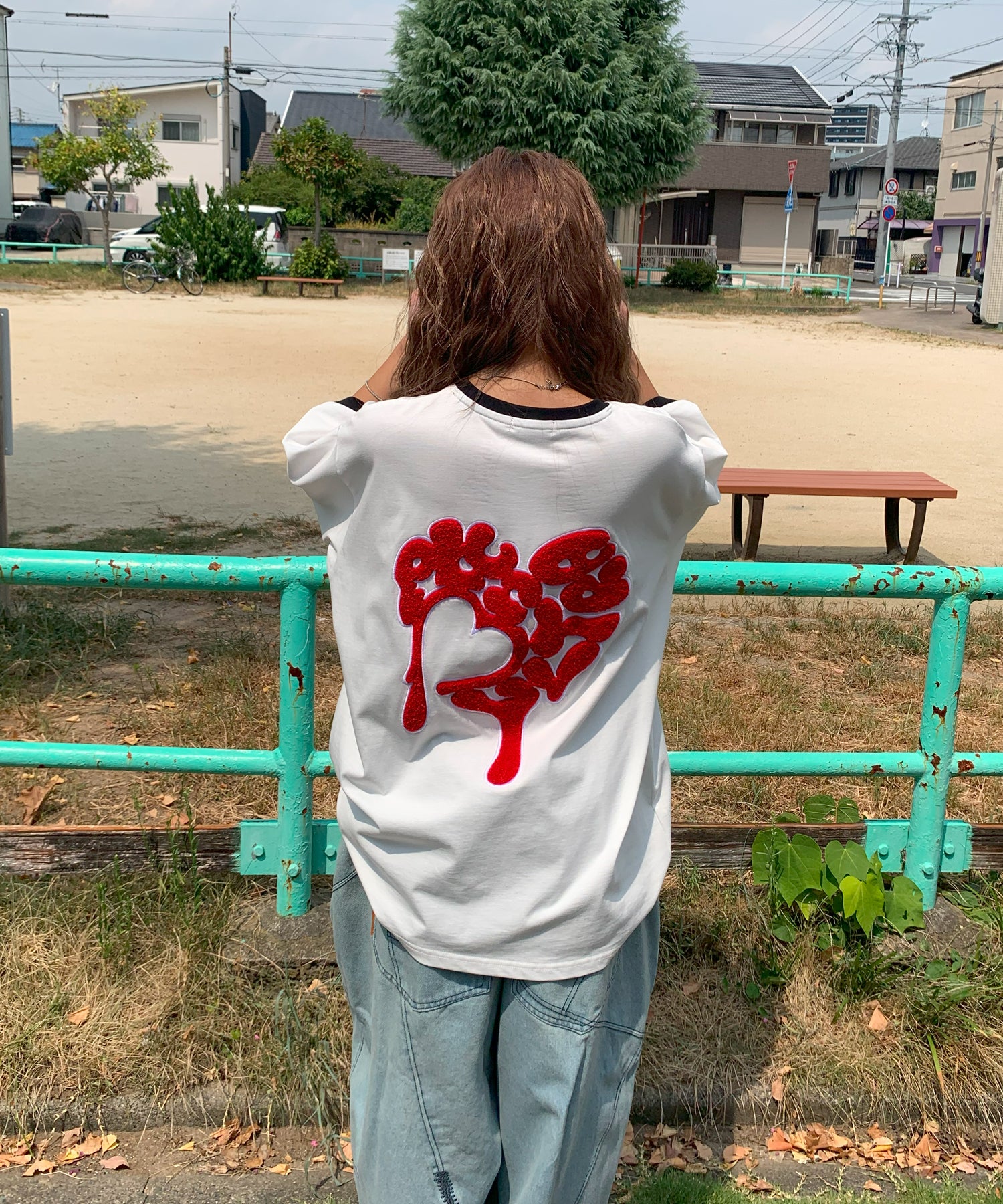 背中はフワフワしたサガラ刺繍のハートが印象的で、胸にも小さなワンポイントの刺繍があるので超かわいい❤
