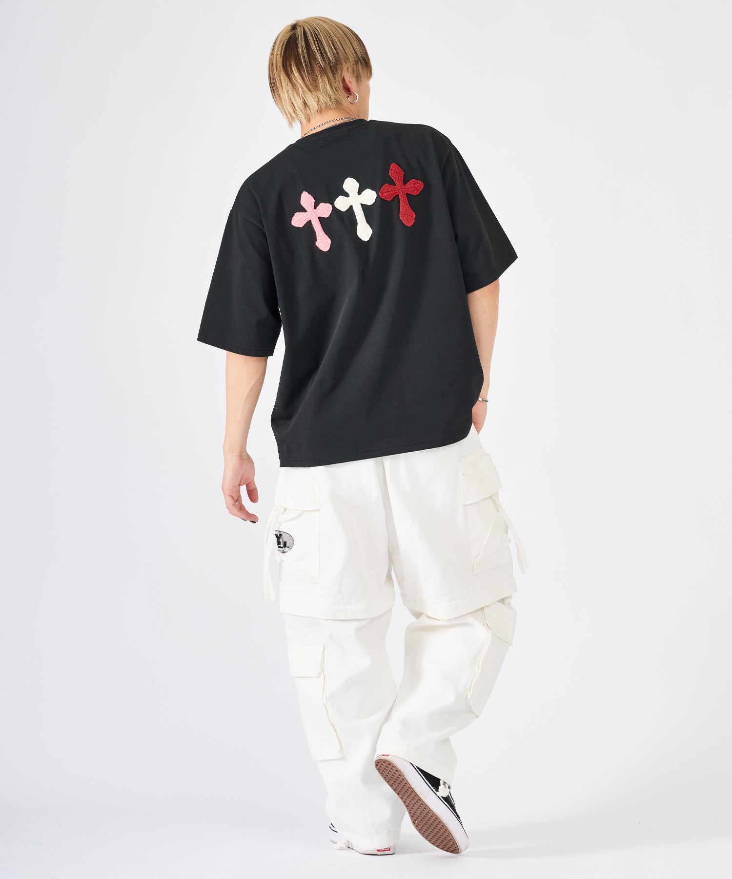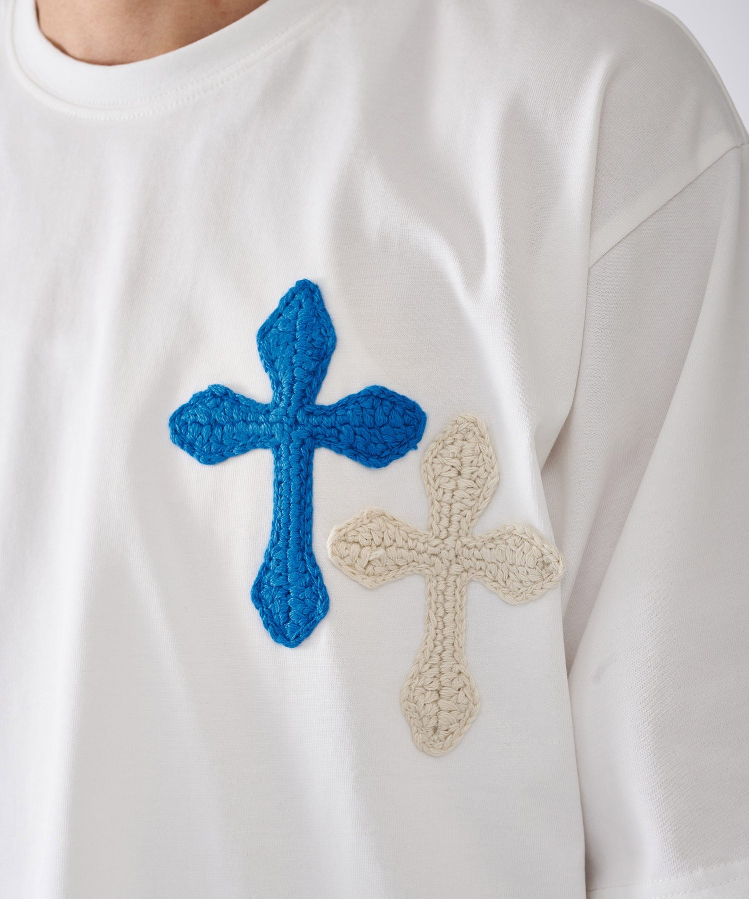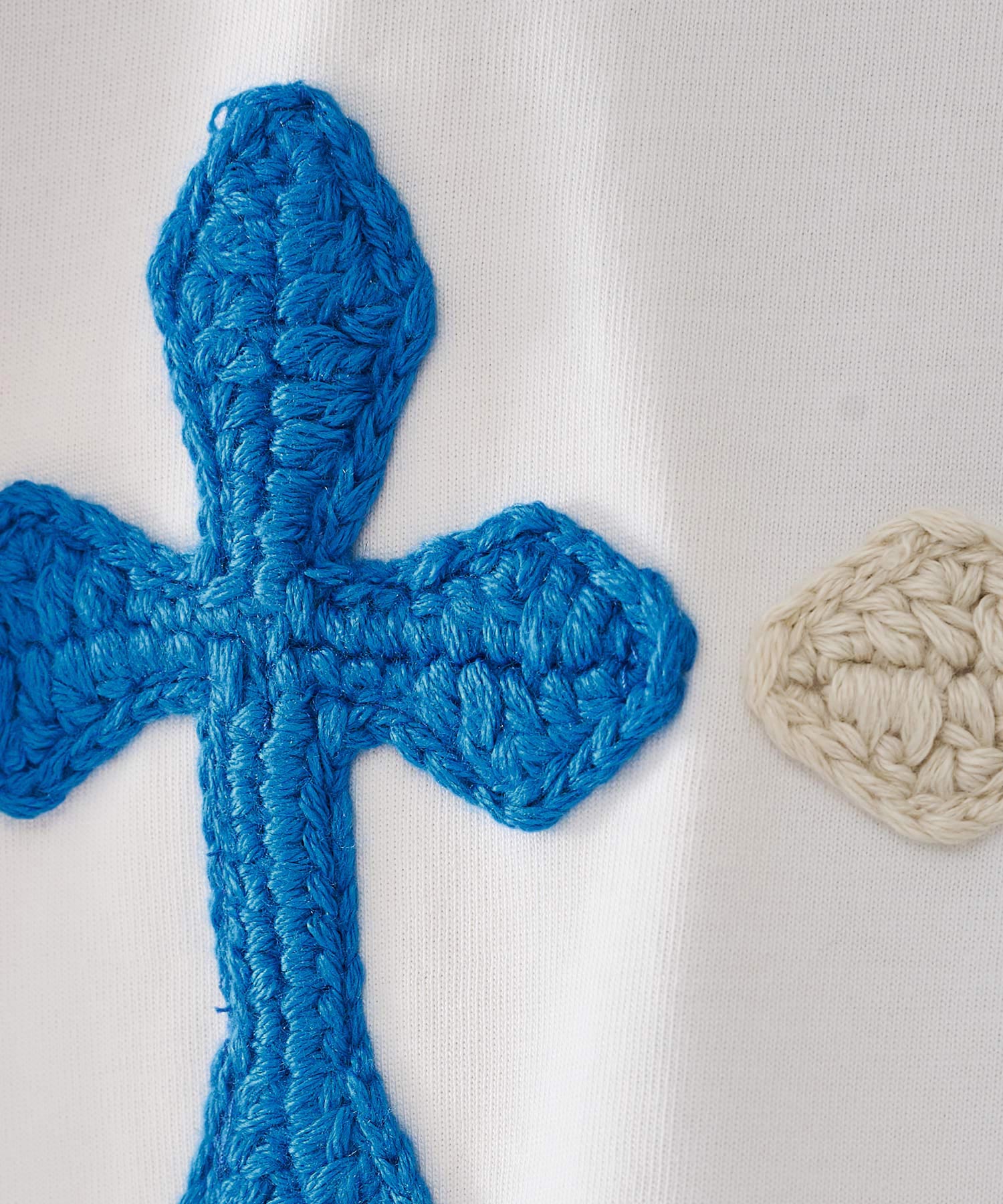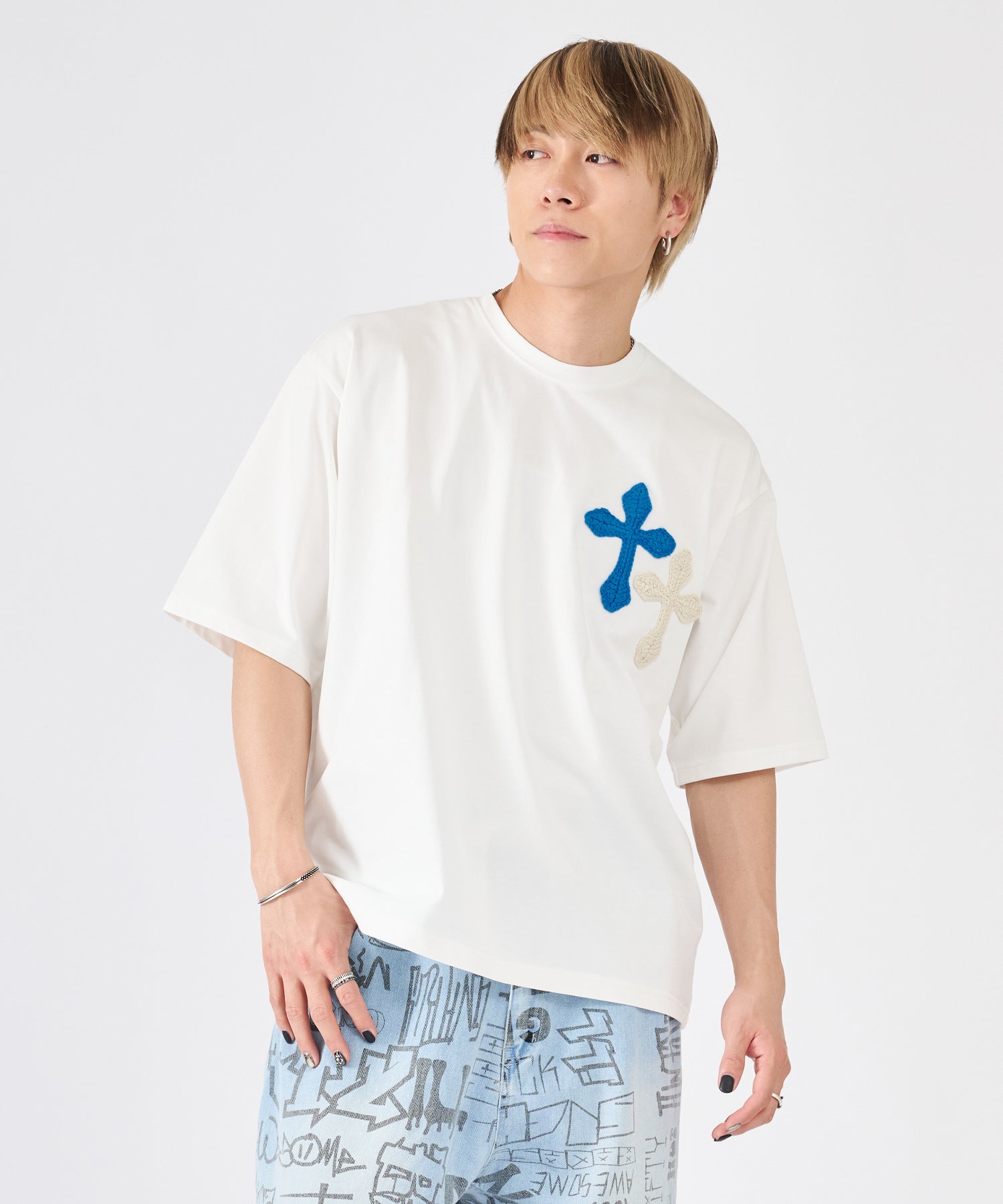 極太の糸を使ったクロスのアップリケ刺繍を胸と背中に配置することで存在感抜群のアイテム☆