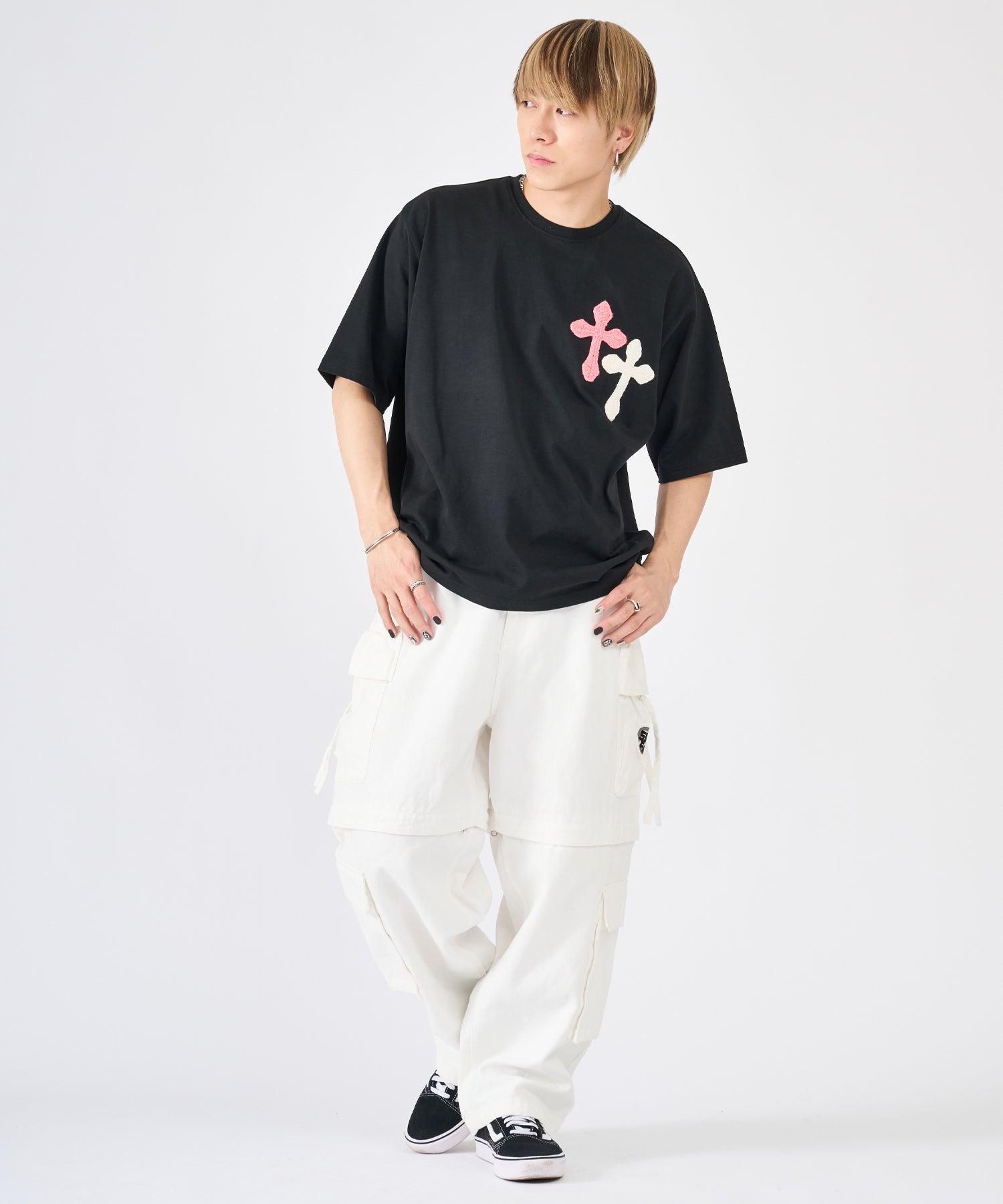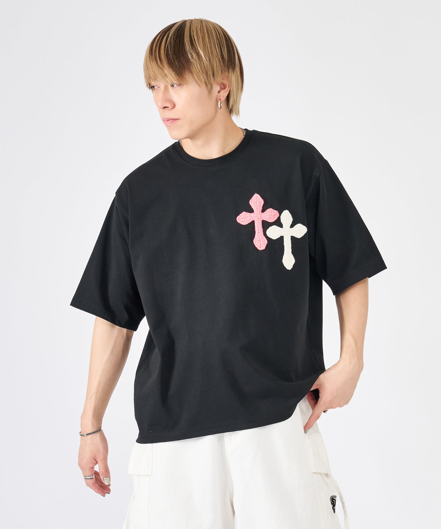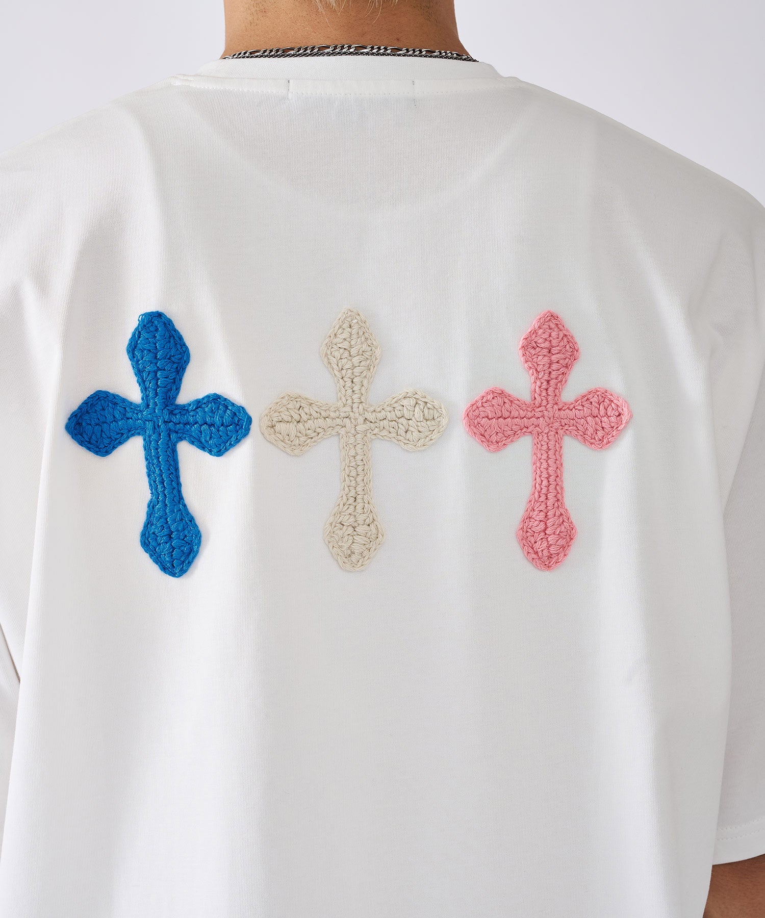 極太の糸を使ったクロスのアップリケ刺繍を胸と背中に配置することで存在感抜群のアイテム☆