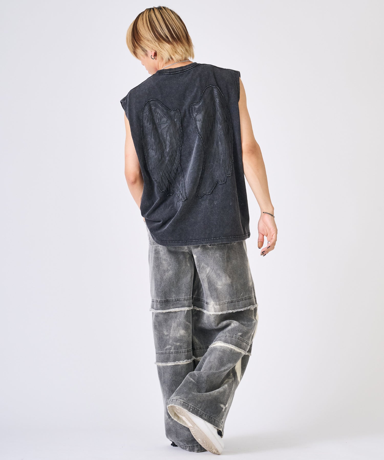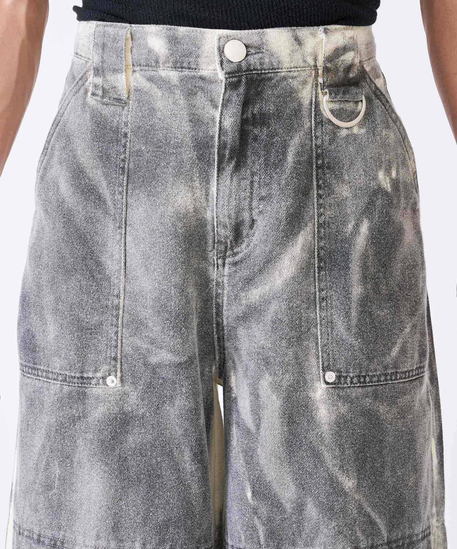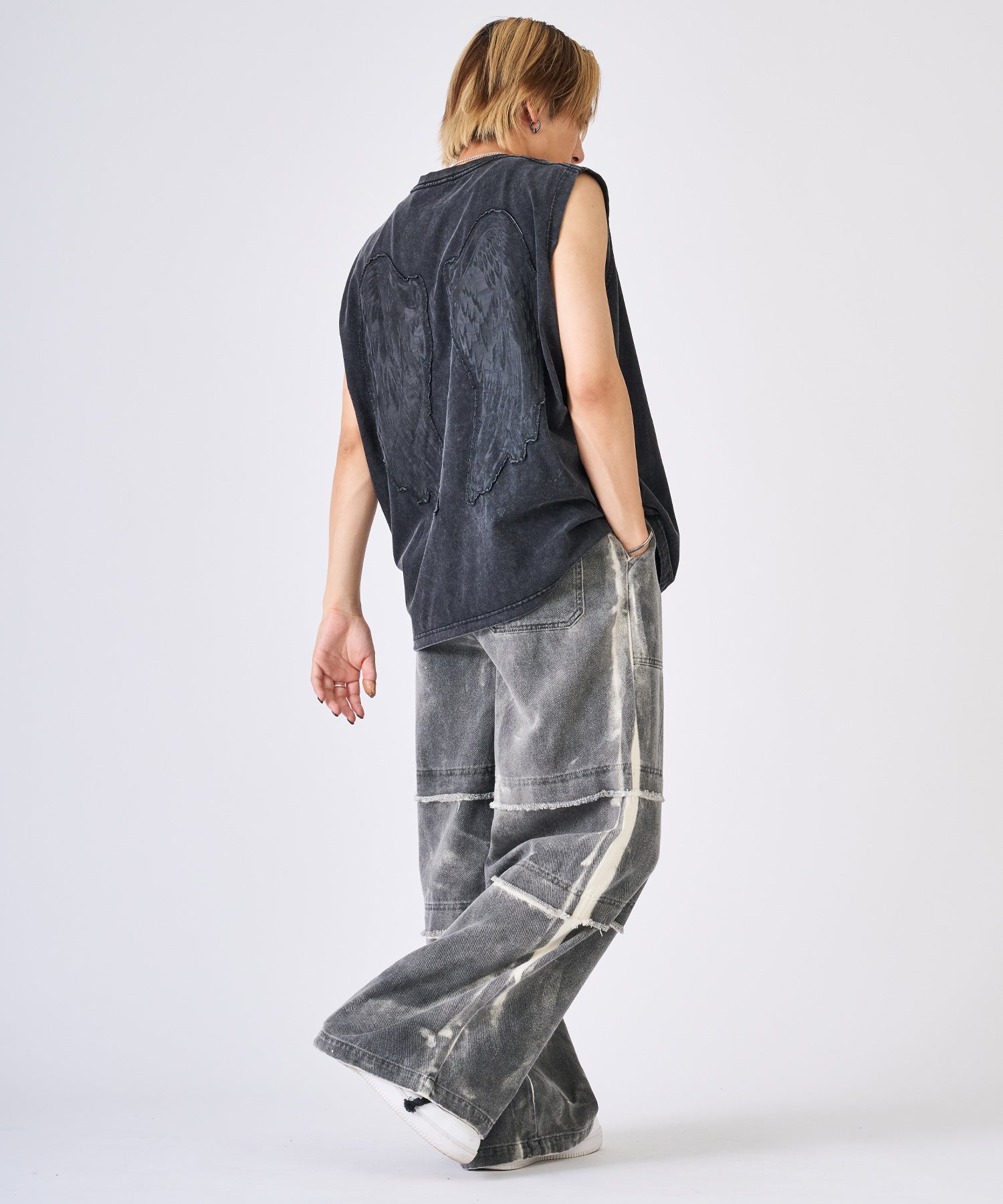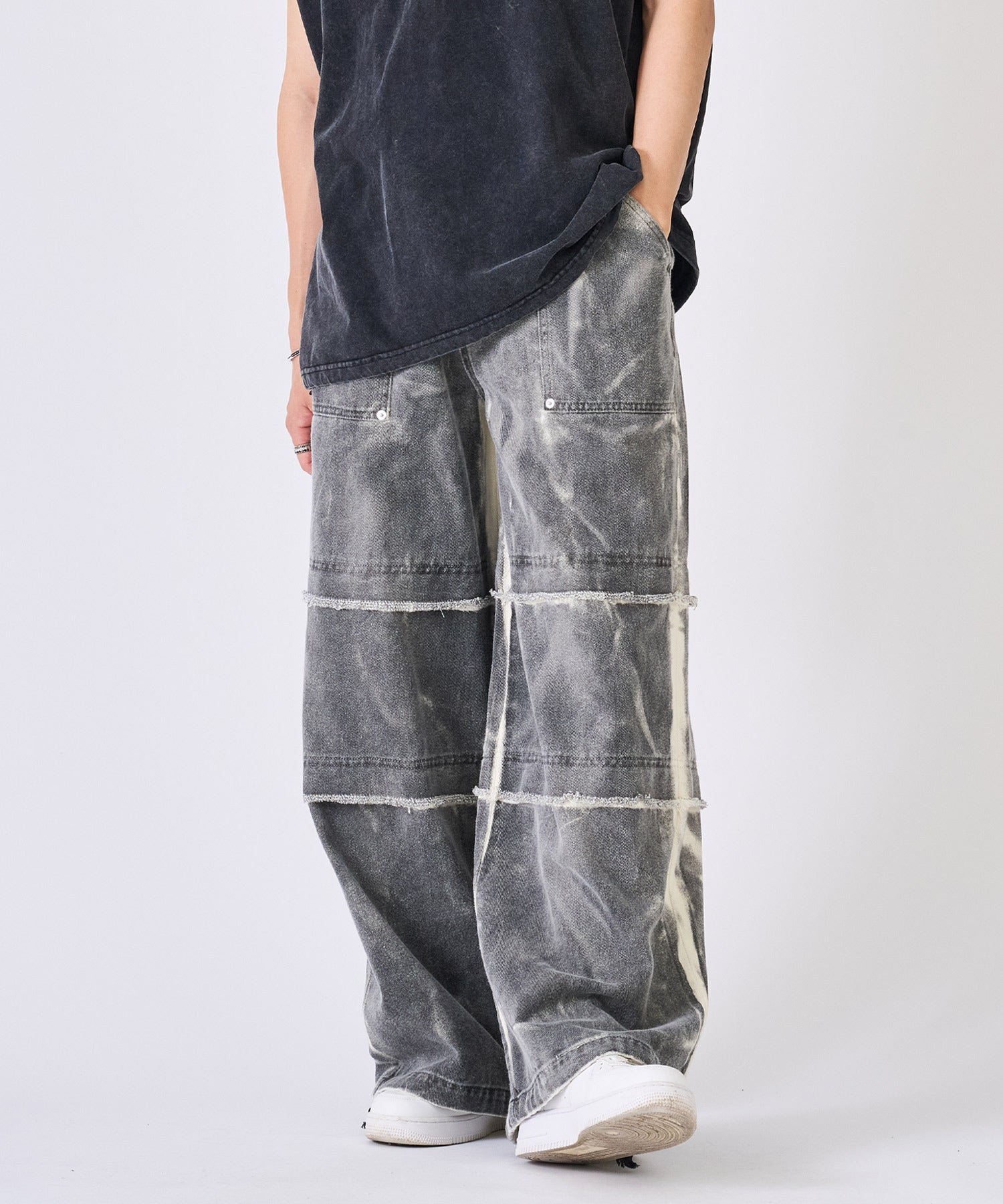 膝の部分は敢えて縫い繋いだデザインで、縫いしろ部分がはみ出してフリンジ仕上げになっているのも特徴的☆