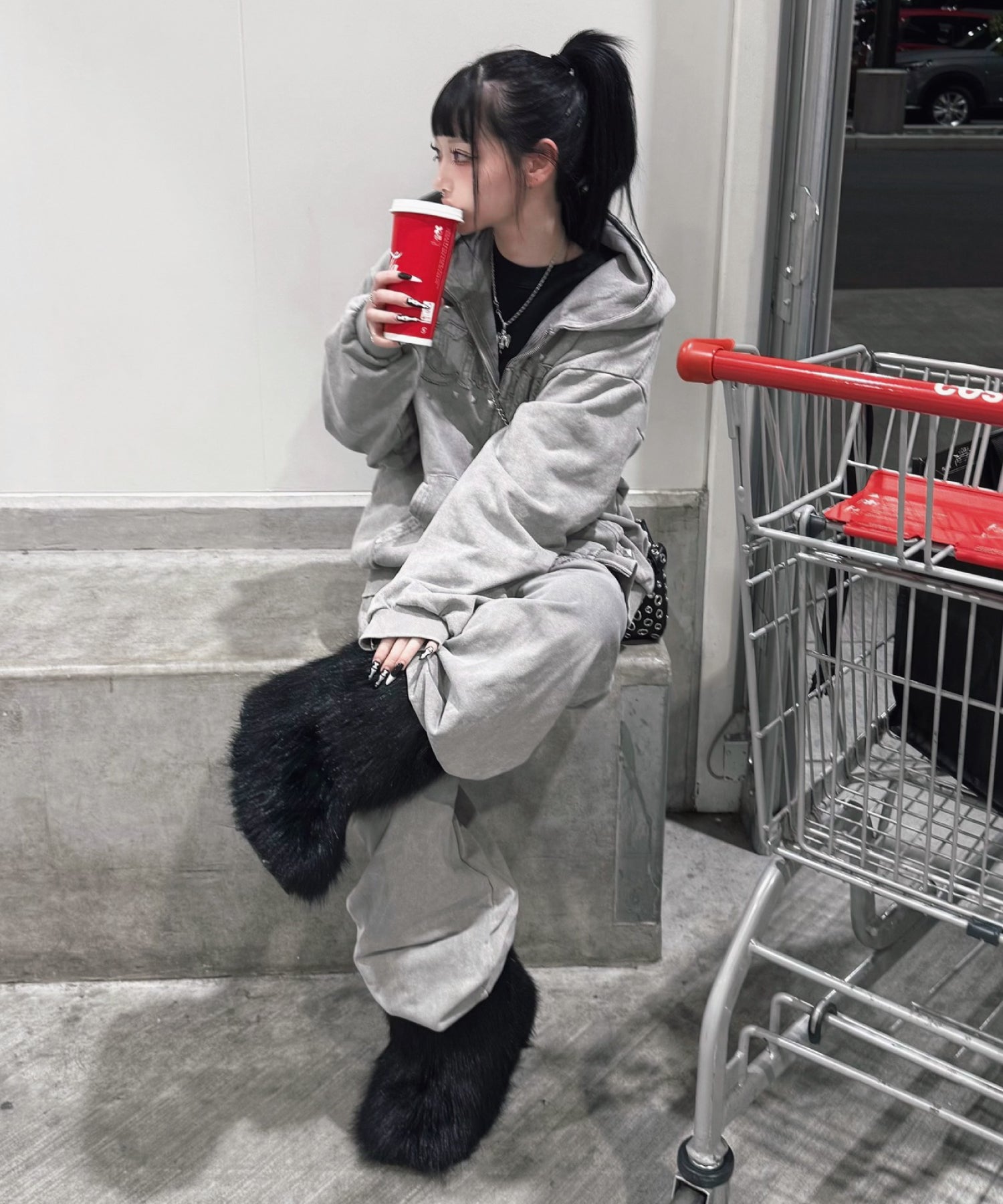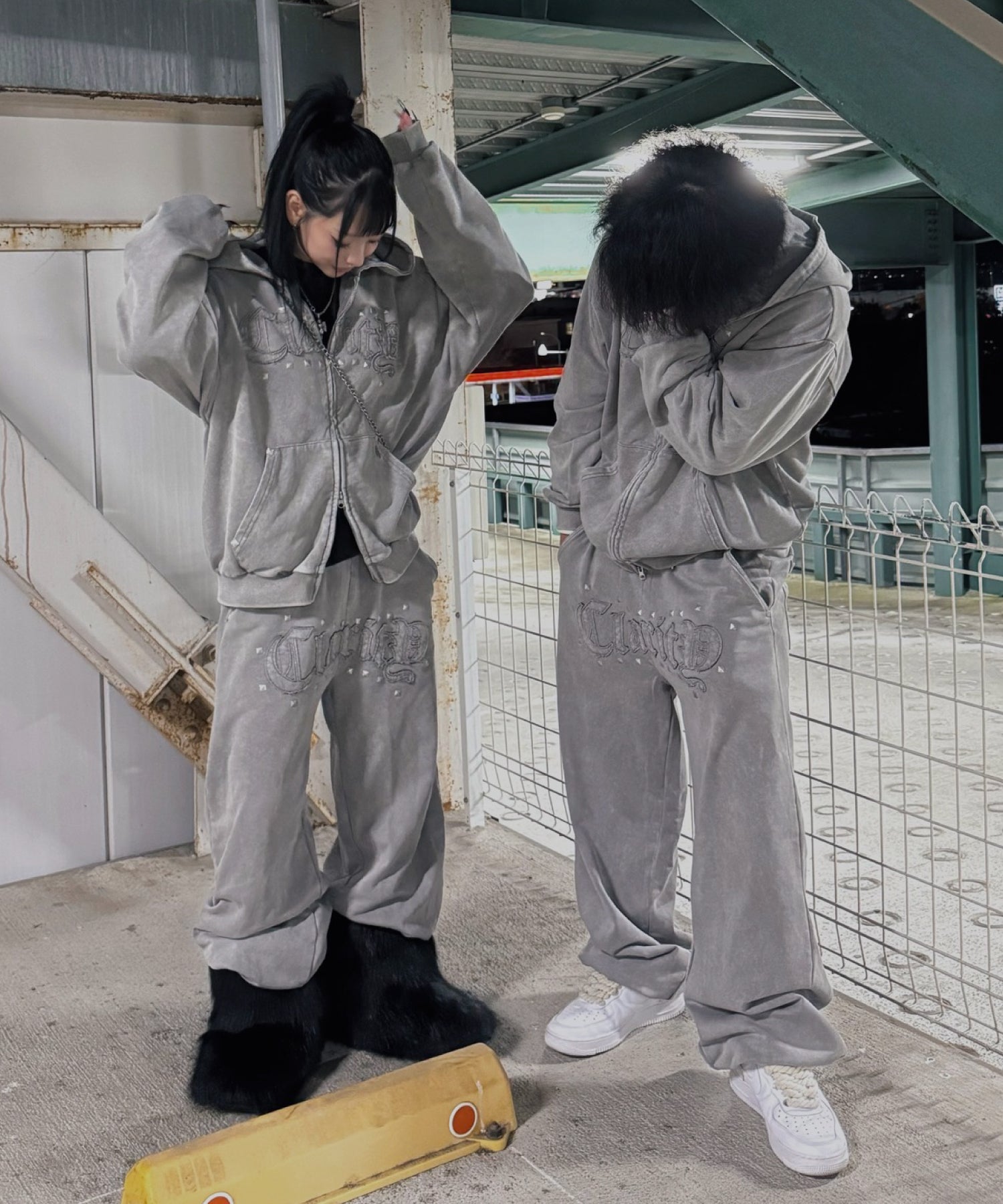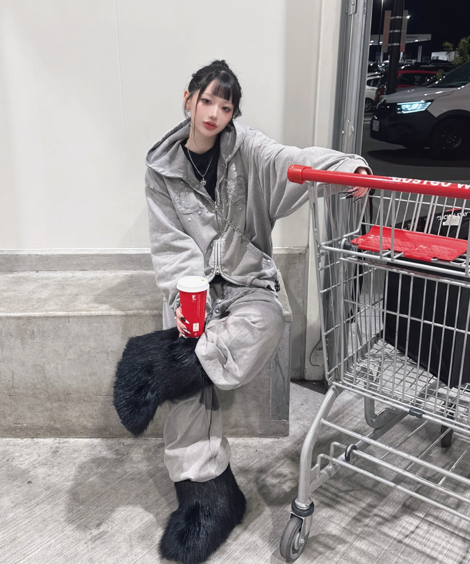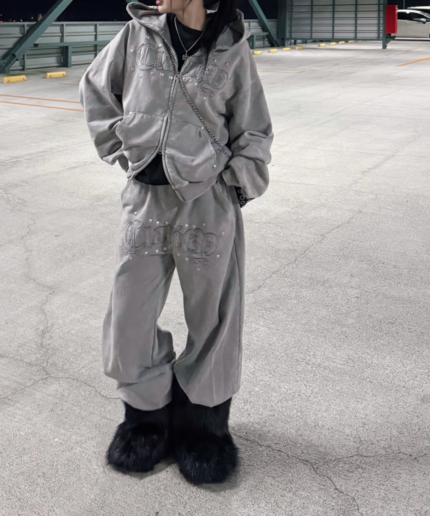 アップリケが可愛いZIPパーカーとスウェットパンツのセットアップ❤