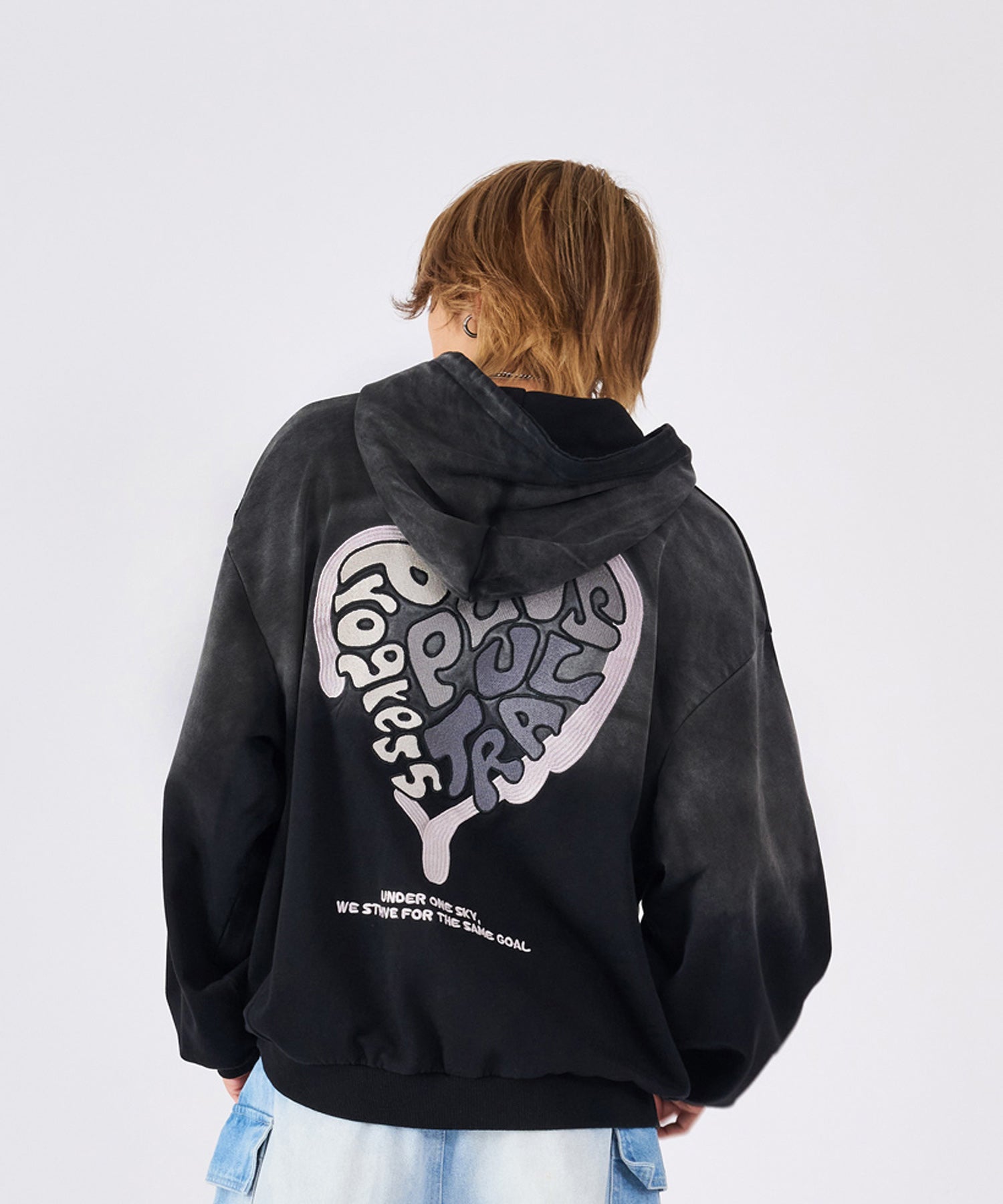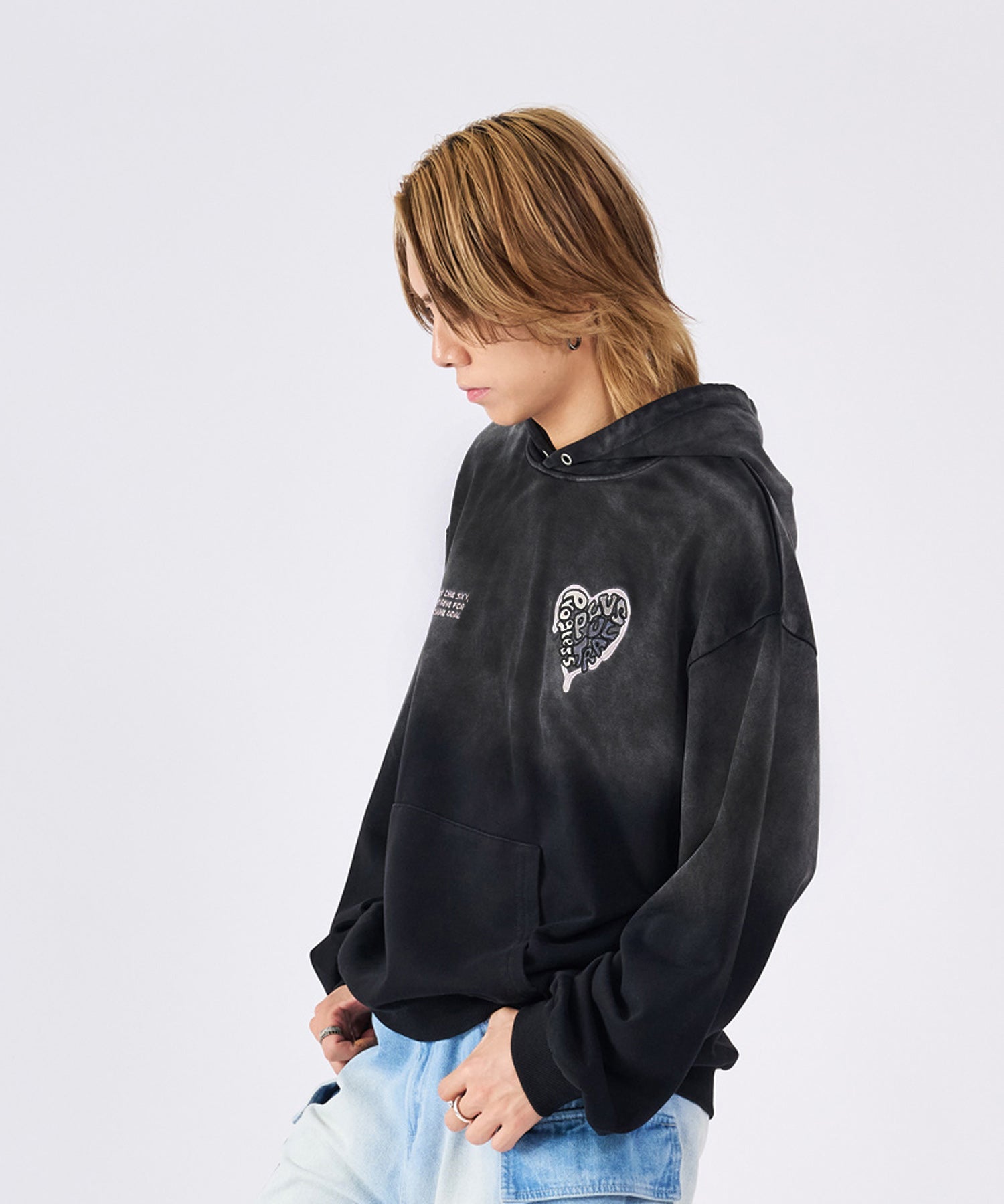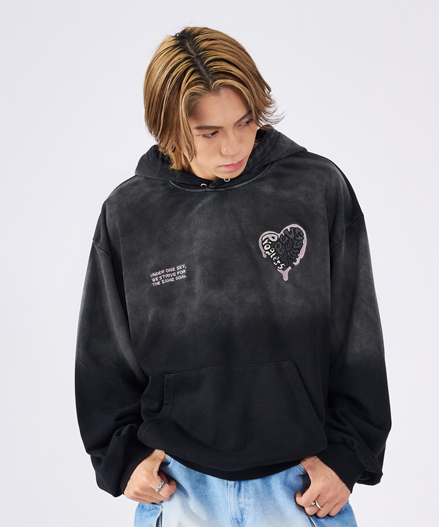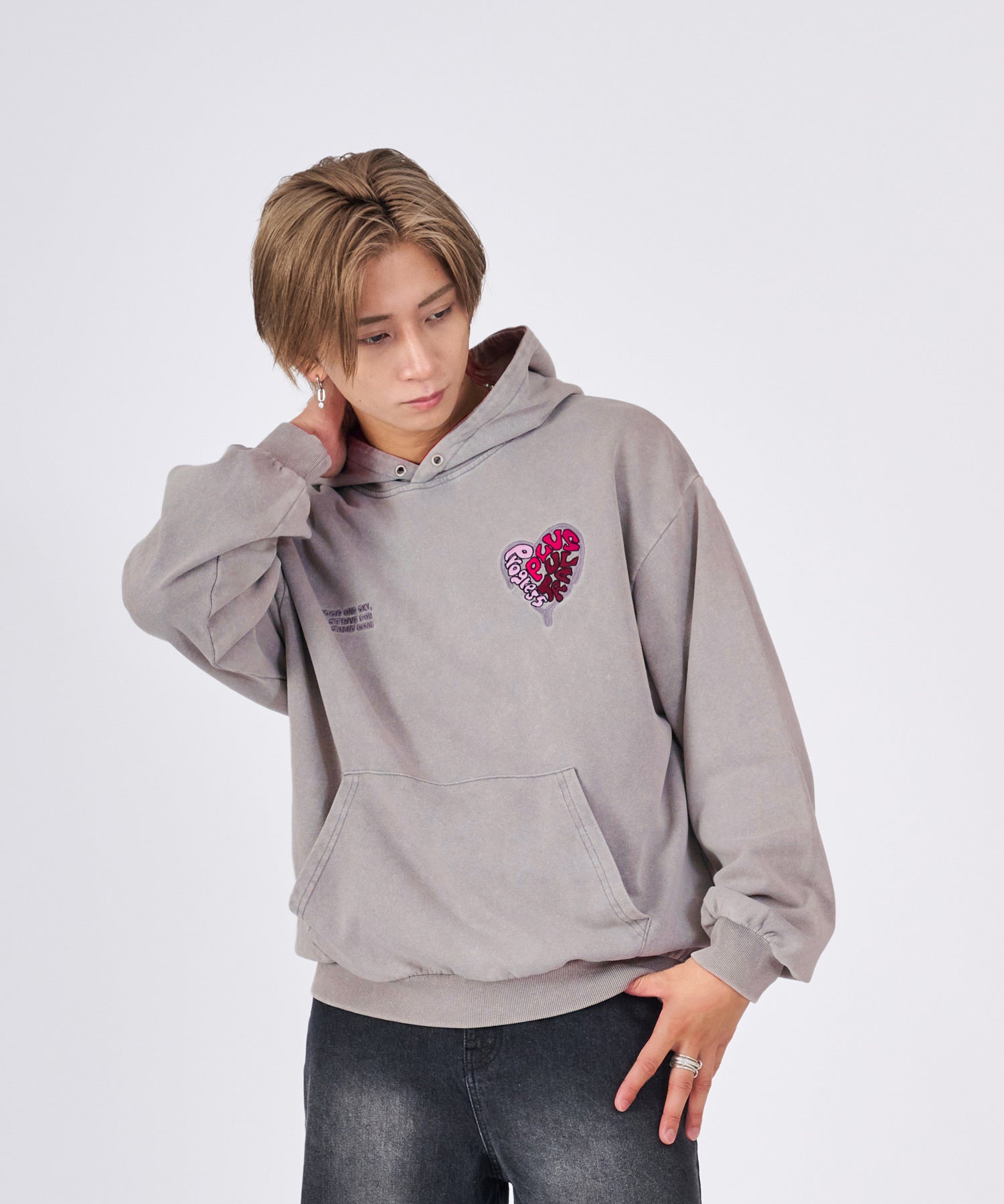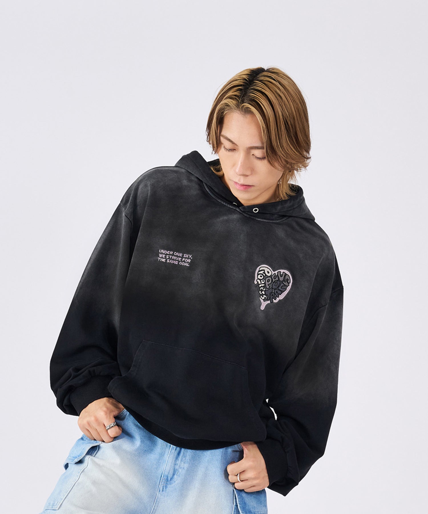 背中と胸のハート柄が人気のプルパーカー❤ハート柄になっているロゴは、カラーがグラデーションになっていて可愛い❤フロントにはポケットを設けたプルパーカーの定番的デザインなのでコーデにも合わせやすい♪